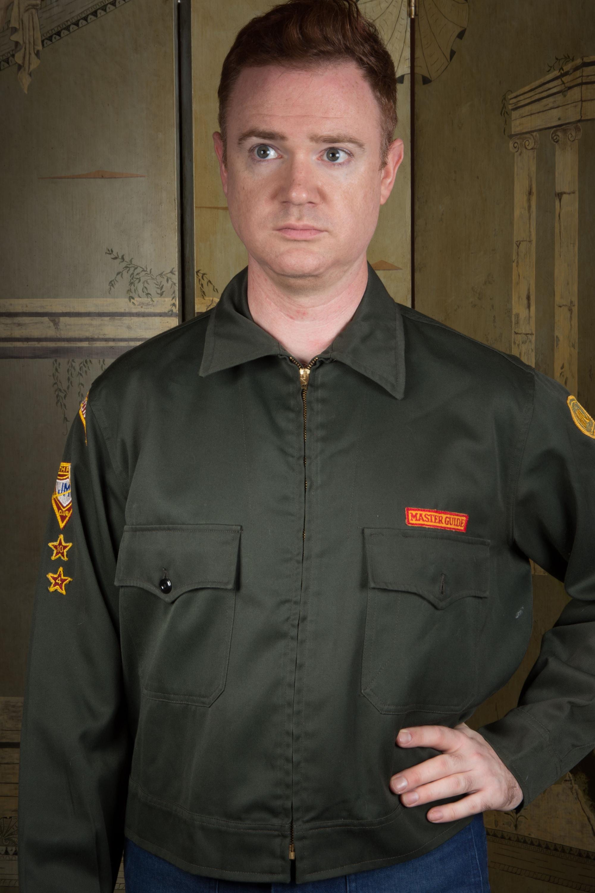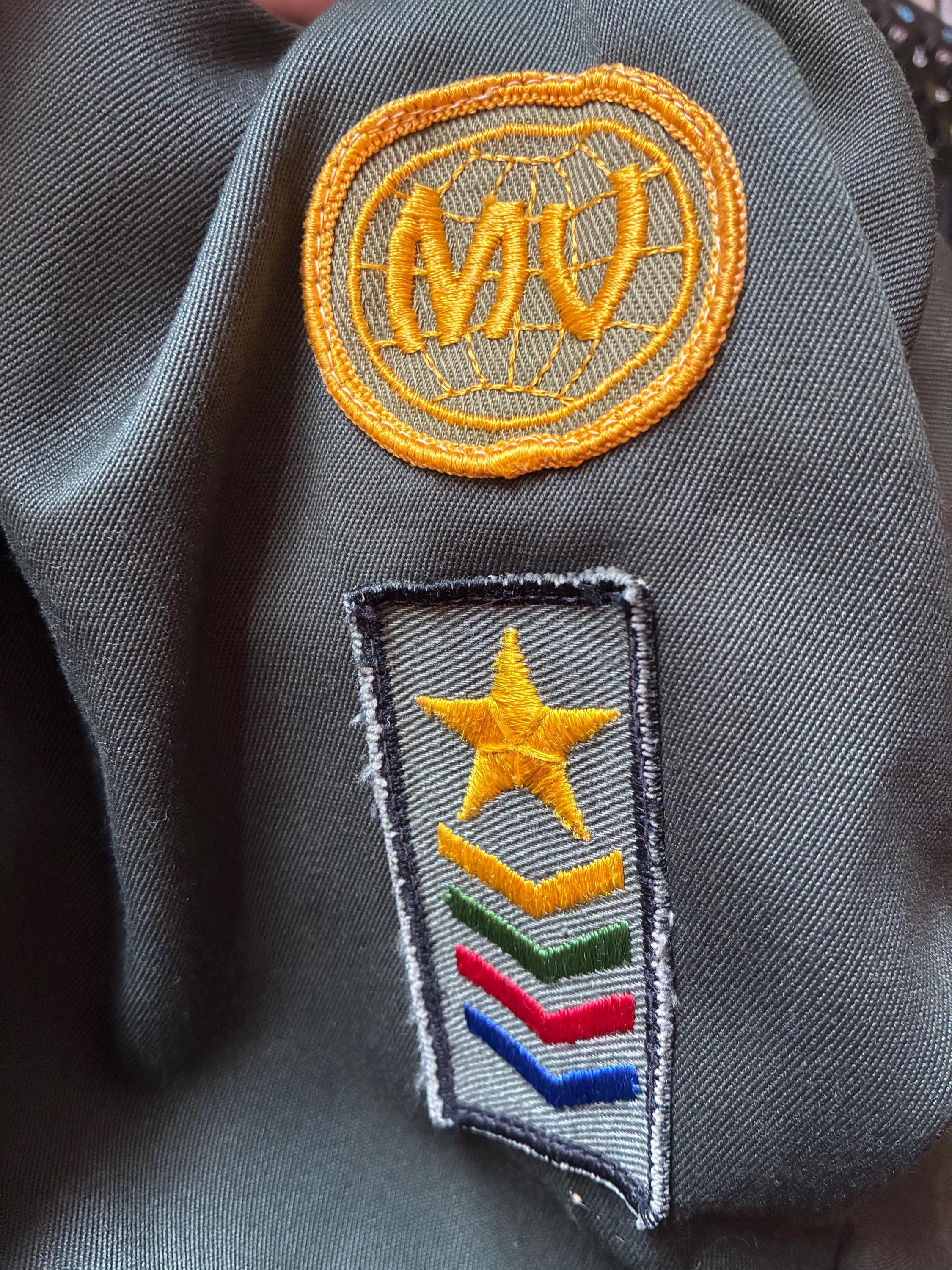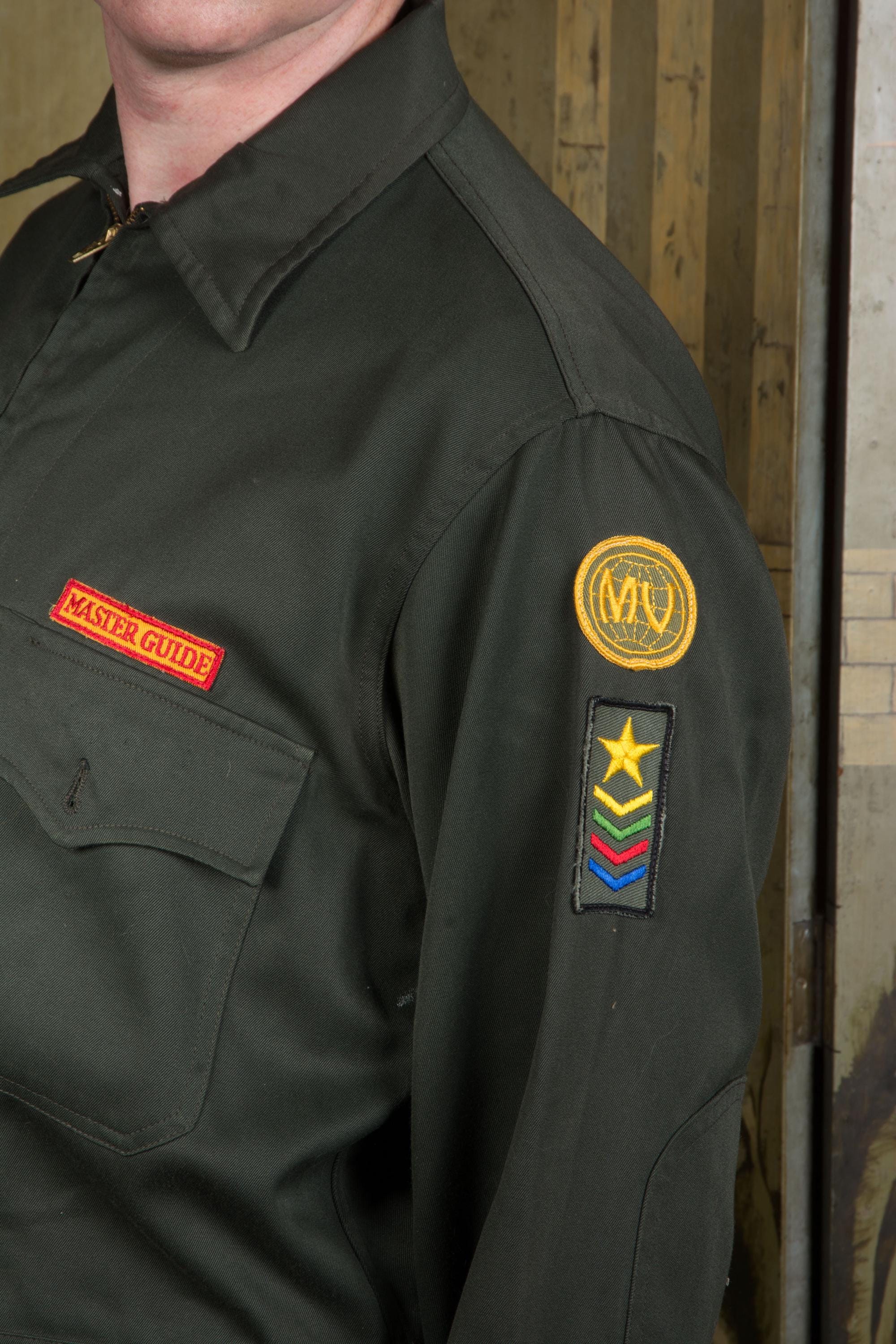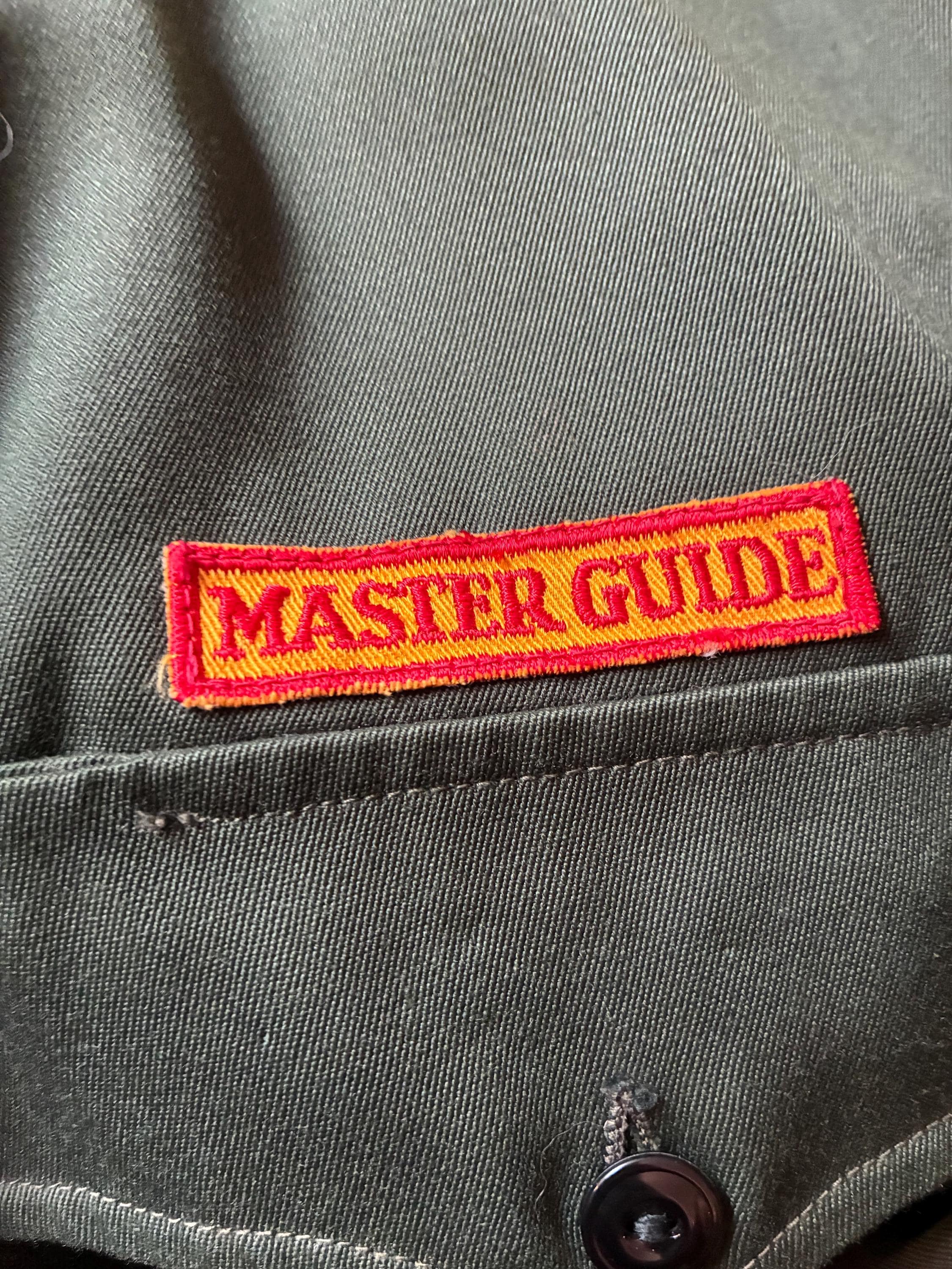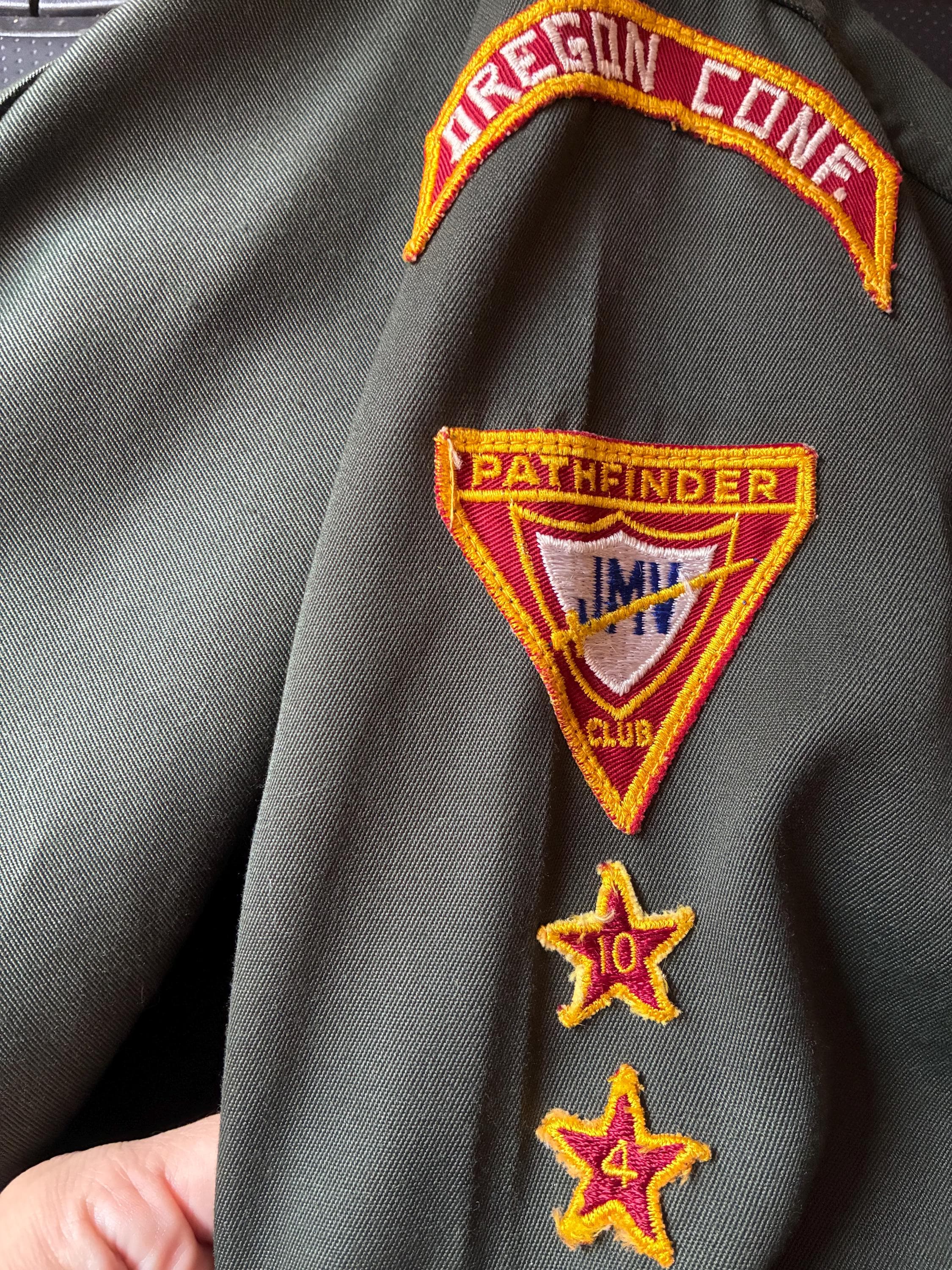 Vintage 1960s army green colored zip front jacket - a lightweight outerwear jacket with heavy metal zipper. I admit I thought this was a BSA thing, but it's actually "Pathfinders" "Master Guide" level jacket from the Oregon conference. Unlined. Two front flap pockets and a banded waist.