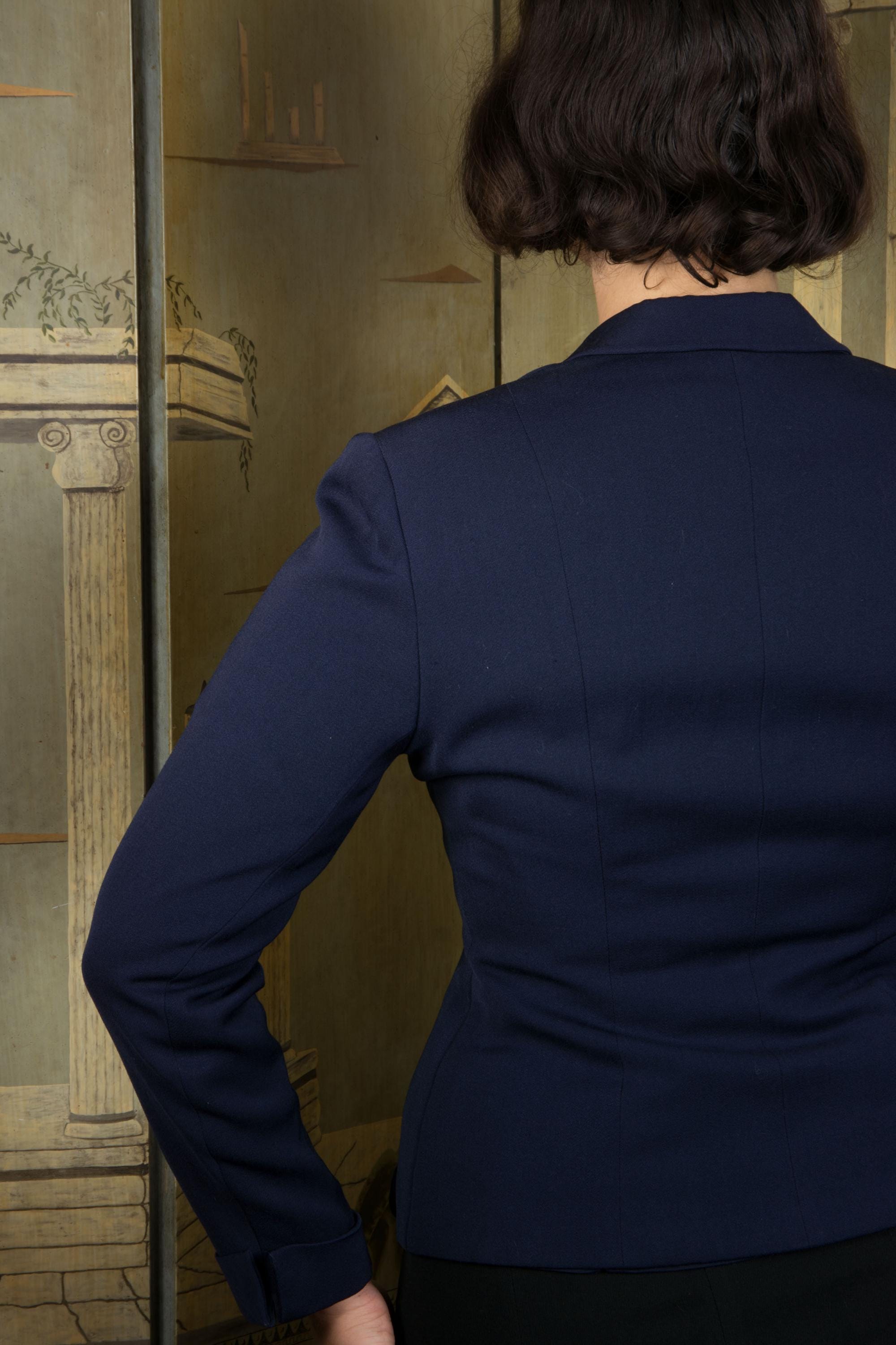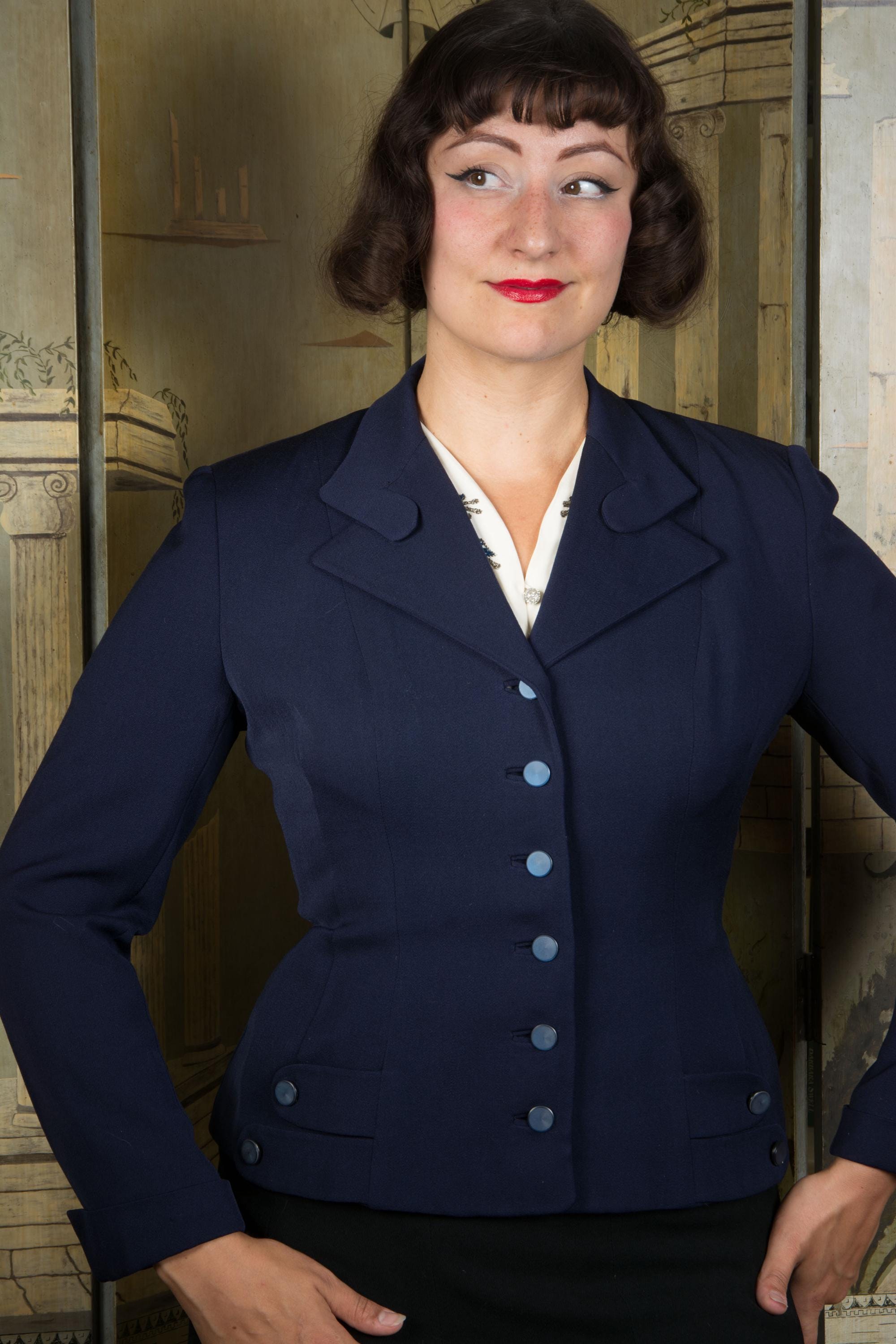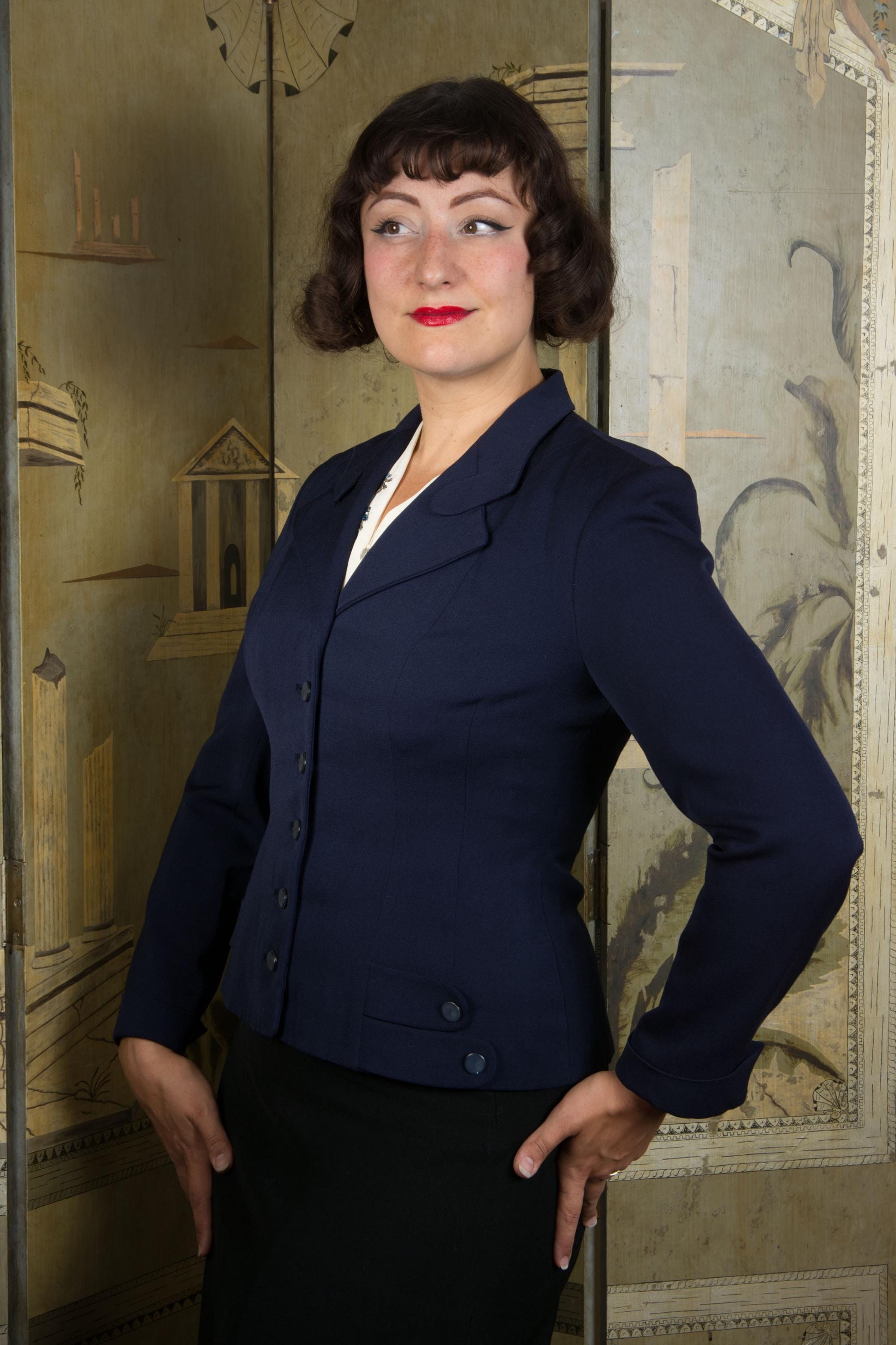Vintage 1950s jacket is as professional and flattering now as it was sixty years ago. Made of a navy blue wool gabardine, the quality is instantly recognizable. I particularly like the collar, which has a shape inspired by WWII WAVES uniforms, which would have been familiar to women in the post war decade. A long double darts shape the waist at each side. Instead of faux pockets at each hip, there's little decorative tabs with button accents - perfect for folding an accent scarf through. It closes down the front with seven blue buttons. Immaculately lined in rayon crepe