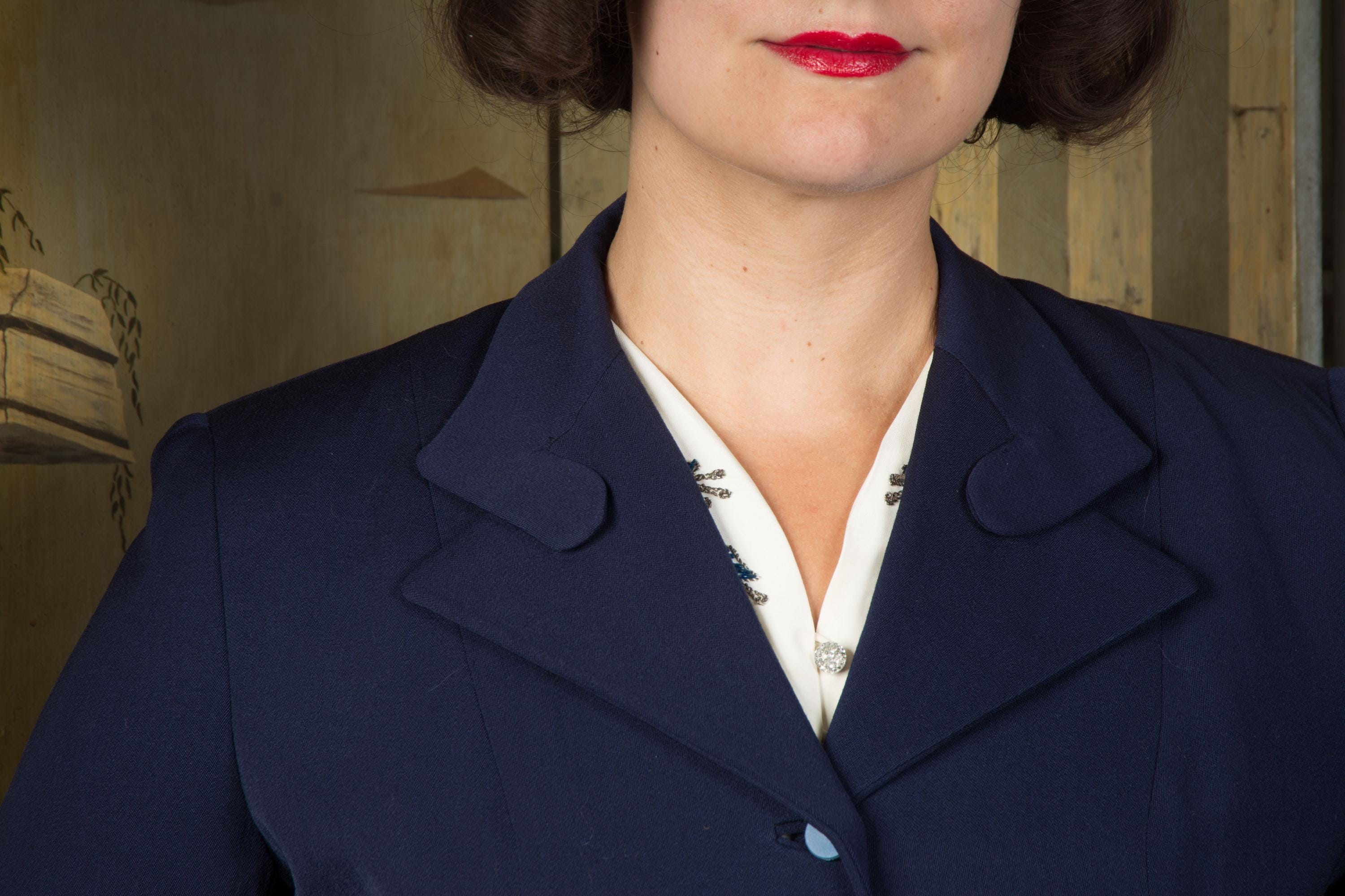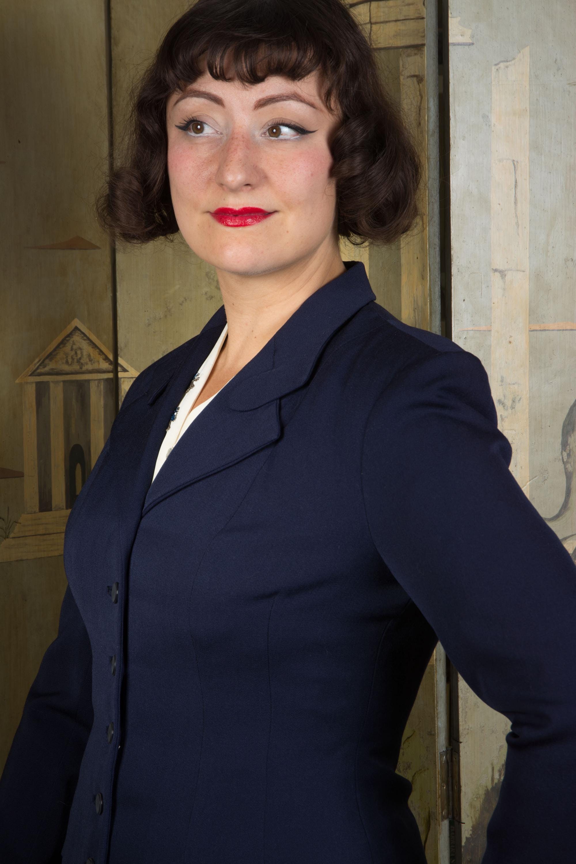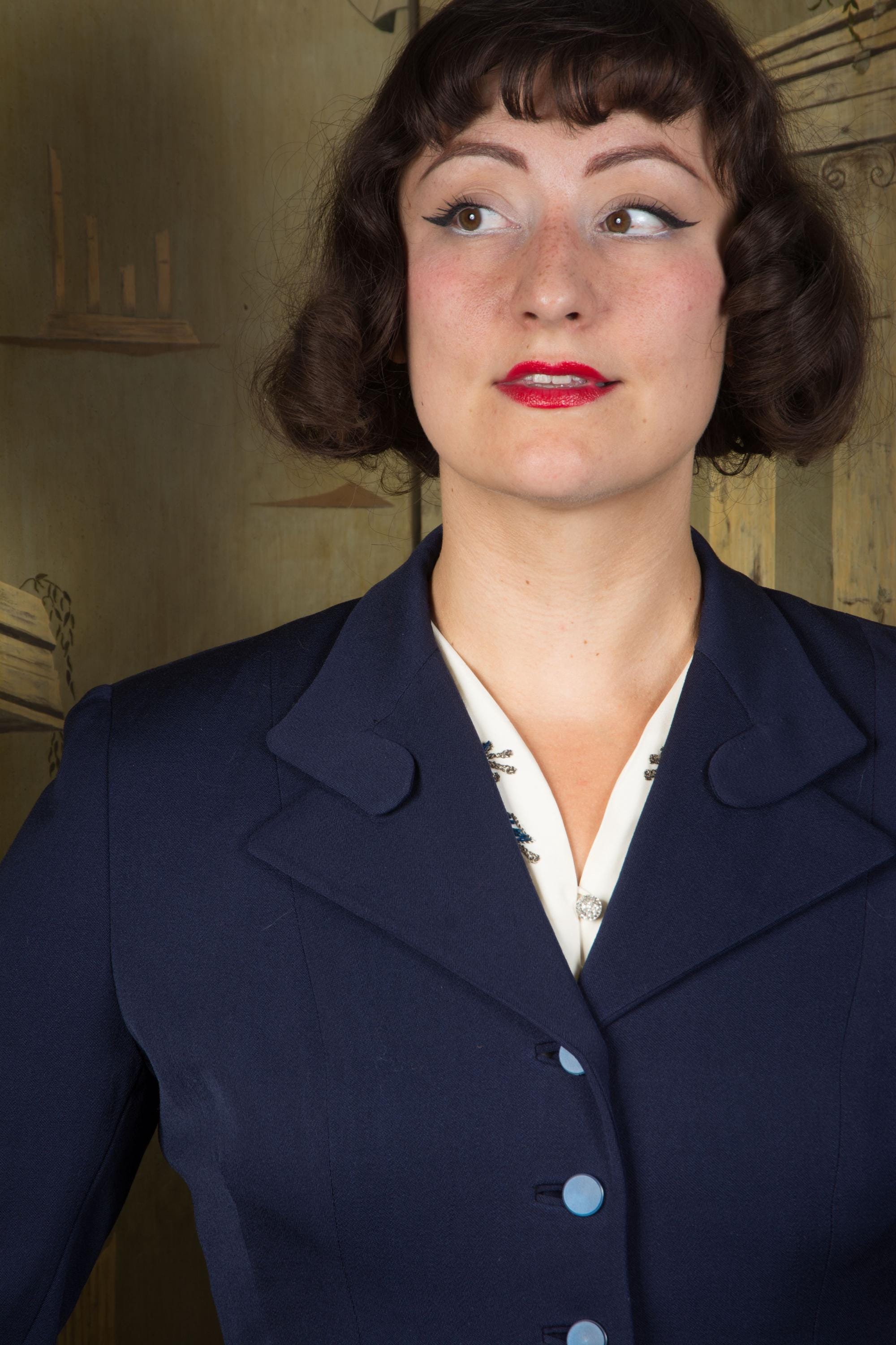 Vintage 1950s jacket is as professional and flattering now as it was sixty years ago. Made of a navy blue wool gabardine, the quality is instantly recognizable. I particularly like the collar, which has a shape inspired by WWII WAVES uniforms, which would have been familiar to women in the post war decade. A long double darts shape the waist at each side. Instead of faux pockets at each hip, there's little decorative tabs with button accents - perfect for folding an accent scarf through. It closes down the front with seven blue buttons. Immaculately lined in rayon crepe