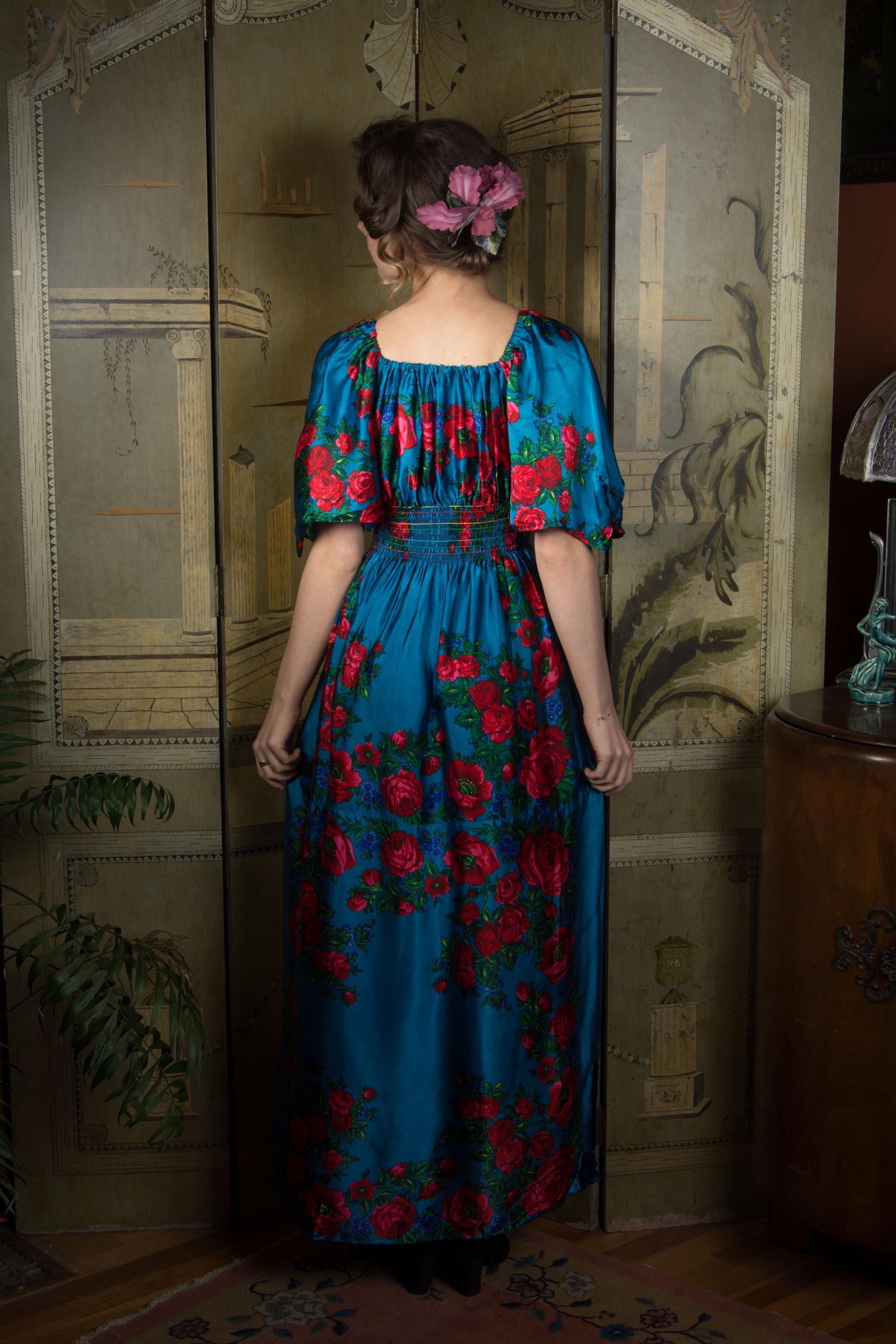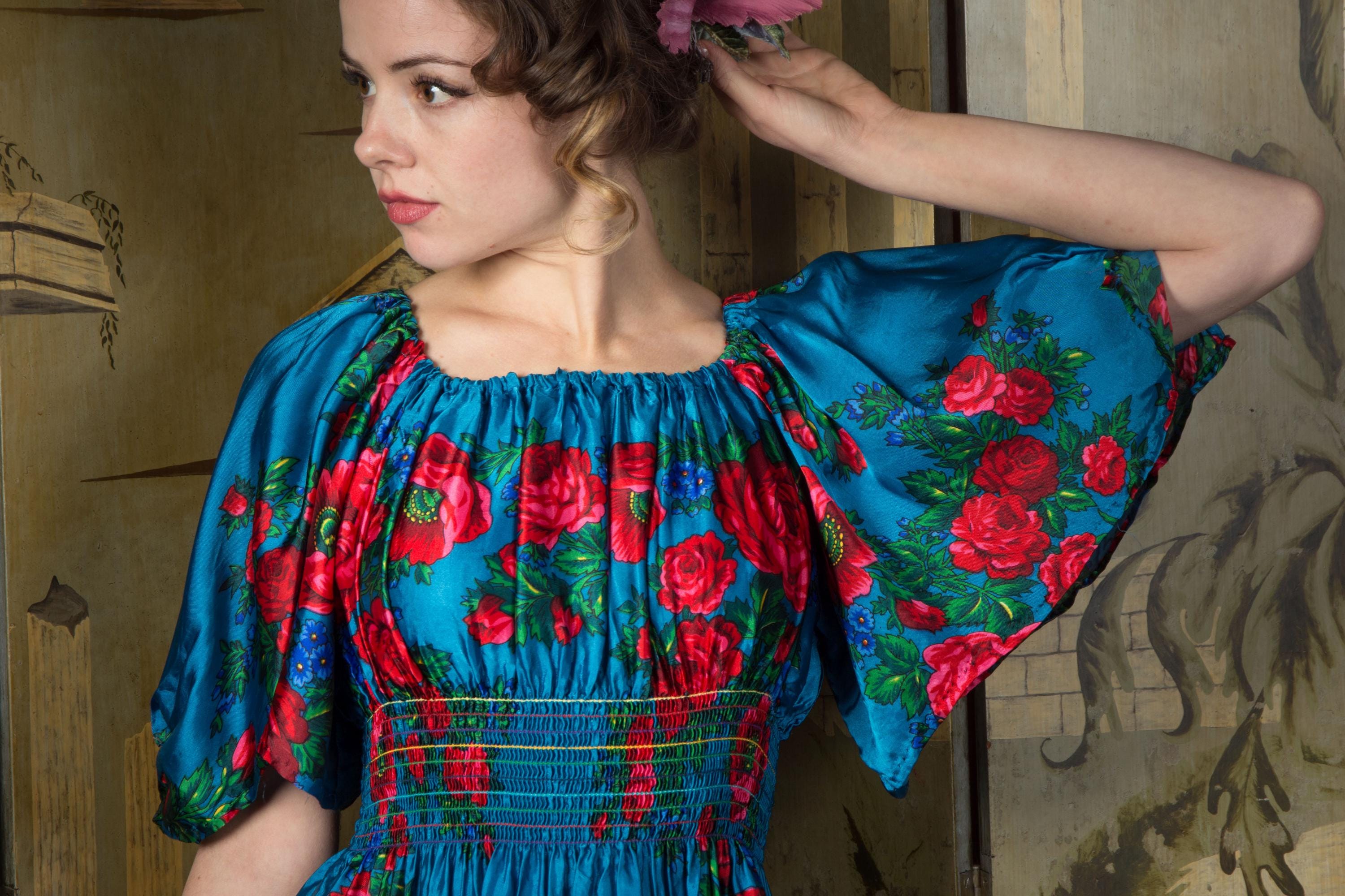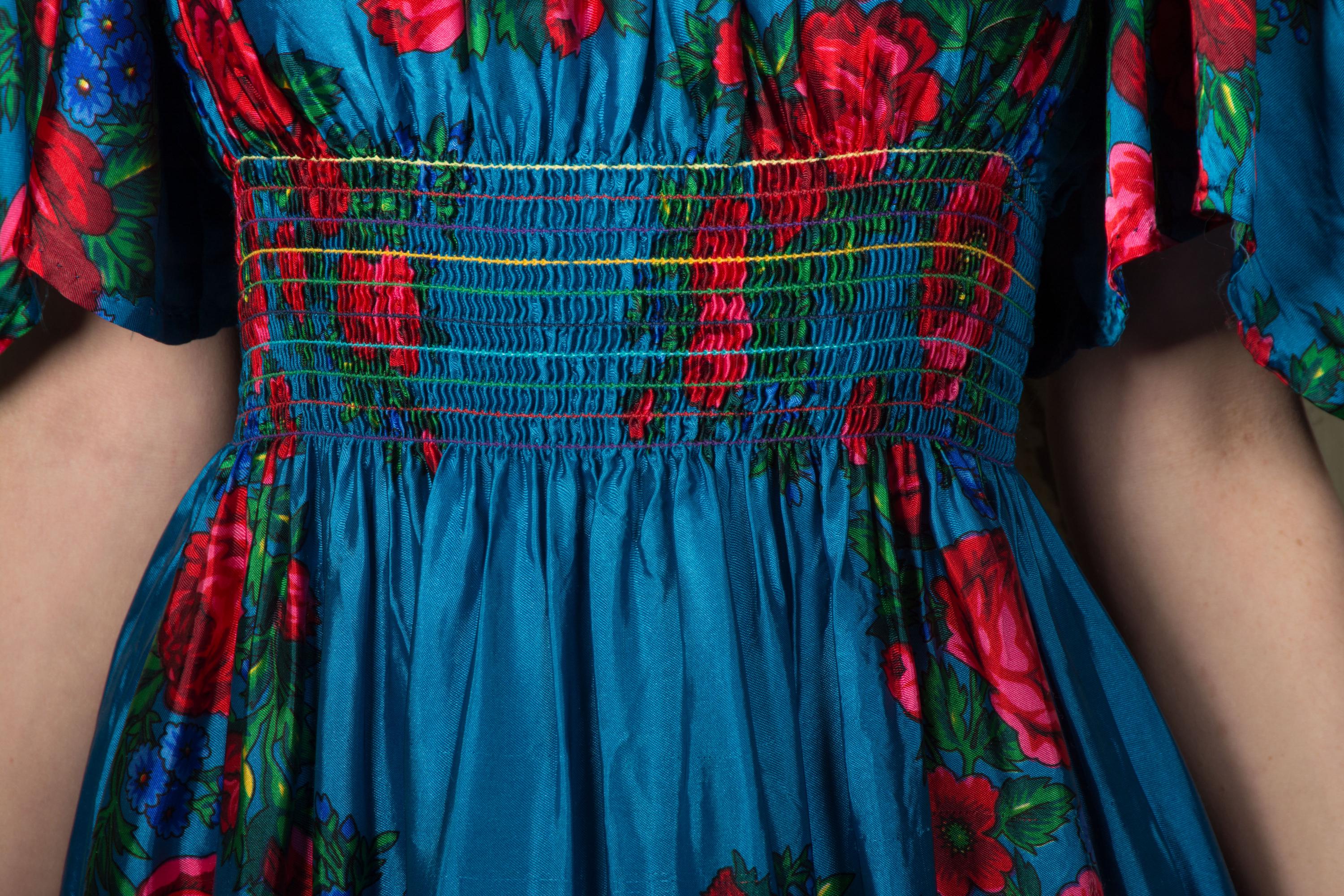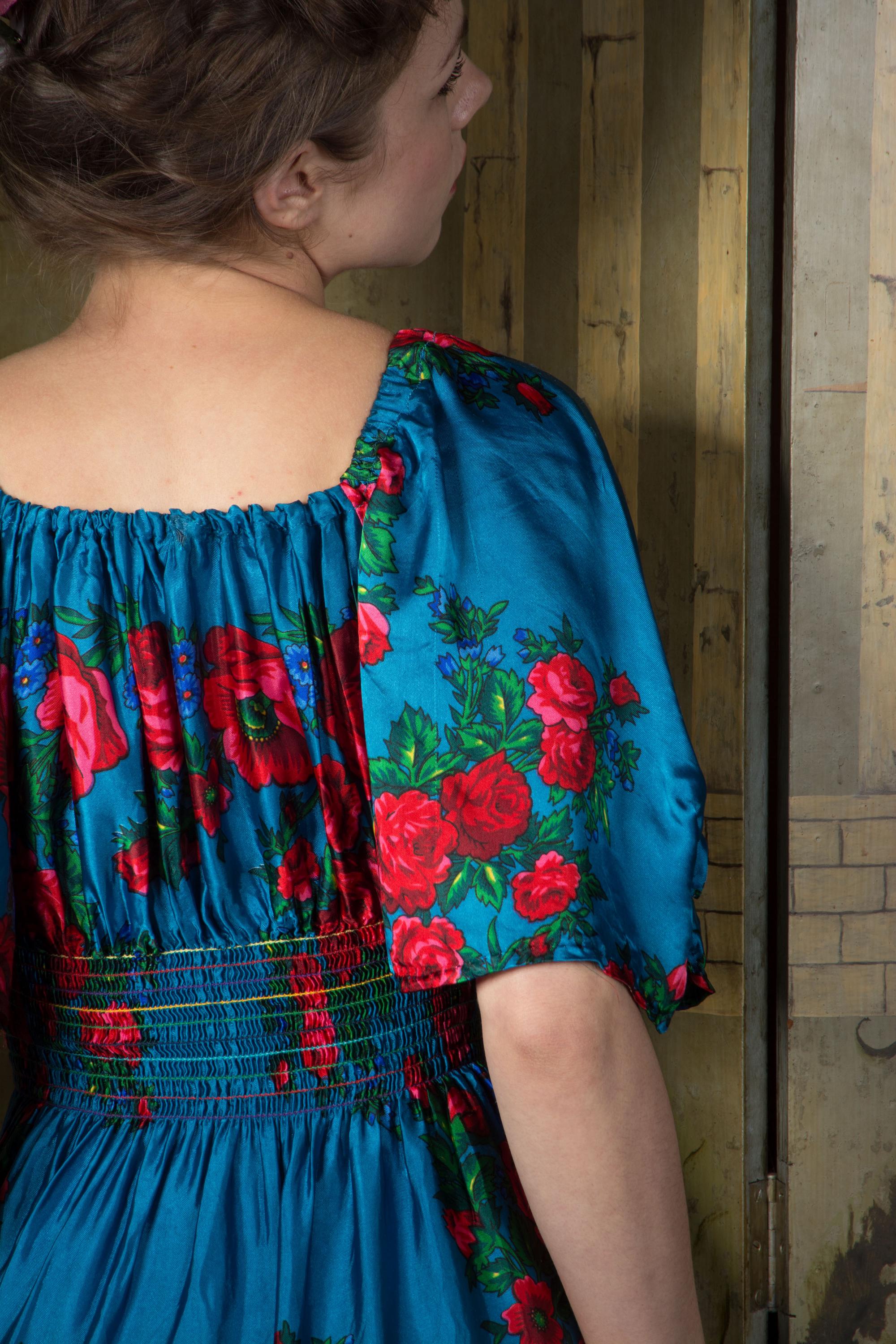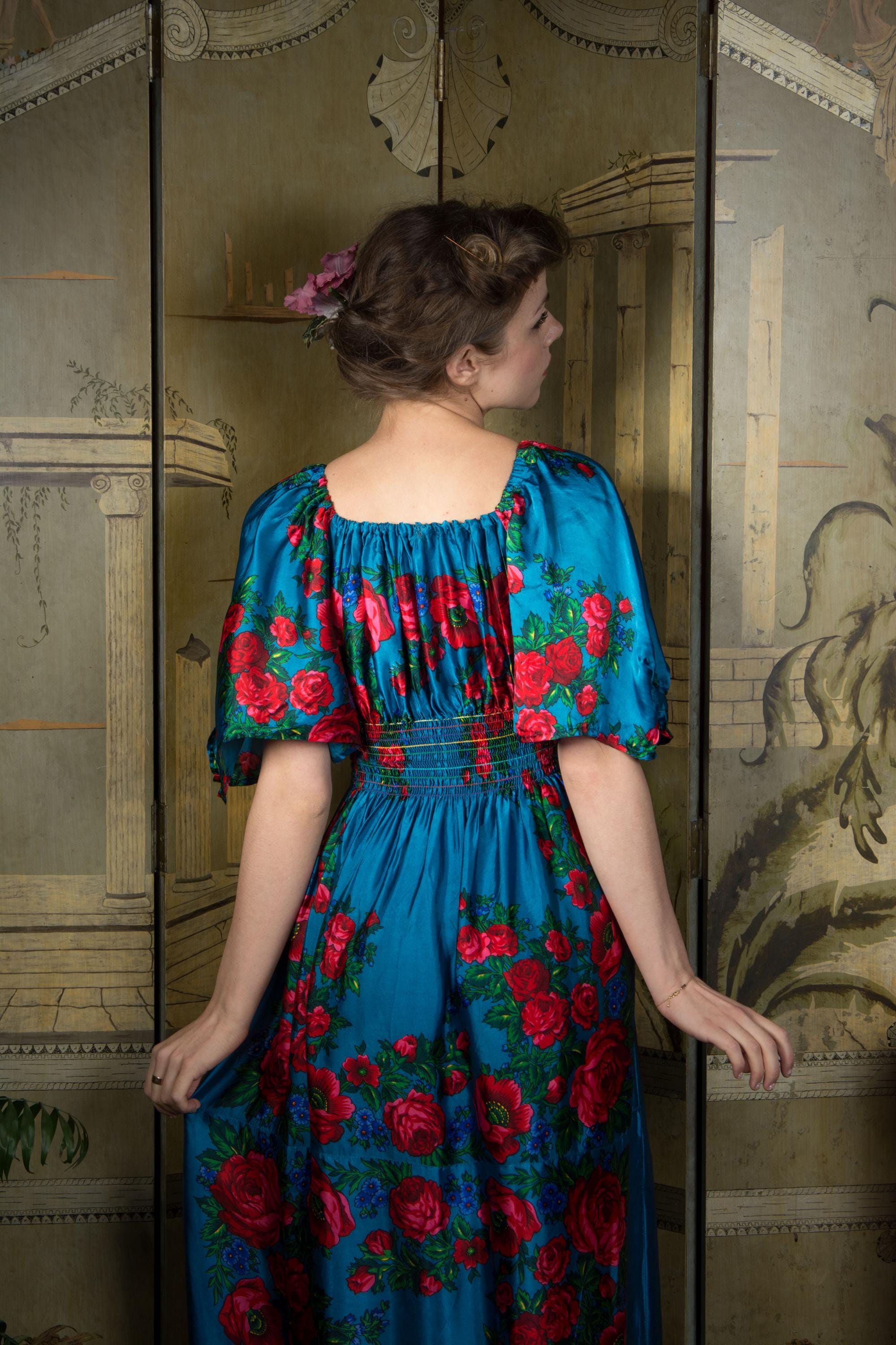 A fantastic satin scarf dress, genuinely homemade from matching large, floral scarves in the 1970s. These were likely purchased as souvenirs from Mexico, and then made into a dress upon returning home, or made by a vendor. This uses at least five and as many as 7 scarves. The satin is heavy and sleek - it tests as rayon. The ground is a brilliant blue, filled with a print of bold red and pink roses with richy green leaves, then accents of yellow and deeper blue forget me nots. The waist is snuggly shirred with elastic, and quite flexible. I love the handkerchief cut of the sleeves.
