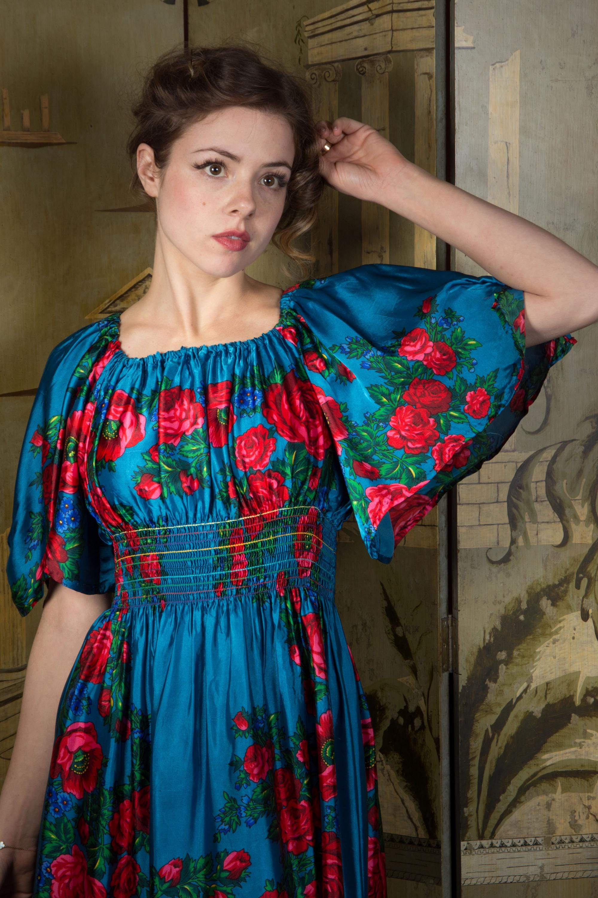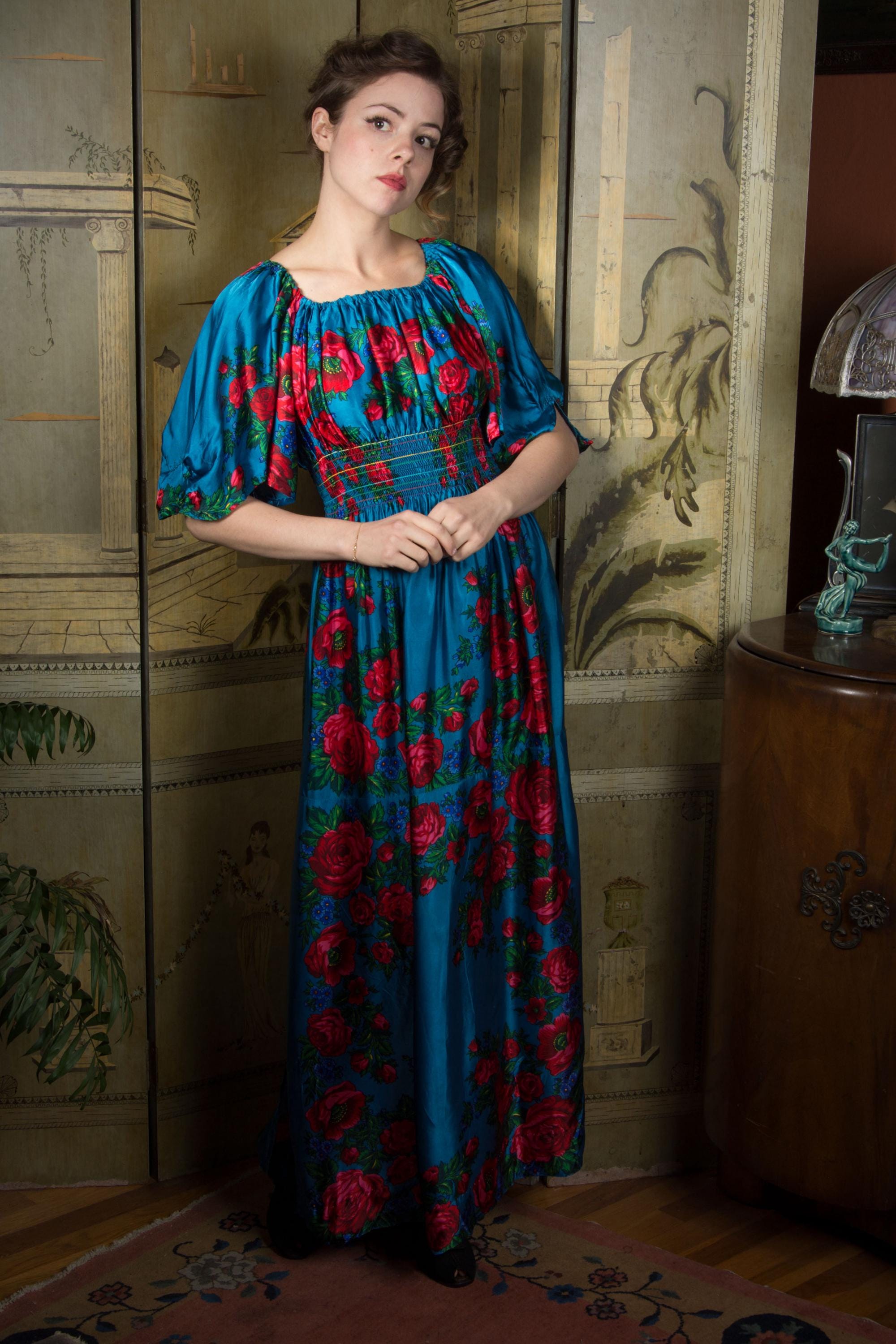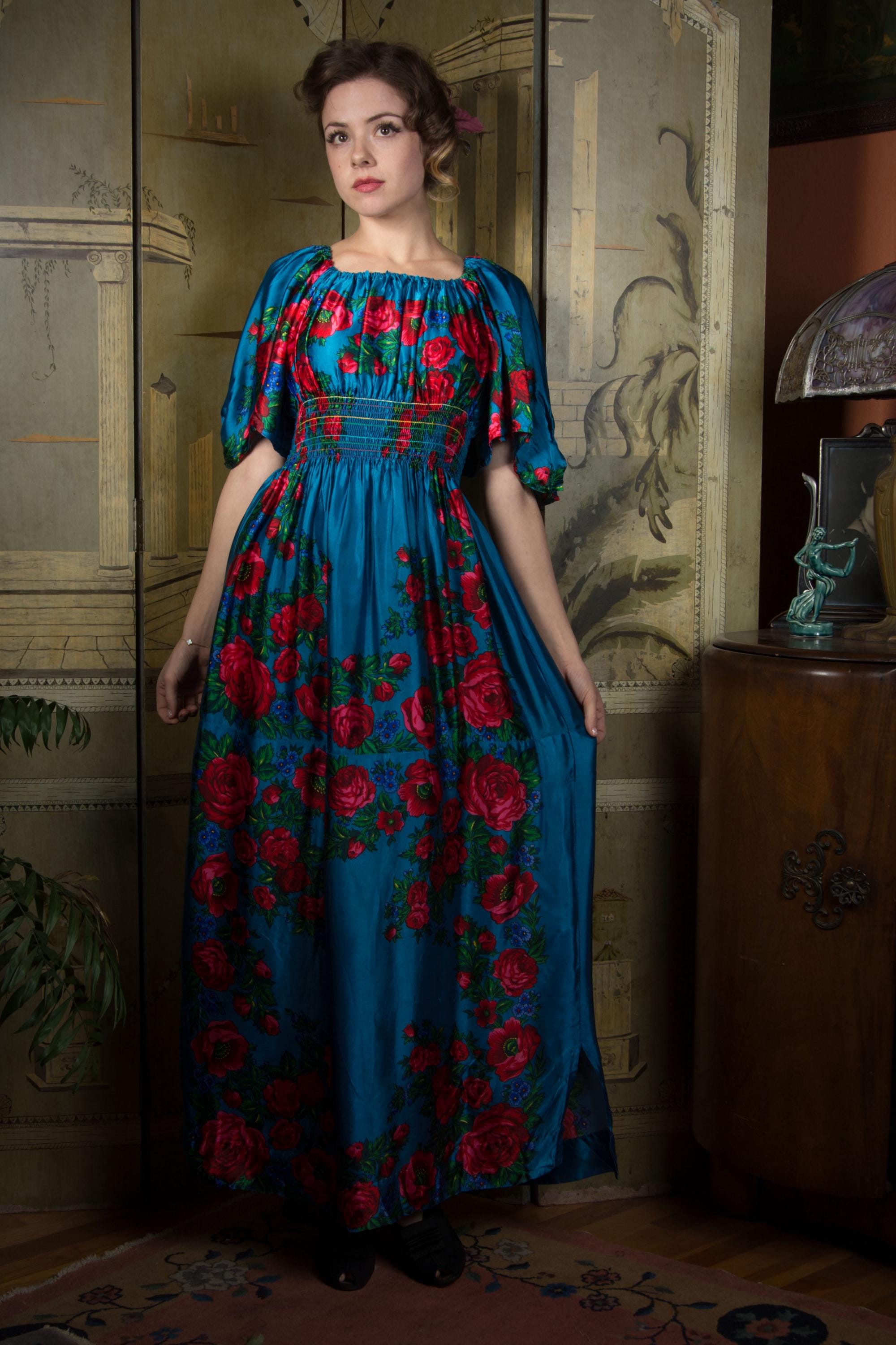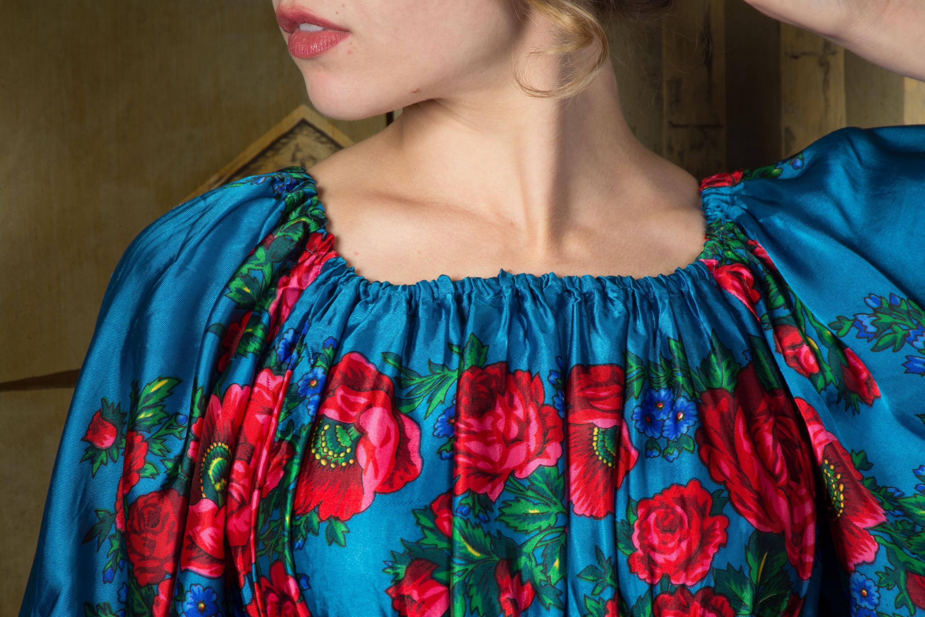 A fantastic satin scarf dress, genuinely homemade from matching large, floral scarves in the 1970s. These were likely purchased as souvenirs from Mexico, and then made into a dress upon returning home, or made by a vendor. This uses at least five and as many as 7 scarves. The satin is heavy and sleek - it tests as rayon. The ground is a brilliant blue, filled with a print of bold red and pink roses with richy green leaves, then accents of yellow and deeper blue forget me nots. The waist is snuggly shirred with elastic, and quite flexible. I love the handkerchief cut of the sleeves.