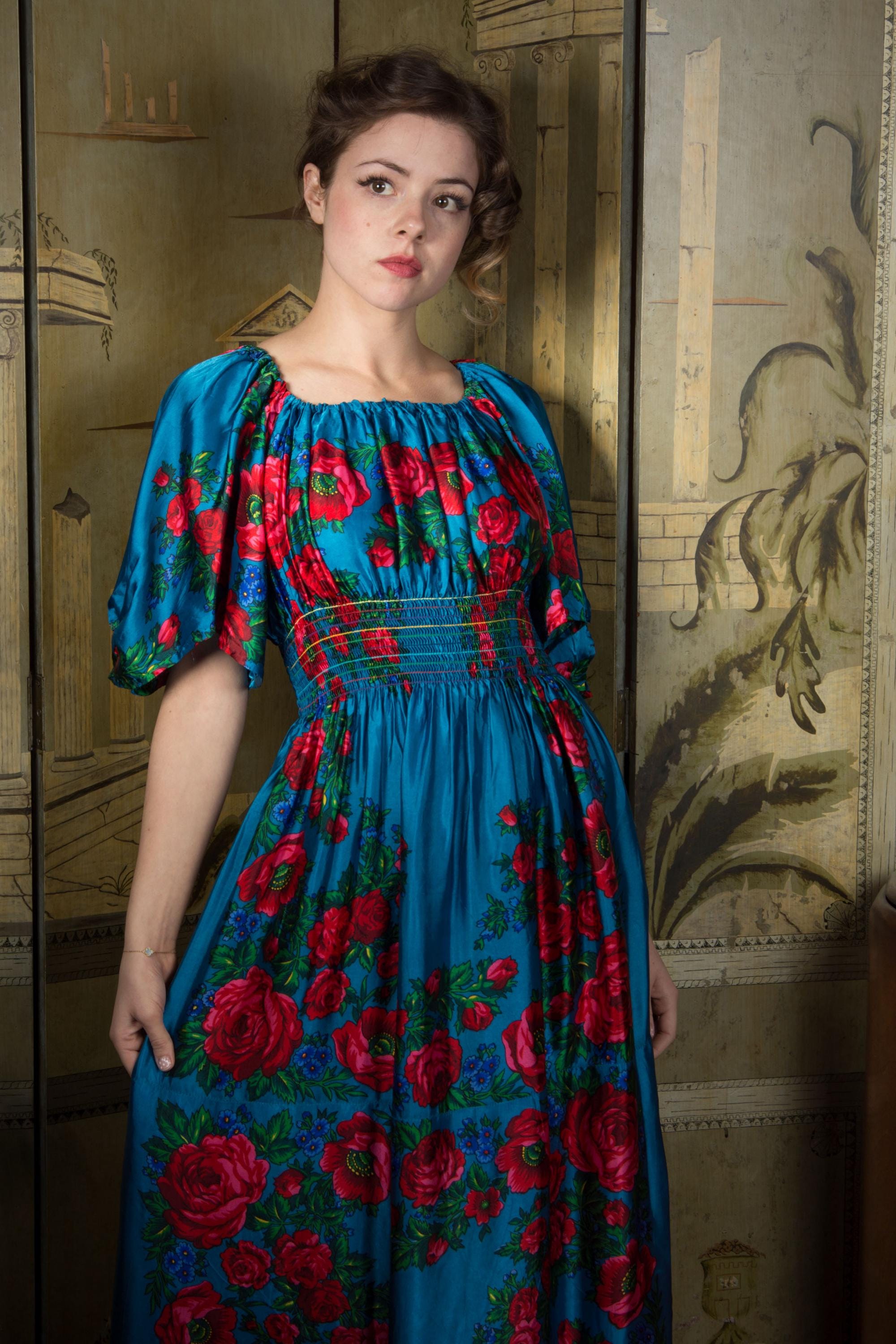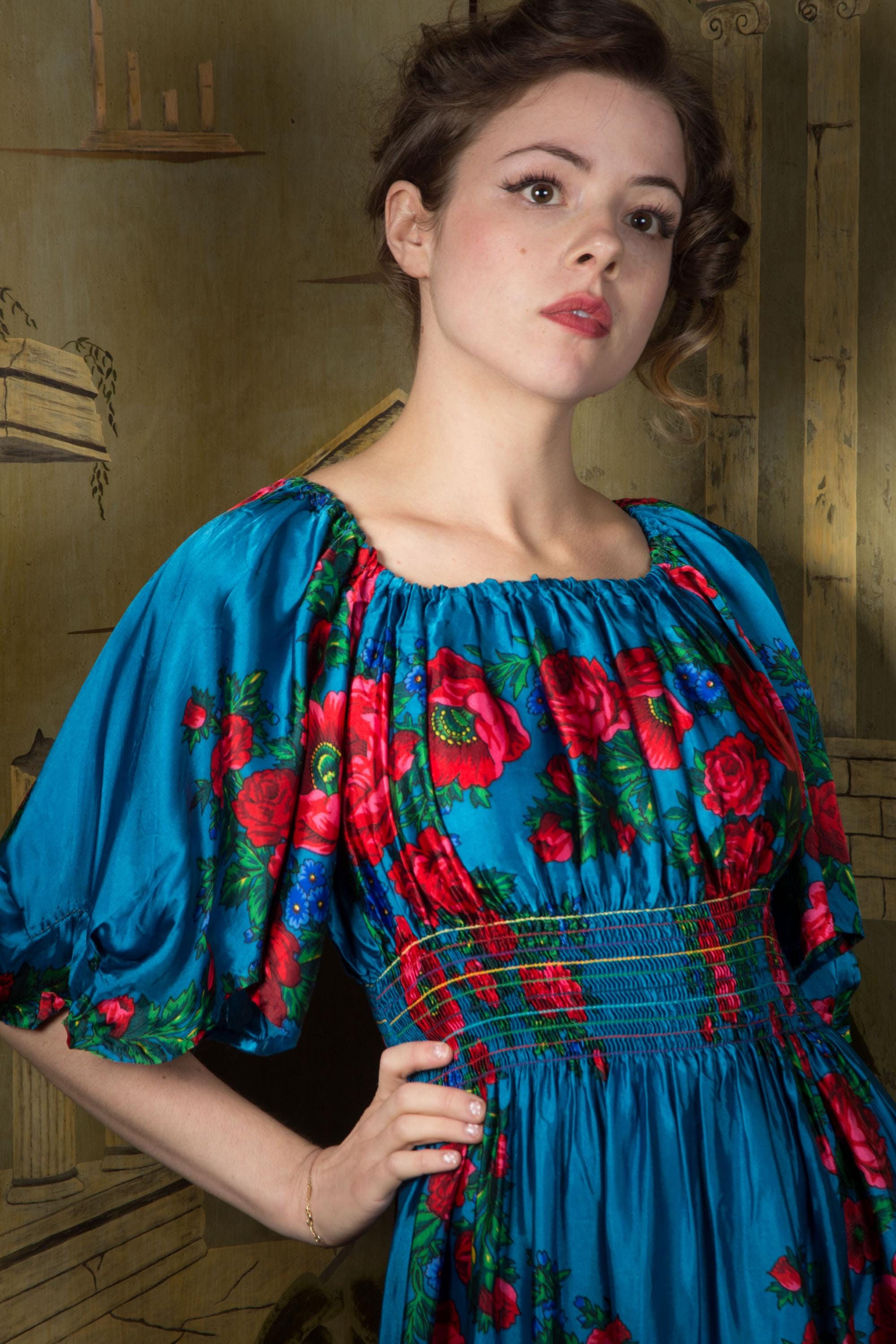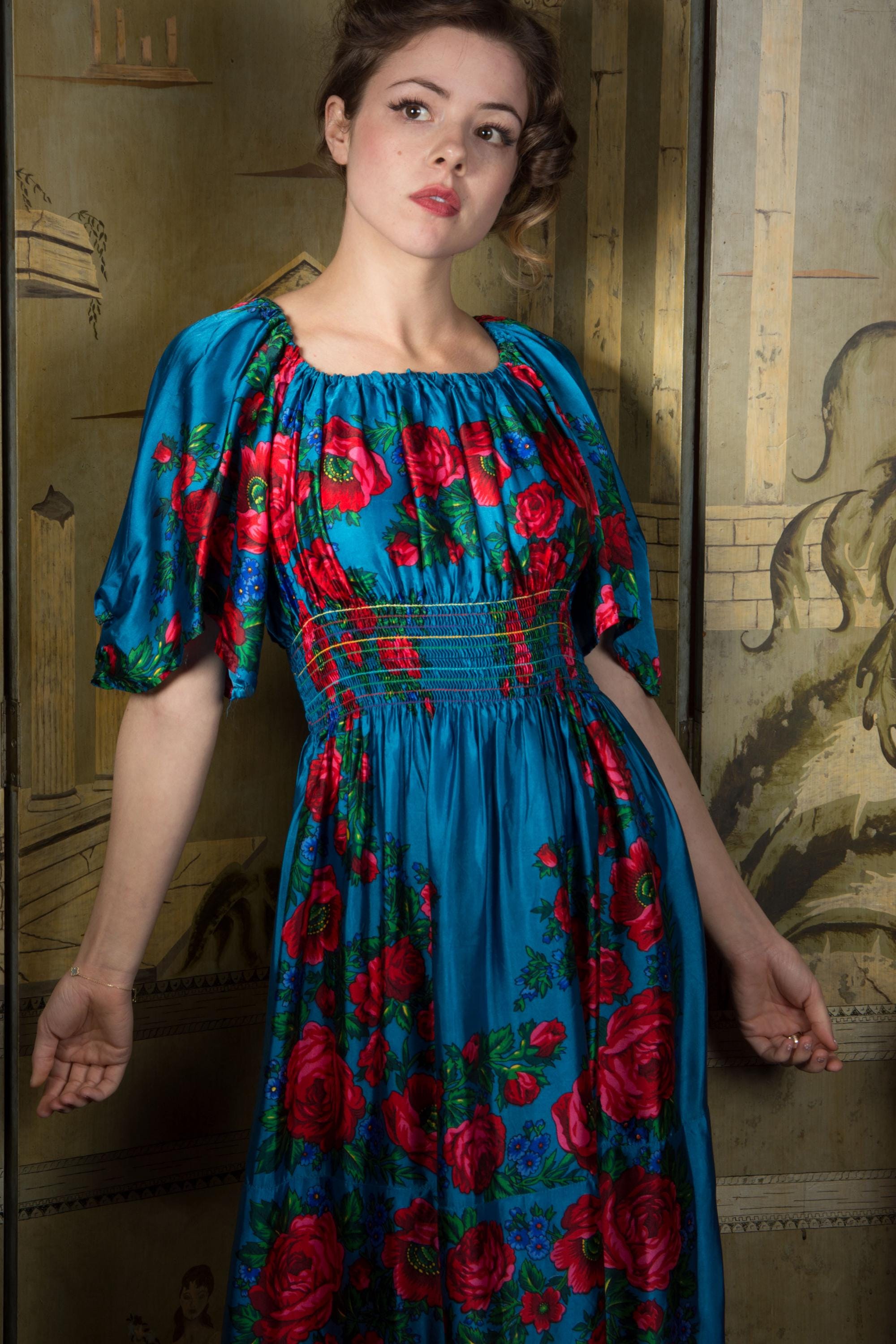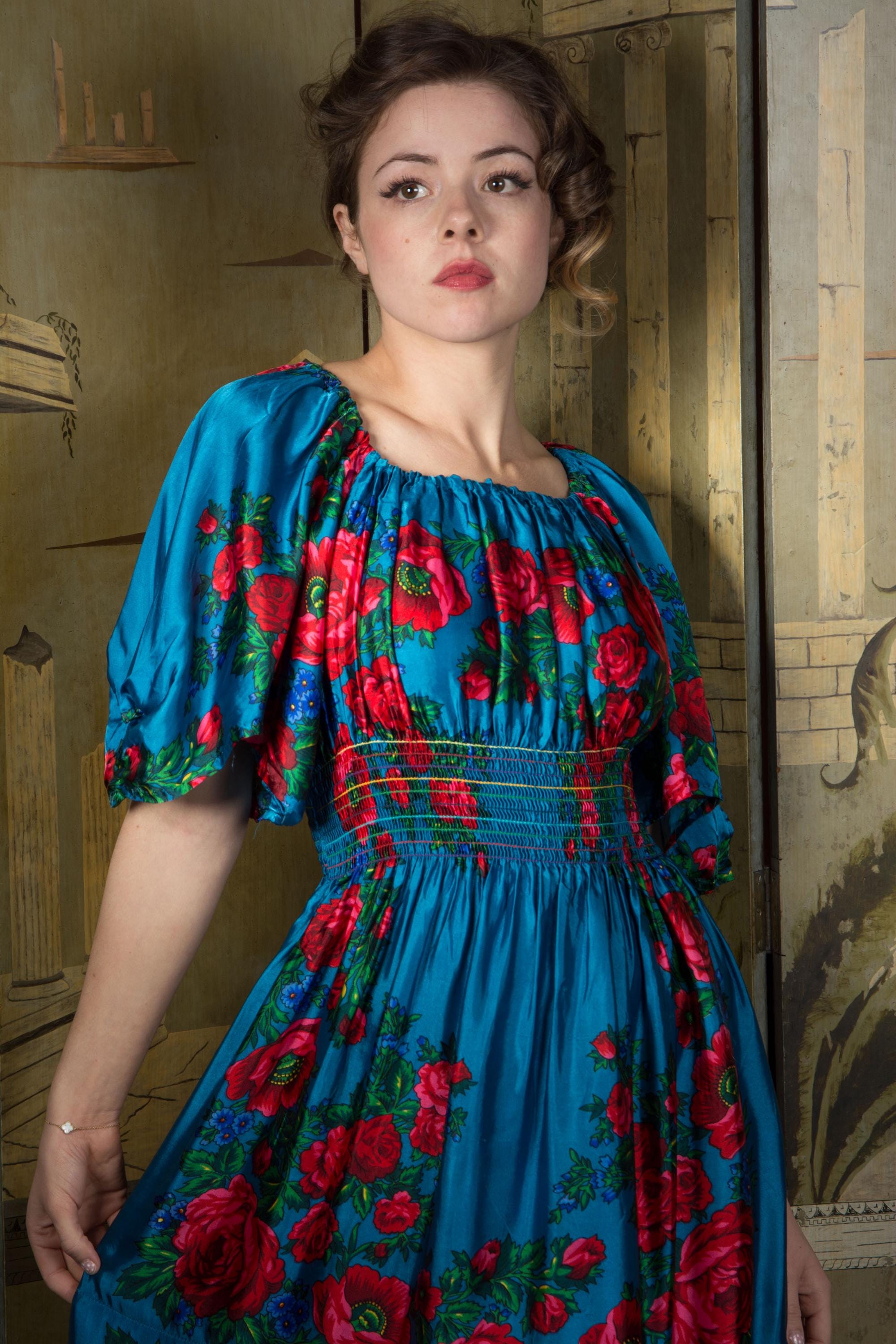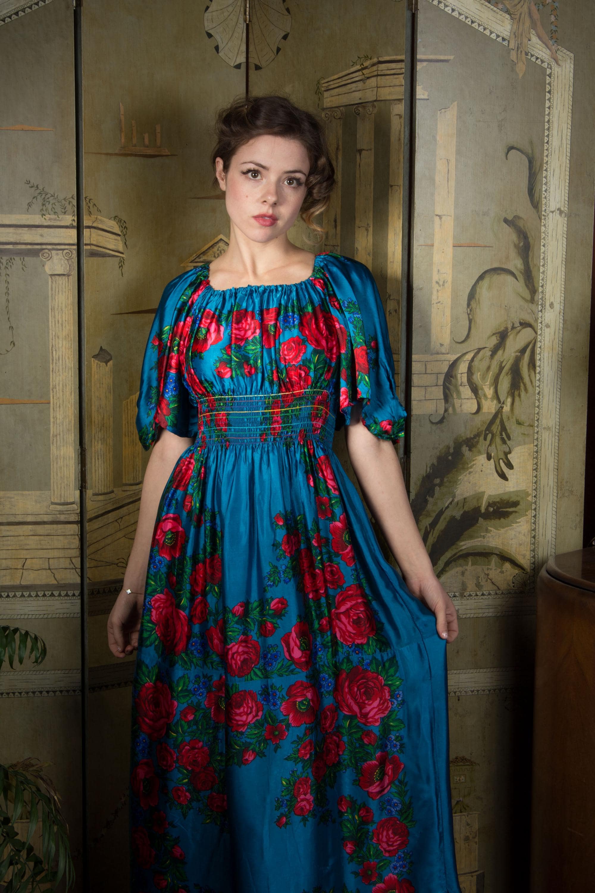 A fantastic satin scarf dress, genuinely homemade from matching large, floral scarves in the 1970s. These were likely purchased as souvenirs from Mexico, and then made into a dress upon returning home, or made by a vendor. This uses at least five and as many as 7 scarves. The satin is heavy and sleek - it tests as rayon. The ground is a brilliant blue, filled with a print of bold red and pink roses with richy green leaves, then accents of yellow and deeper blue forget me nots. The waist is snuggly shirred with elastic, and quite flexible. I love the handkerchief cut of the sleeves.
