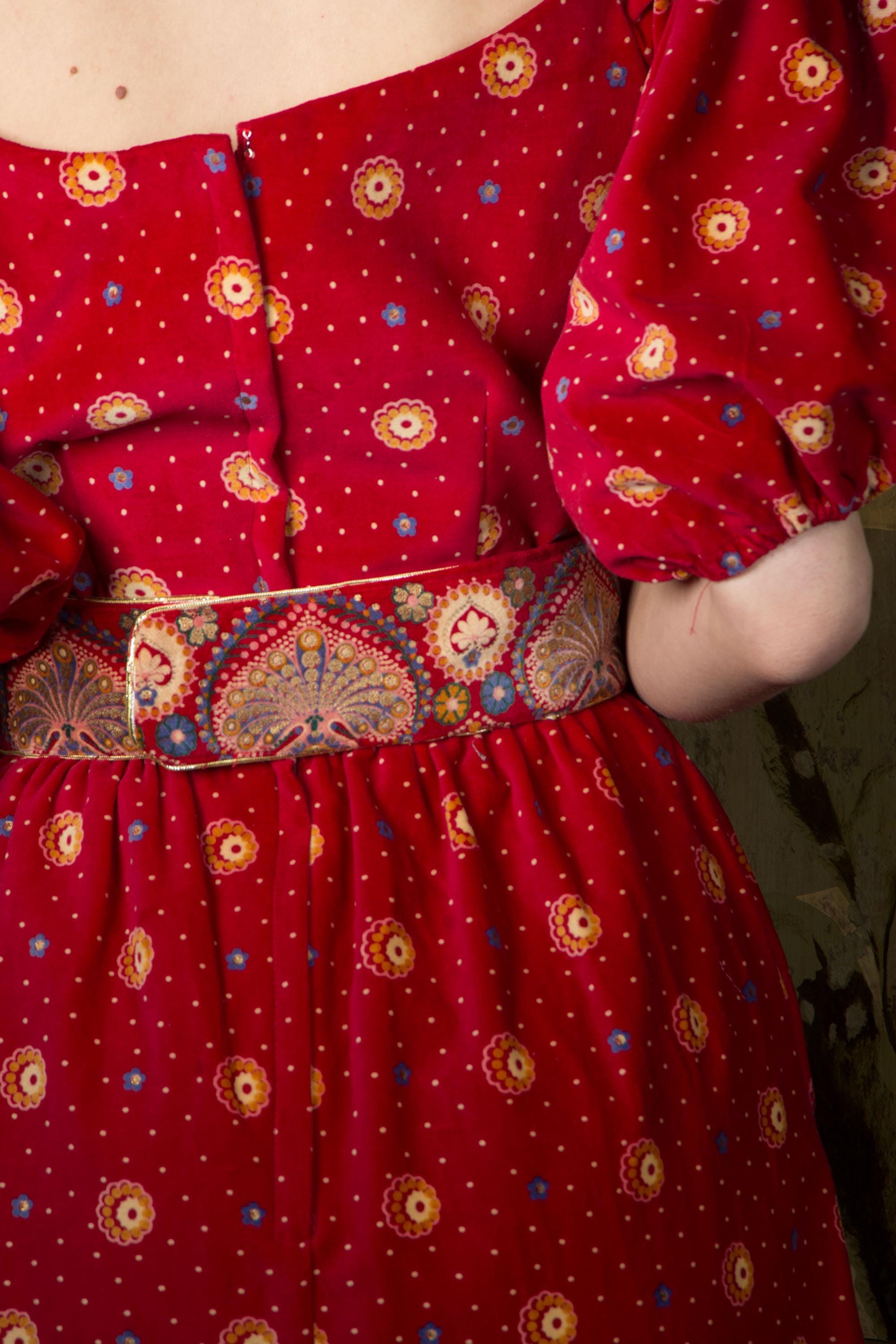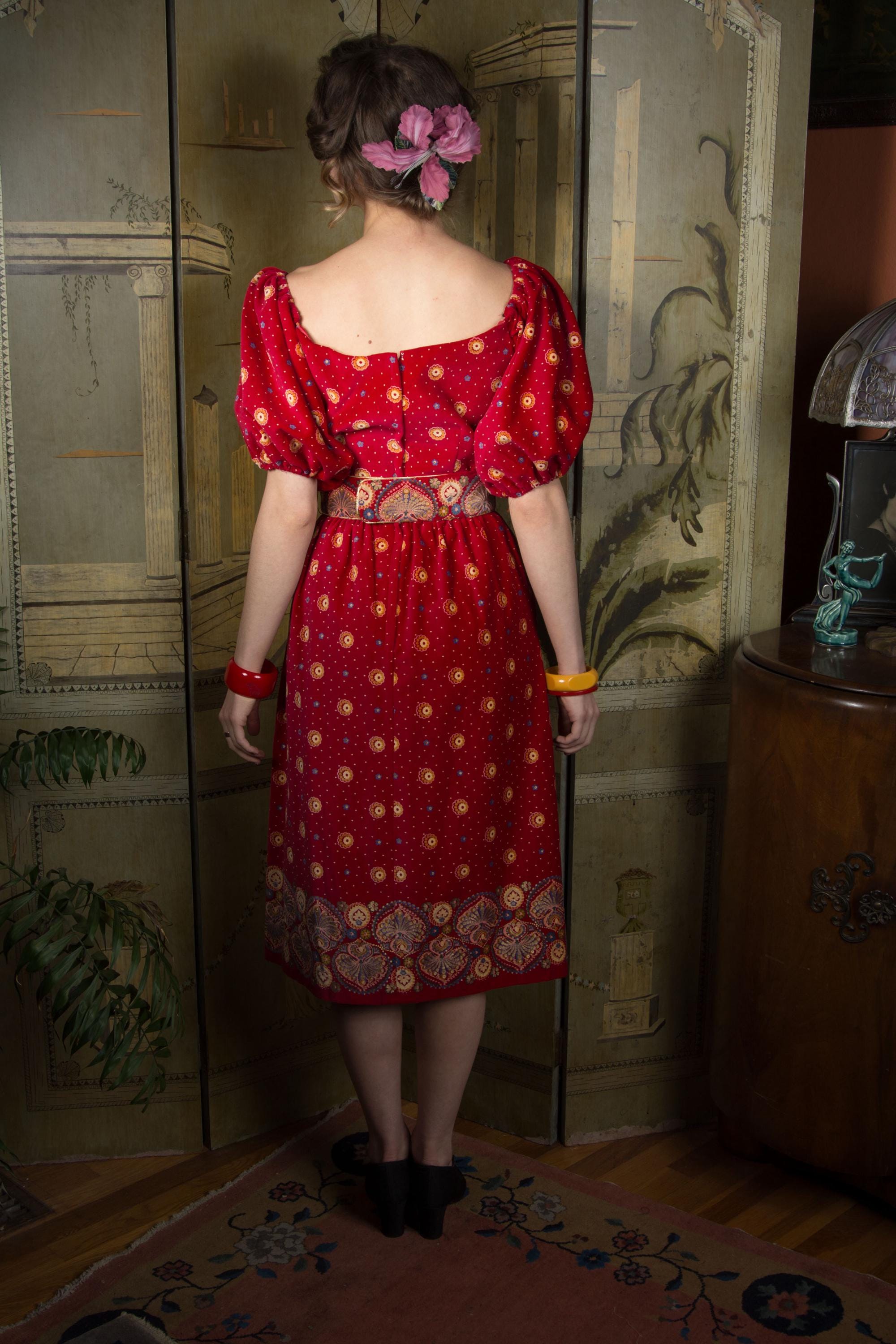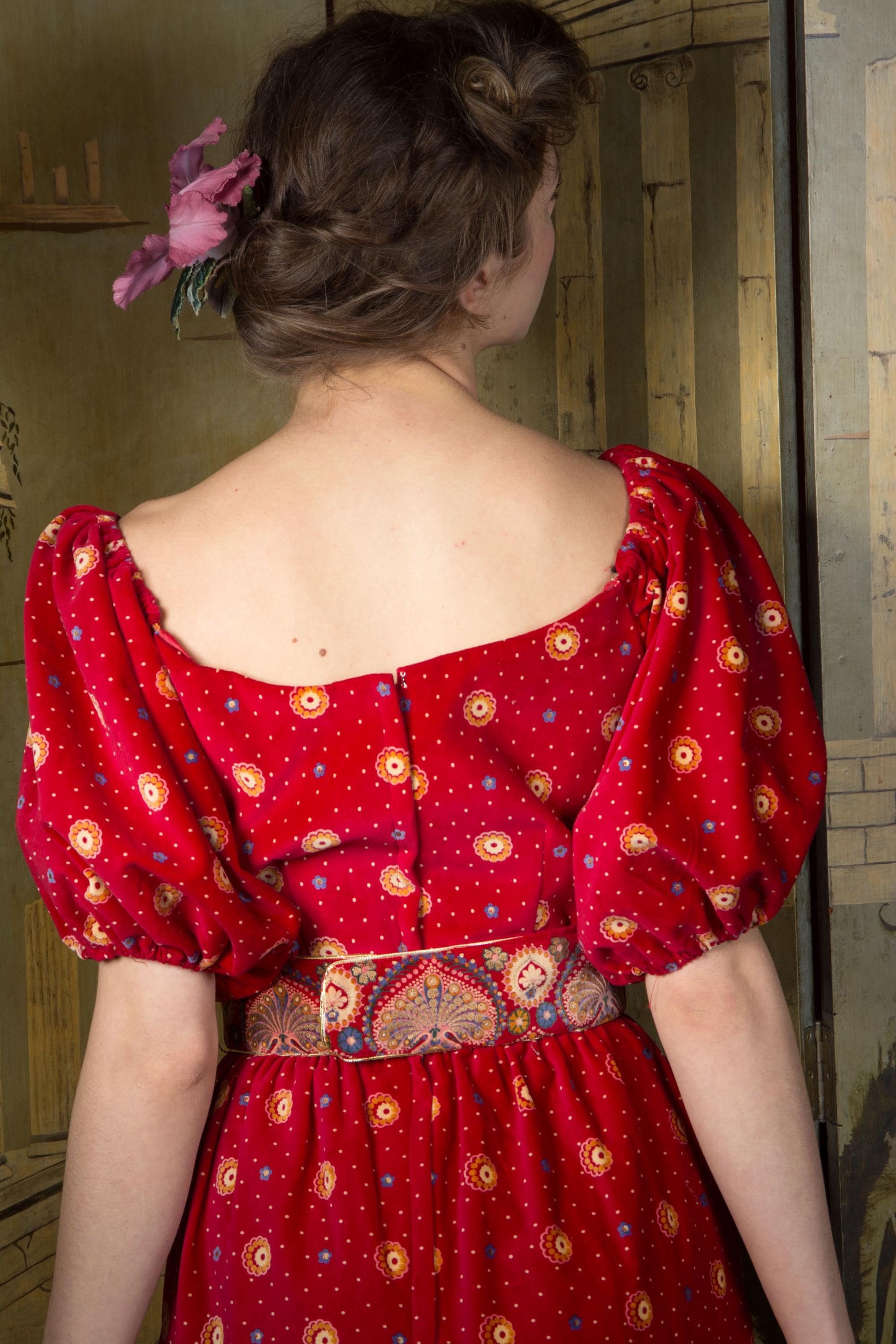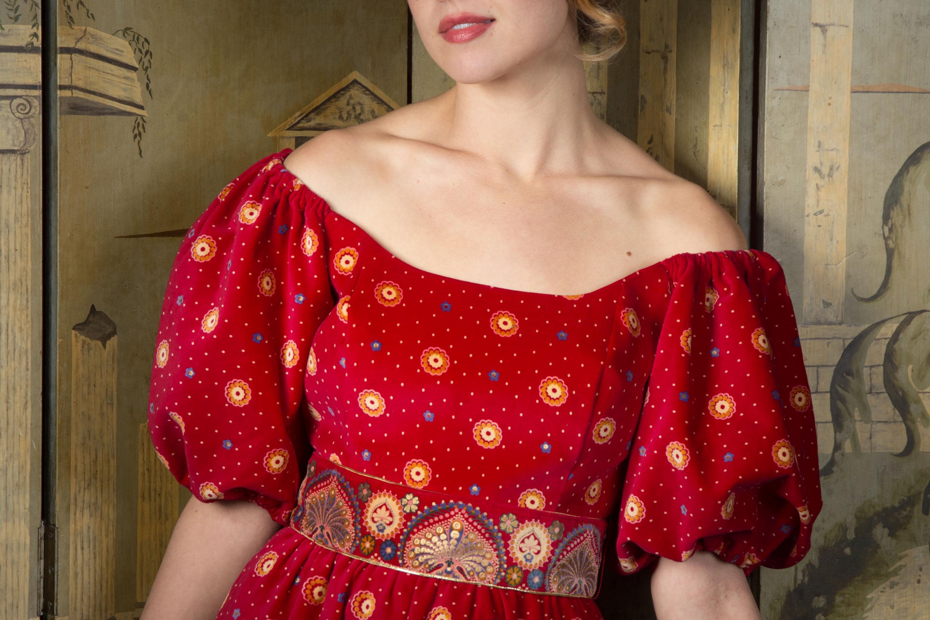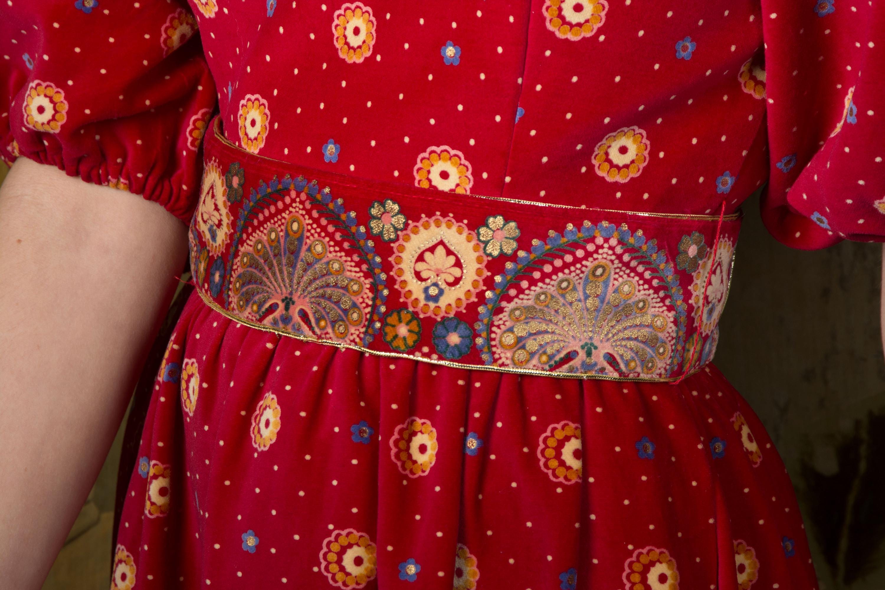 A bold Victor Costa dress of printed velveteen made c. 1979/80. The soft cotton, low nap velveteen is a deep red, printed throughout with dots and flowers in ivory mustard, print and blue. At the border of the hem and belt, this becomes a more dramatic, busy motif, layered over with metallic gold screen printing. The neckline is wide, and the sleeves are giant and puffed, with elastic at the shoulders and cuffs. This is lined through the bodice. The belt closes with hook and eyes.