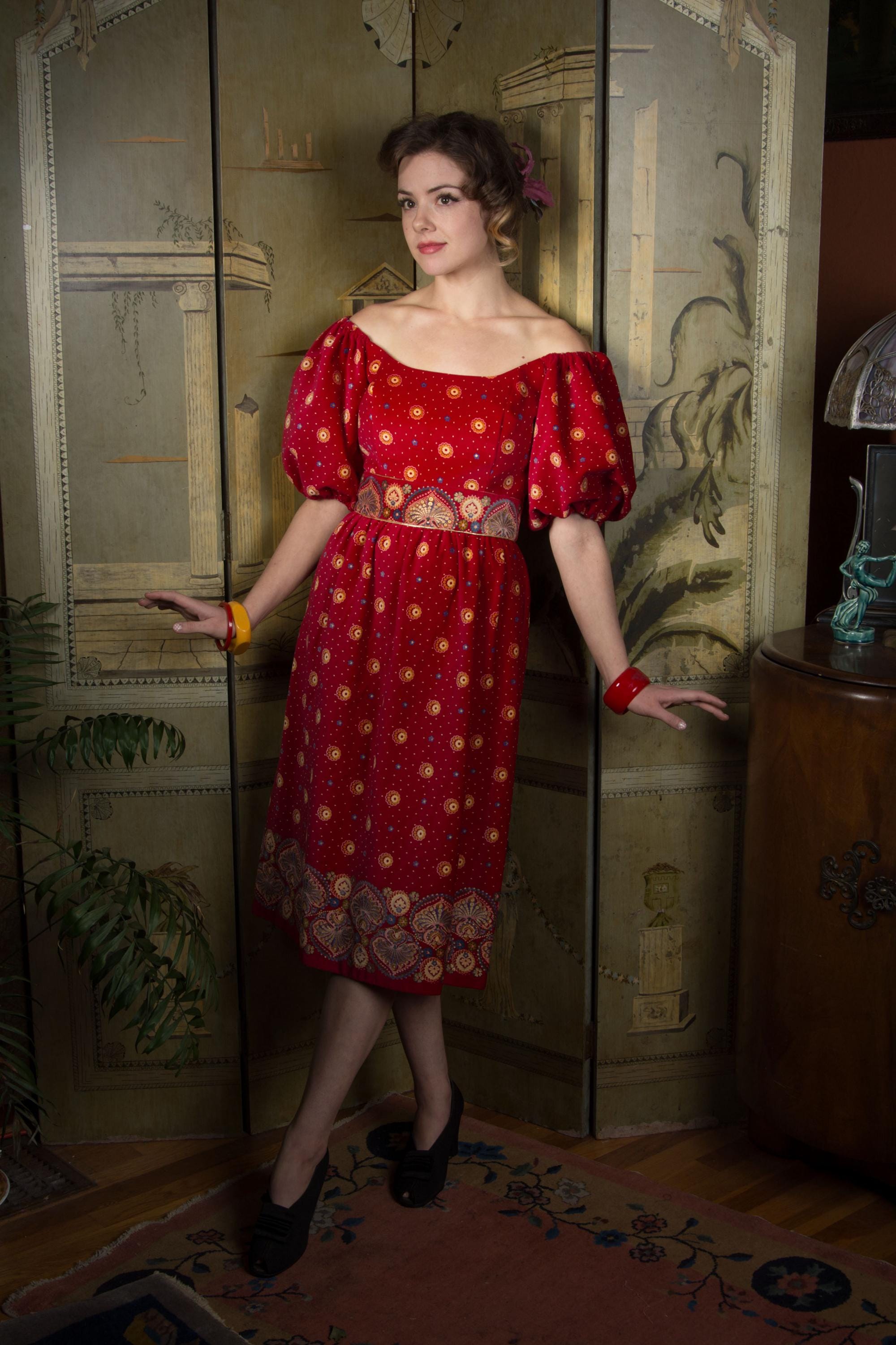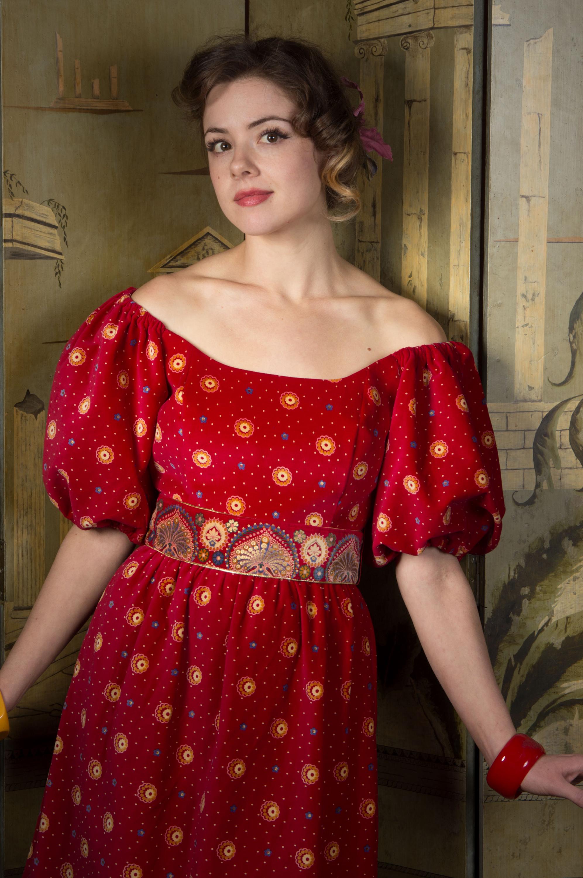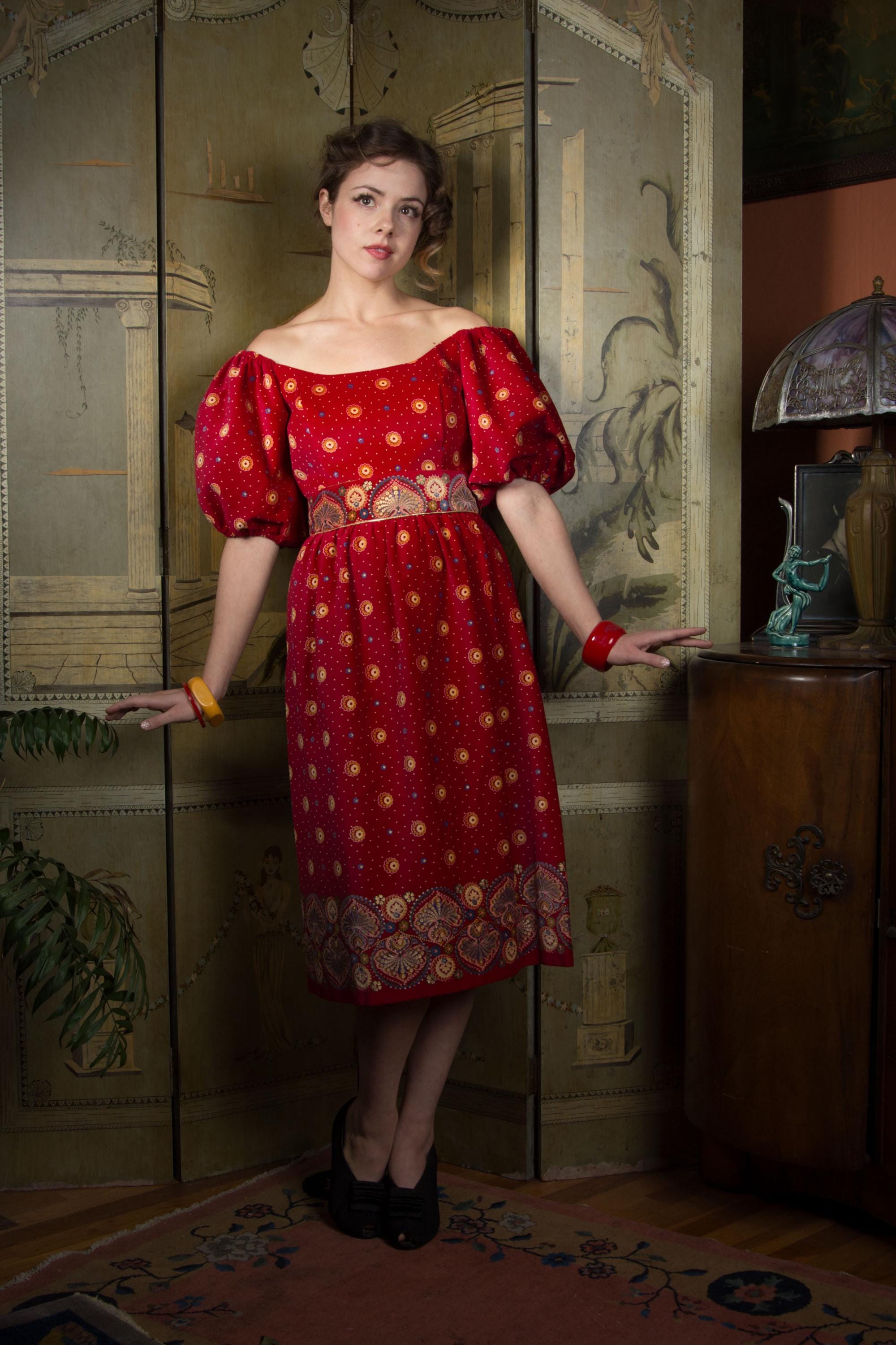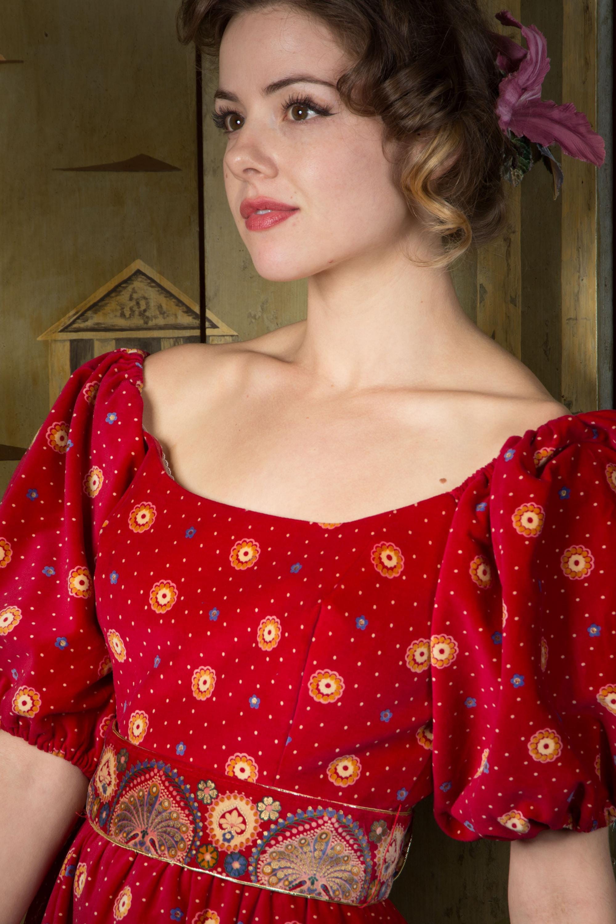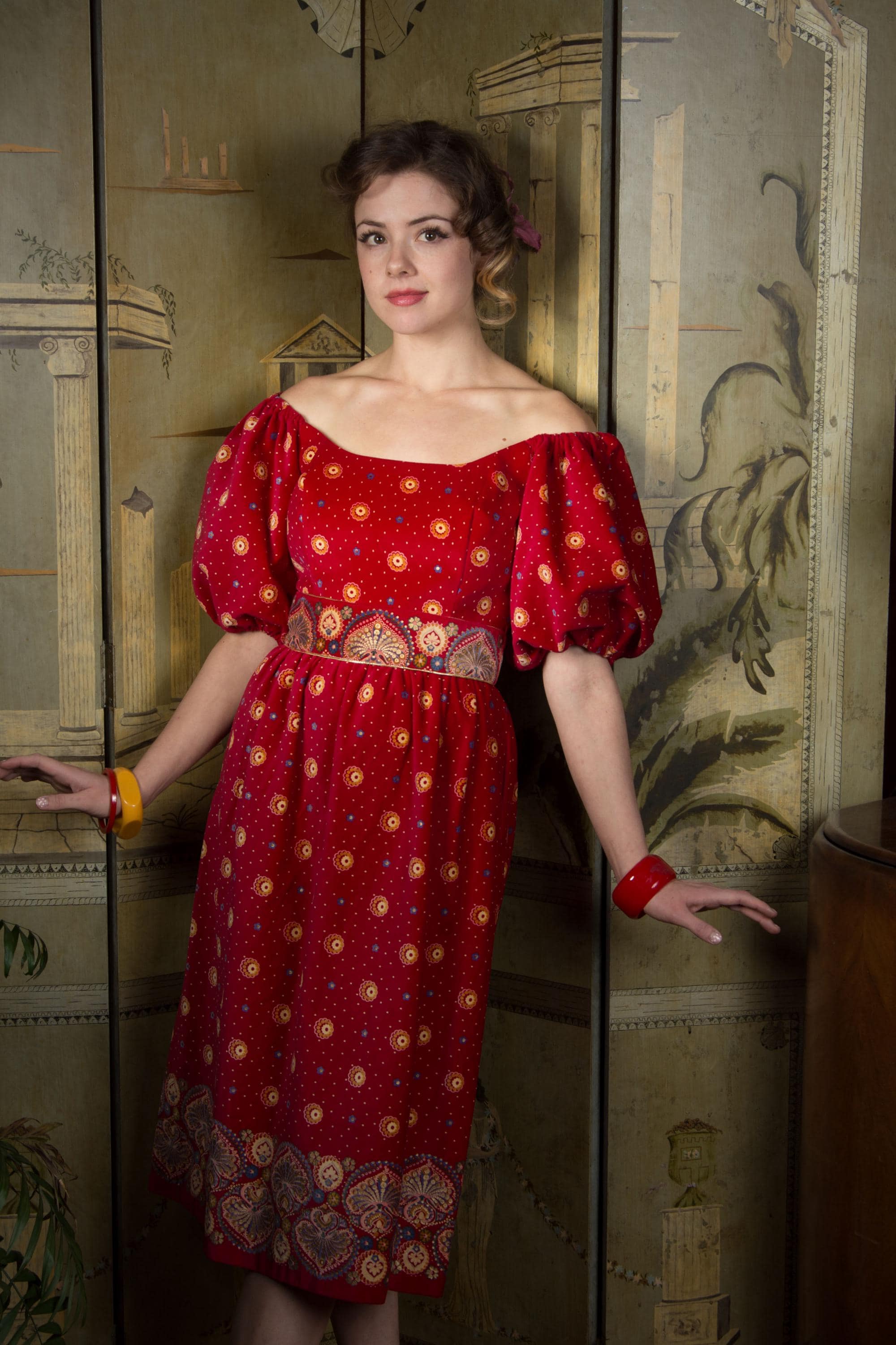 A bold Victor Costa dress of printed velveteen made c. 1979/80. The soft cotton, low nap velveteen is a deep red, printed throughout with dots and flowers in ivory mustard, print and blue. At the border of the hem and belt, this becomes a more dramatic, busy motif, layered over with metallic gold screen printing. The neckline is wide, and the sleeves are giant and puffed, with elastic at the shoulders and cuffs. This is lined through the bodice. The belt closes with hook and eyes.