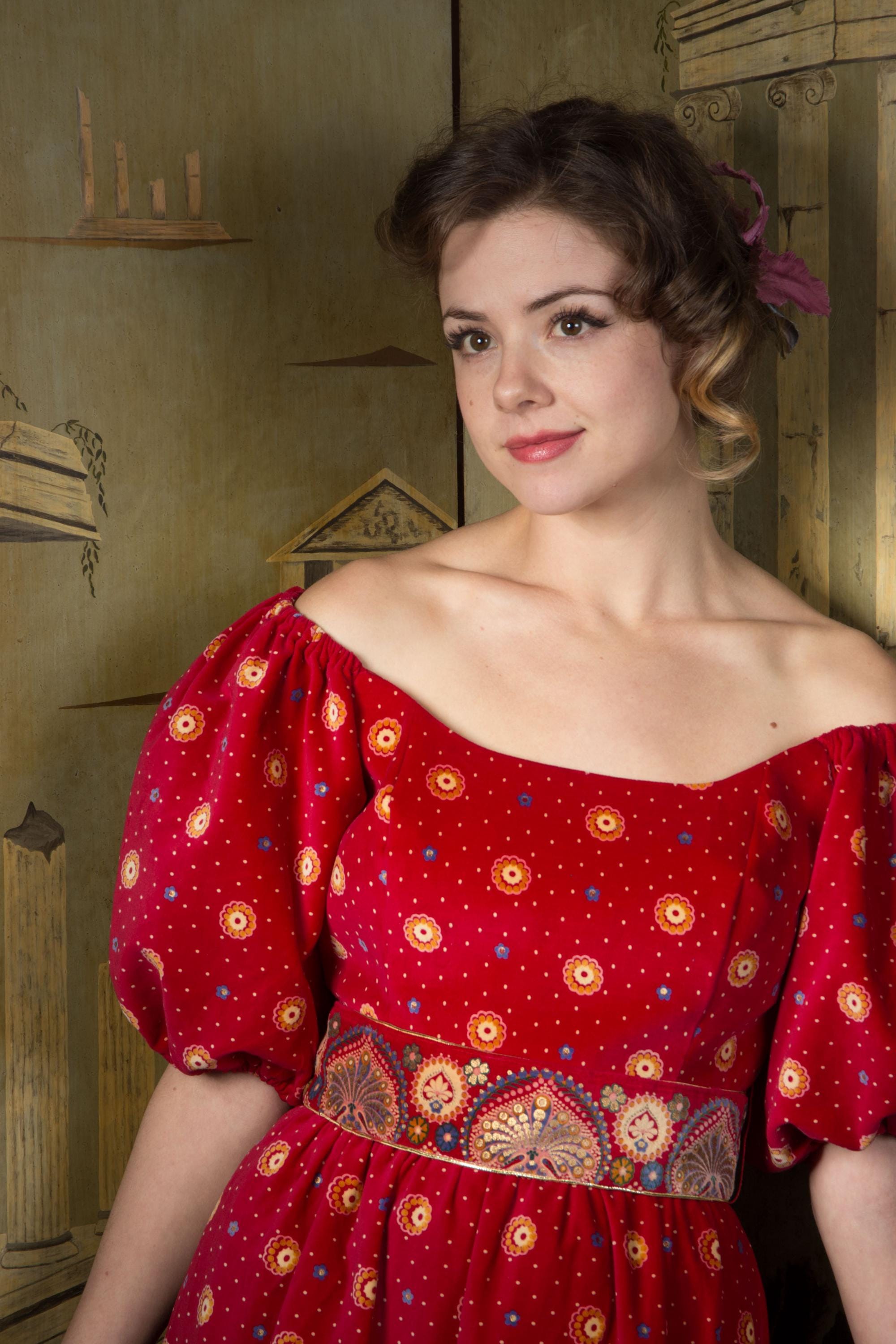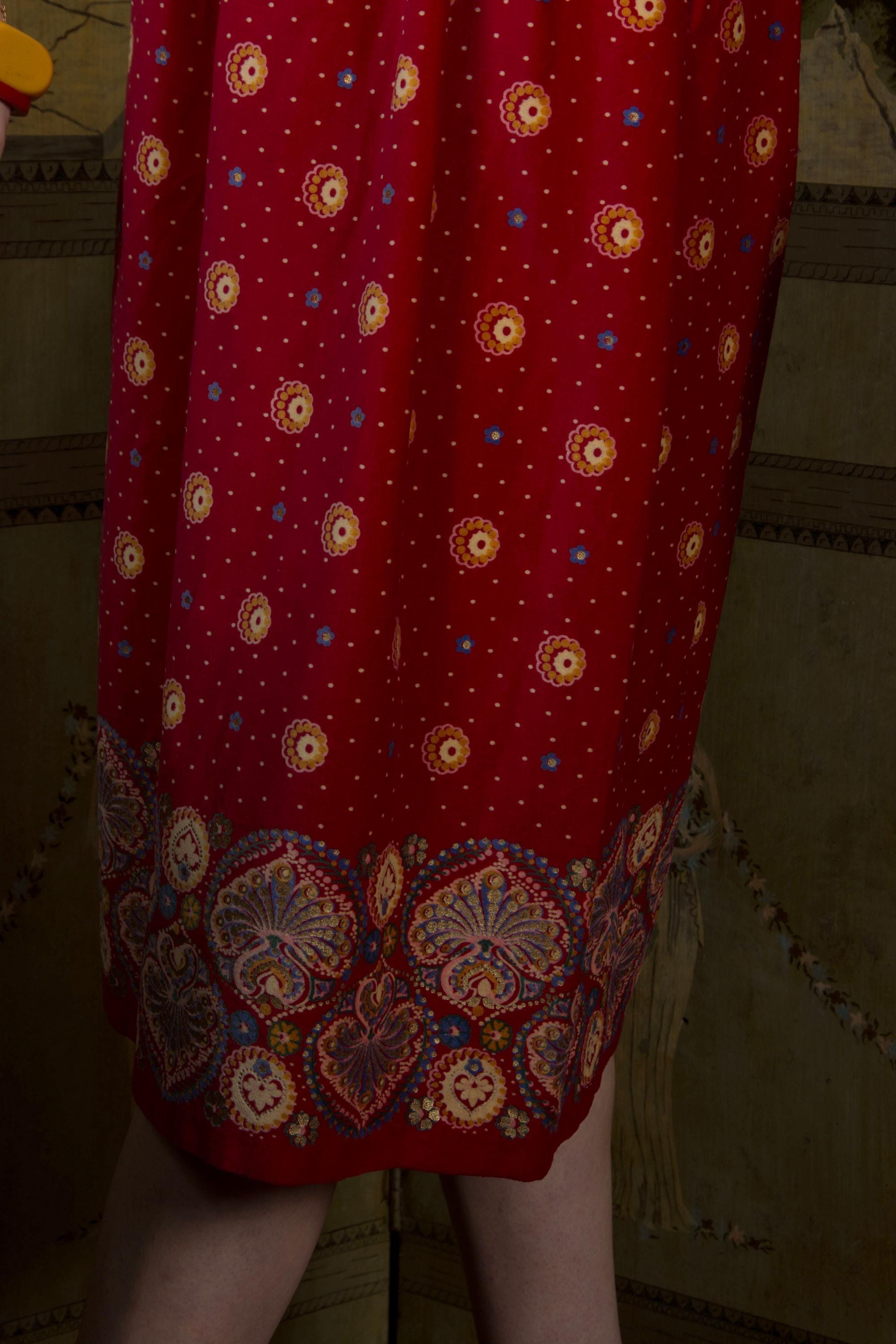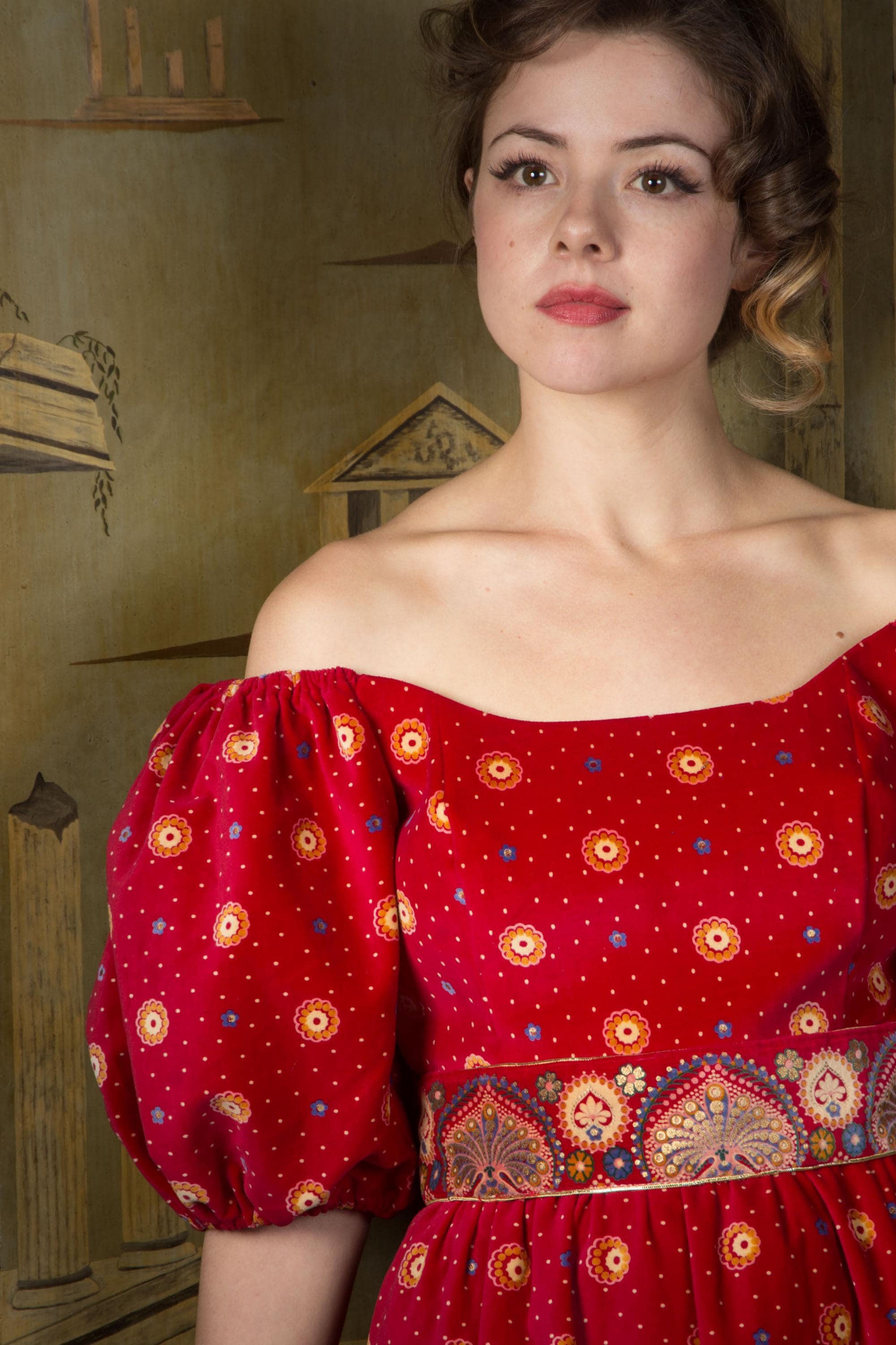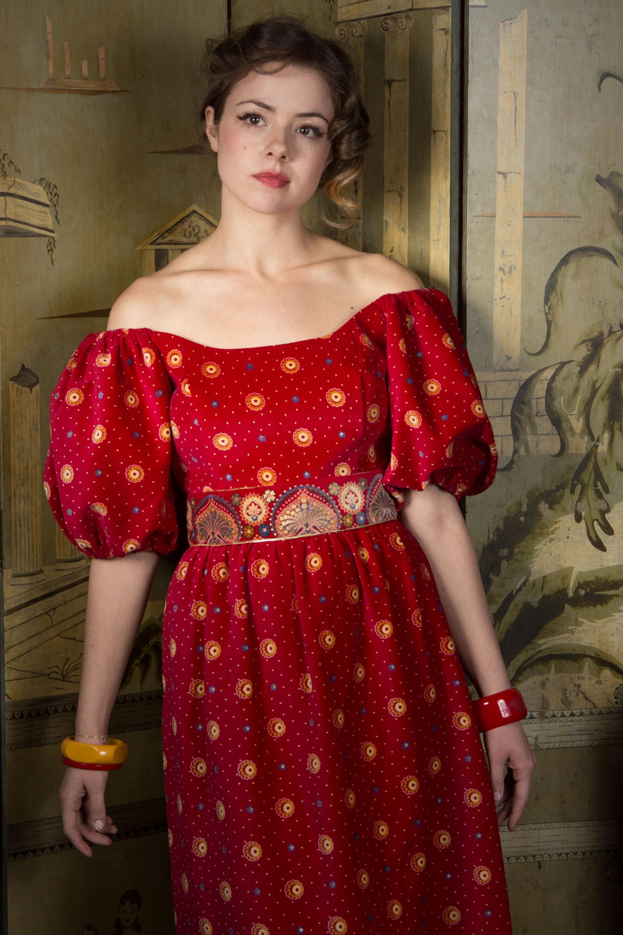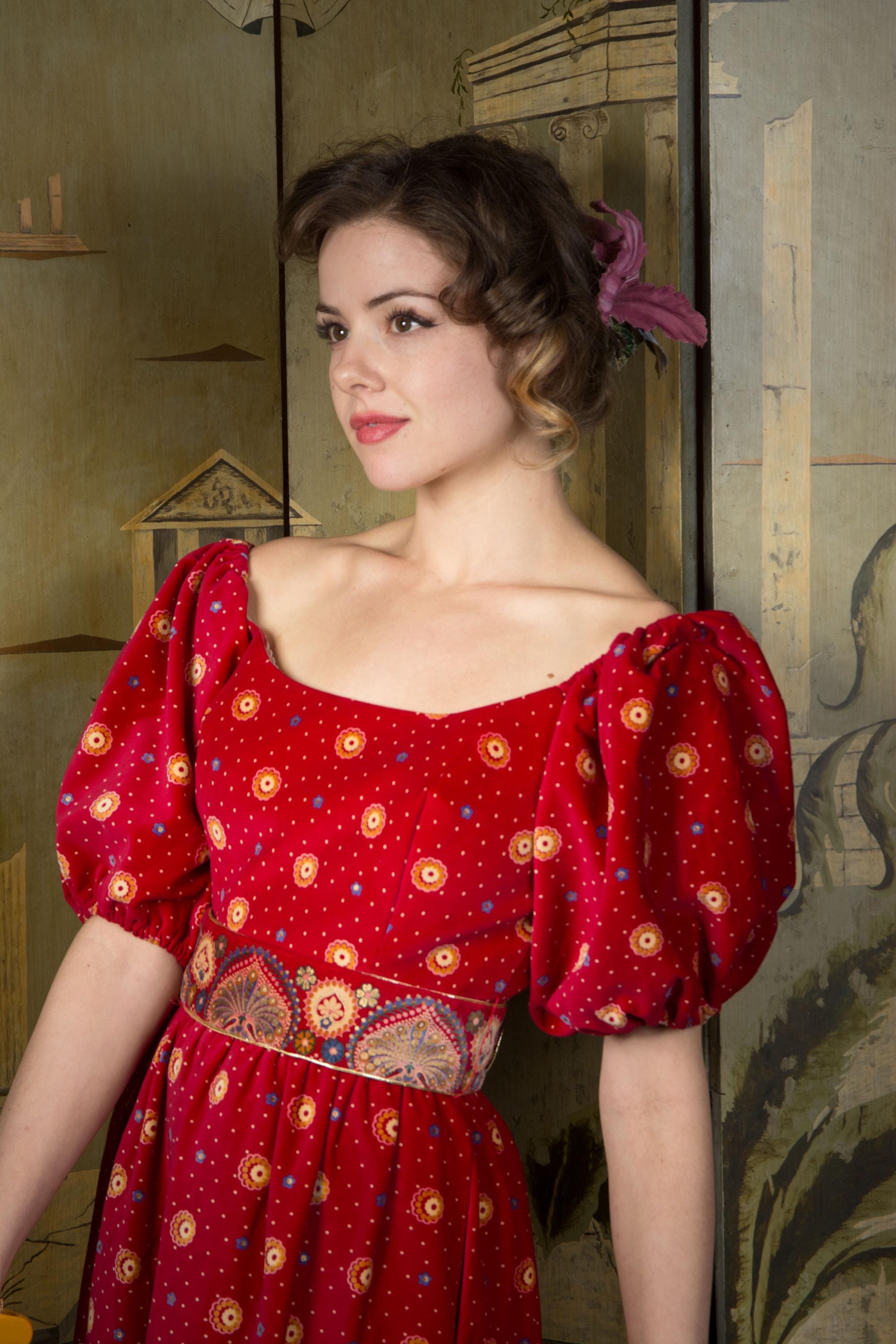 A bold Victor Costa dress of printed velveteen made c. 1979/80. The soft cotton, low nap velveteen is a deep red, printed throughout with dots and flowers in ivory mustard, print and blue. At the border of the hem and belt, this becomes a more dramatic, busy motif, layered over with metallic gold screen printing. The neckline is wide, and the sleeves are giant and puffed, with elastic at the shoulders and cuffs. This is lined through the bodice. The belt closes with hook and eyes.