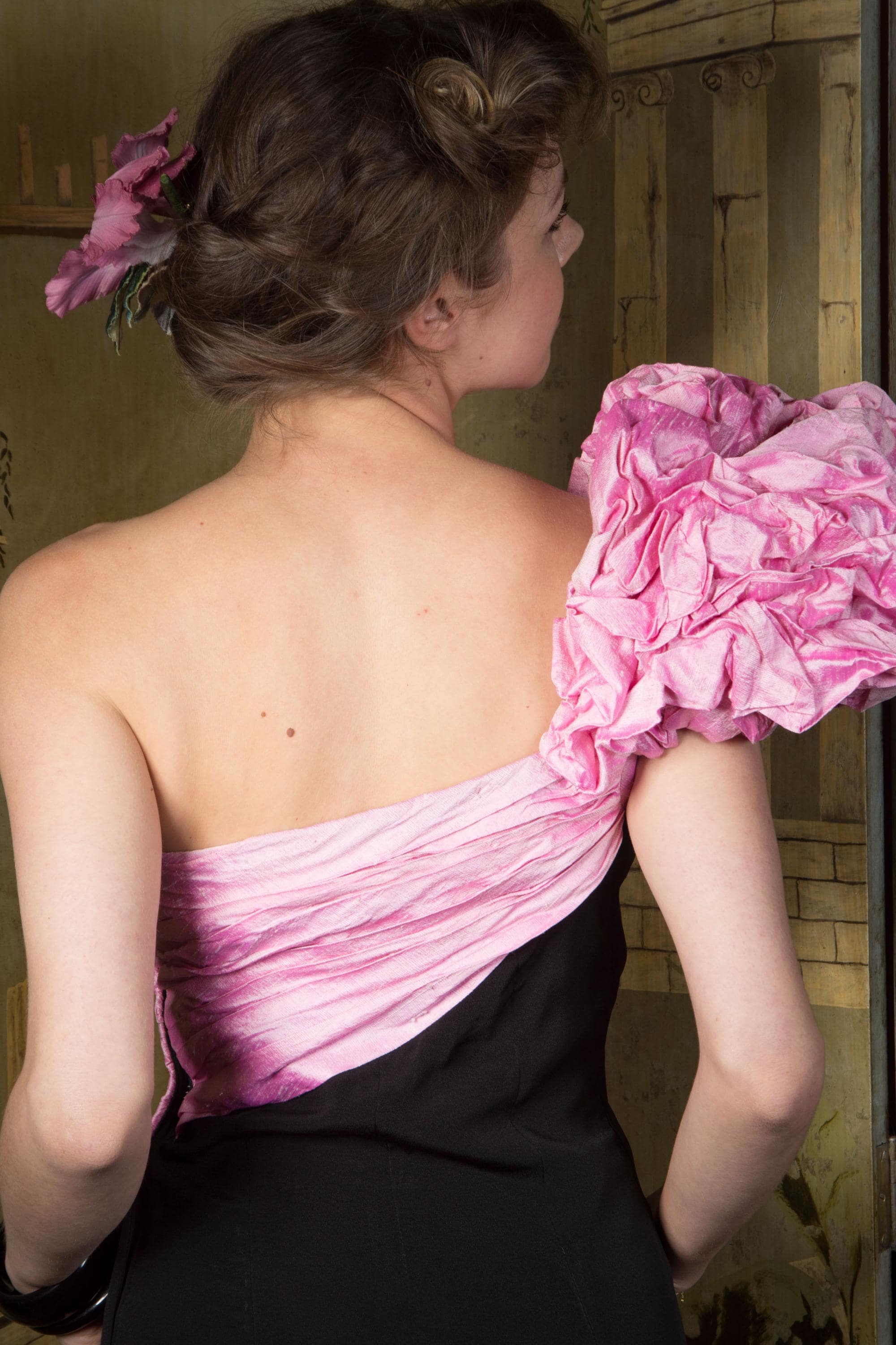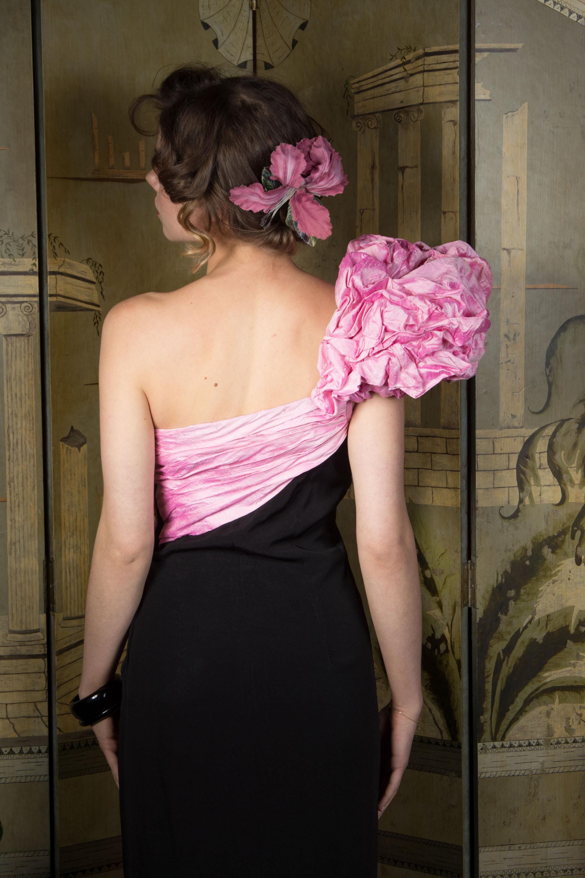 A dramatic 1980s evening dress by Victor Costa, who managed to combine vintage inspiration with elements contemporary to the time. The black element of the dress is a long sheath, not too fitted at the waist, skimming over the hips. It is fully lined. What makes this dress, though, is the swath of lustrous pink raw silk that sweeps up from the left bust, becoming a giant mid-80s pouf as the one shoulder on the right. This closes on the side with a metal zipper.