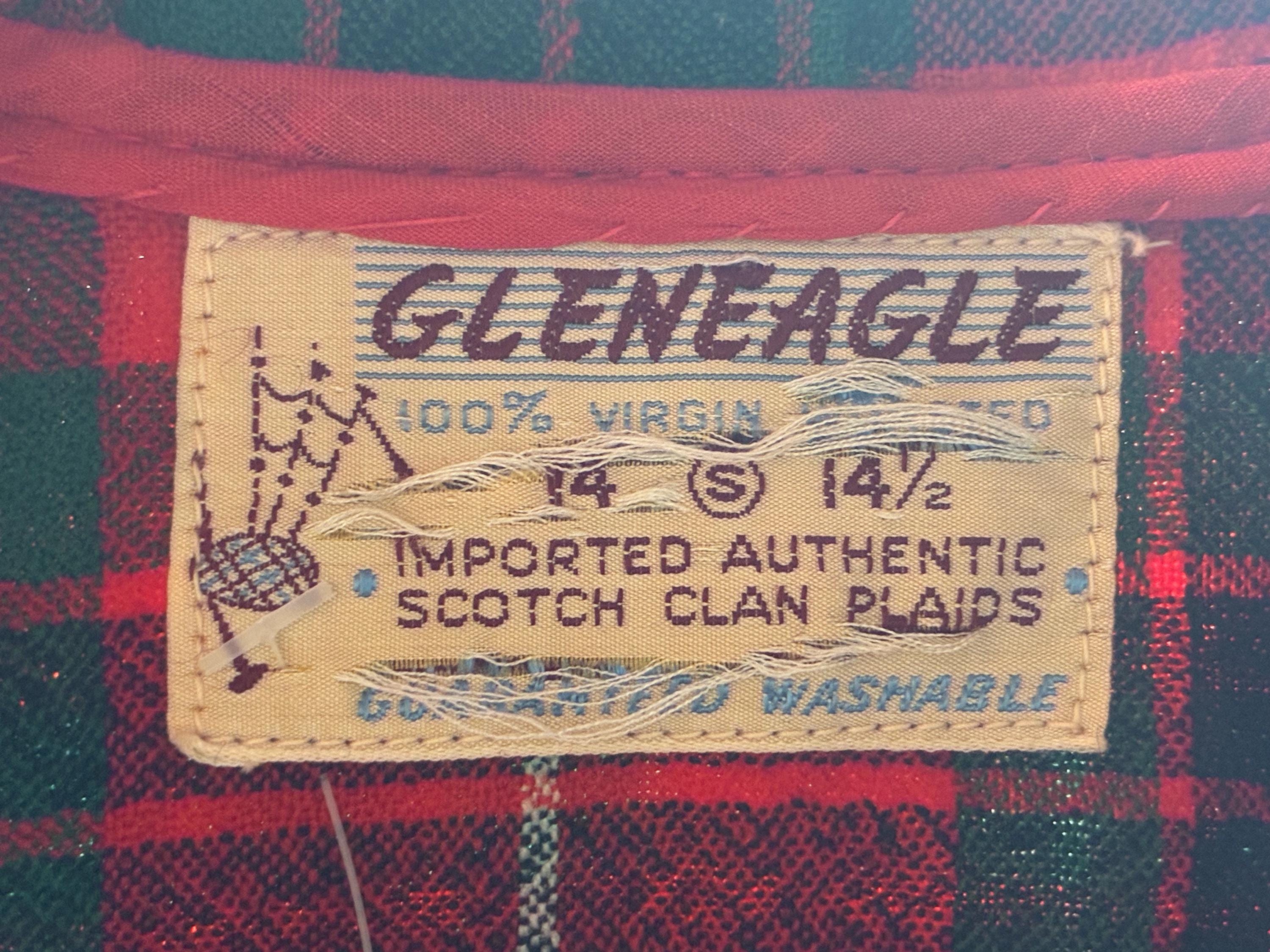 Label: Gleneagle, 100% Virgin Worsted, Imported Authentic Scotch Clan Plaids, Guaranteed Washable