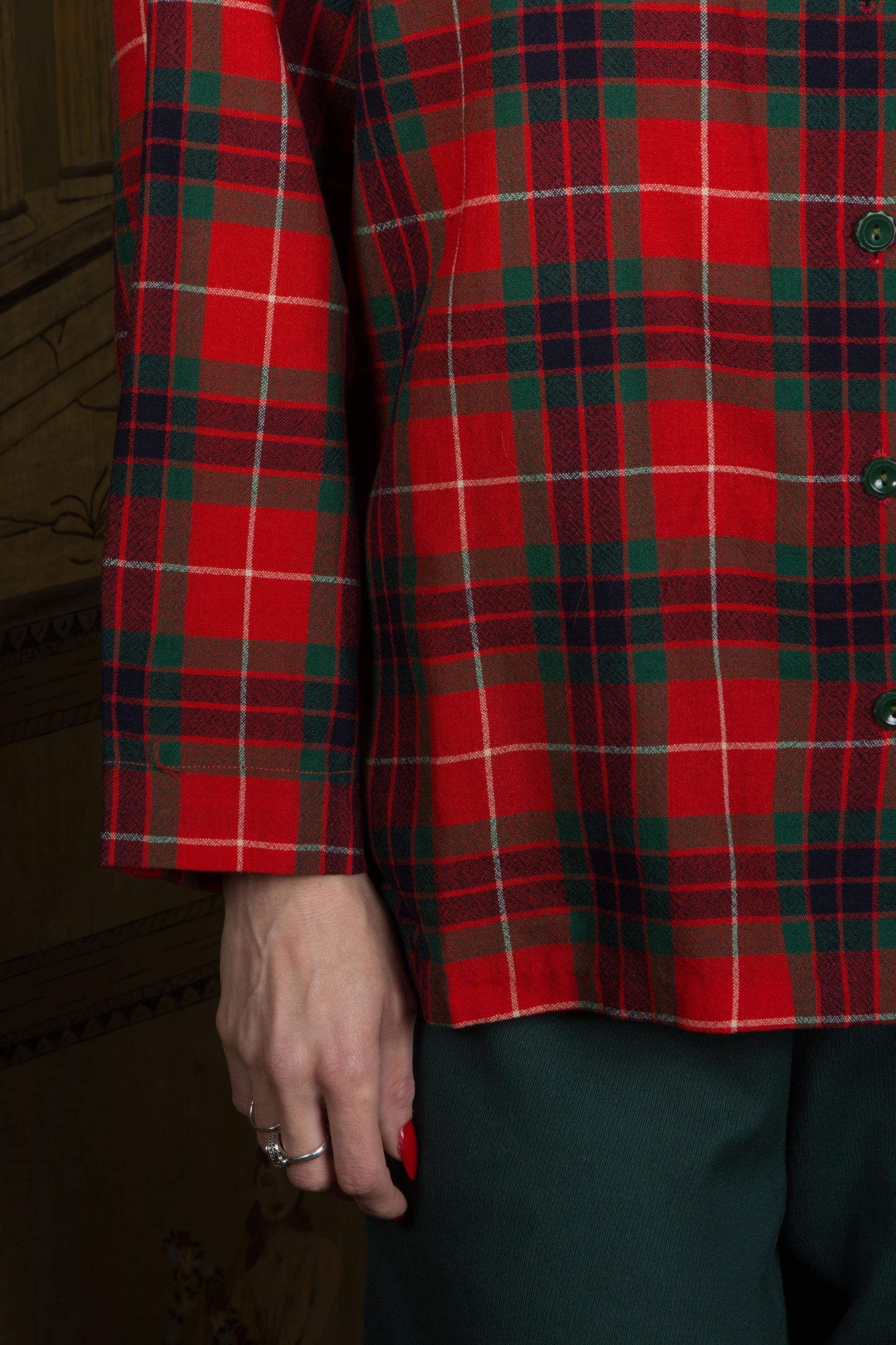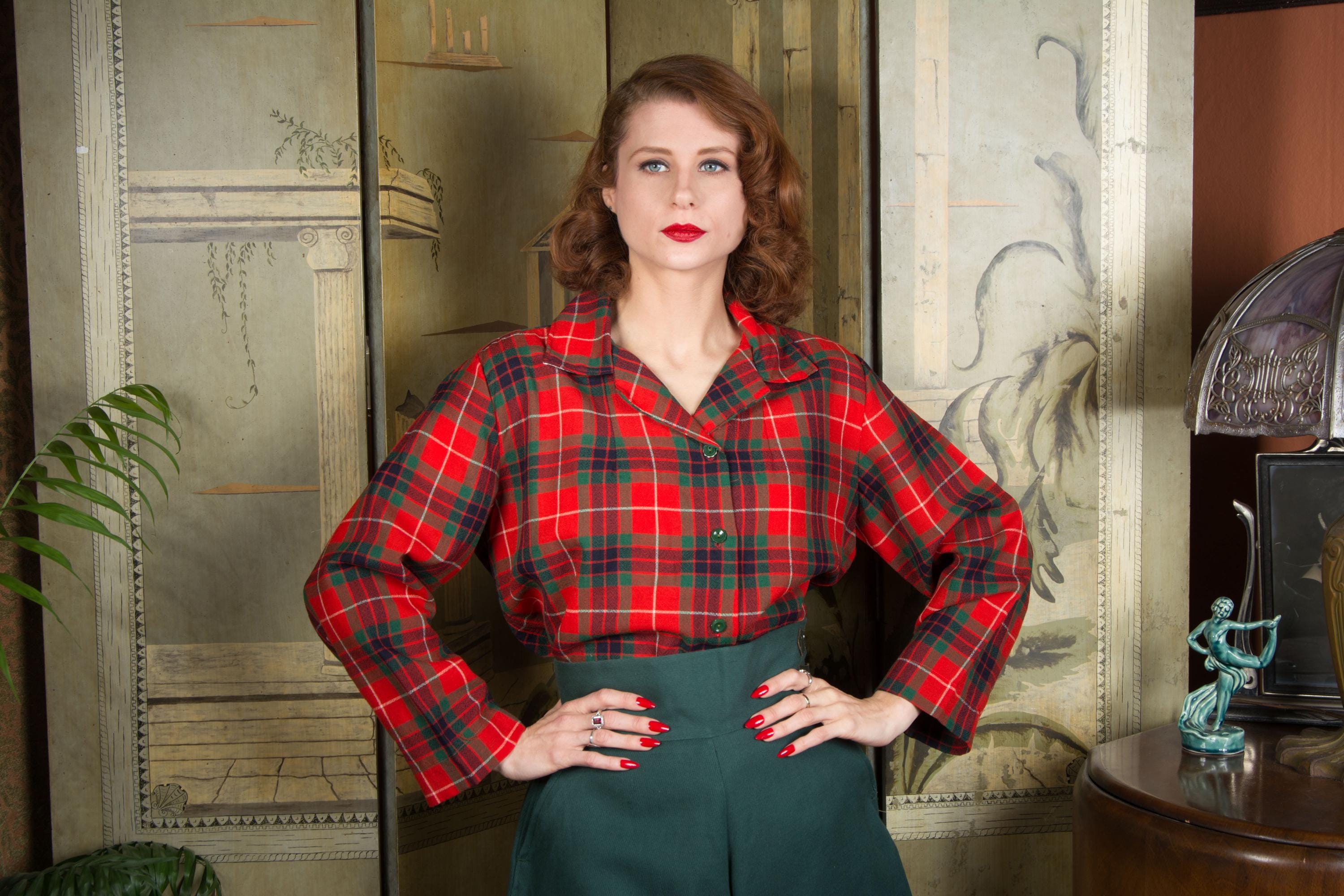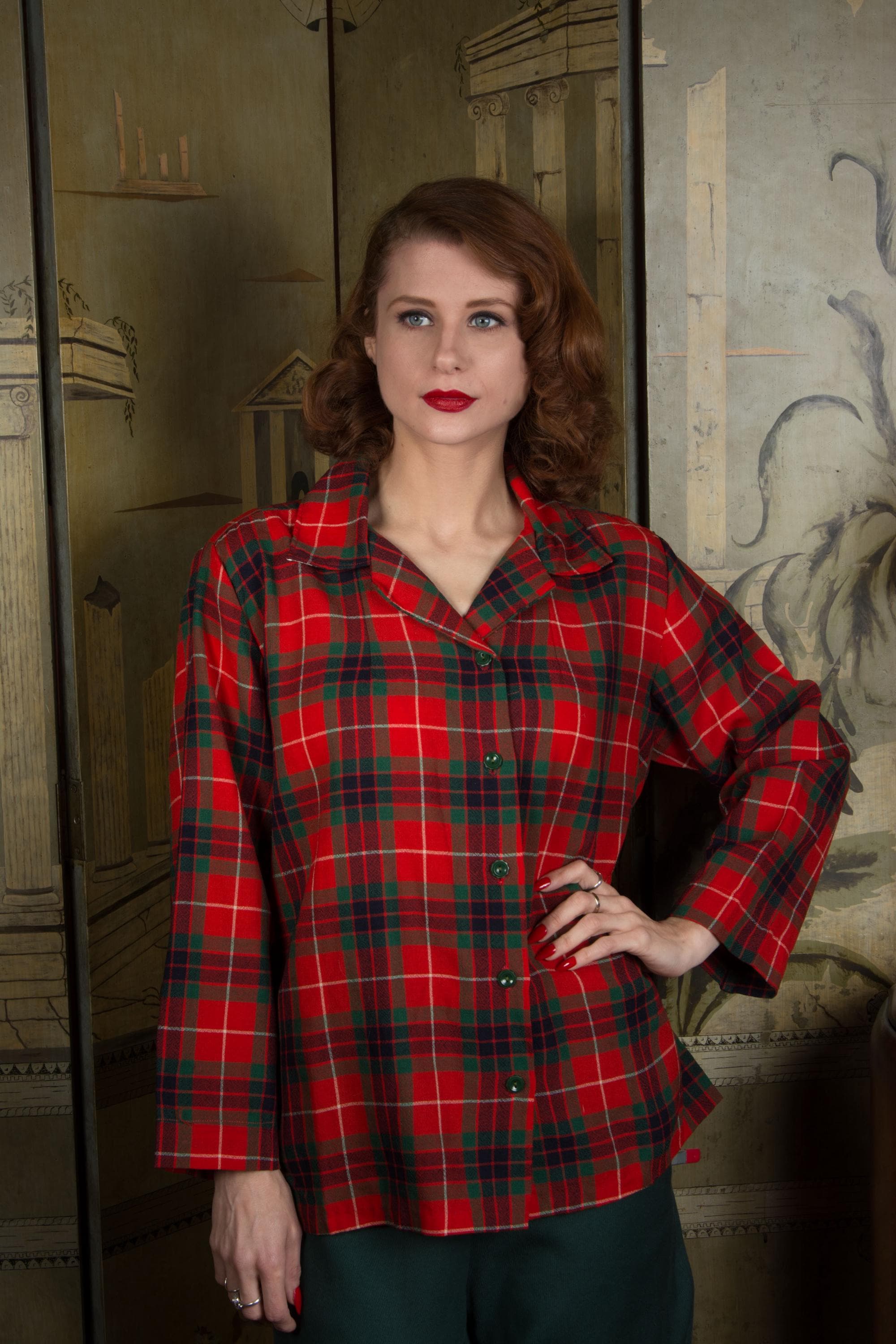 A vintage wool shirt, originally men's, but altered - quite likely in era - to a women's design with shorter sleeves and some light darts at the back. The wool has a crepe like weave, lightweight and crisp. The buttons were changed out to more stylish period green buttons. Can be worn out or tucked in. Looks great with the sleeves pushed up.