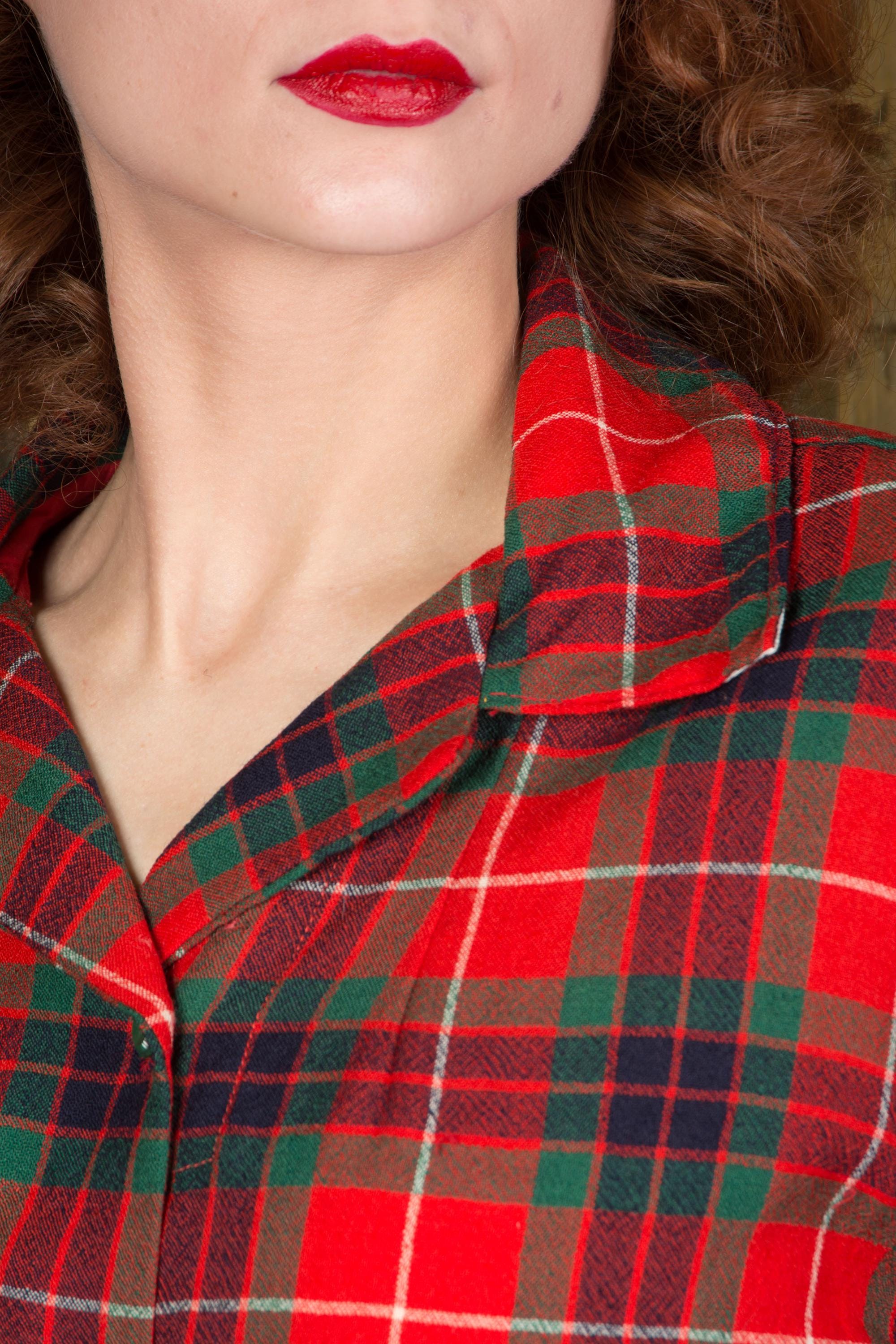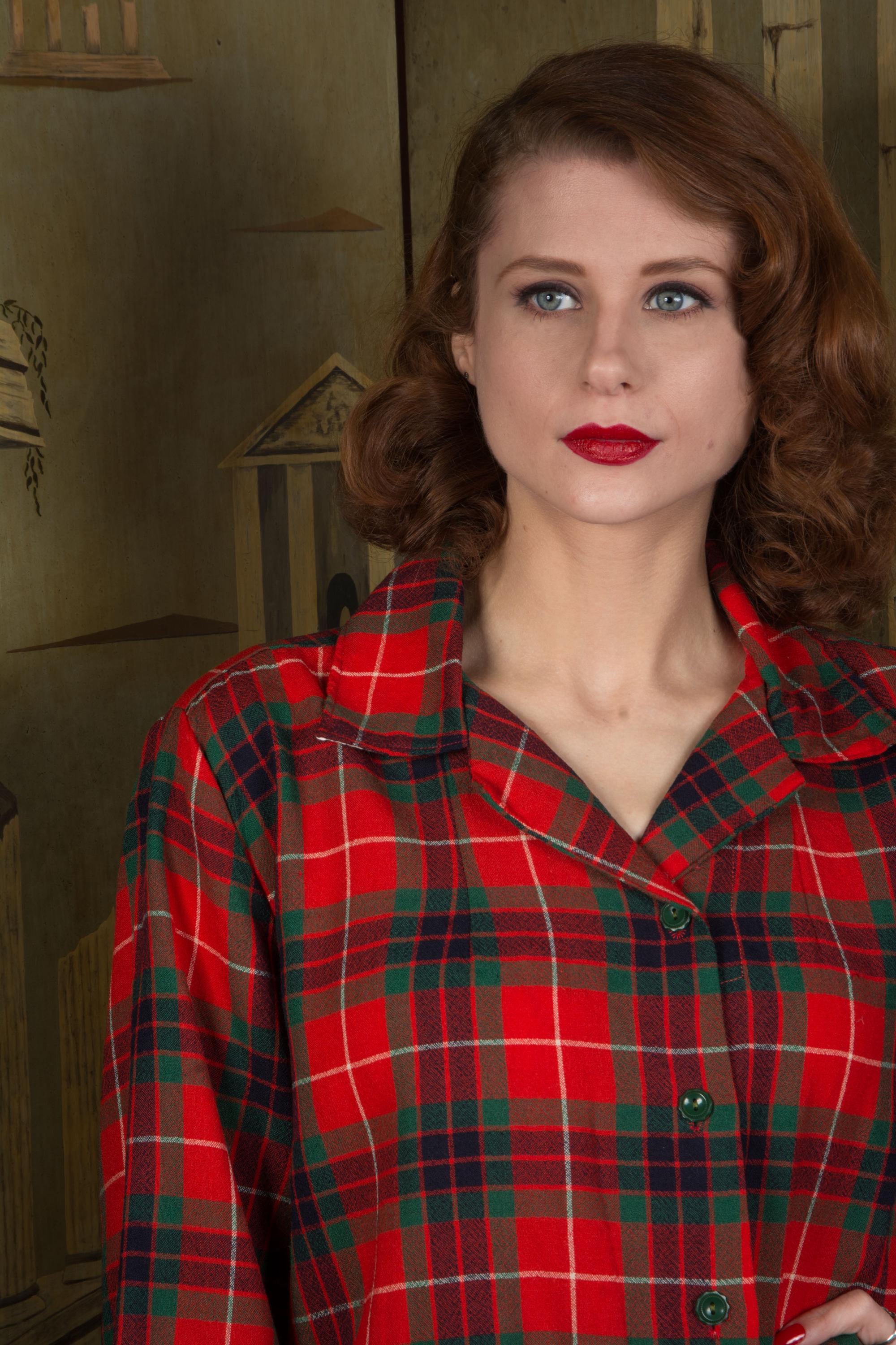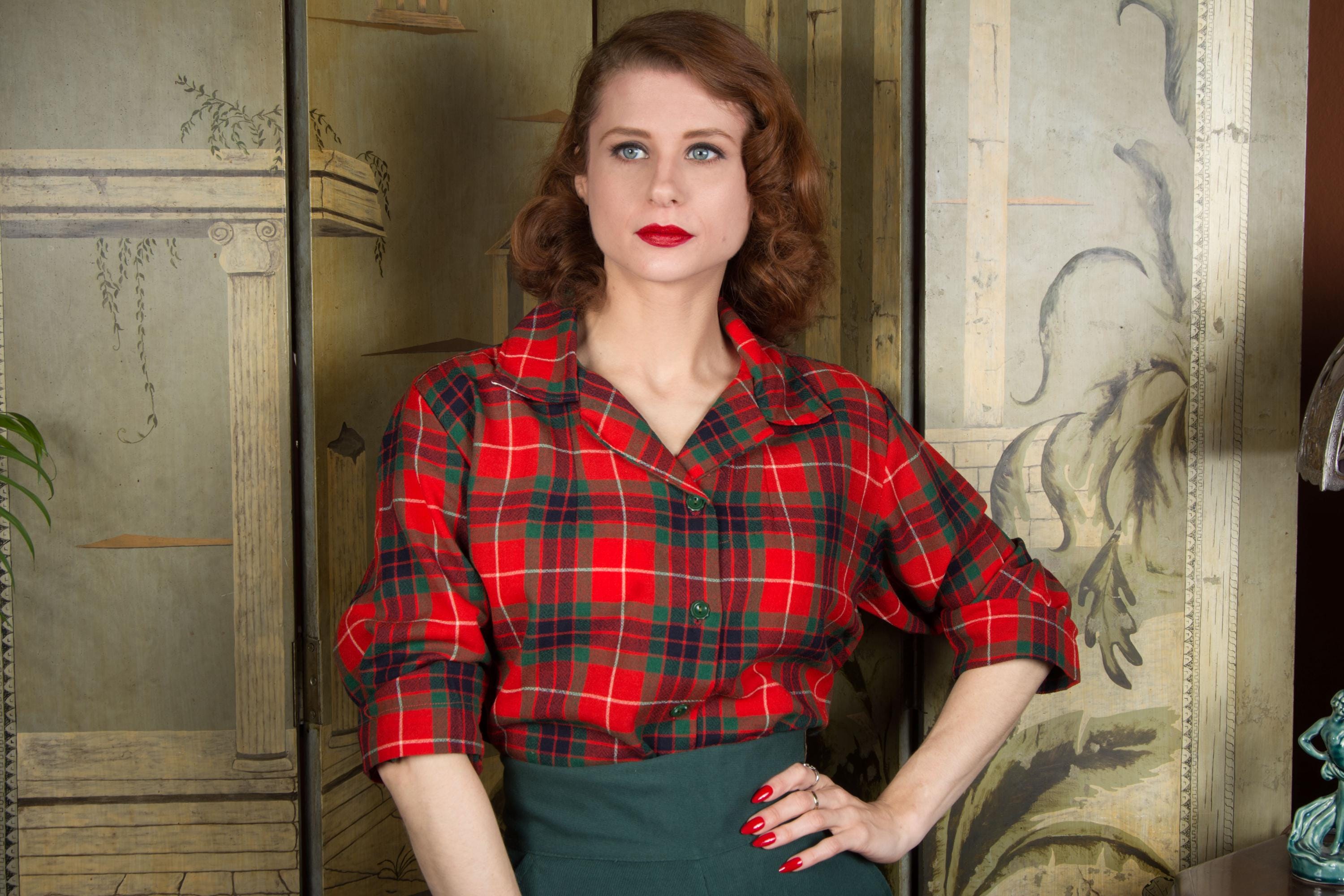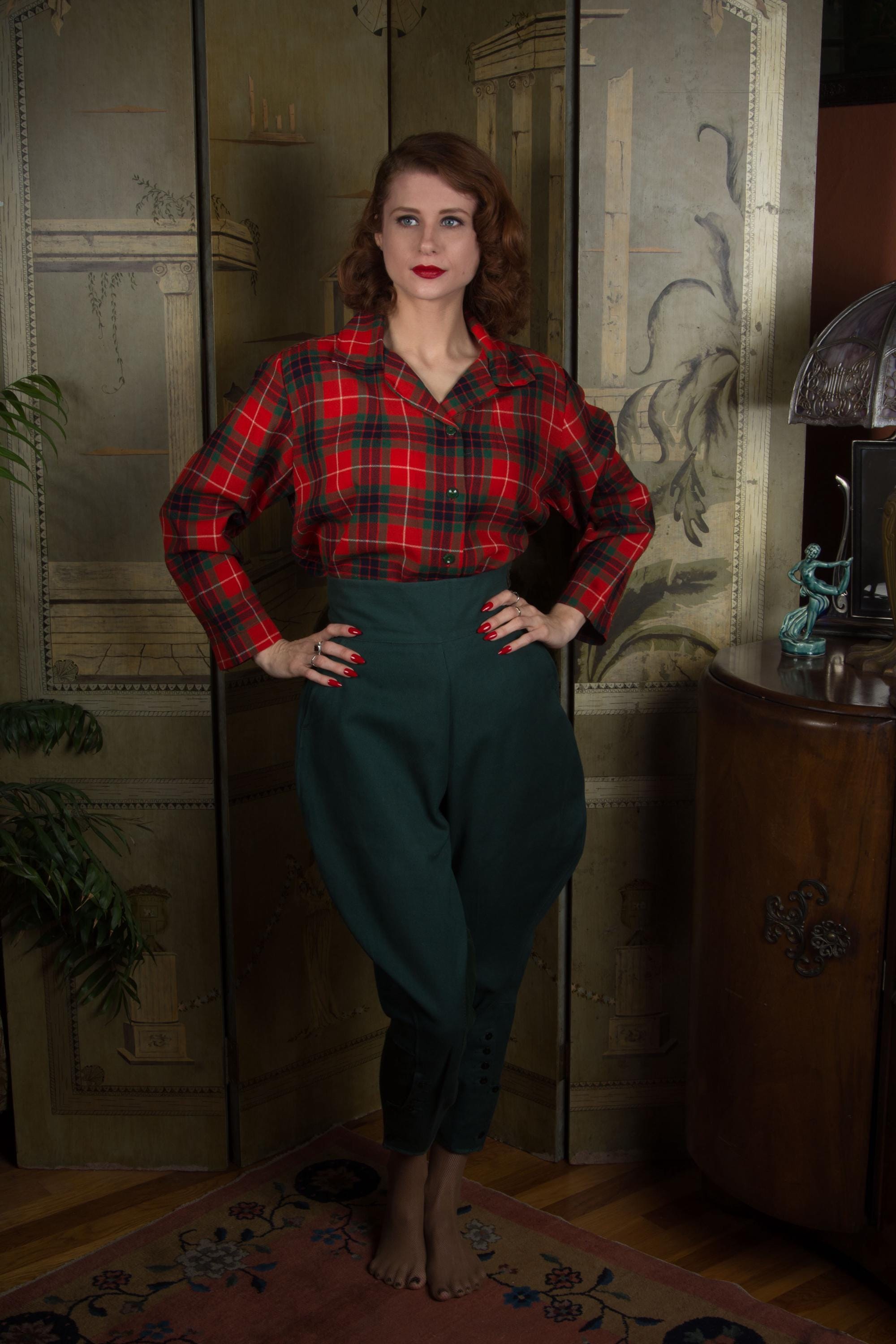 A vintage wool shirt, originally men's, but altered - quite likely in era - to a women's design with shorter sleeves and some light darts at the back. The wool has a crepe like weave, lightweight and crisp. The buttons were changed out to more stylish period green buttons. Can be worn out or tucked in. Looks great with the sleeves pushed up.