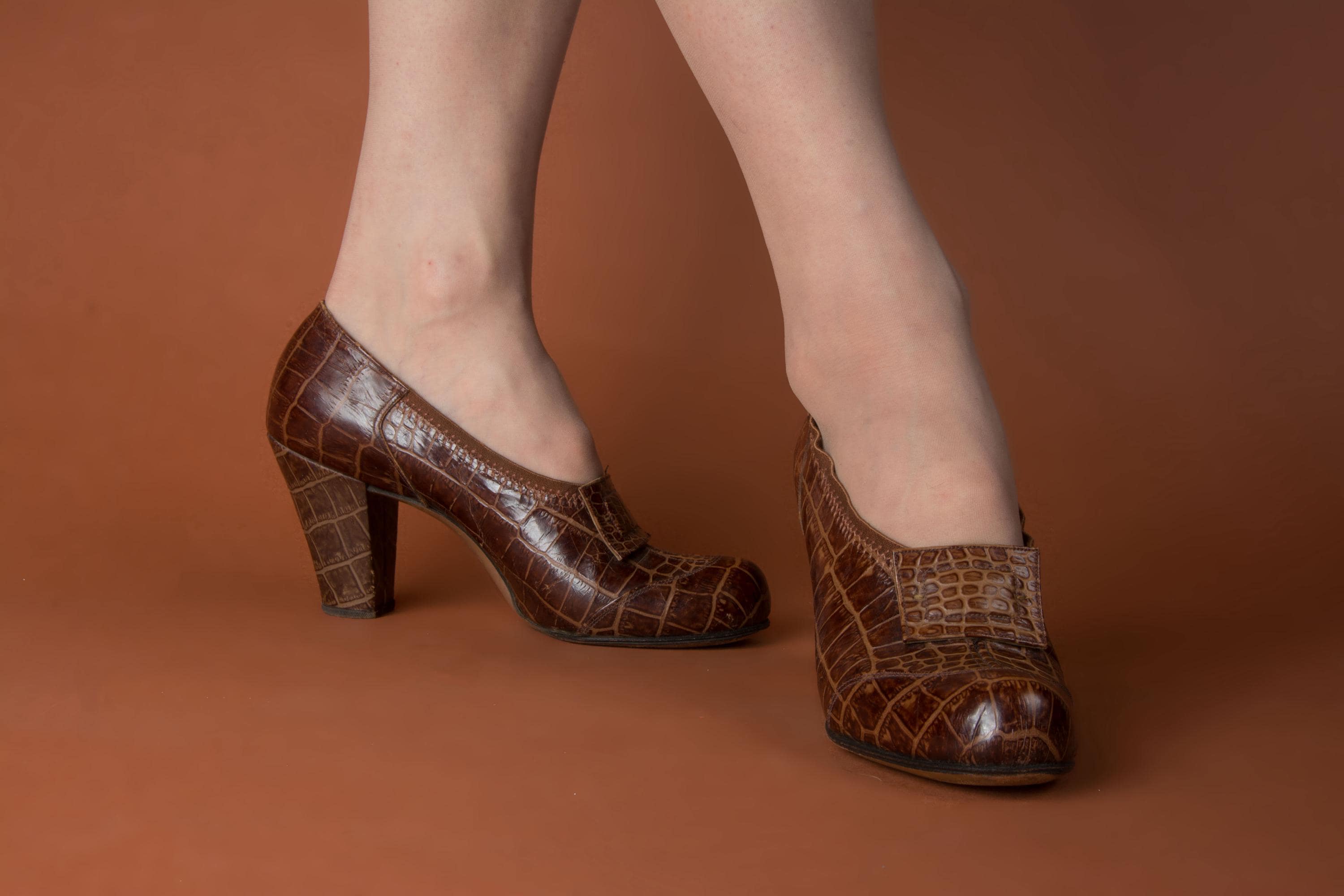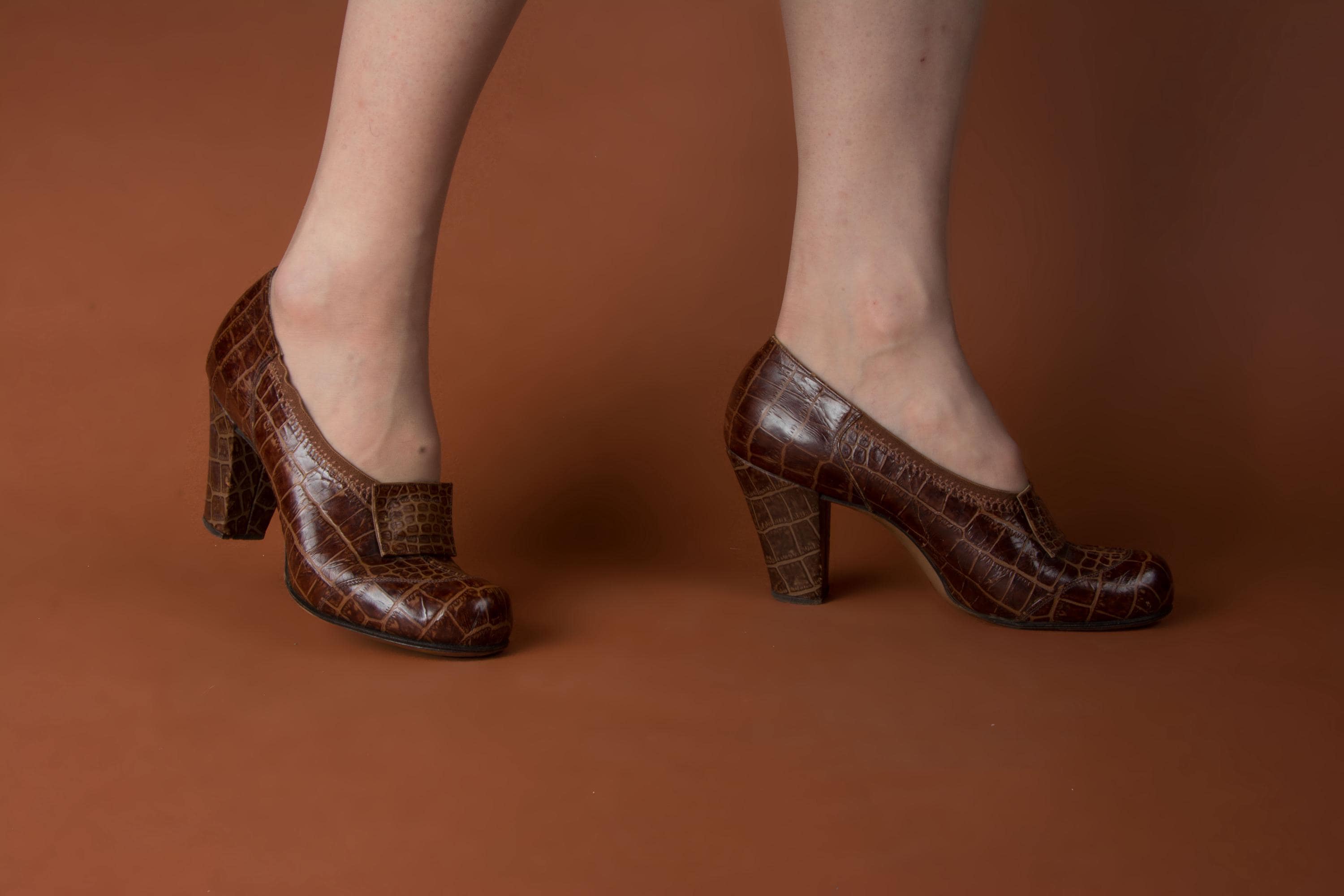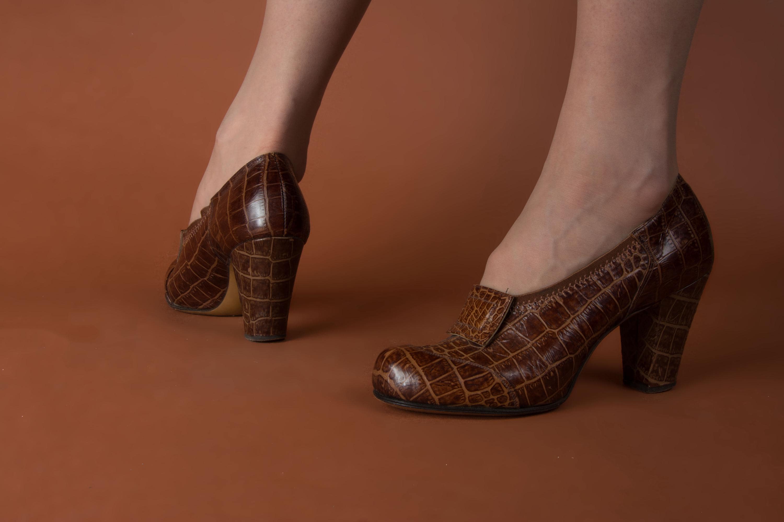 These gorgeous later 1930s heels have my favorite silhouette - a blocky but rounded toe, and a blocky heel on a steep angle. It's made of a pressed leather with a bitey lizard type pattern. It's beautifully pieces with smaller "scales" at the front of the toe, and larger at the back. The foot opening is edged with elastic to help hold it snugly on the foot.
