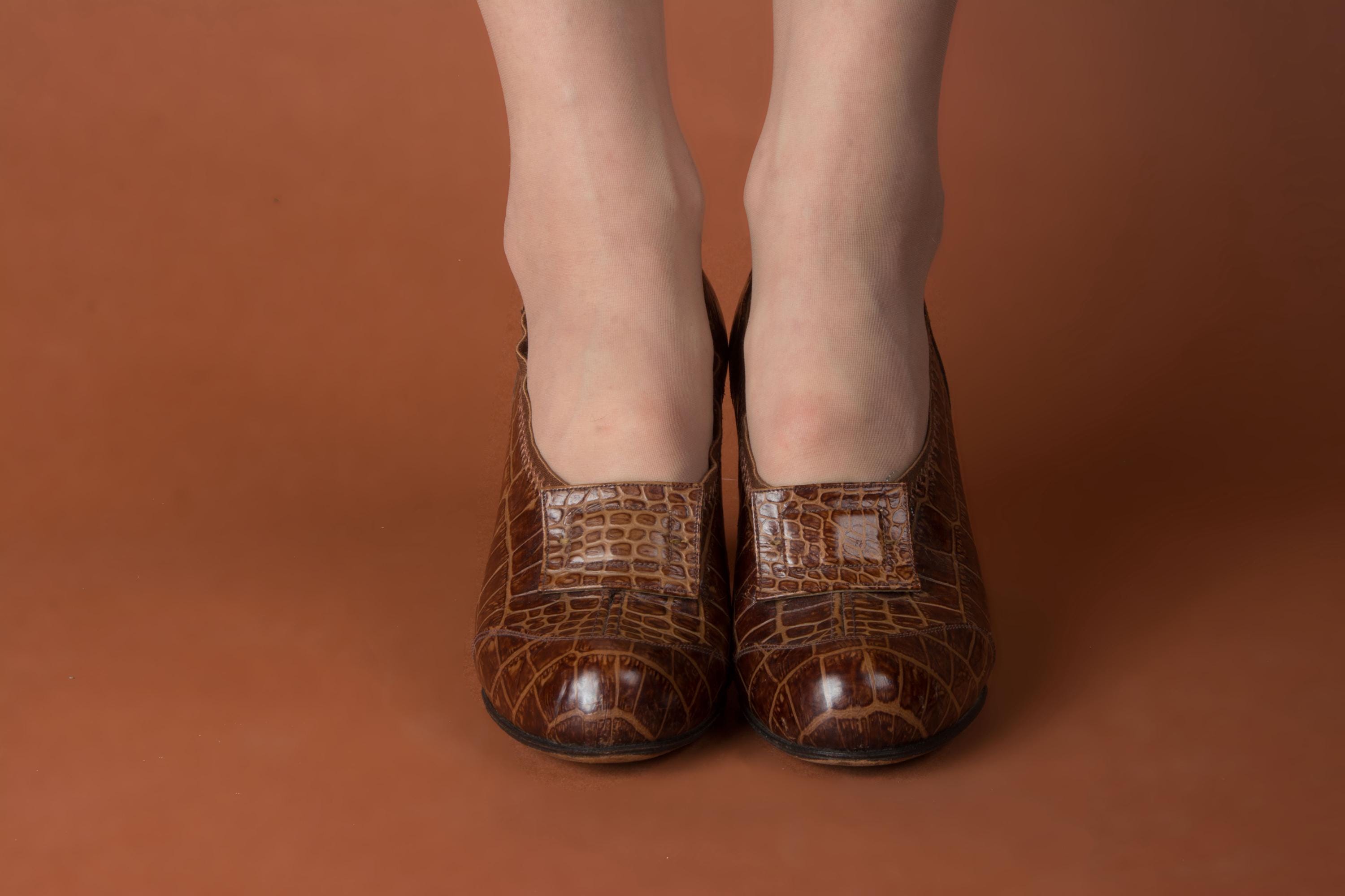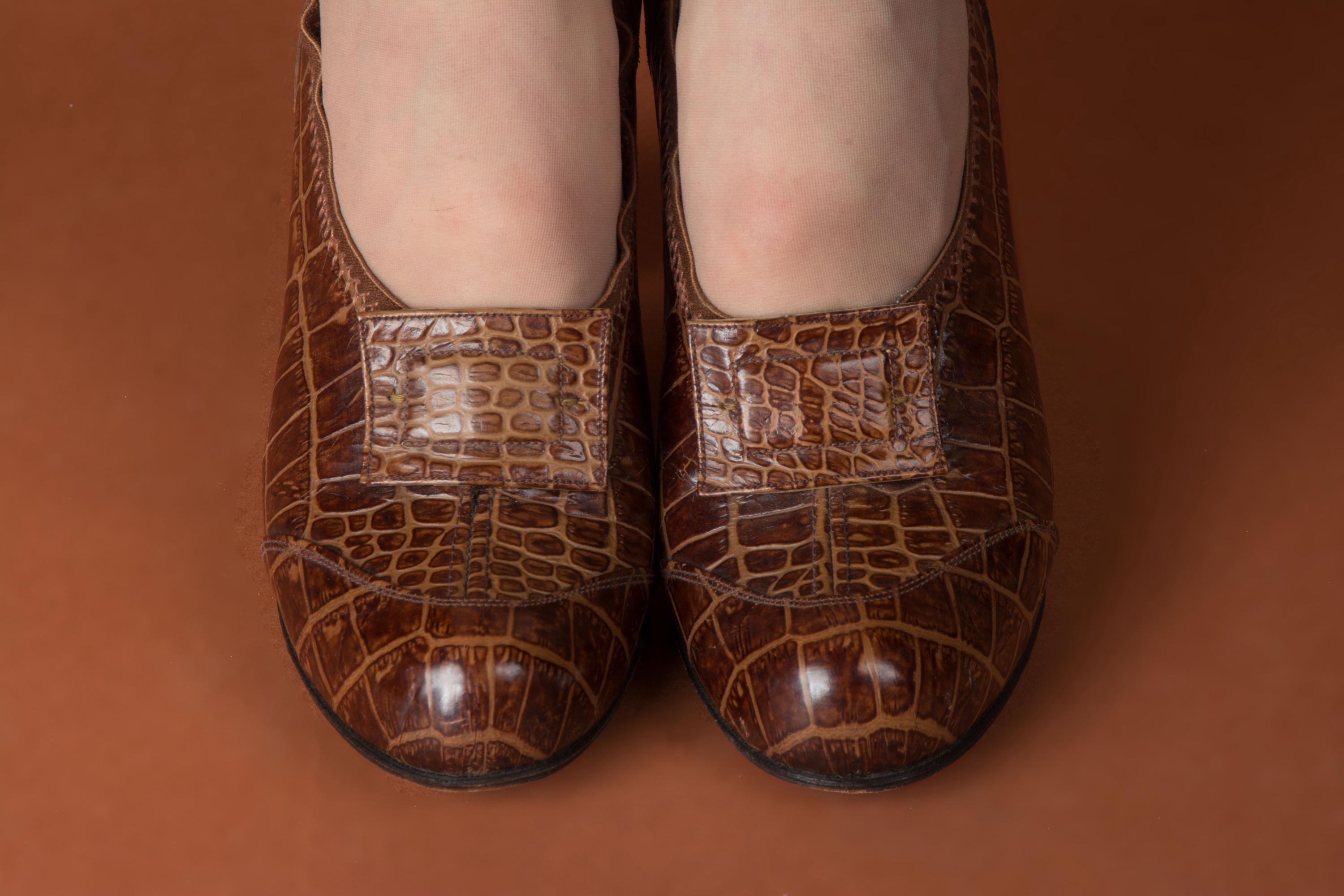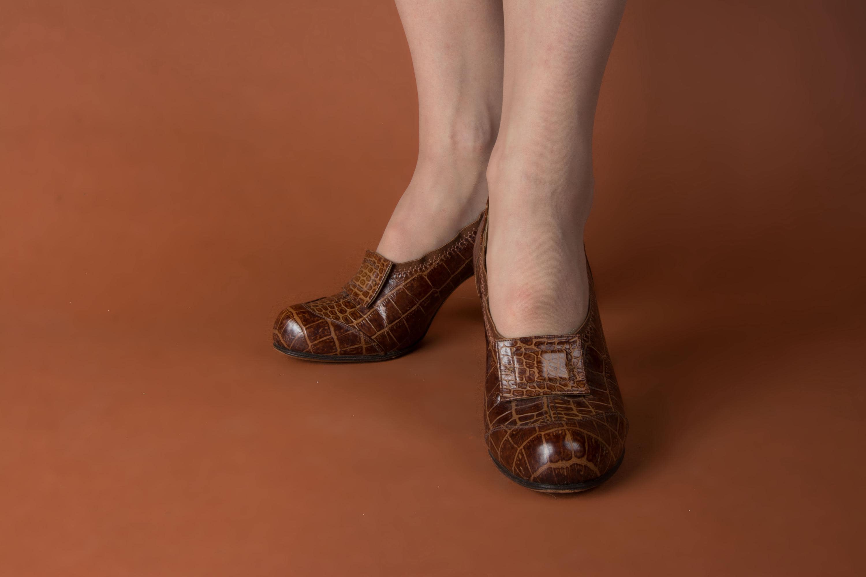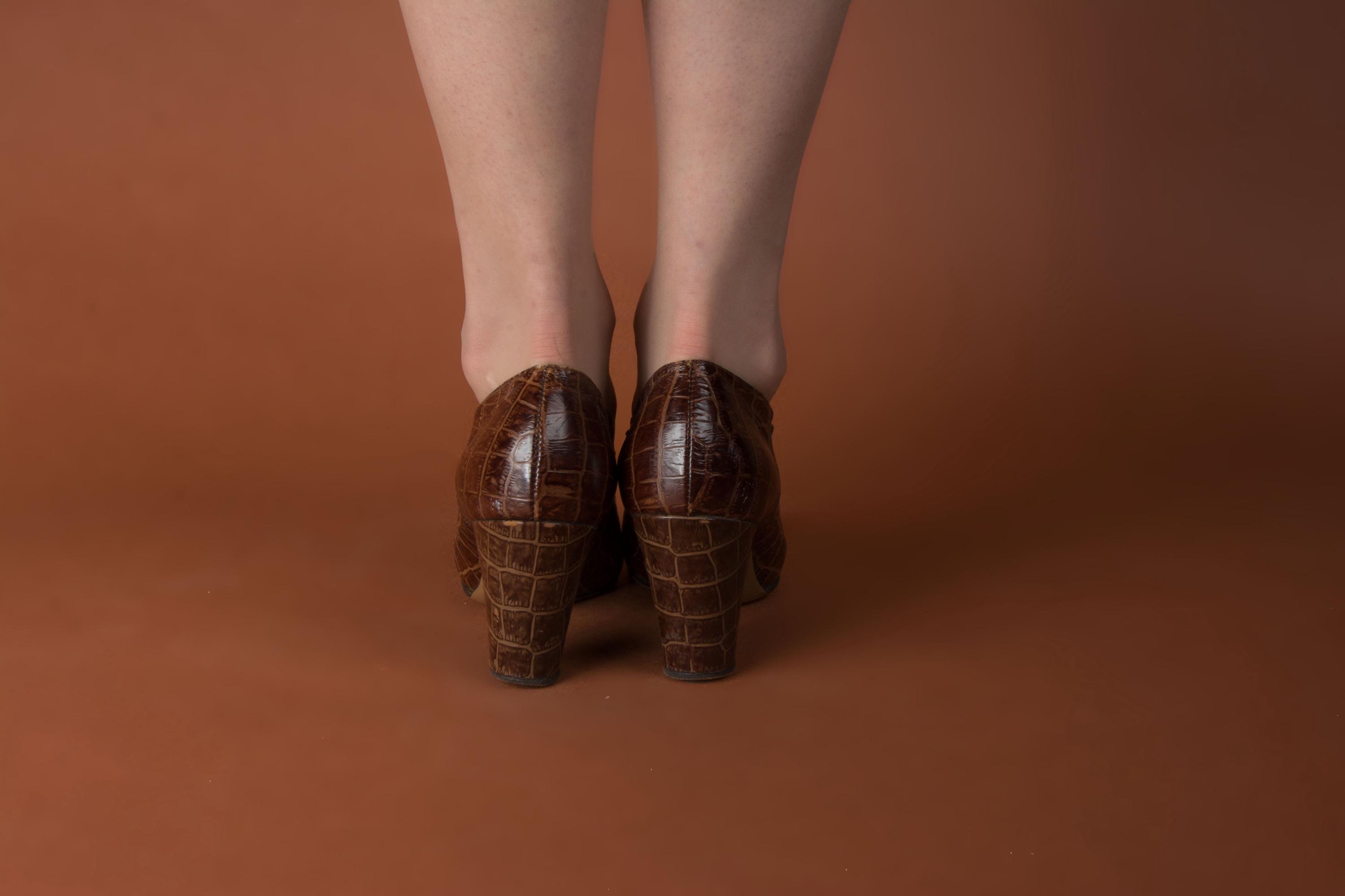 These gorgeous later 1930s heels have my favorite silhouette - a blocky but rounded toe, and a blocky heel on a steep angle. It's made of a pressed leather with a bitey lizard type pattern. It's beautifully pieces with smaller "scales" at the front of the toe, and larger at the back. The foot opening is edged with elastic to help hold it snugly on the foot.
