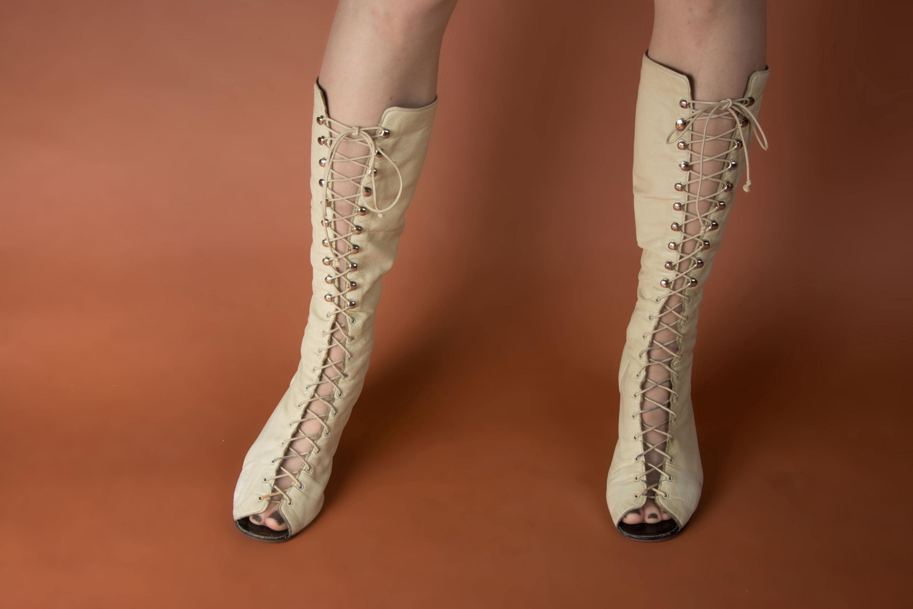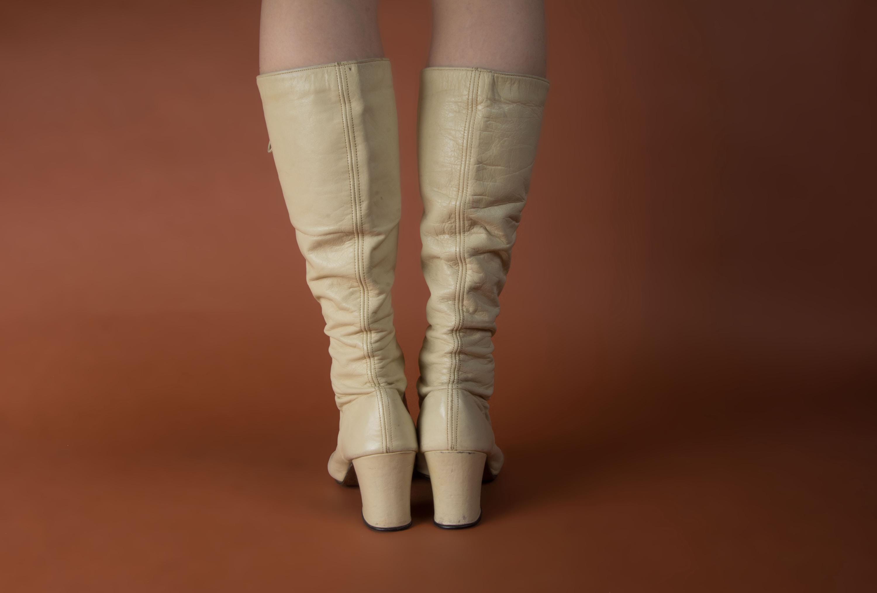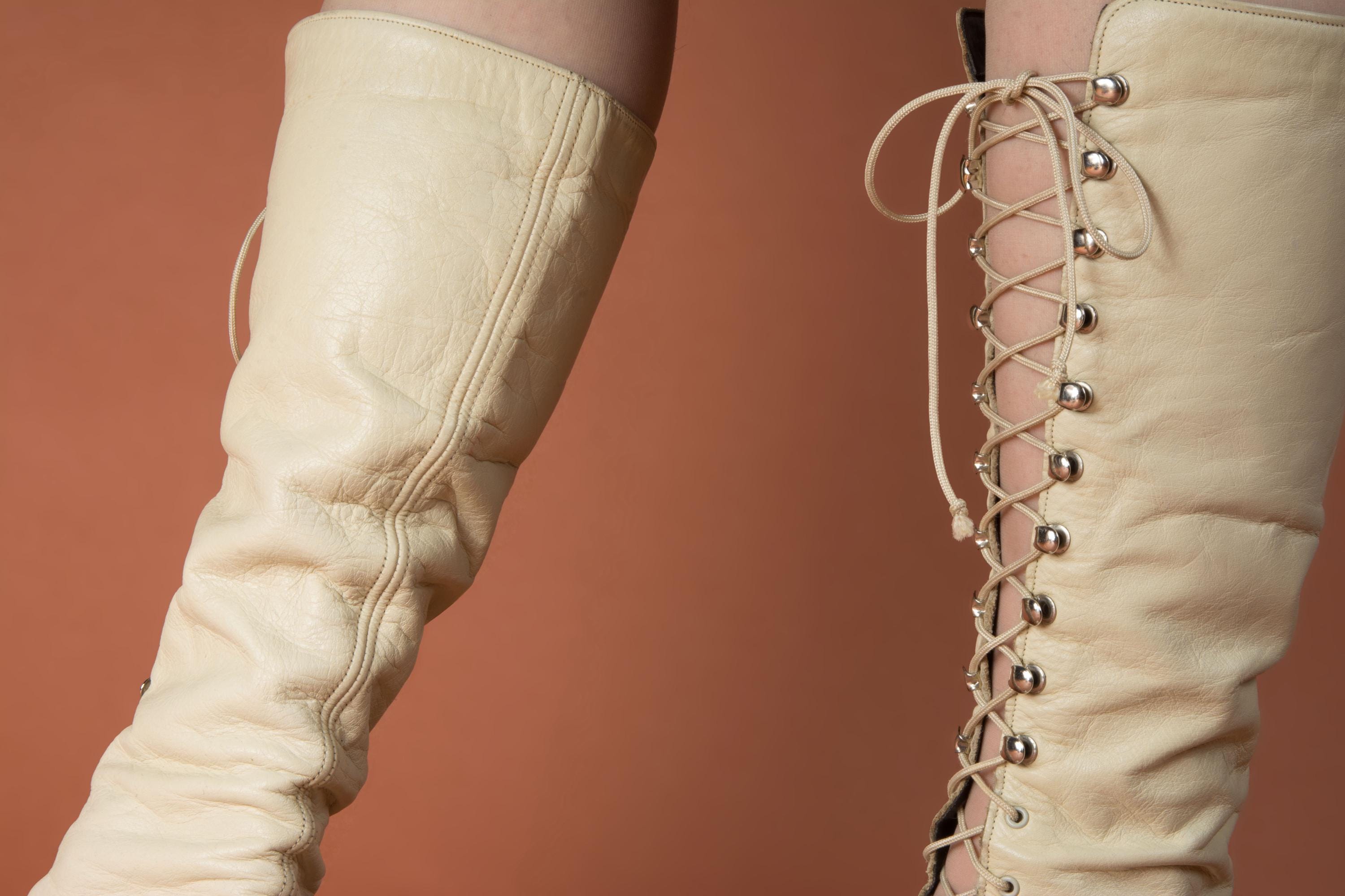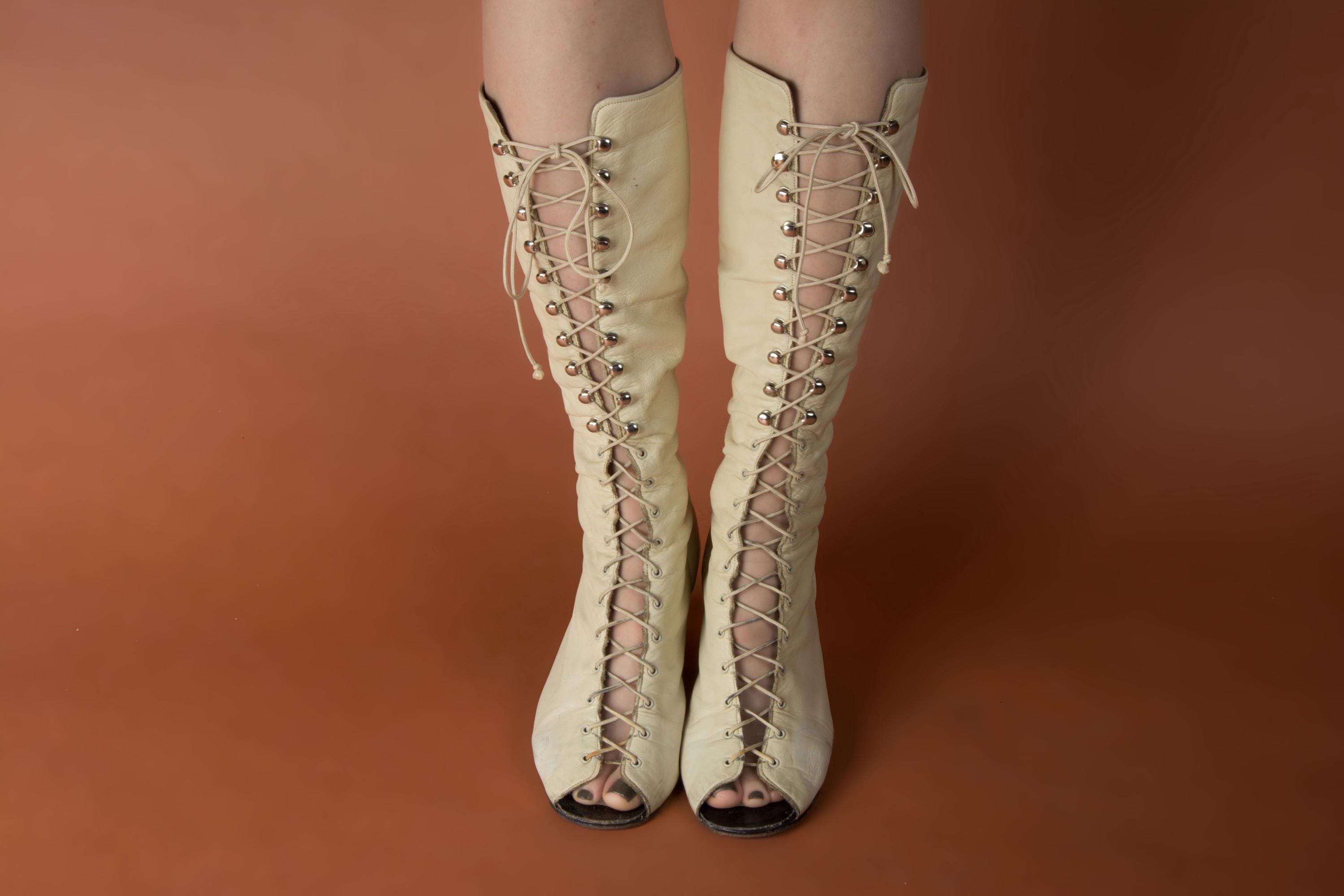 These vintage 1960s boots are pretty obviously too small on the model who is a size 6 with slim legs, but they're going to be amazing better filled out on you! These are meant to be open through the center front, a mix of gogo style and gladiator style. These are a bone colored leather, with man made insoles and soles.