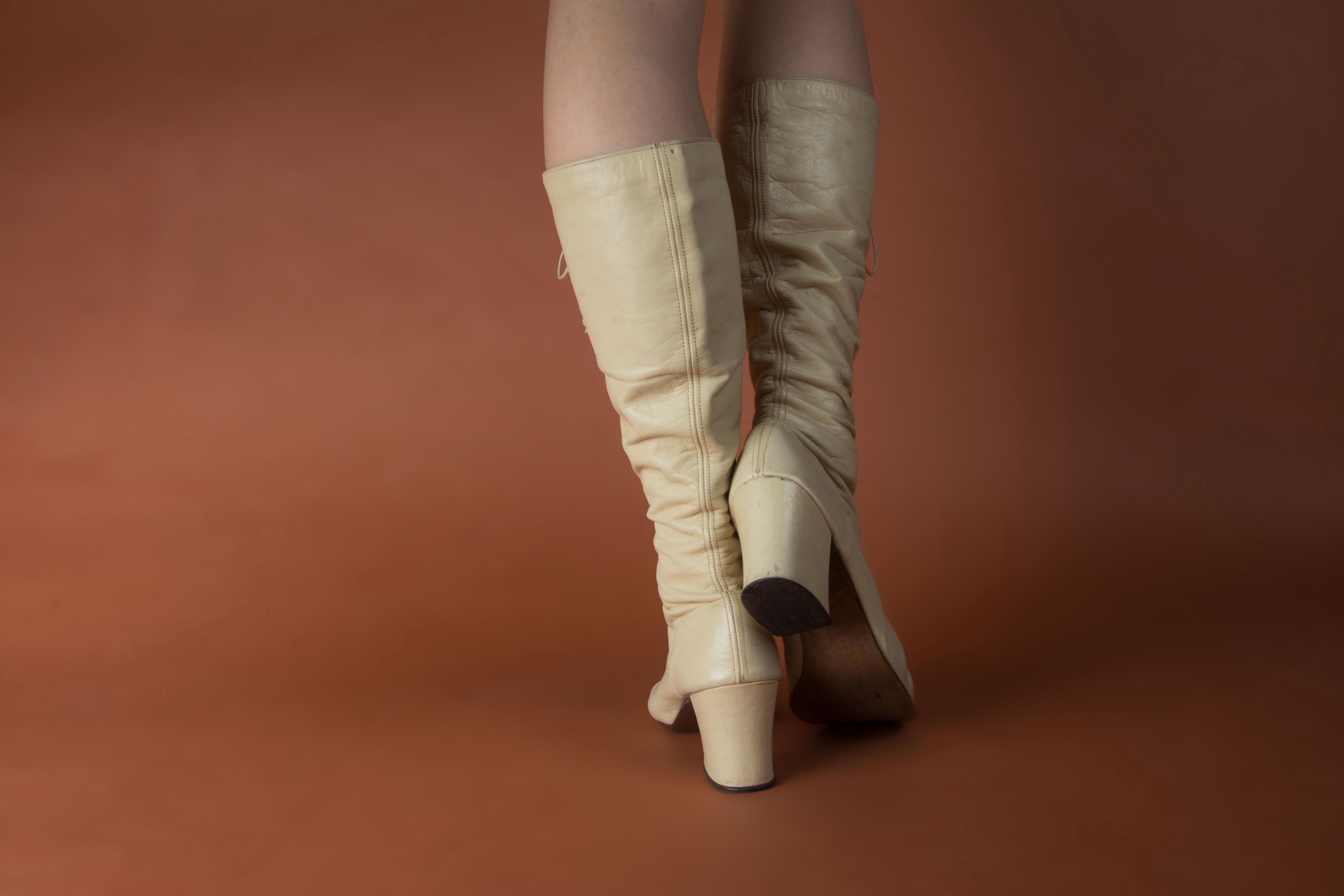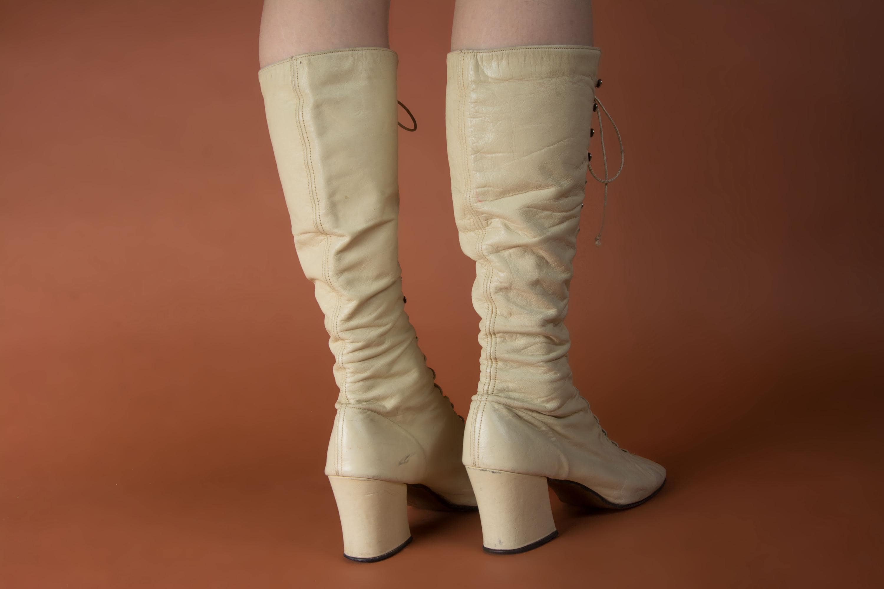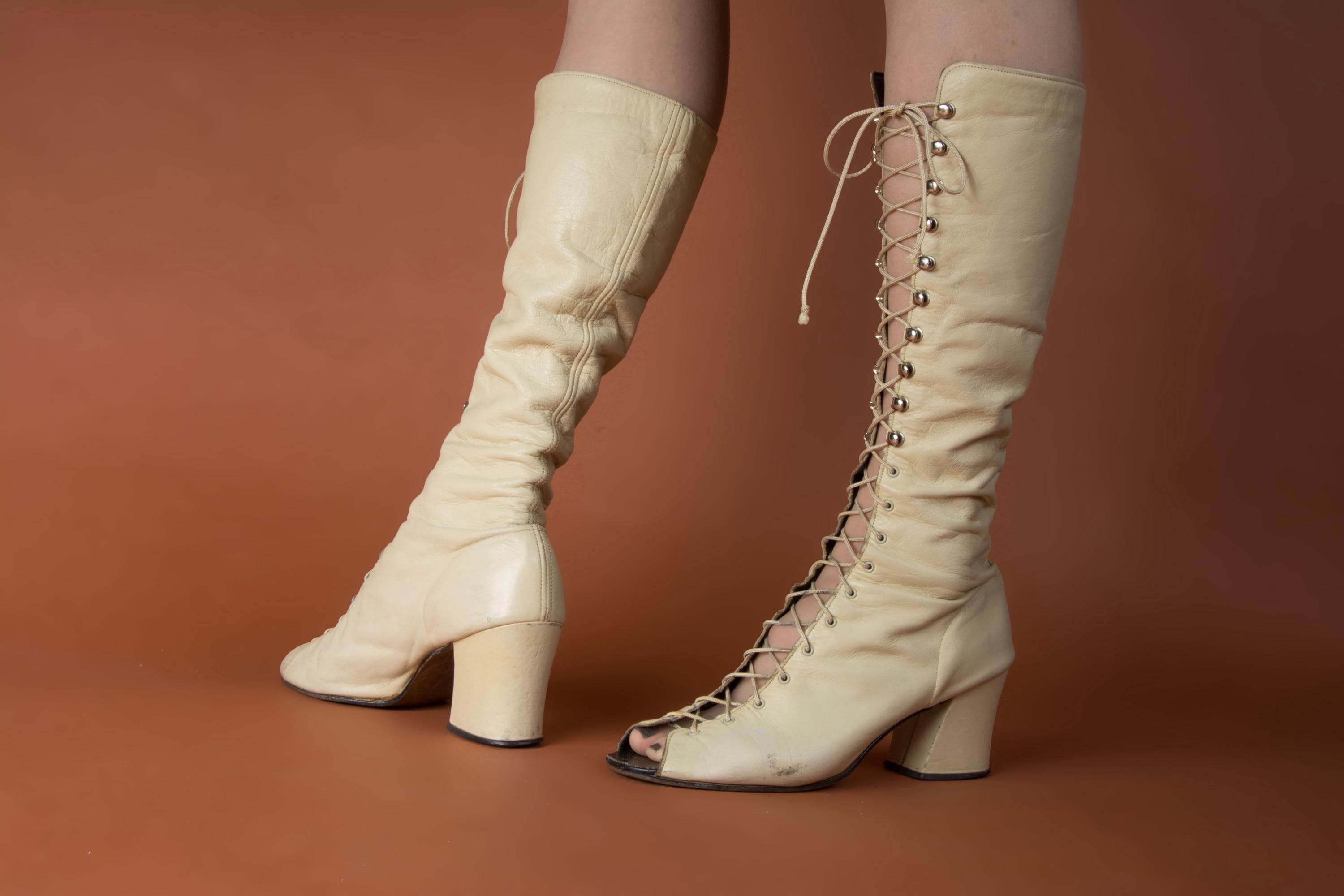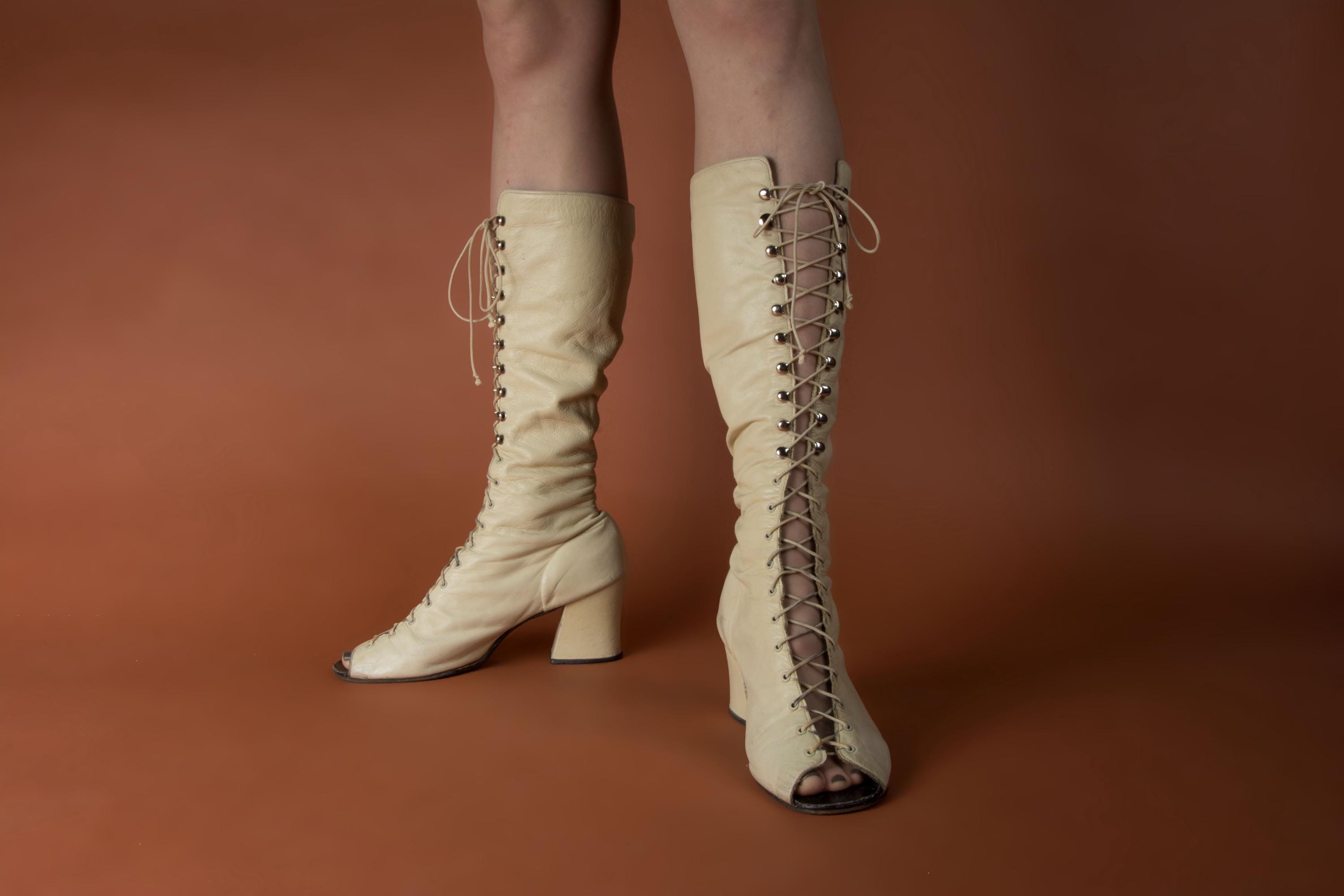 These vintage 1960s boots are pretty obviously too small on the model who is a size 6 with slim legs, but they're going to be amazing better filled out on you! These are meant to be open through the center front, a mix of gogo style and gladiator style. These are a bone colored leather, with man made insoles and soles.