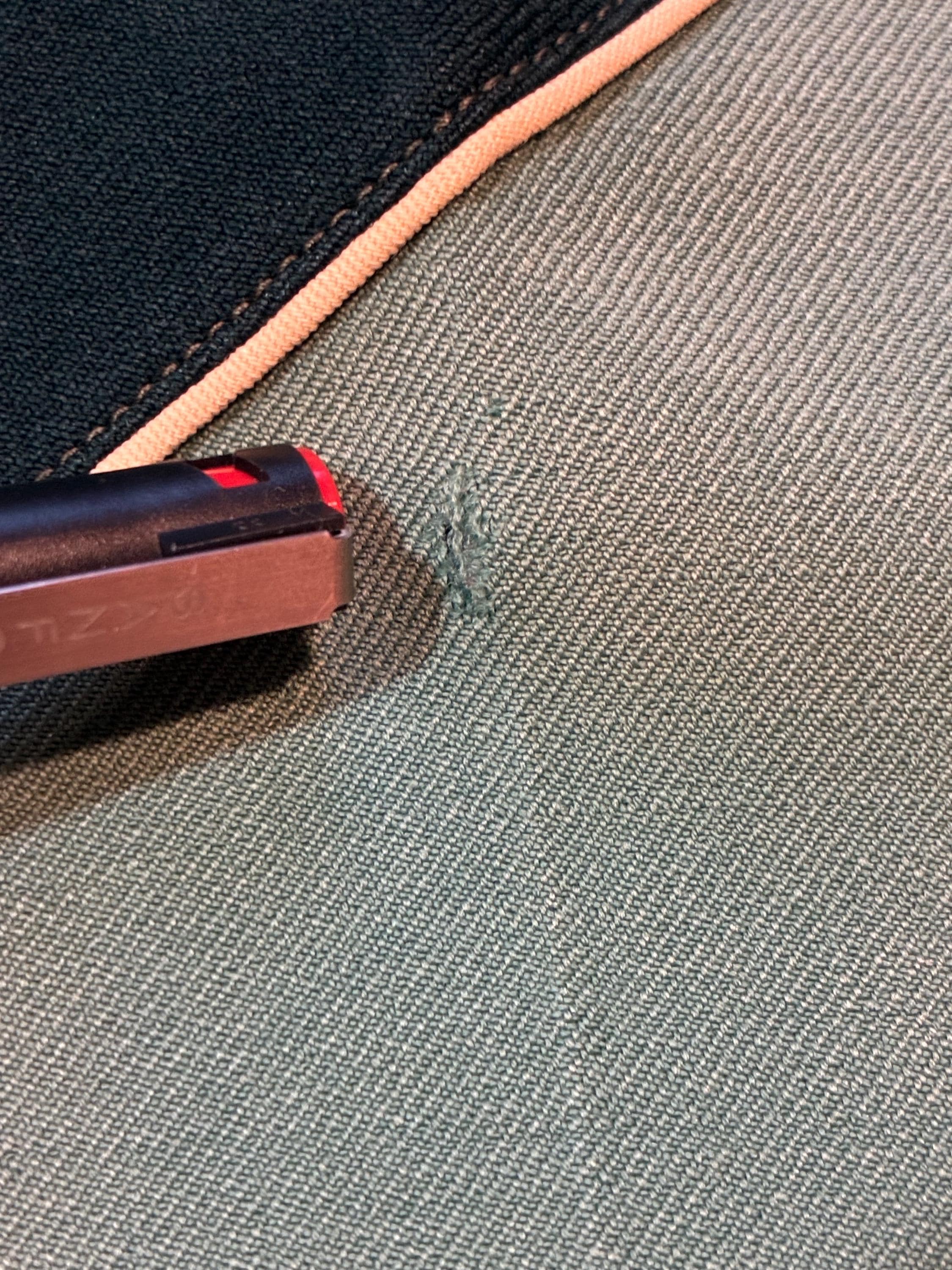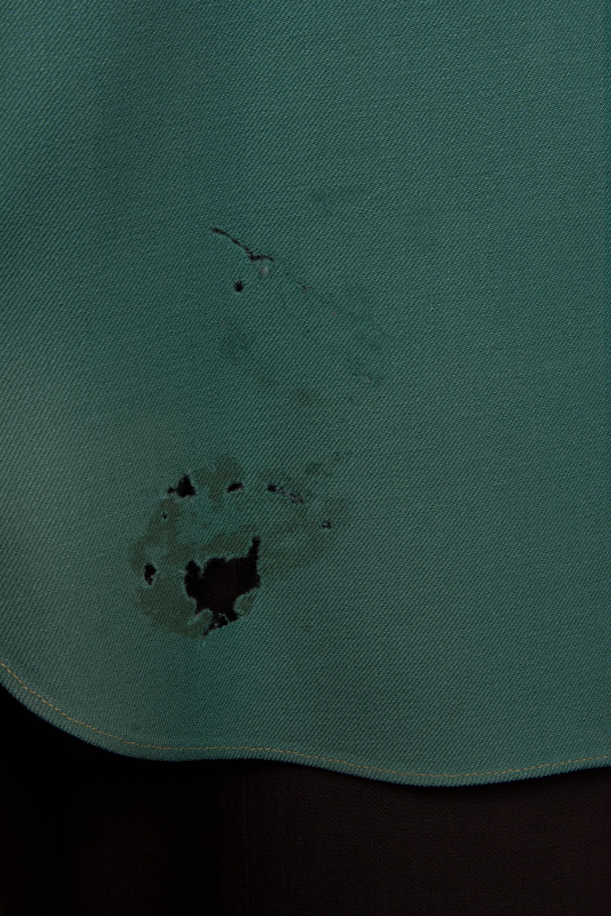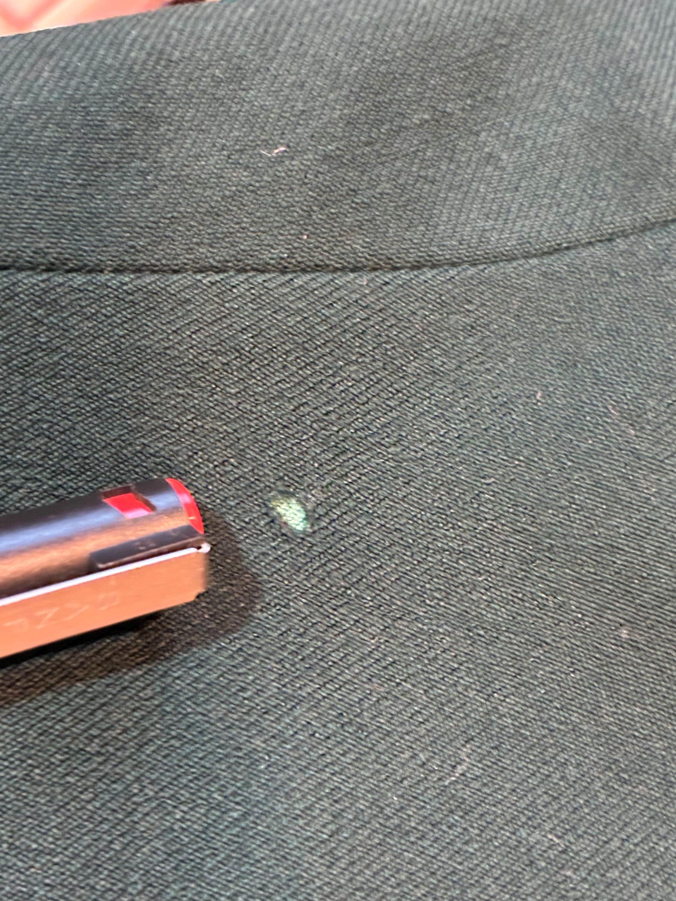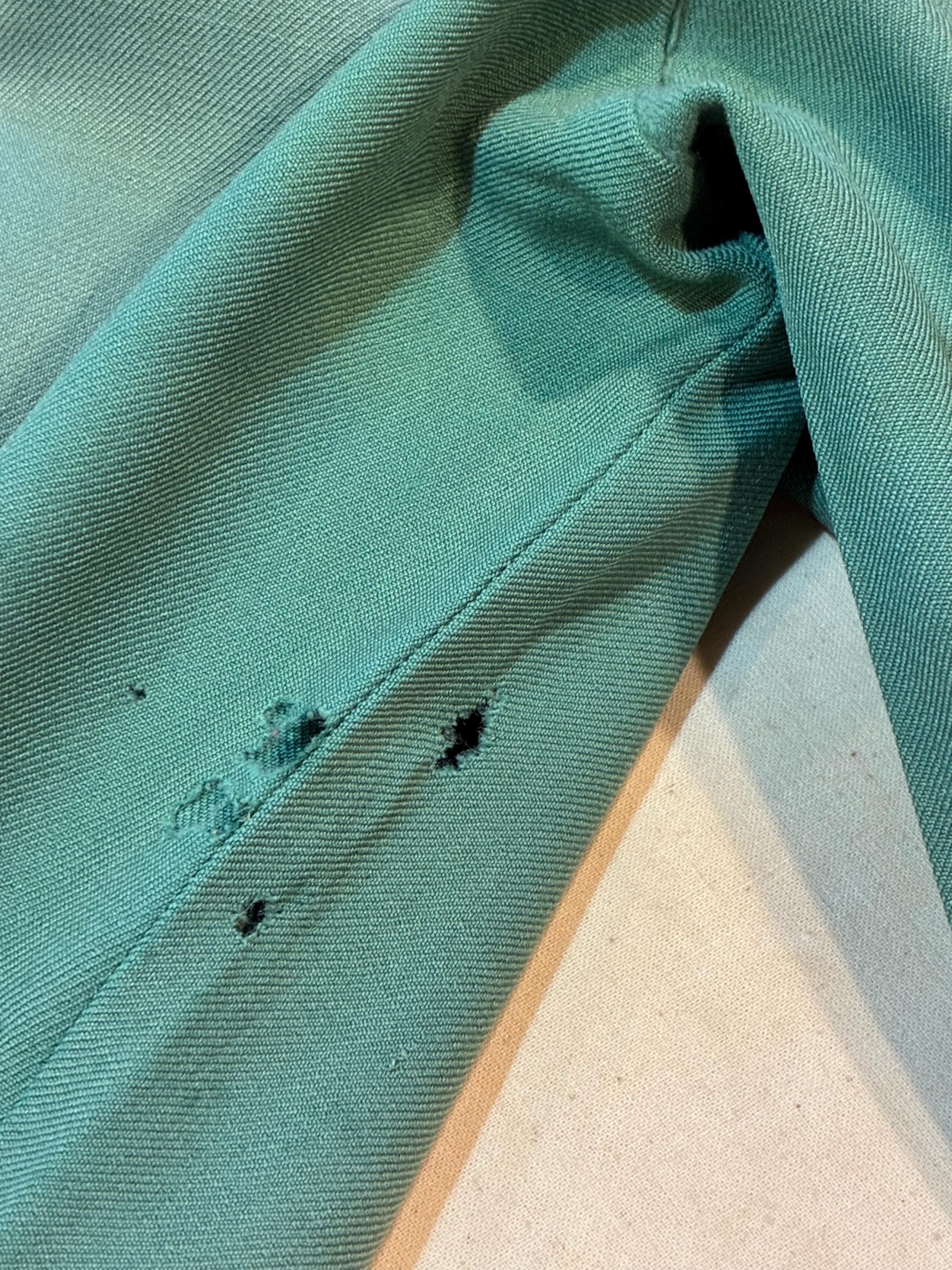 This shirt has been dry cleaned and is ready to wear. There's two areas of notable damage - staining and moth chews at the lower right front shirt tail, not seen when worn tucked as intended. The other is a series of four larger moth holes at underside of the right sleeve. I didn't patch them, but you could use the material from the shirtwaist gussets to fix it up. The front right yoke has a single moth chew in the forest green, and there is a 1/2" cut that is slightly frayed at the front left above the pocket. The upper is slightly faded compared to the shirt tails