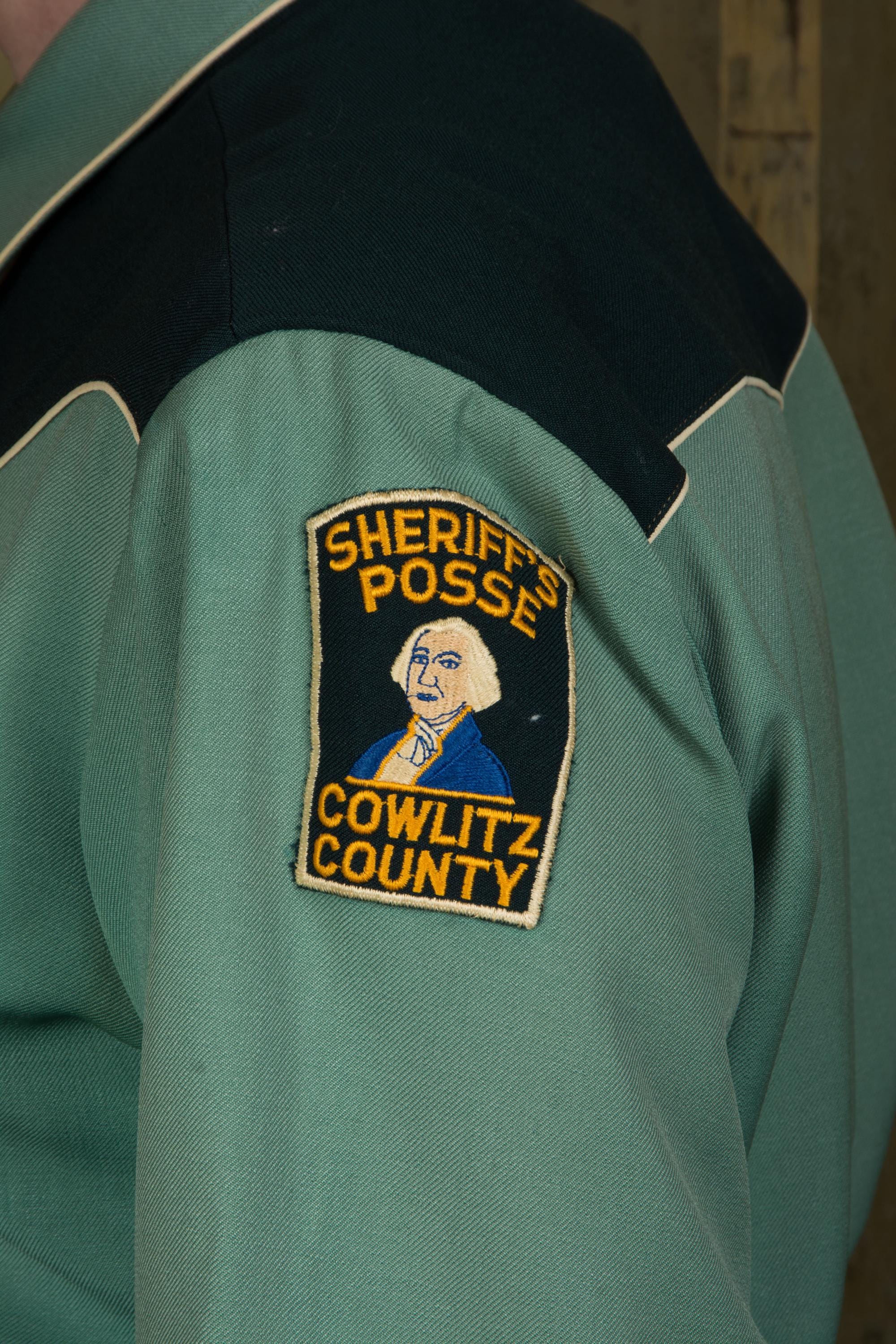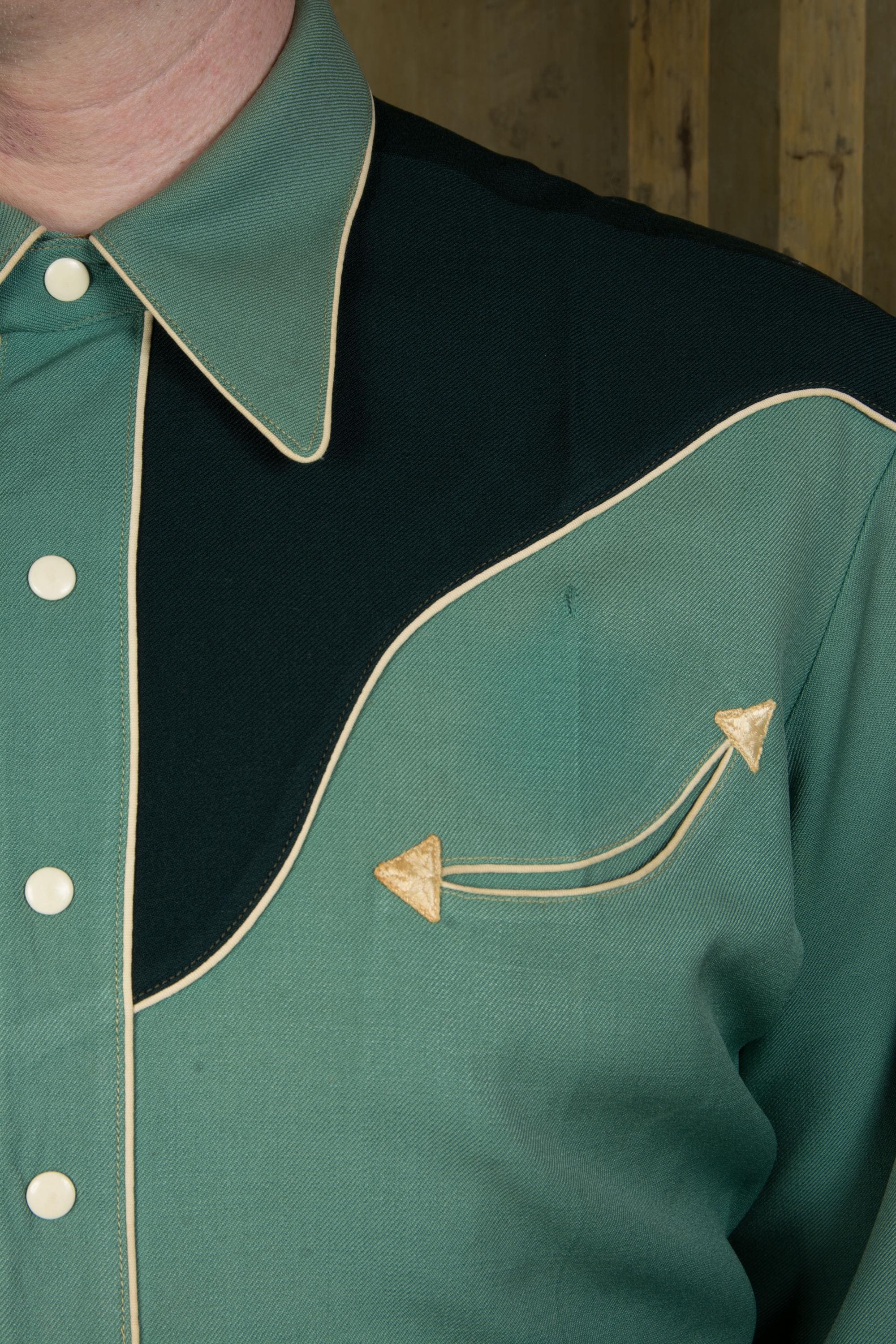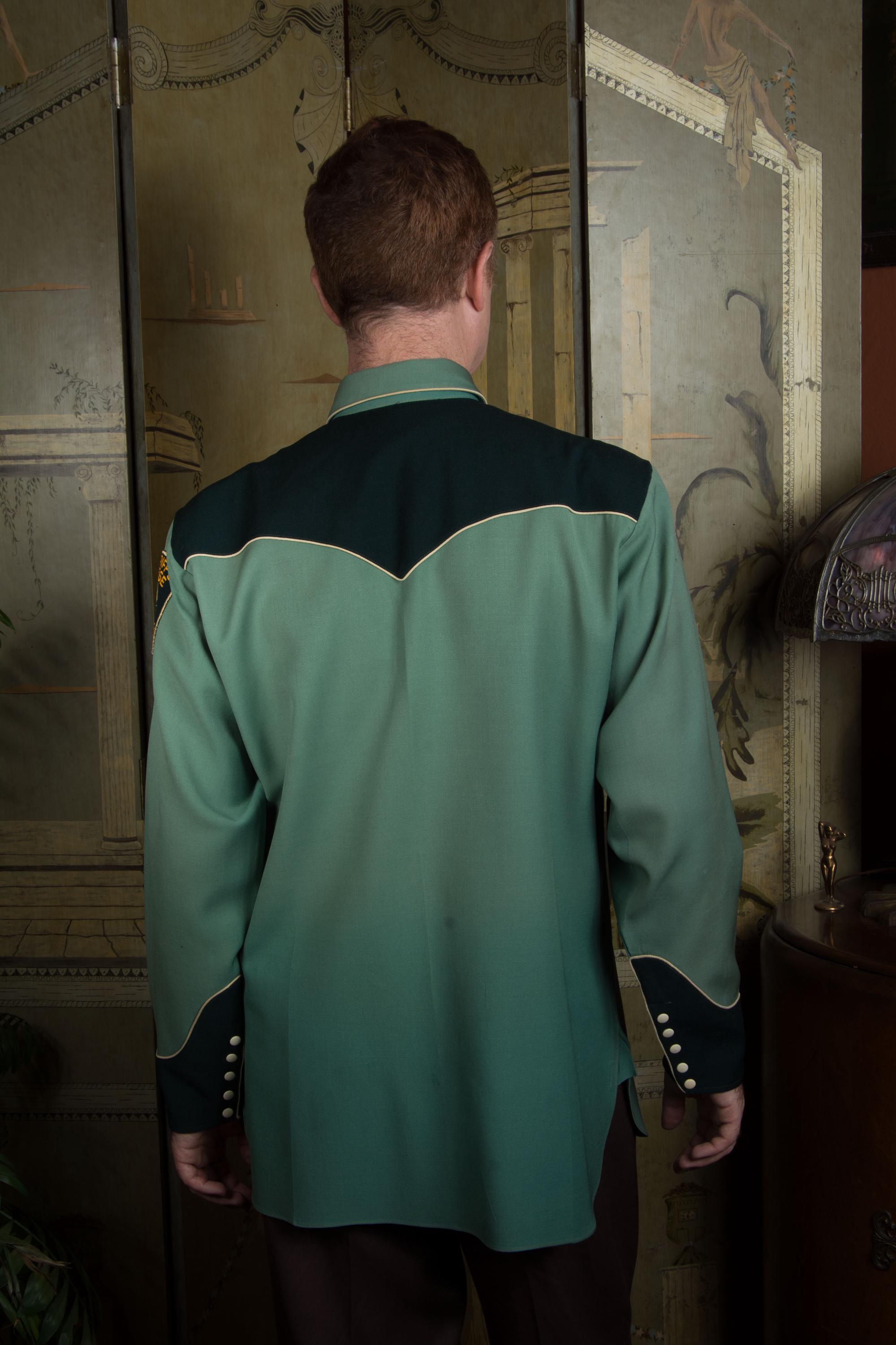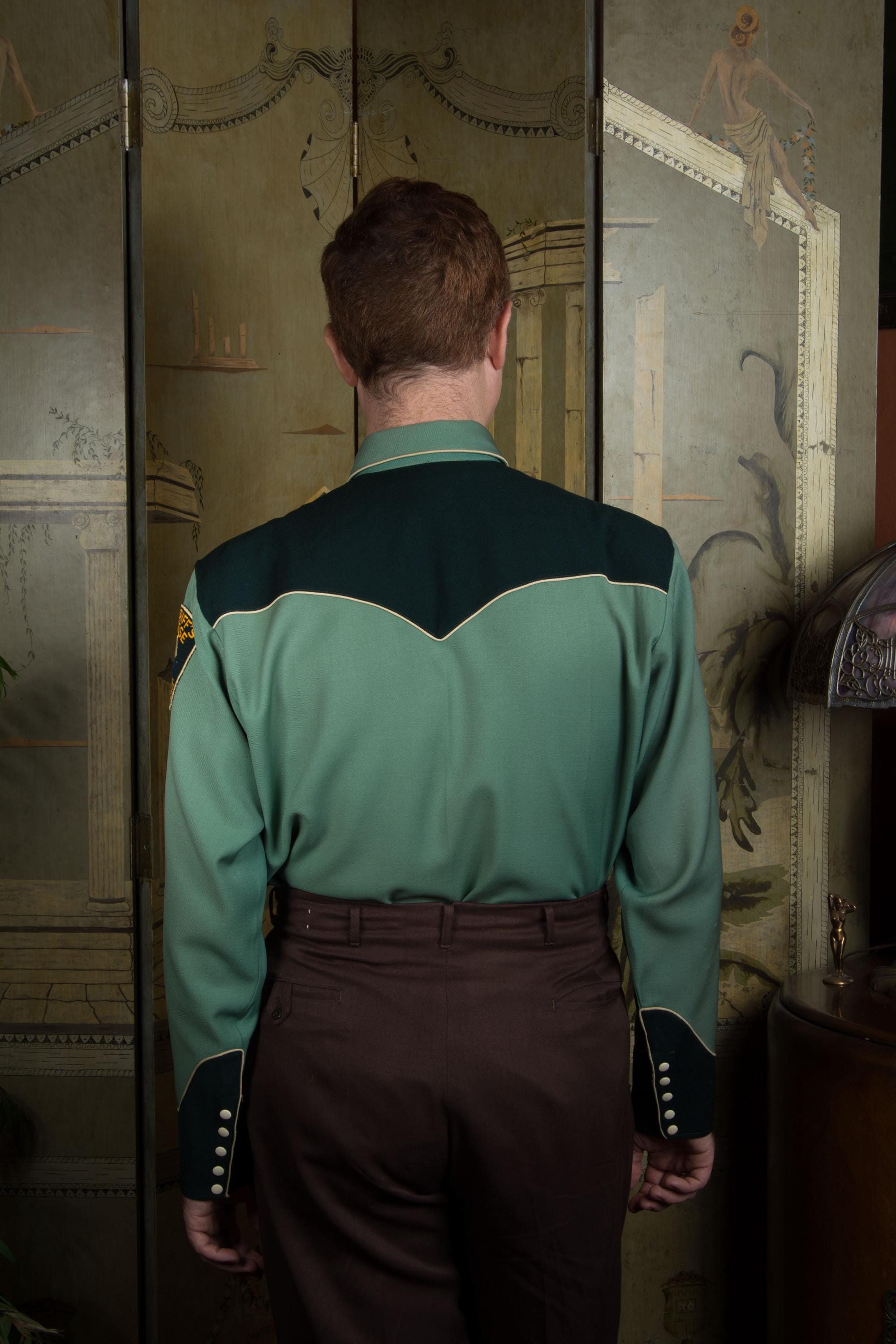 A very sturdy 1950s western shirt originally made as a uniform. This bears a patch for the Cowlitz Country "Sheriff's Posse" which definitely sounds like something out of a western film. The worsted wool is in great colors - jade and forest green. Each sleeve has five working snap buttons, and it closes with eight more down the front. The arrow pockets are edged with white piping. A super sturdy shirt in the classic style.