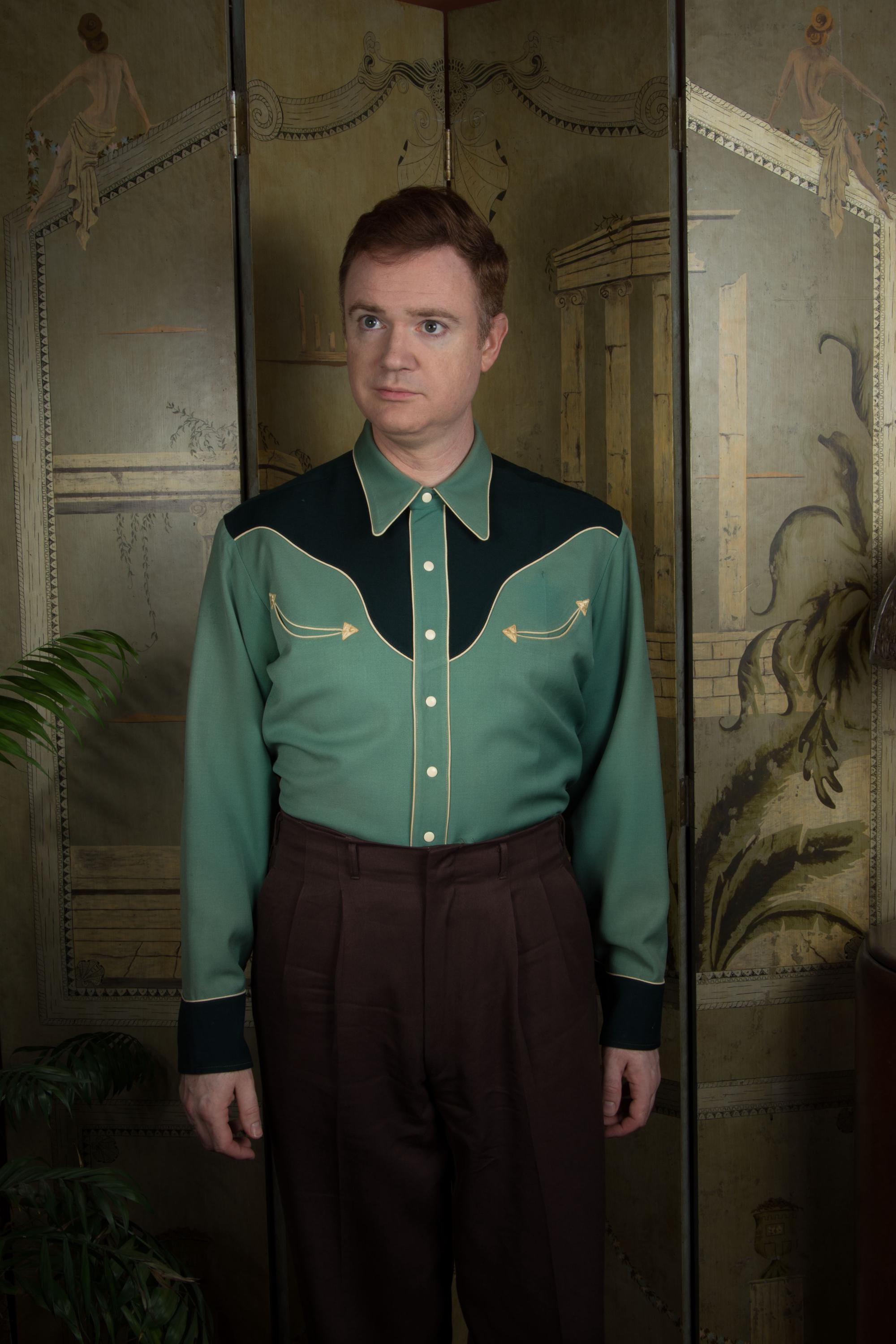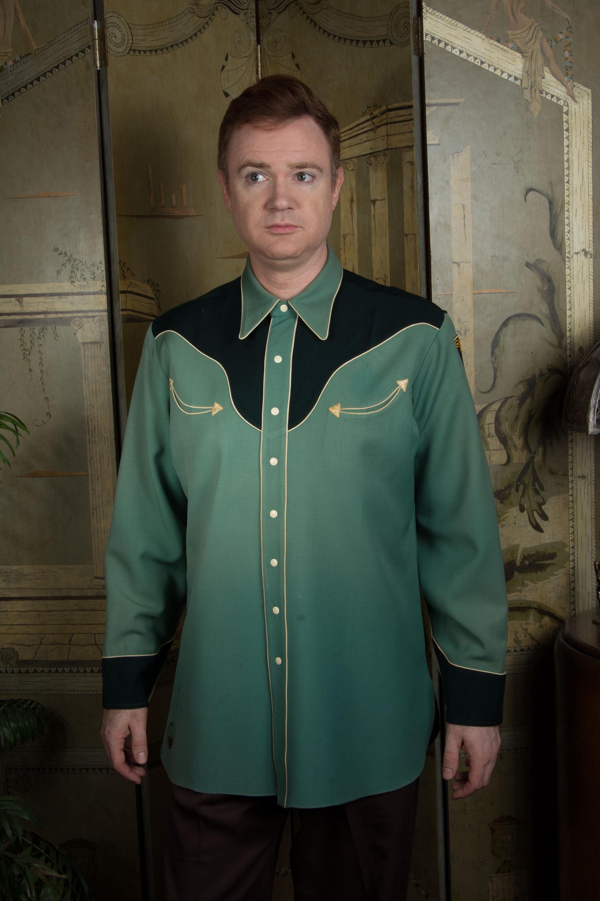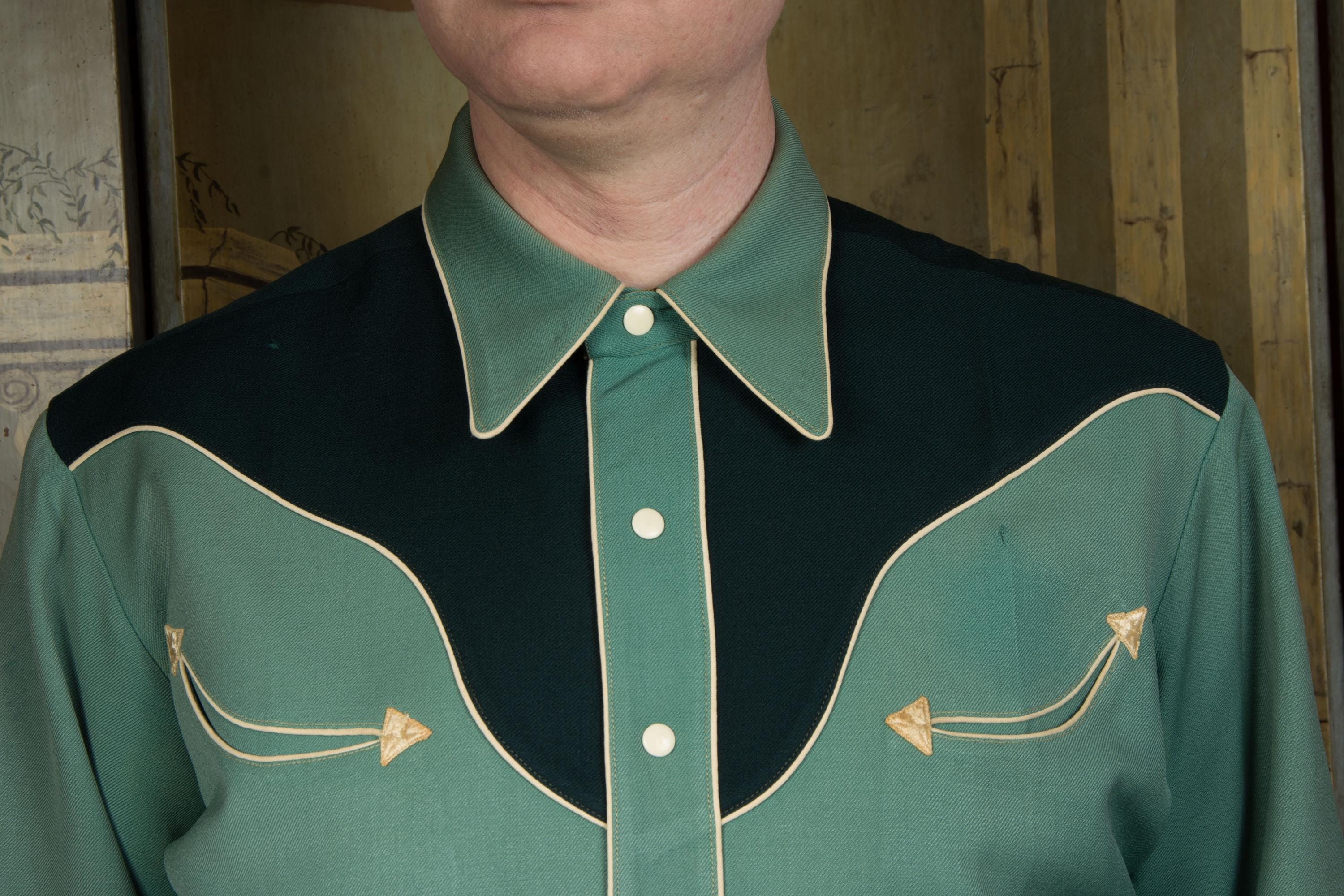 A very sturdy 1950s western shirt originally made as a uniform. This bears a patch for the Cowlitz Country "Sheriff's Posse" which definitely sounds like something out of a western film. The worsted wool is in great colors - jade and forest green. Each sleeve has five working snap buttons, and it closes with eight more down the front. The arrow pockets are edged with white piping. A super sturdy shirt in the classic style.