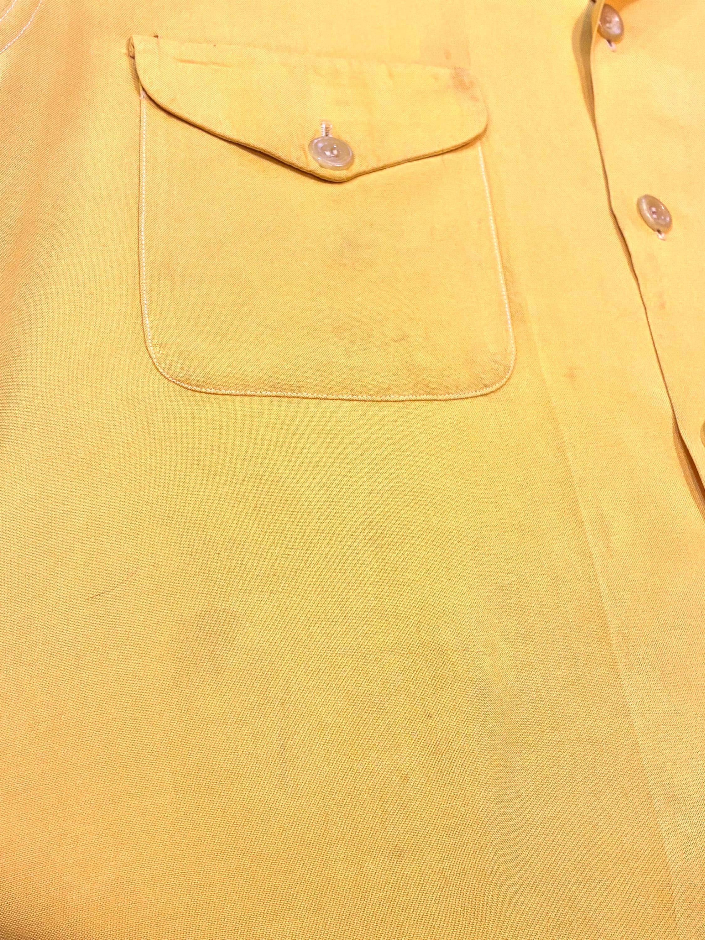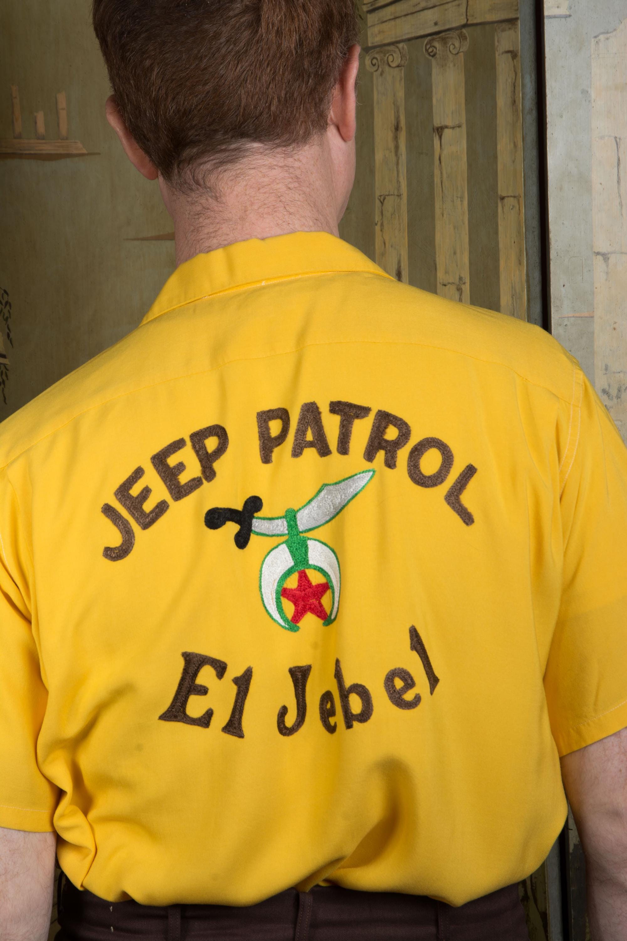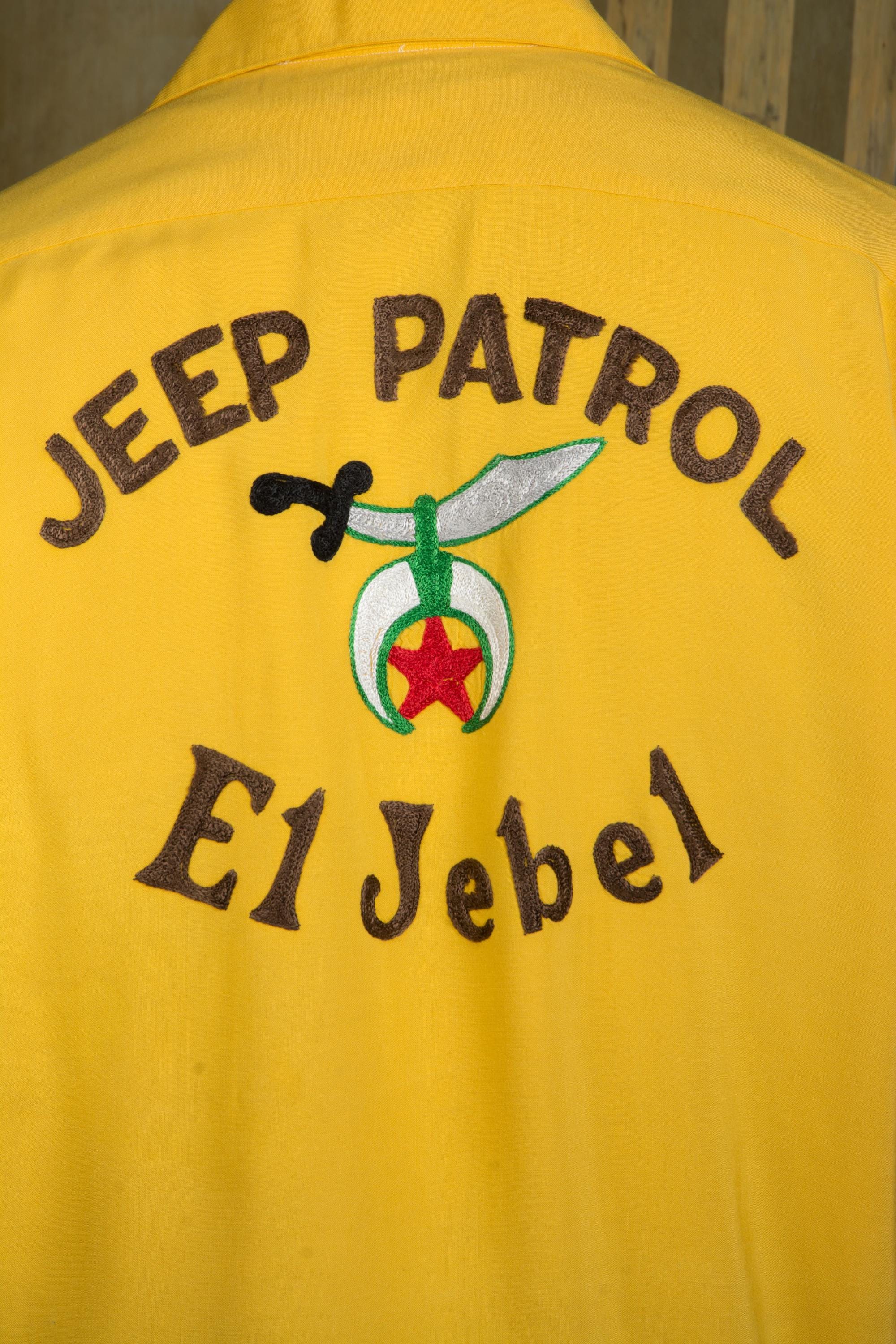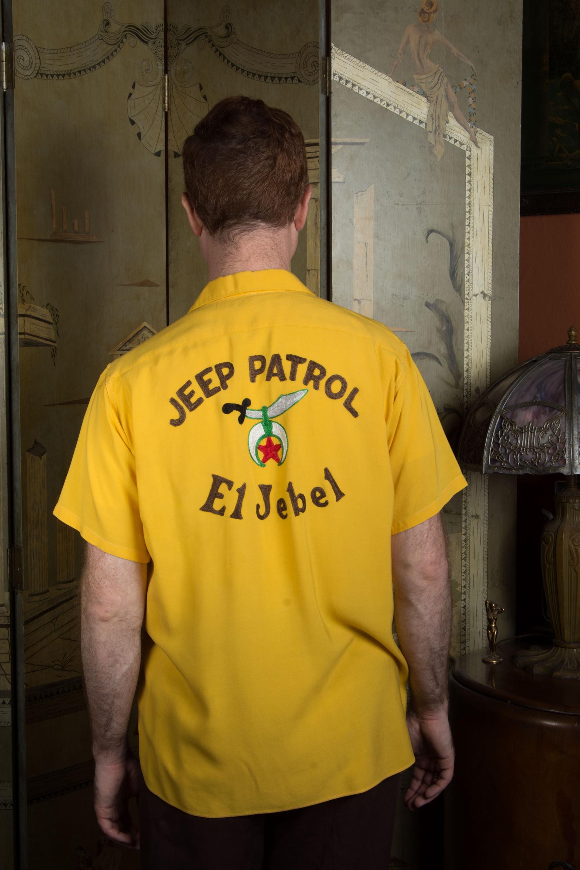 Killer vintage bowling's shirt from the Shriner's organization El Jebel, specifically the Jeep Patrol, which rode the vehicles for parades. This bold yellow shirt is the classic bowling shirt with loop collar and dual pockets. It's a rich marigold yellow in soft rayon. This has exceptional, colorful chain stitch embroidery. A really great 1950s casual shirt.
