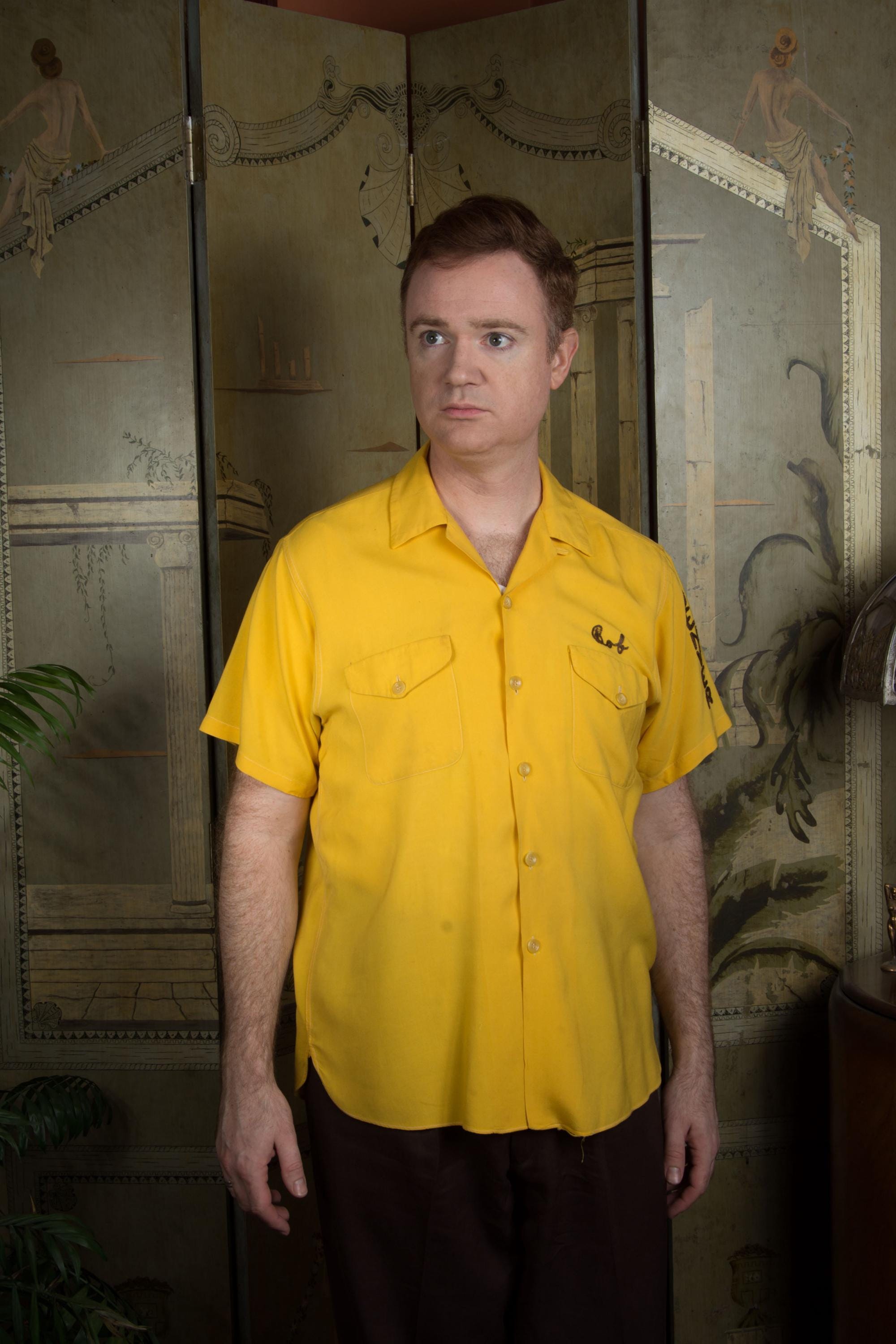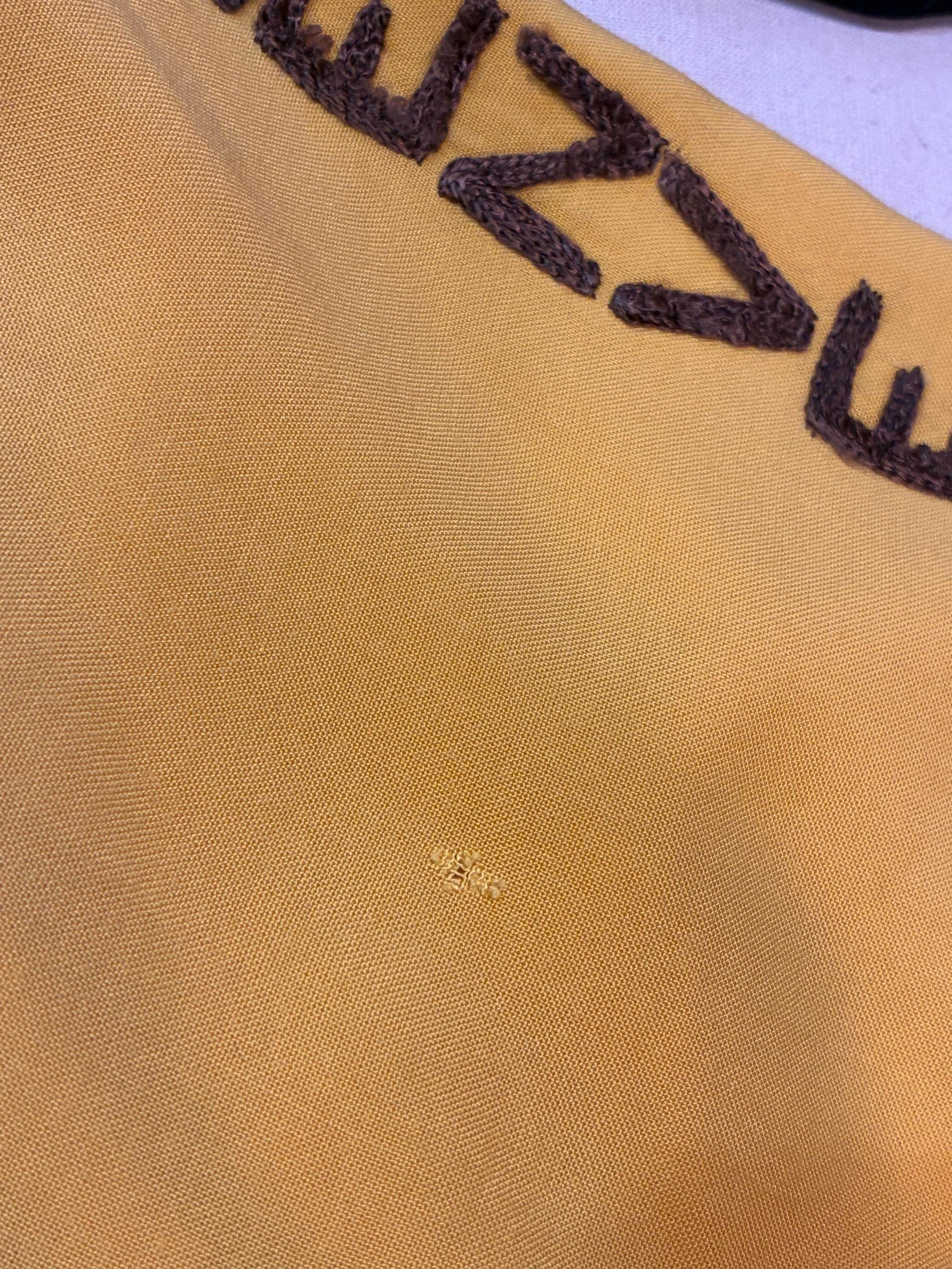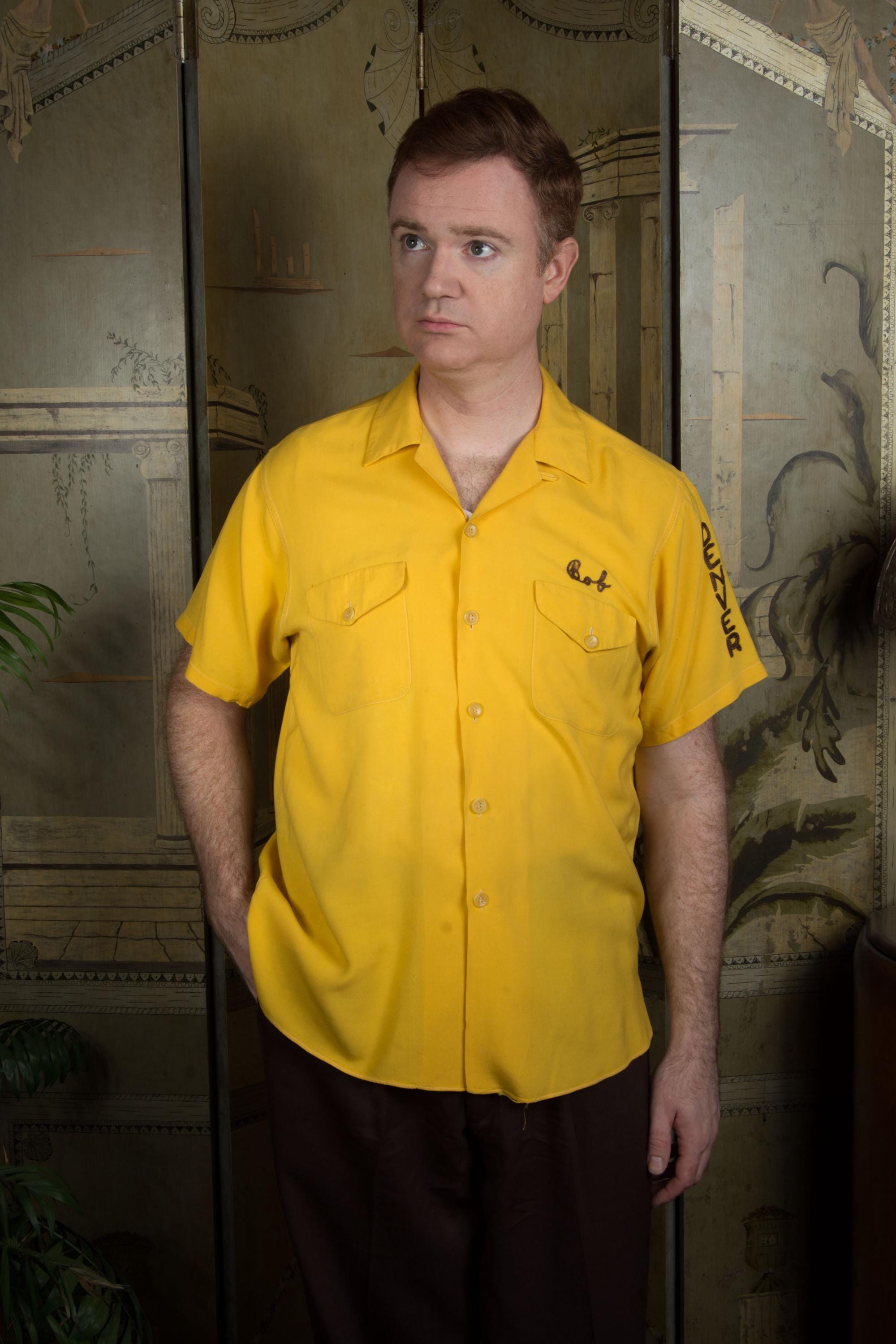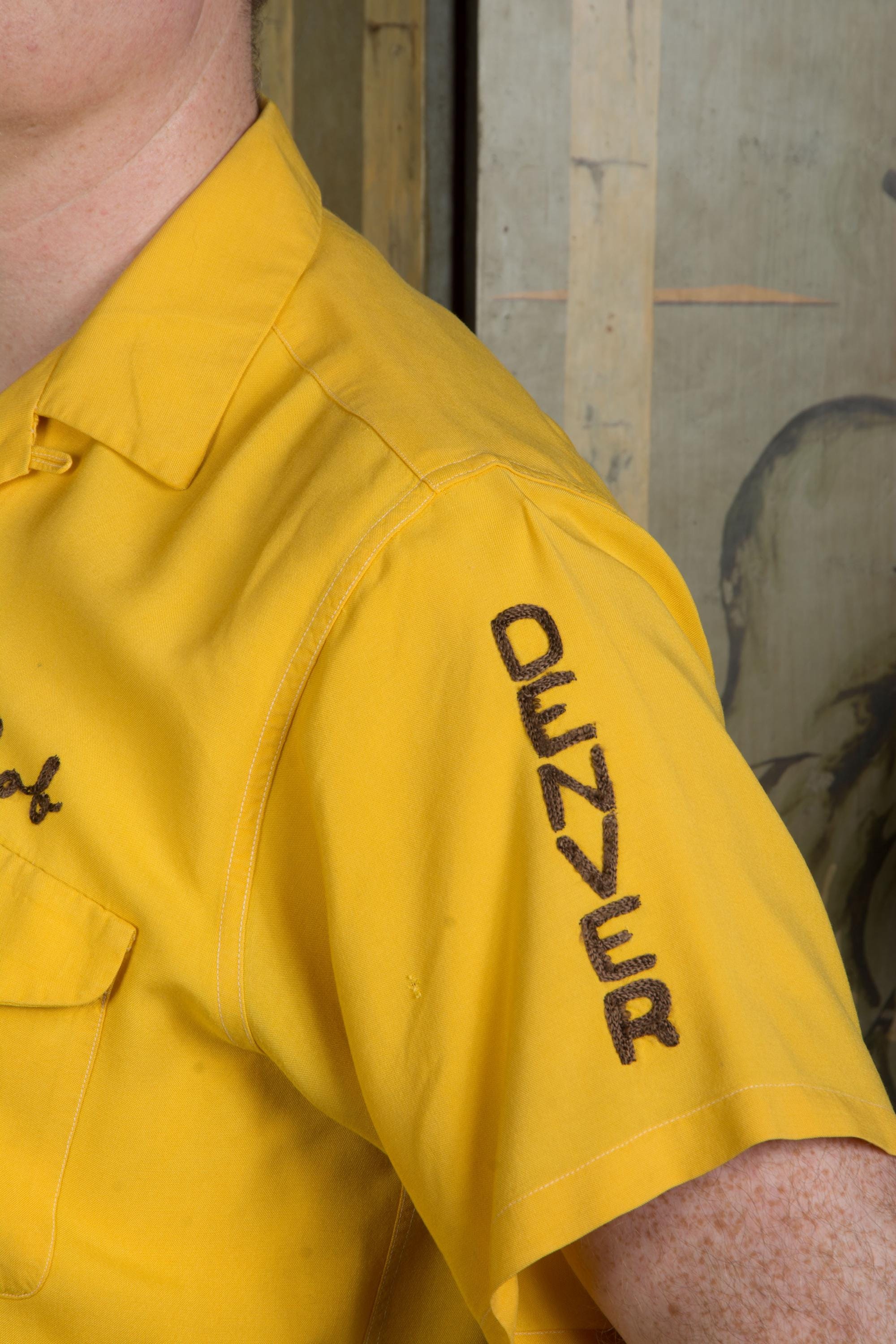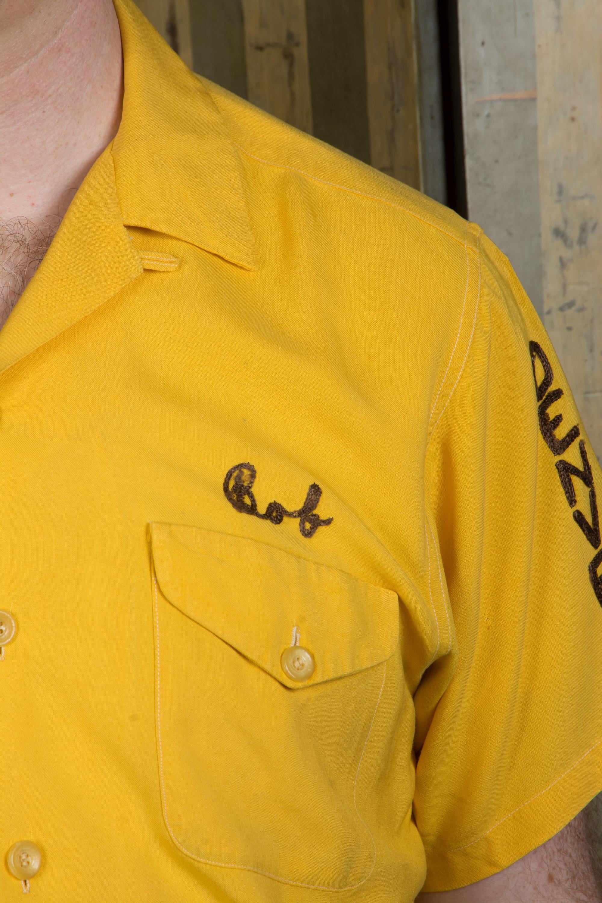 Killer vintage bowling's shirt from the Shriner's organization El Jebel, specifically the Jeep Patrol, which rode the vehicles for parades. This bold yellow shirt is the classic bowling shirt with loop collar and dual pockets. It's a rich marigold yellow in soft rayon. This has exceptional, colorful chain stitch embroidery. A really great 1950s casual shirt.