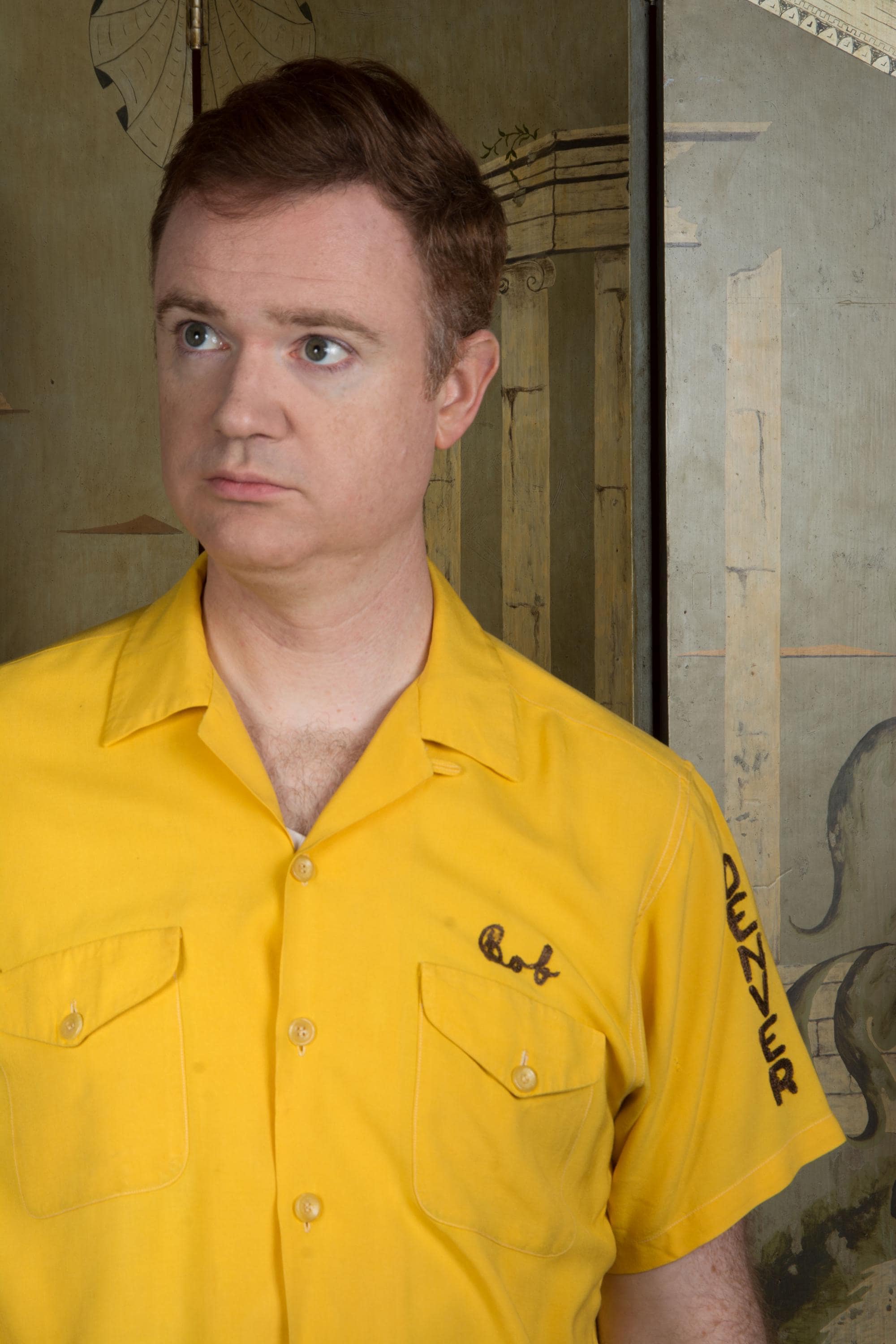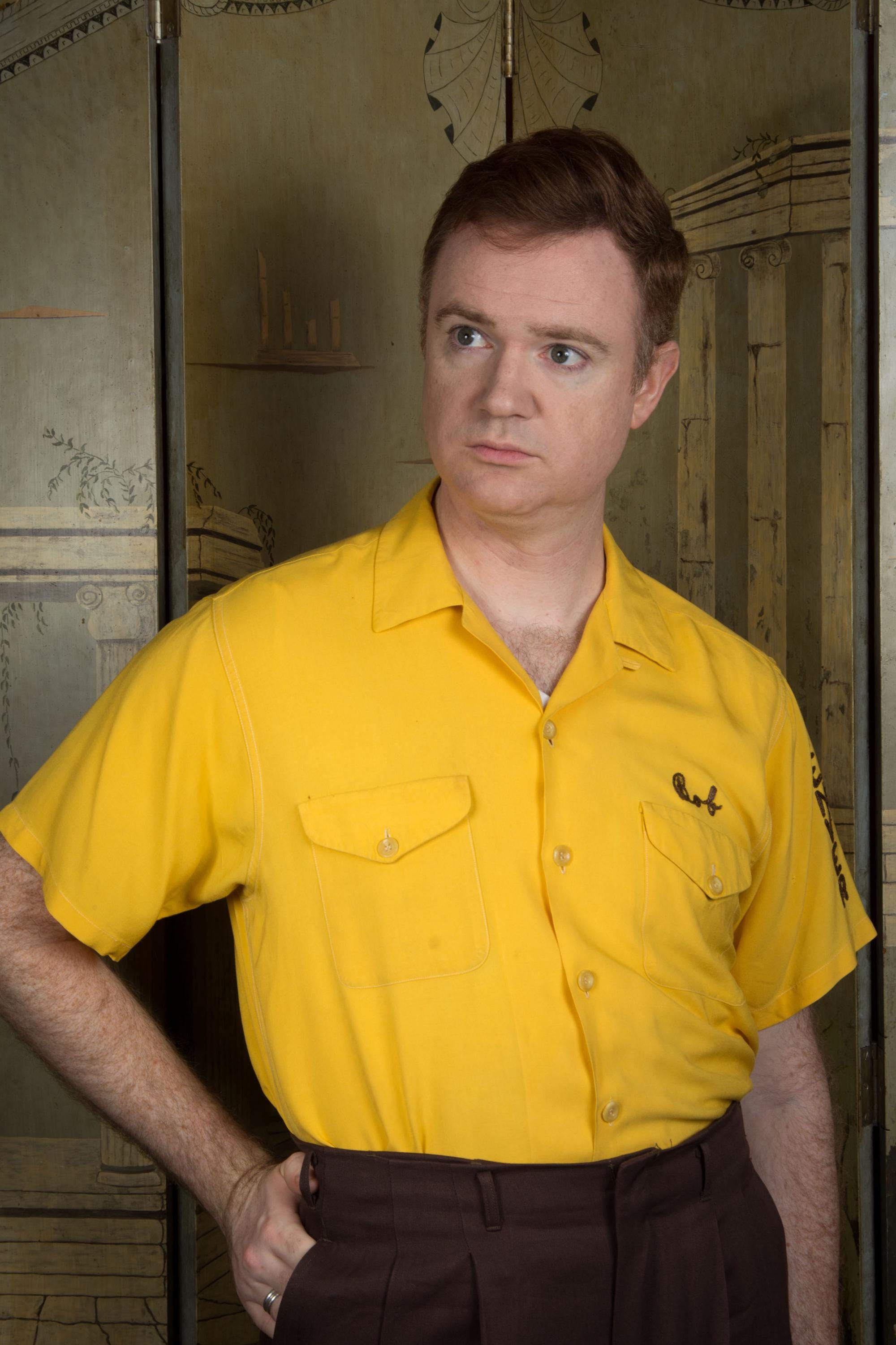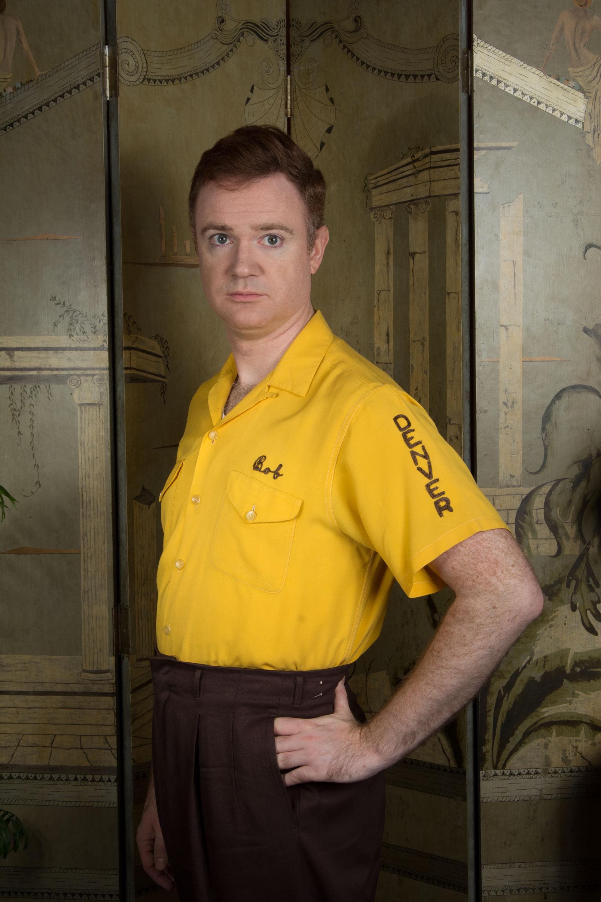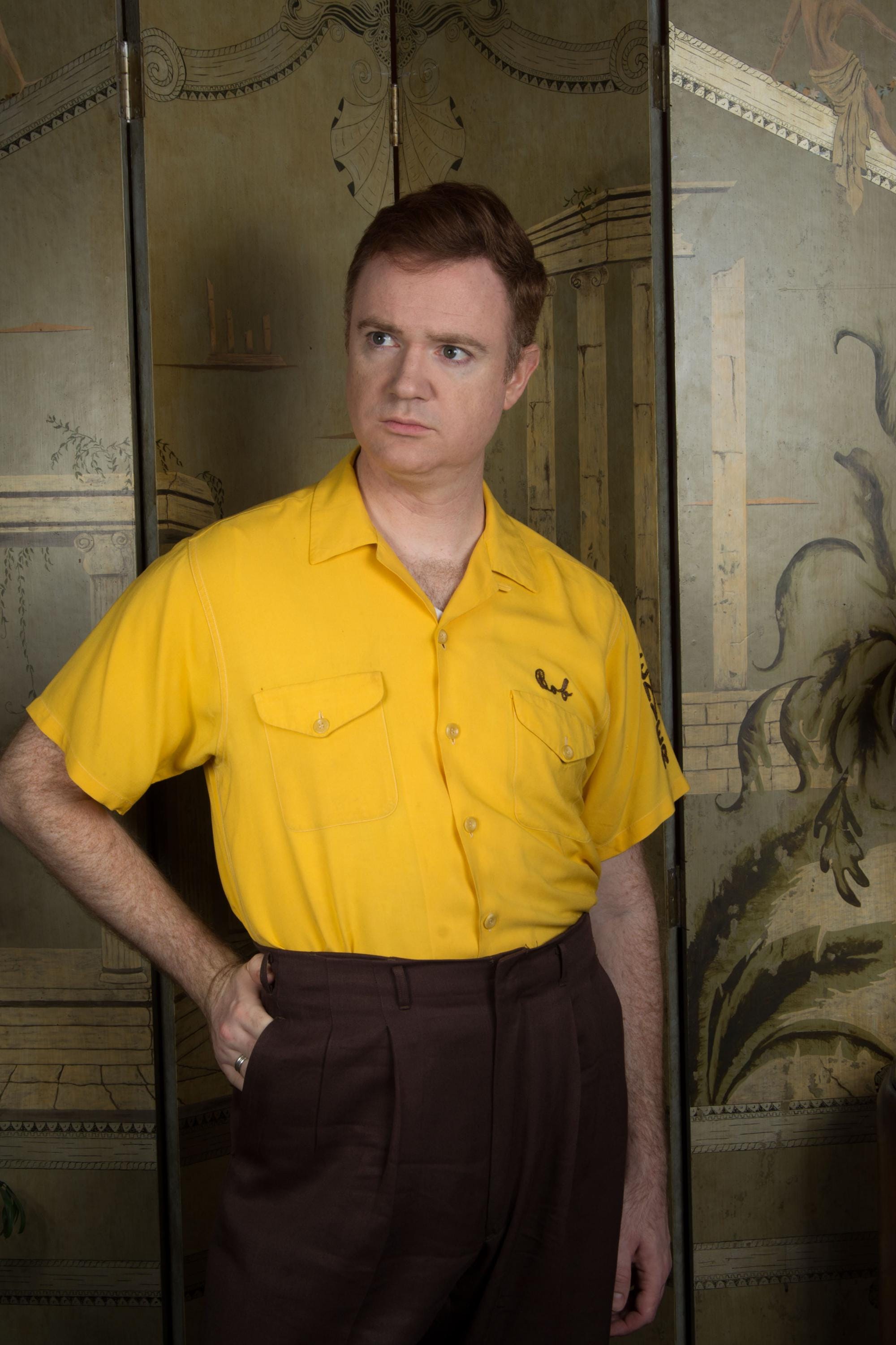 Killer vintage bowling's shirt from the Shriner's organization El Jebel, specifically the Jeep Patrol, which rode the vehicles for parades. This bold yellow shirt is the classic bowling shirt with loop collar and dual pockets. It's a rich marigold yellow in soft rayon. This has exceptional, colorful chain stitch embroidery. A really great 1950s casual shirt.