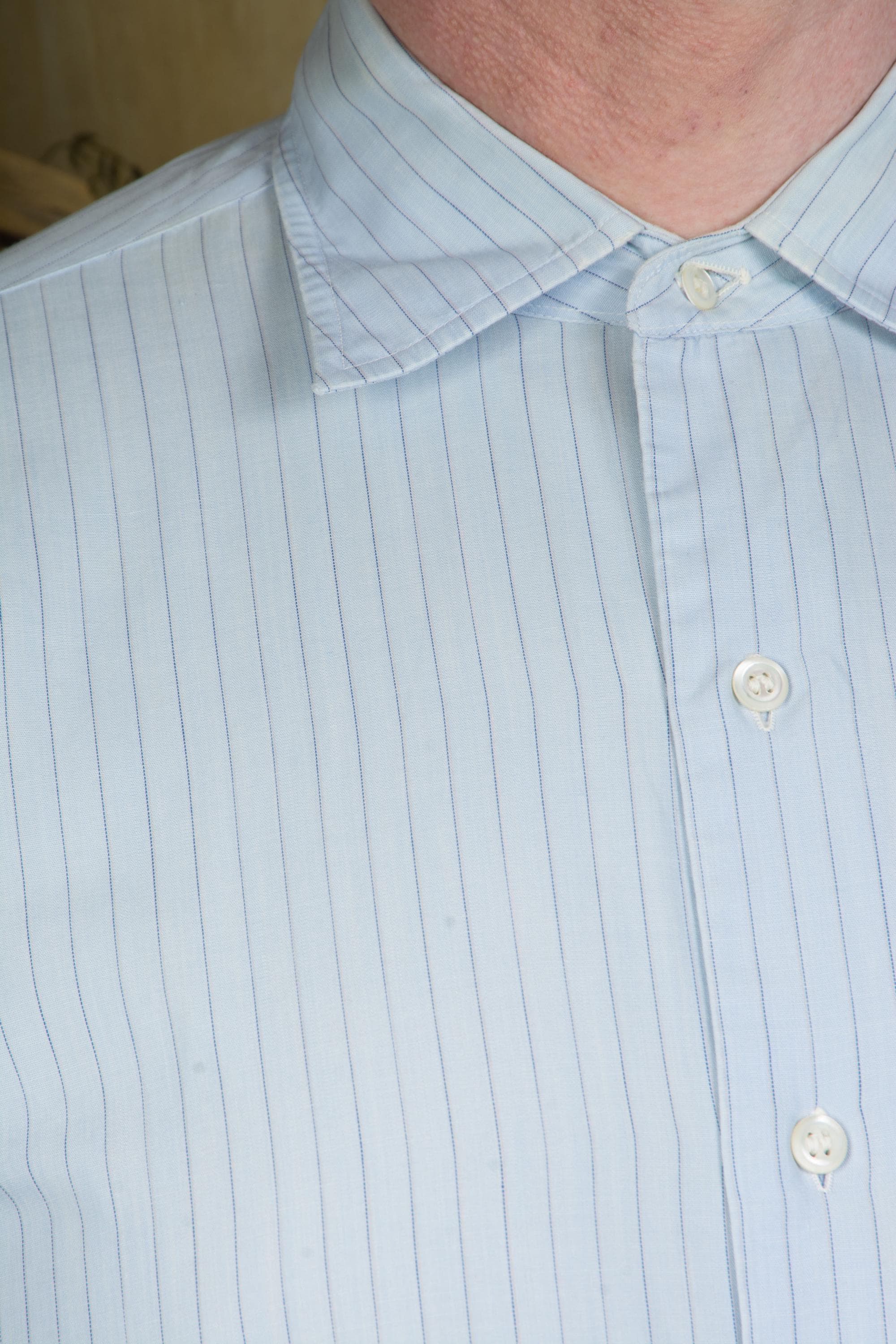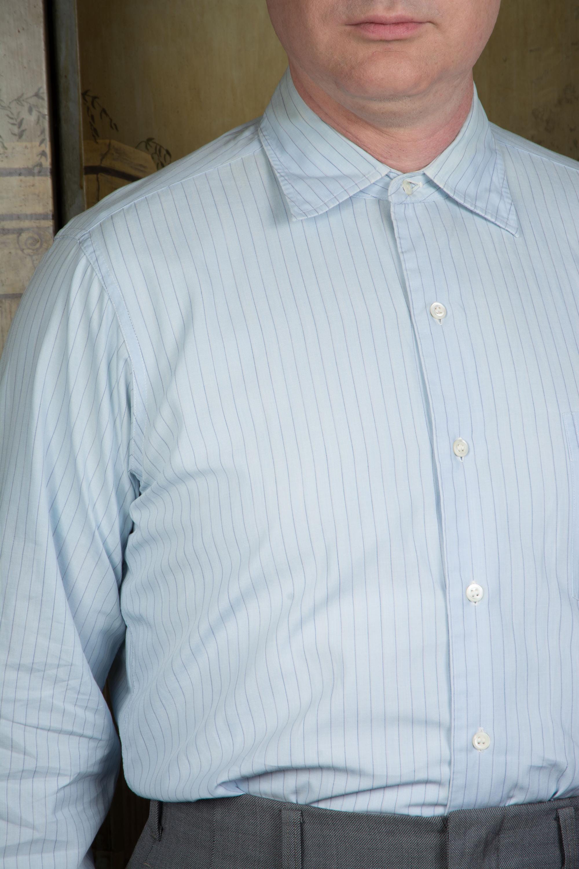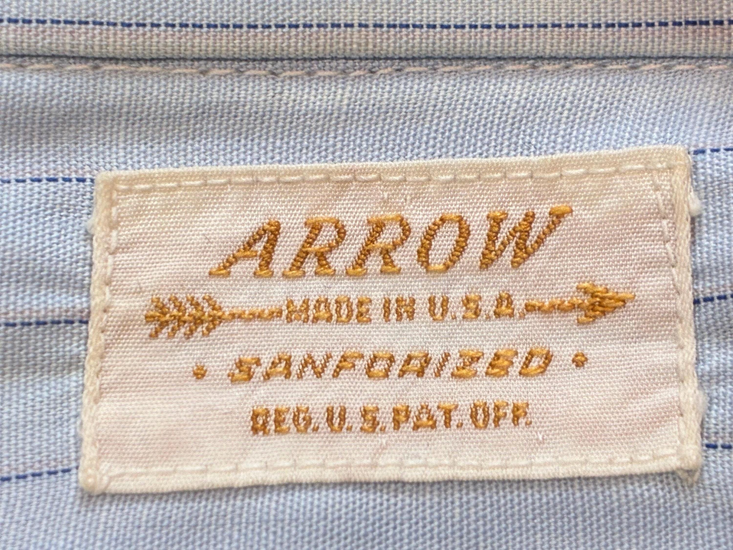 A classic 1960s dress shirt with space for removable collar stiffeners. This timeless piece by Arrow is a quality you won't today, made of sanforized cotton in soft blue with a navy and faint red stripe. Gusseted shirt tails, crisply finished pockets. Has wide french cuffs.