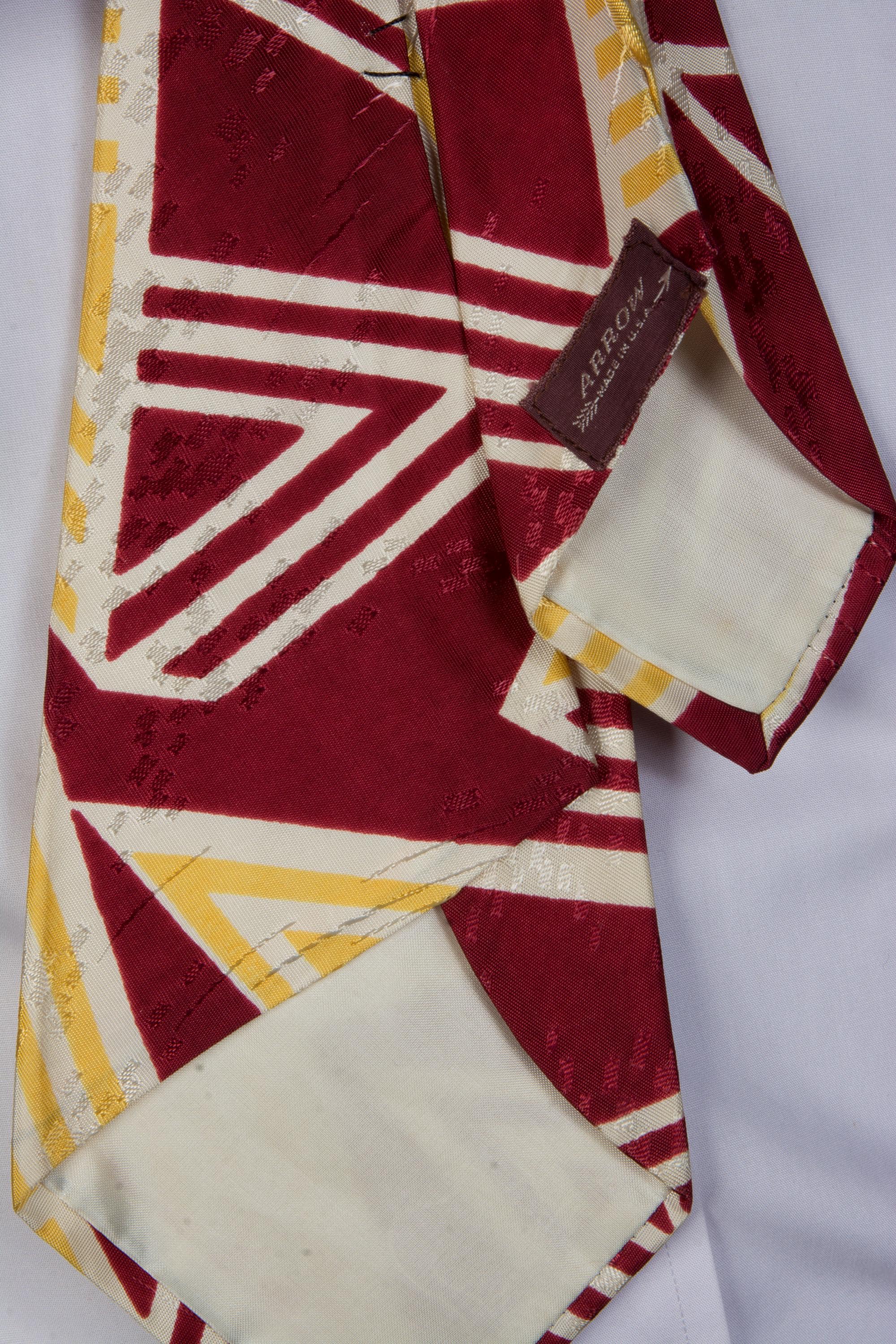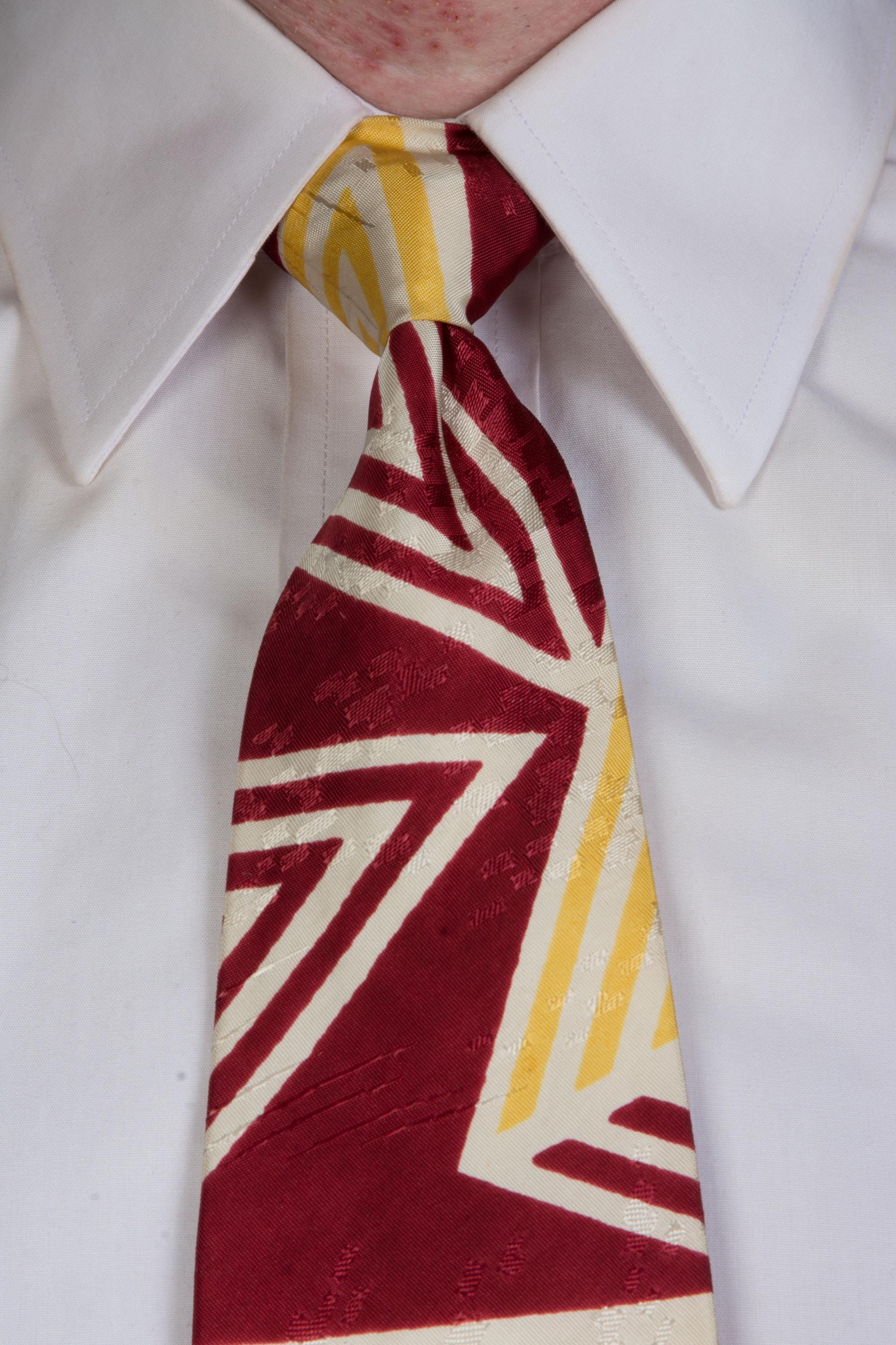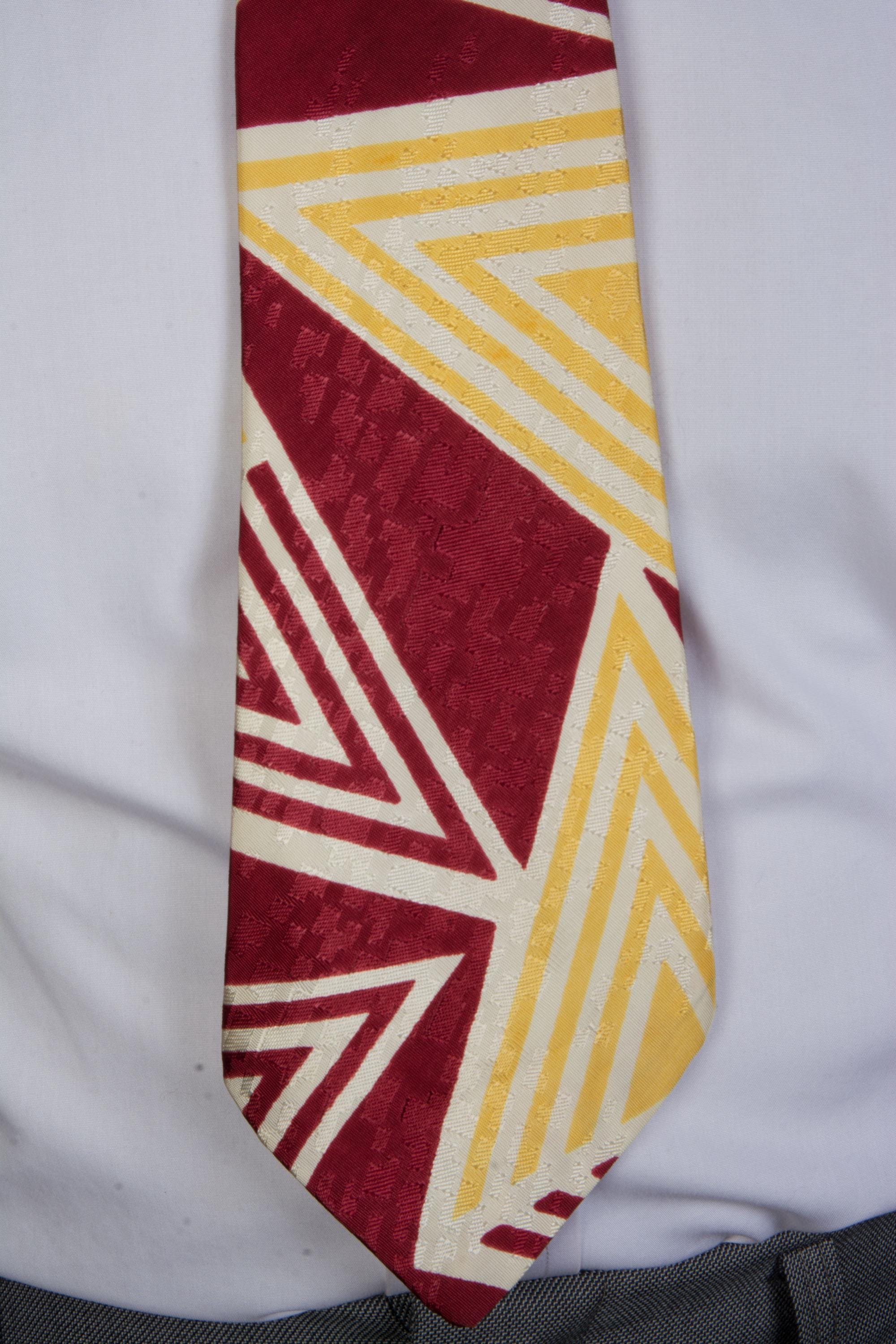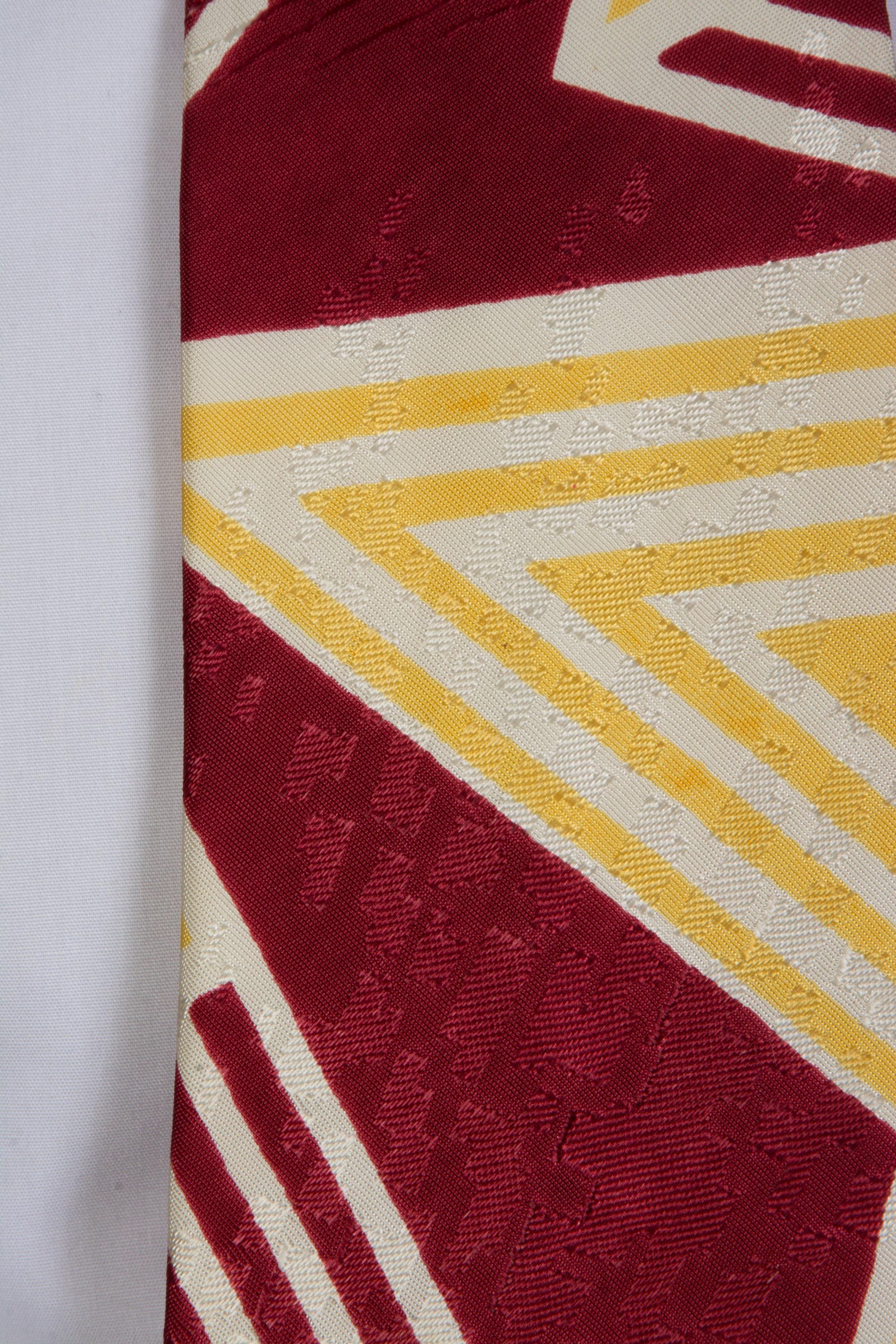 An absolutely shimmering 1940s brocade tie, in a pattern that is almost certainly meant to evoke V for Victory, all in yellow, white and burgundy. The brocade pattern is aggressively lustrous - it really stands out! Fully lined. I particularly like this one.