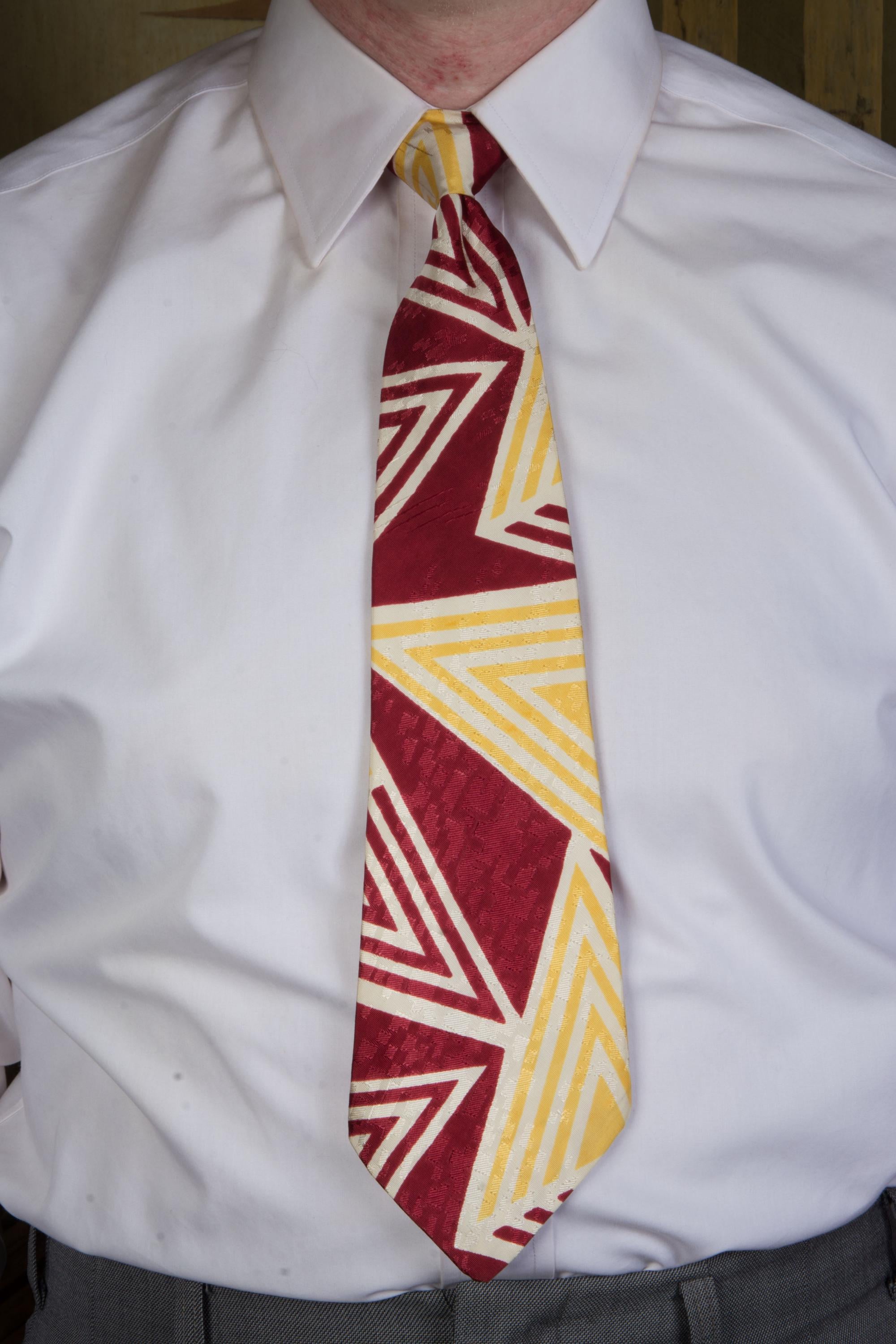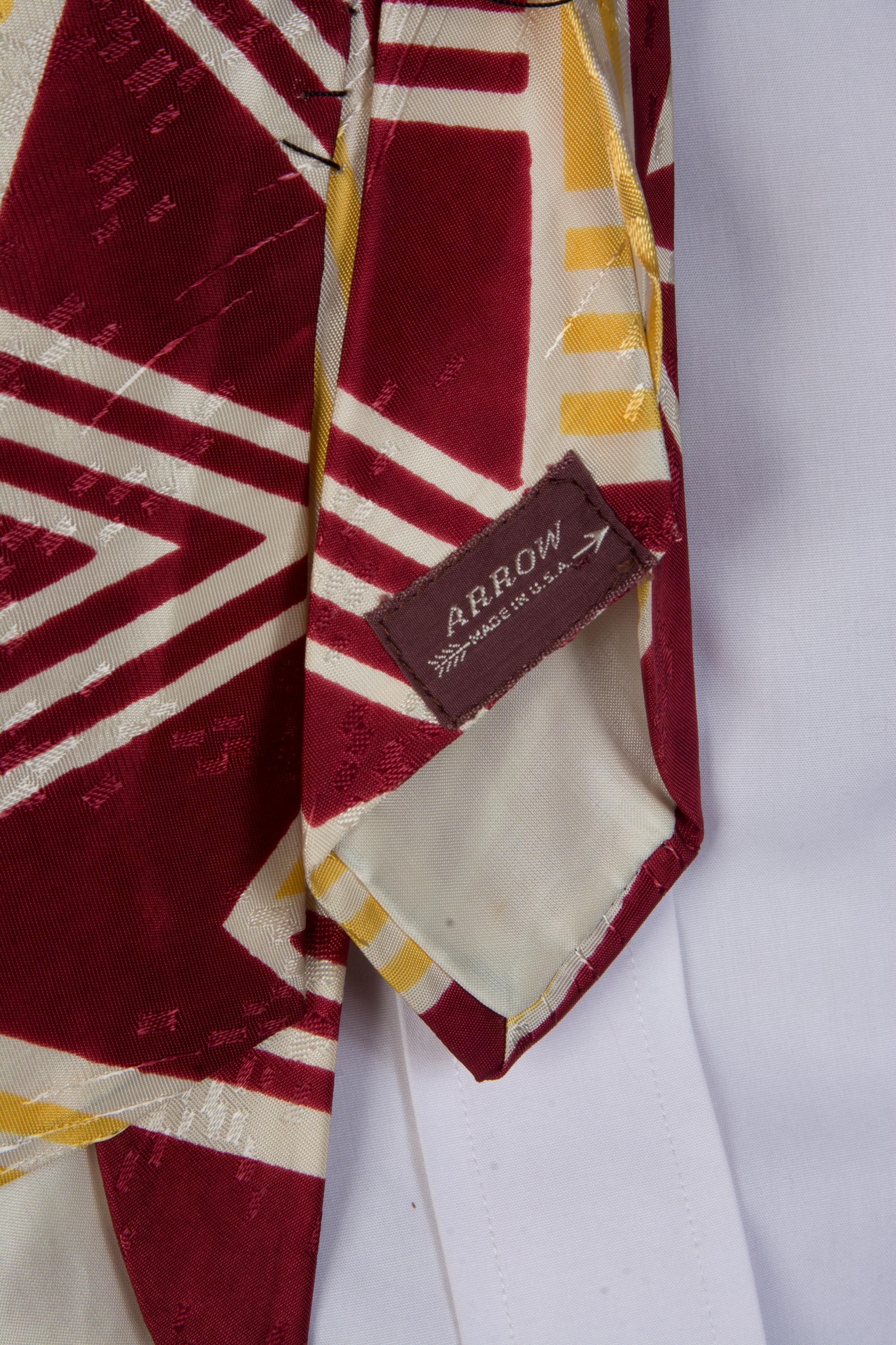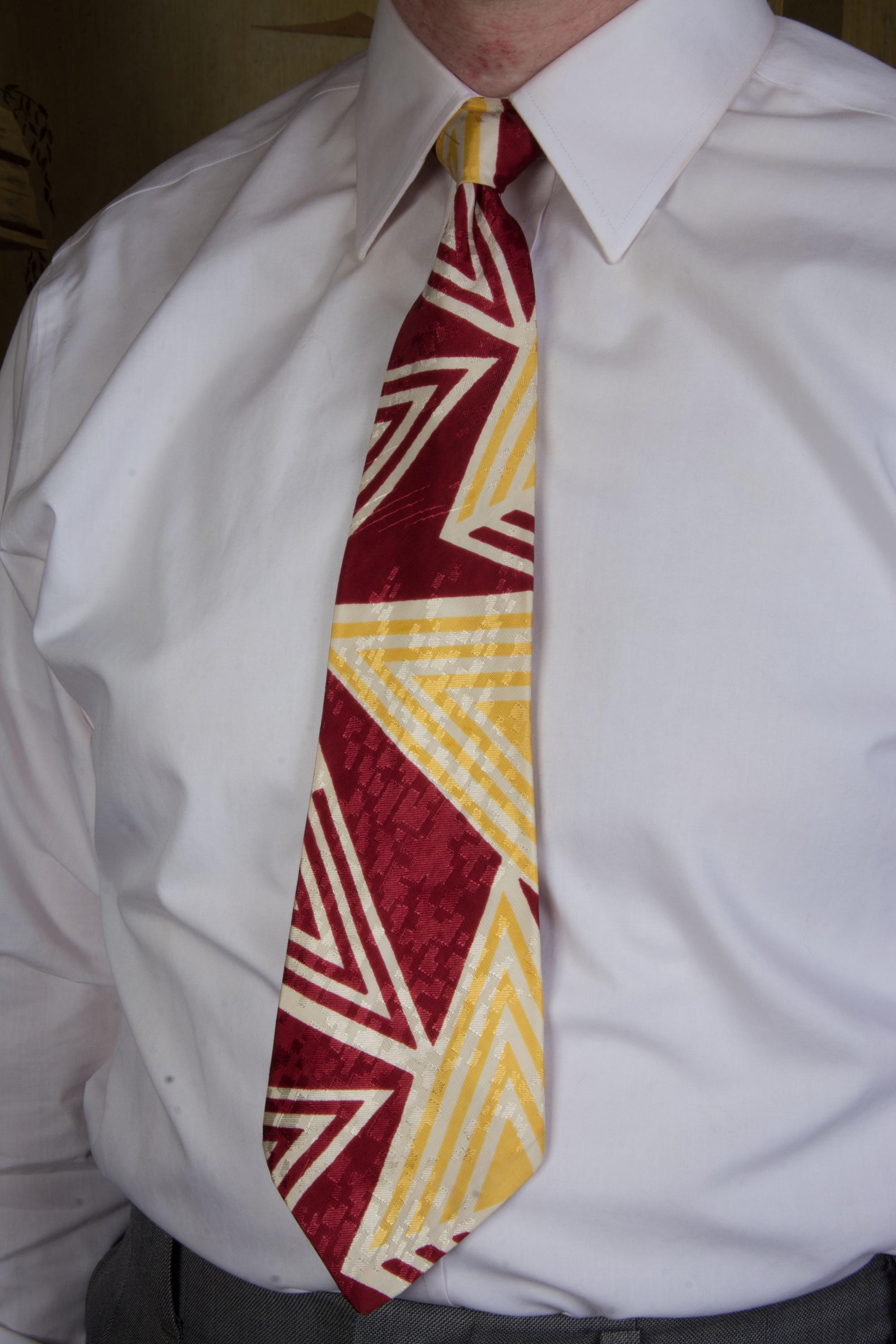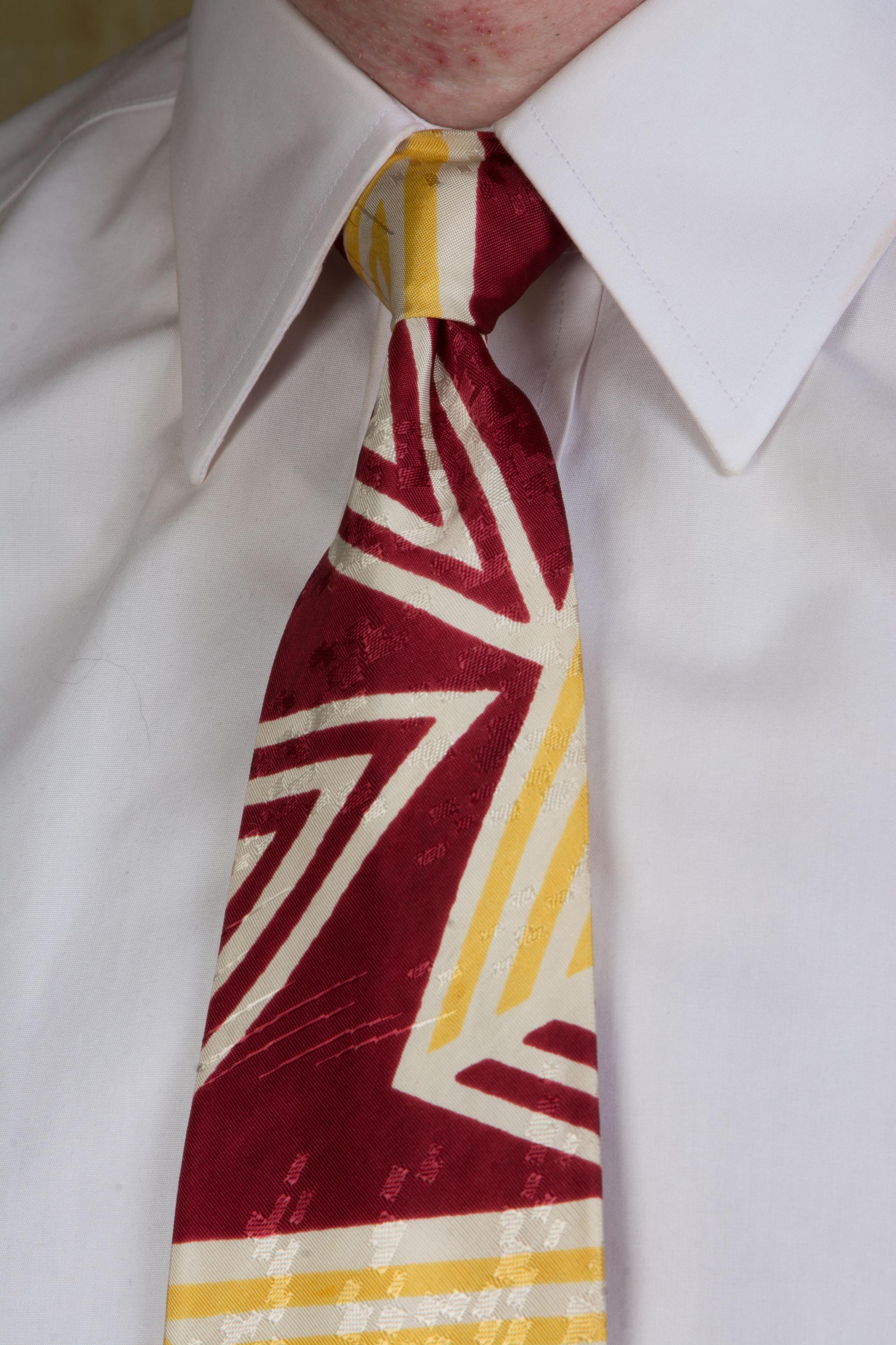 An absolutely shimmering 1940s brocade tie, in a pattern that is almost certainly meant to evoke V for Victory, all in yellow, white and burgundy. The brocade pattern is aggressively lustrous - it really stands out! Fully lined. I particularly like this one.