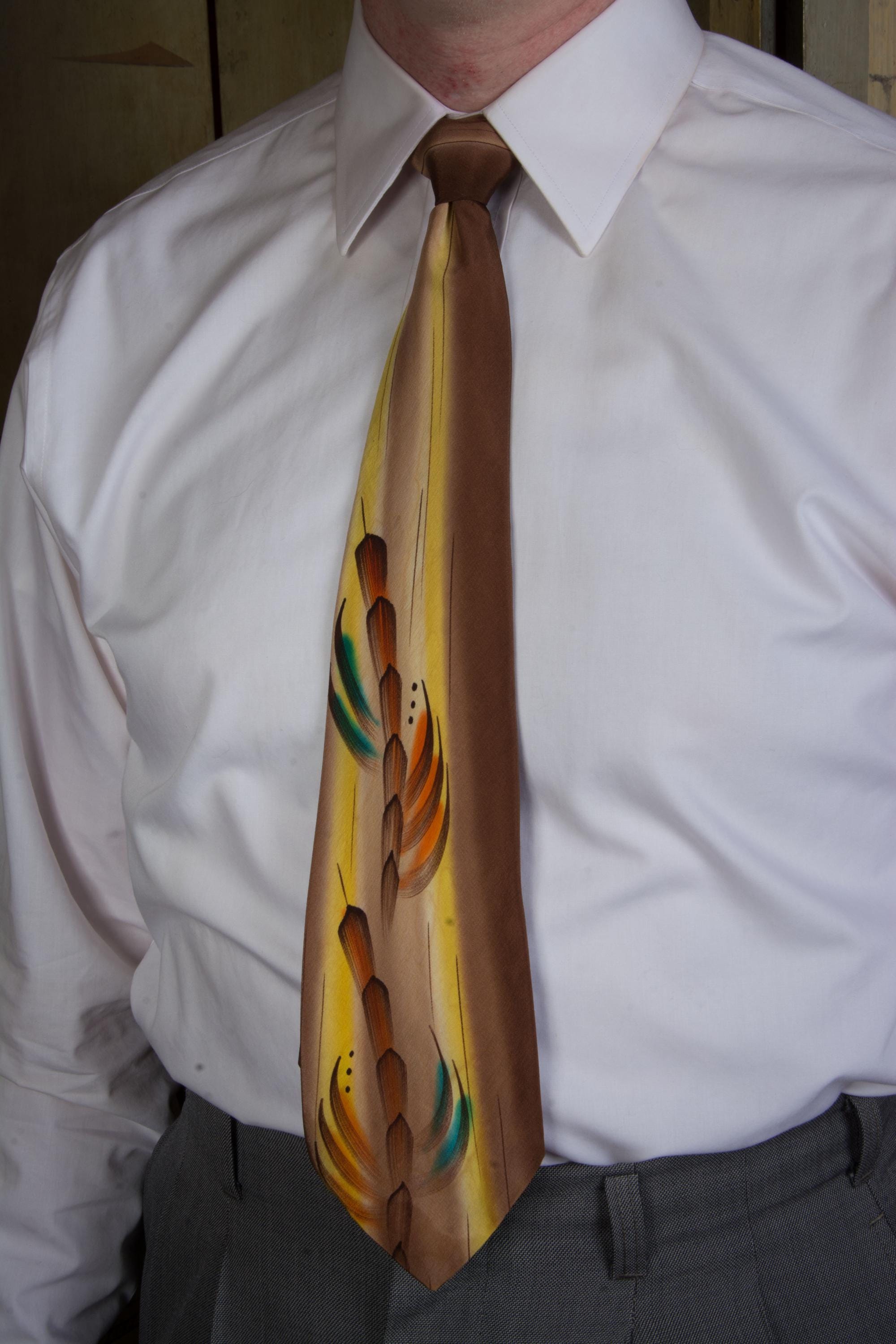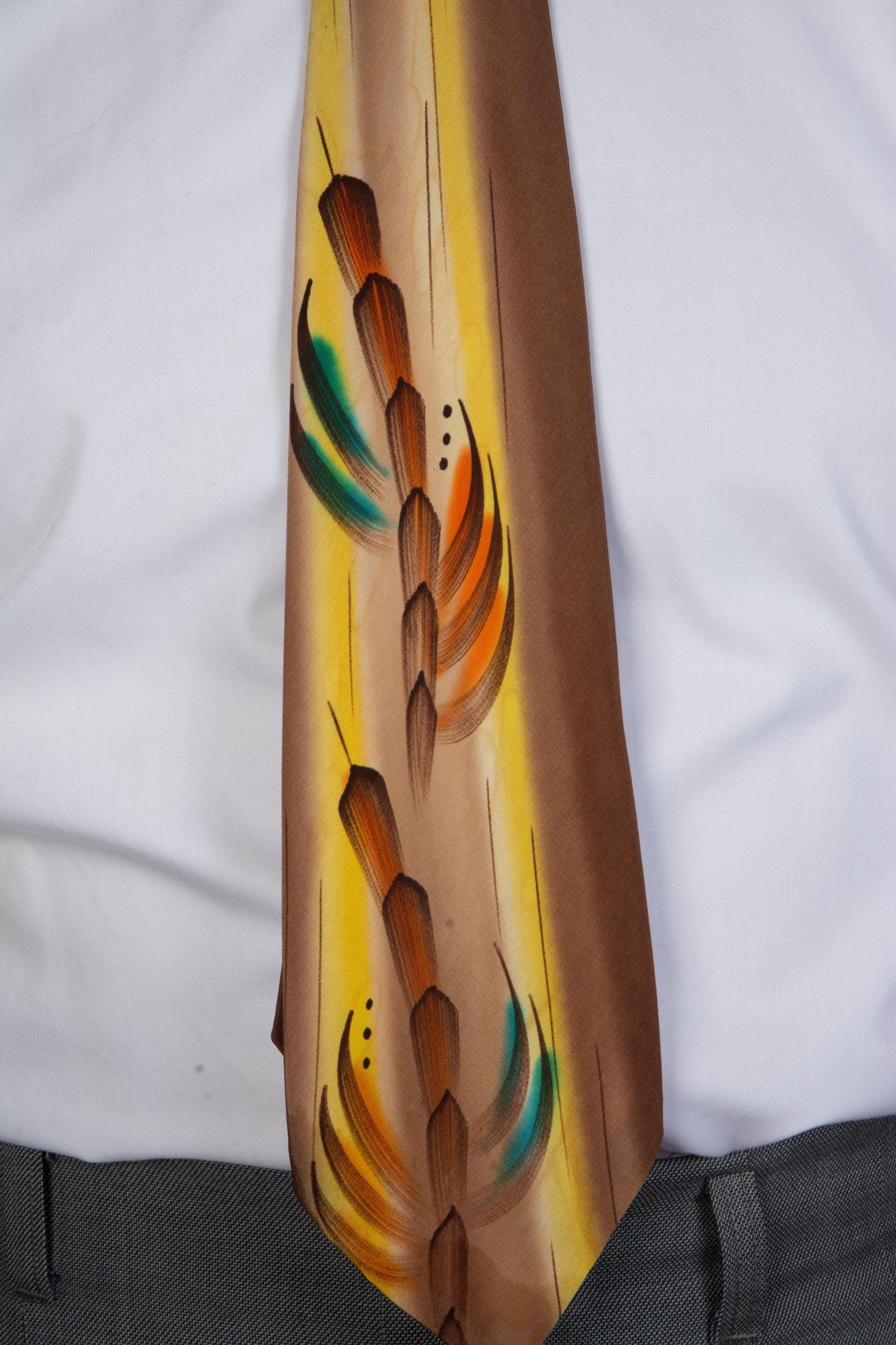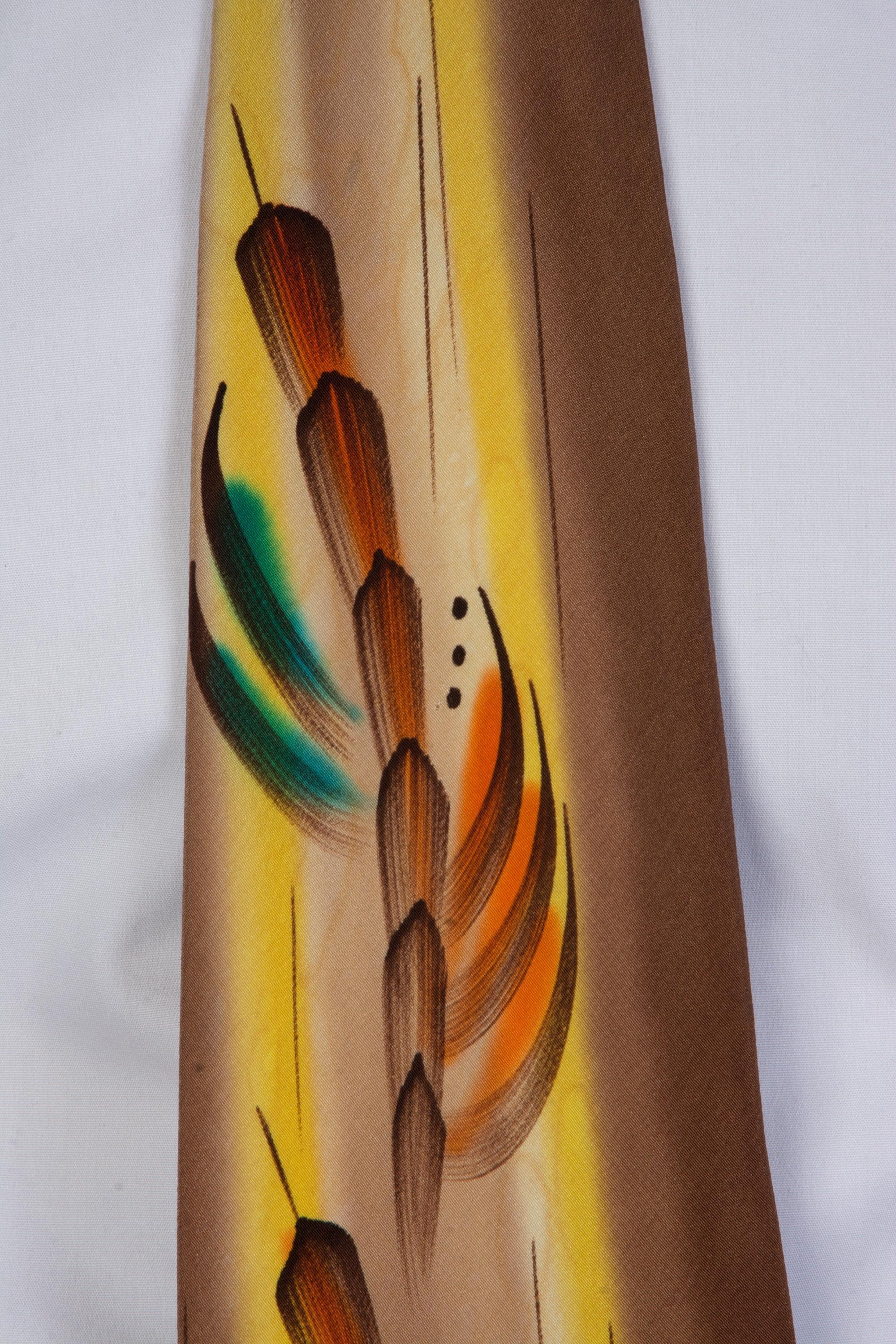 A stunning handpainted tie, a rare version that is silk rather than nylon/acetate! It has amazing luster and you can really feel the quality, its so soft with excellent drape. The tan, yellow and brown background is embellished with a motif that looks like marsh plants, adding a touch of orange and teal. It is fully lined with lightweight lining