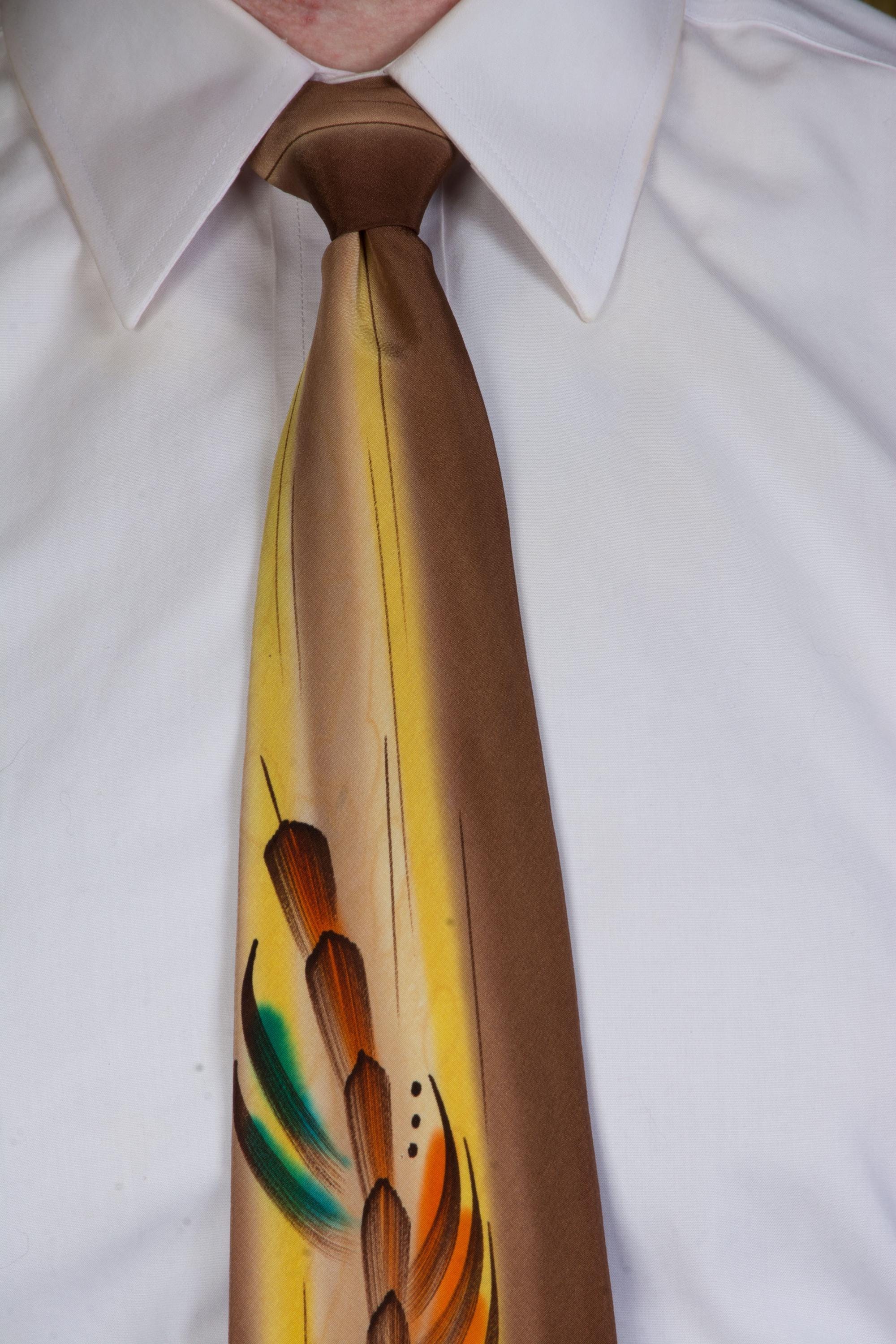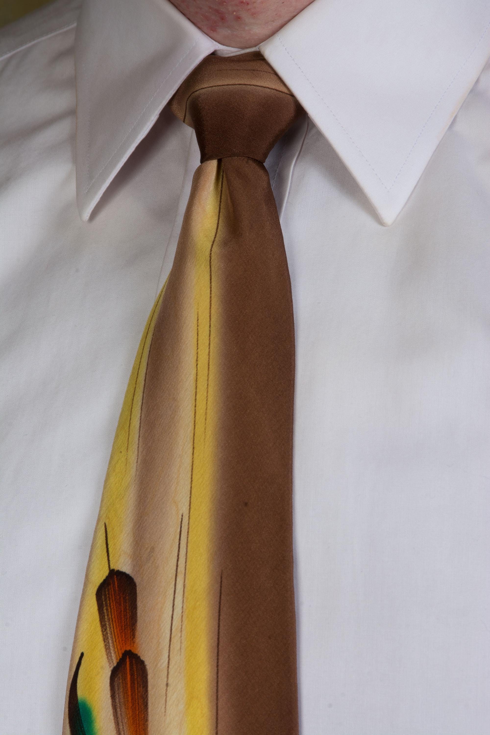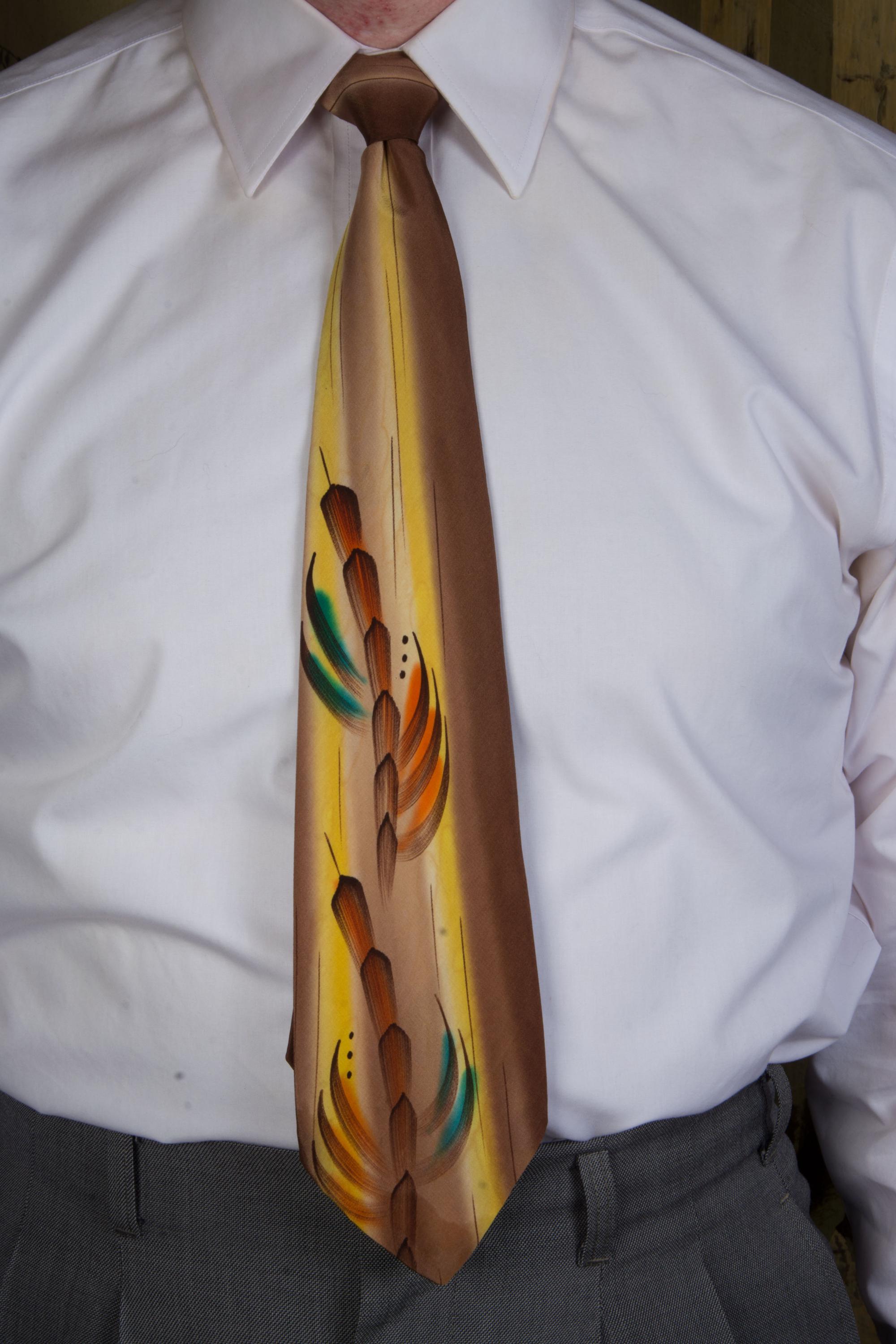 A stunning handpainted tie, a rare version that is silk rather than nylon/acetate! It has amazing luster and you can really feel the quality, its so soft with excellent drape. The tan, yellow and brown background is embellished with a motif that looks like marsh plants, adding a touch of orange and teal. It is fully lined with lightweight lining