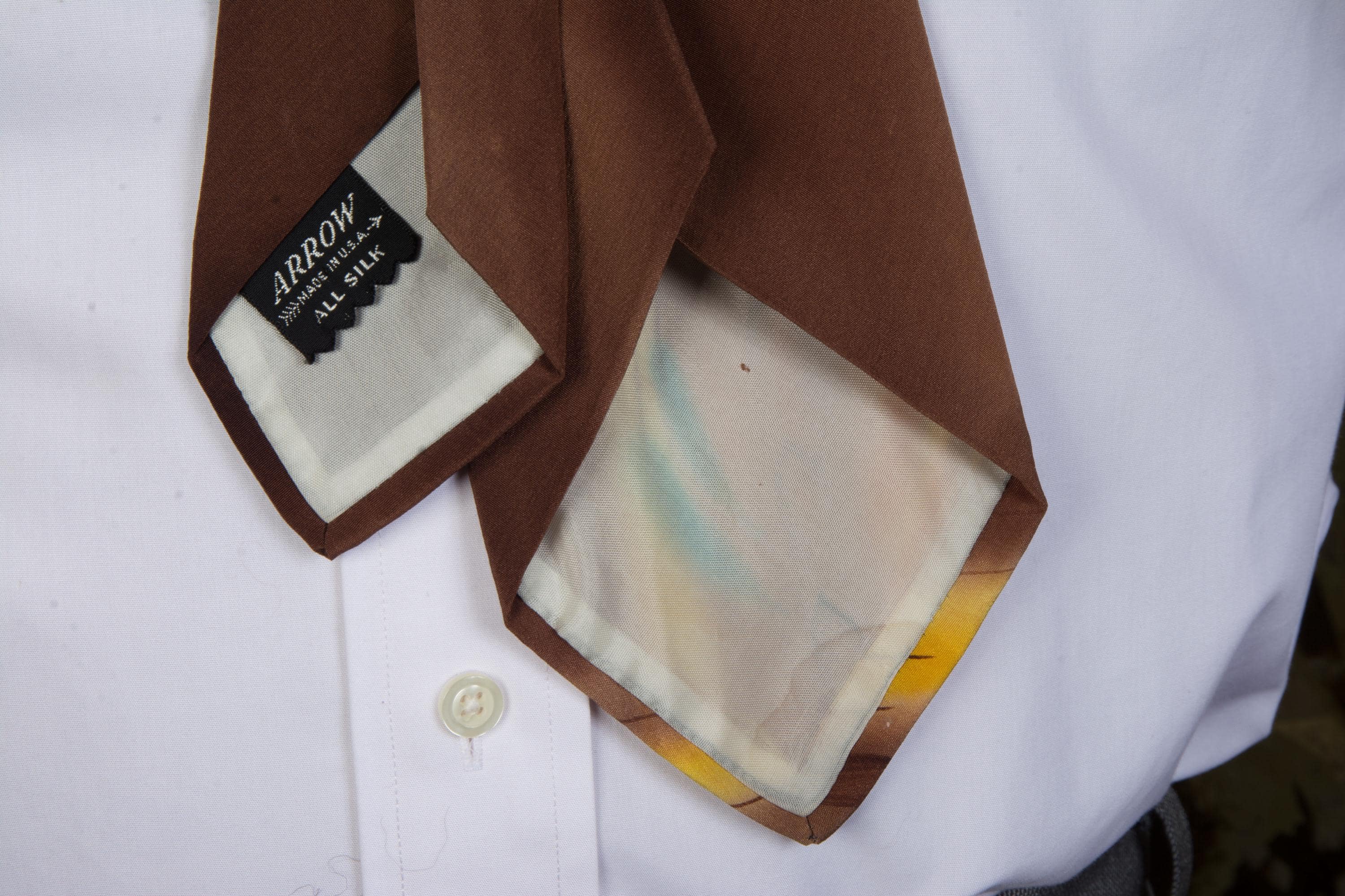 This gorgeous tie wears beautifully. Has not been dry cleaned. There is an extremely subtle water line down along the mid tan paint line, and a couple spots. These are so subtle that they are either from the painting process or are basically being concealed by the paint. Look at photo 5 in close up. I find no other issues to note!