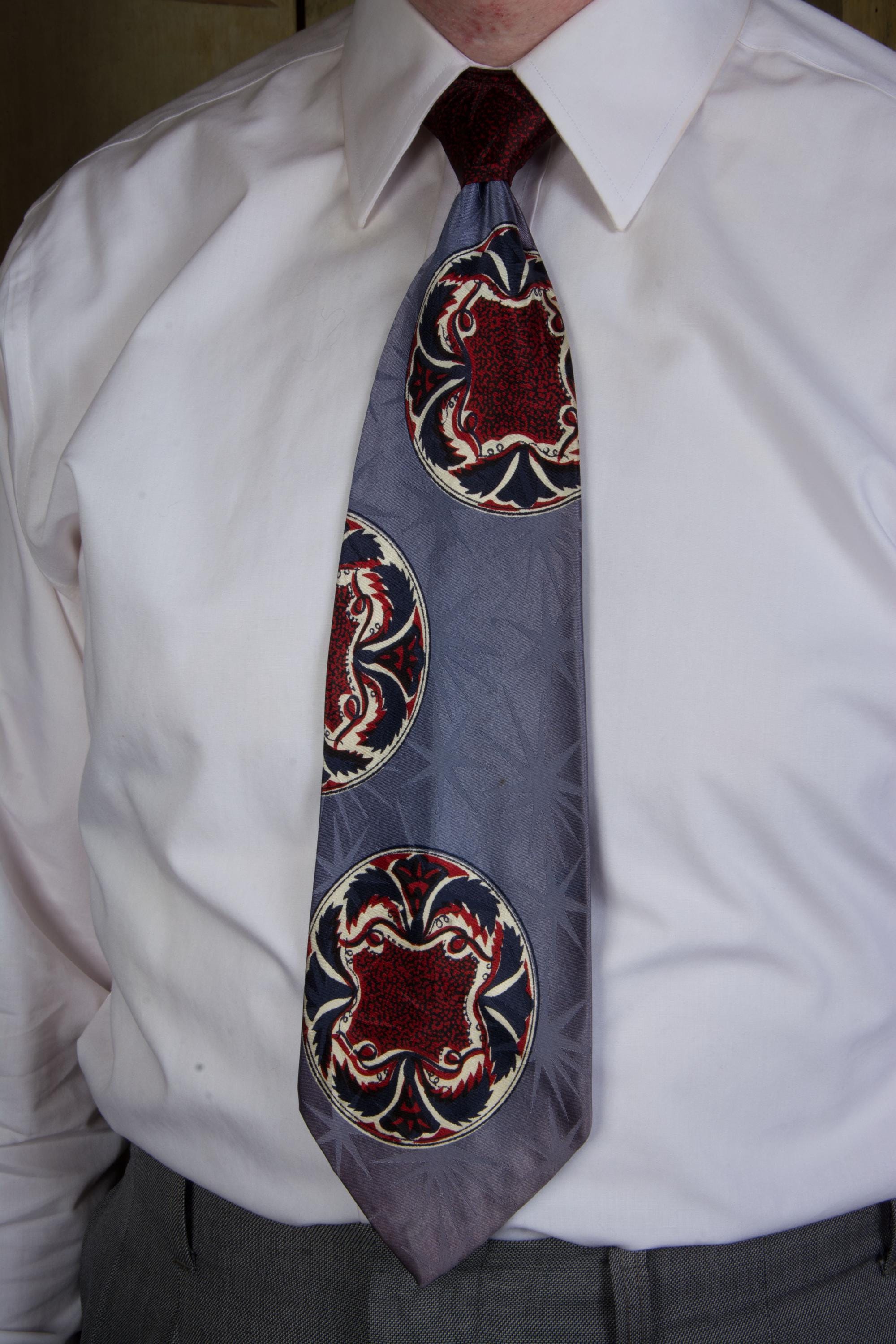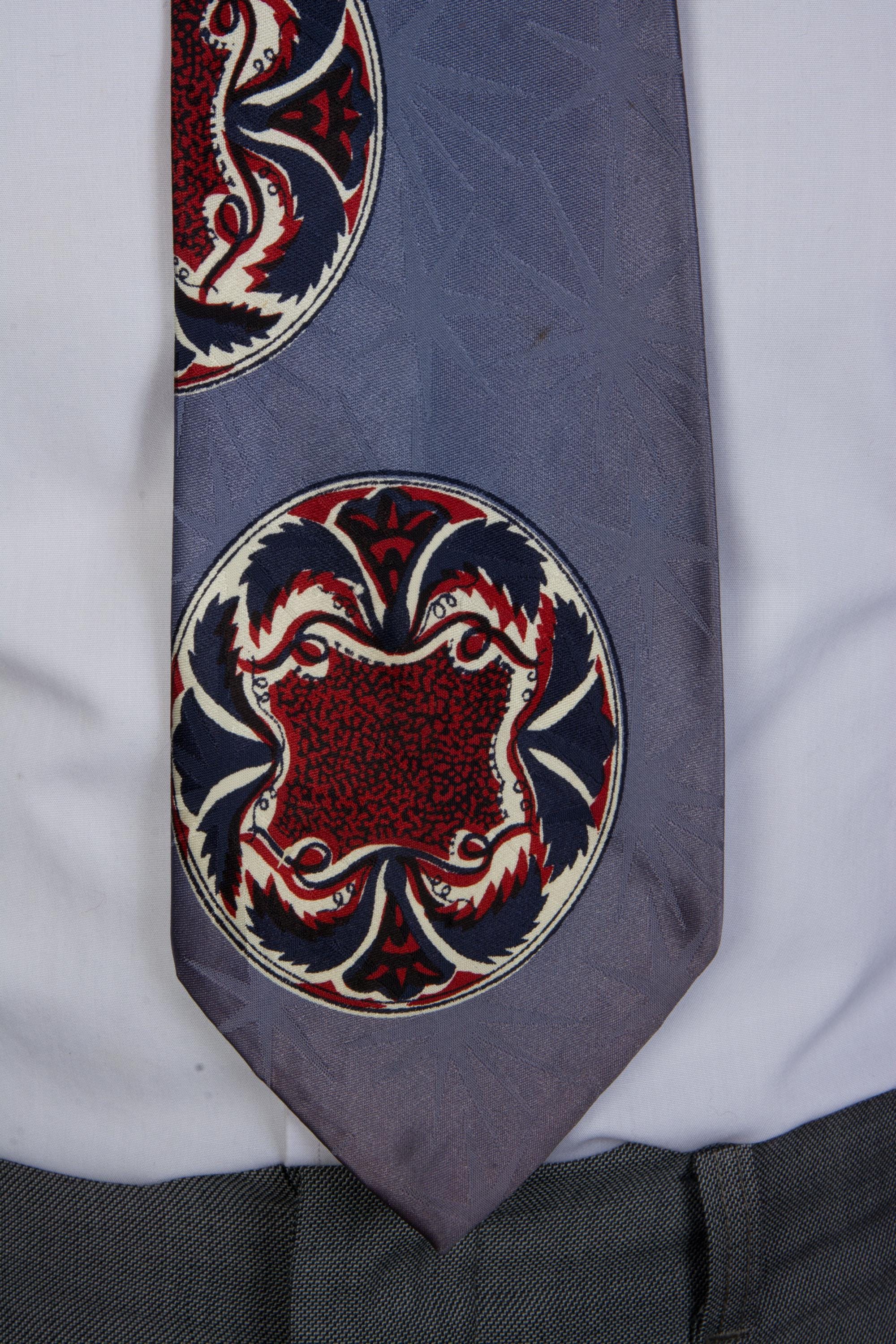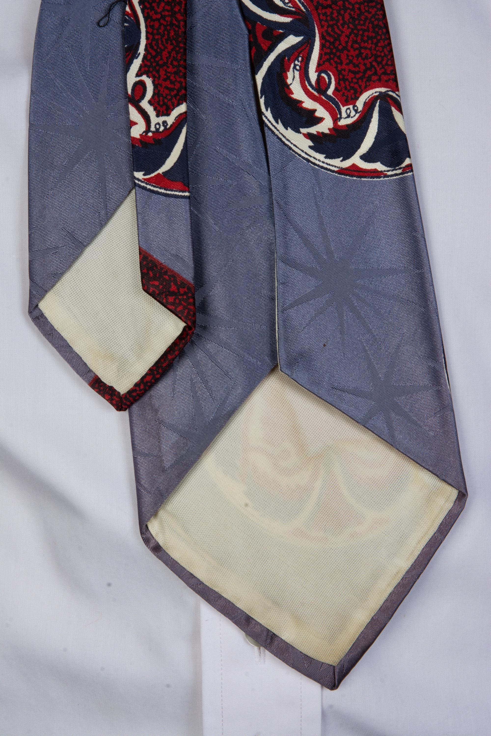 If you love a really glossy tie, here's a winner for you! Vintage late 1940s bold look is shiny satin brocade in a cornflower blue with medallions of brick red, white, navy and black. The background broccade of irregular starbursts really pops. What I love most, though, is the fact that the tie transitions to a burgundy and navy speckle, creating that accent knot. This is fully lined.