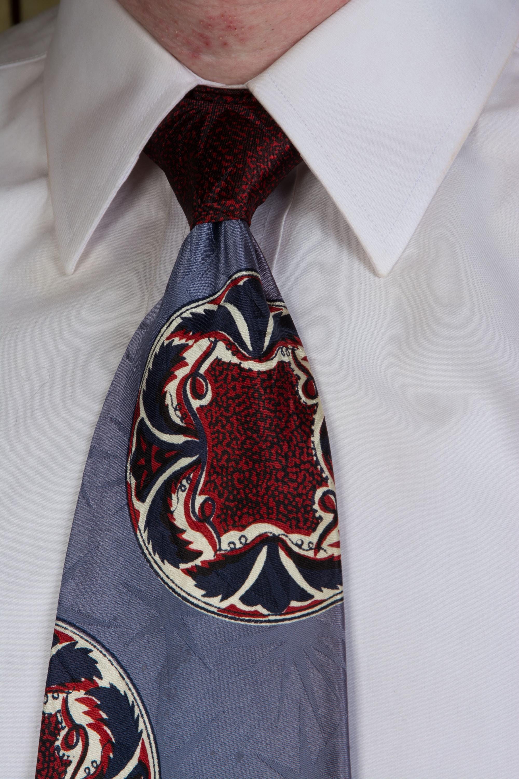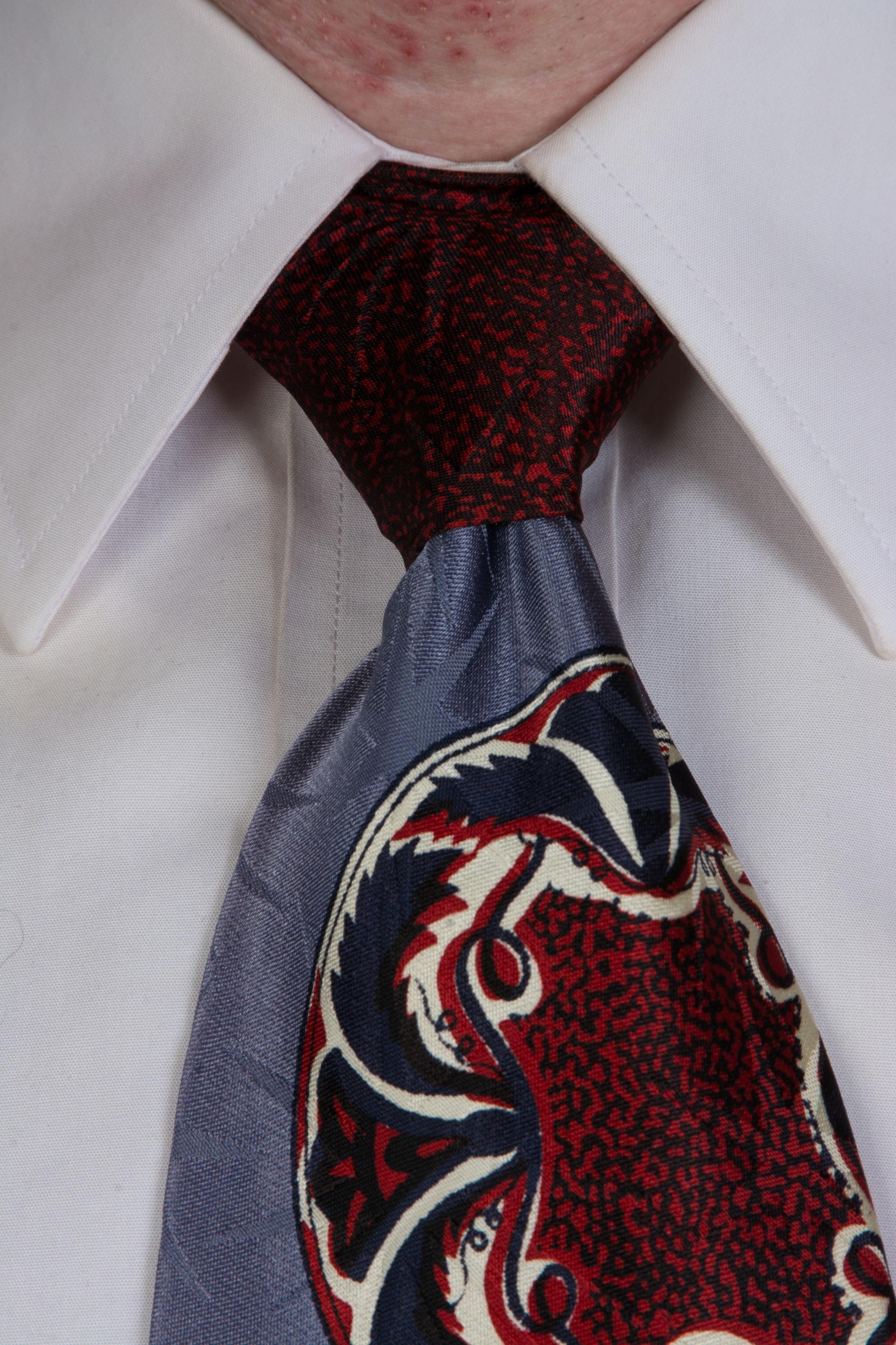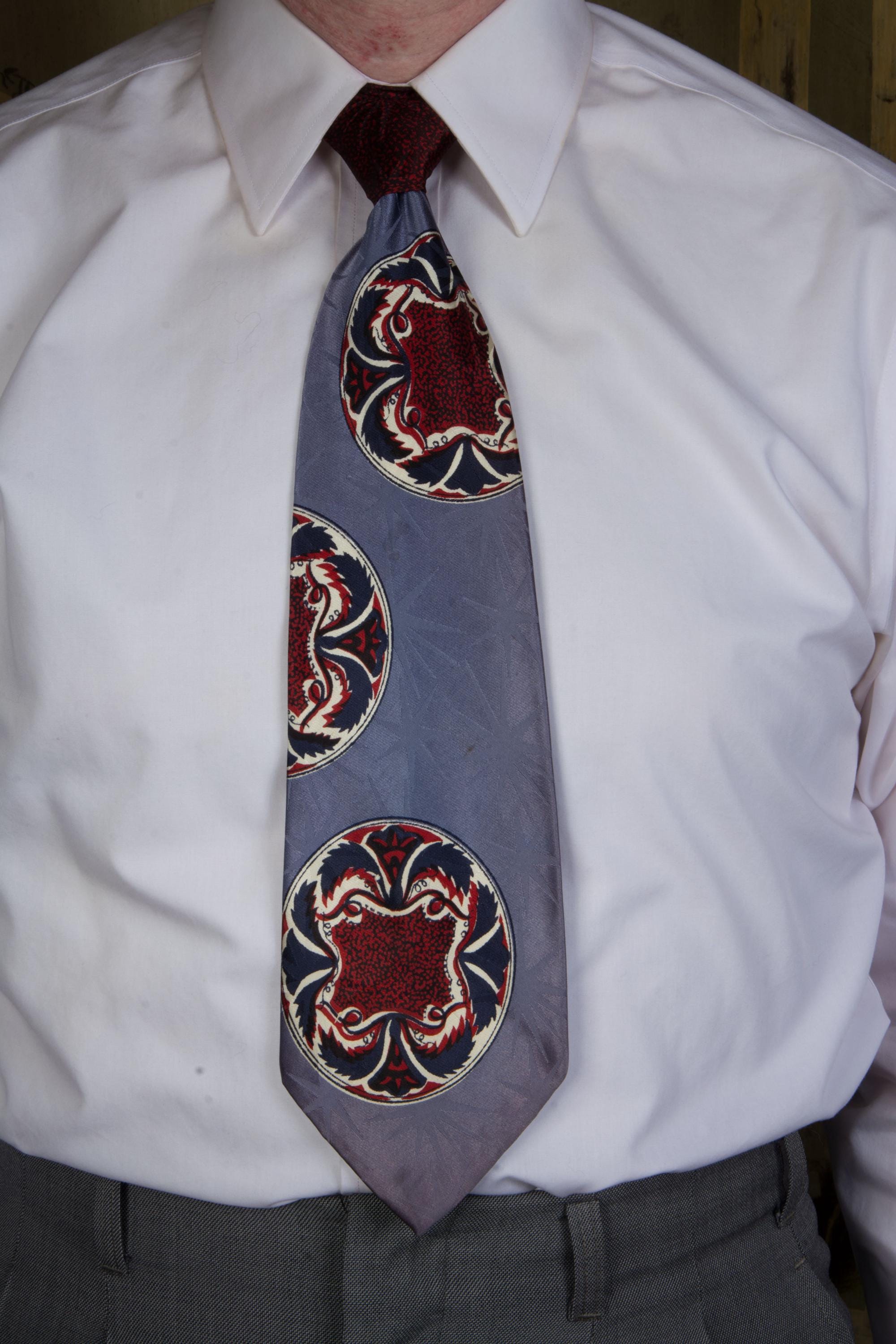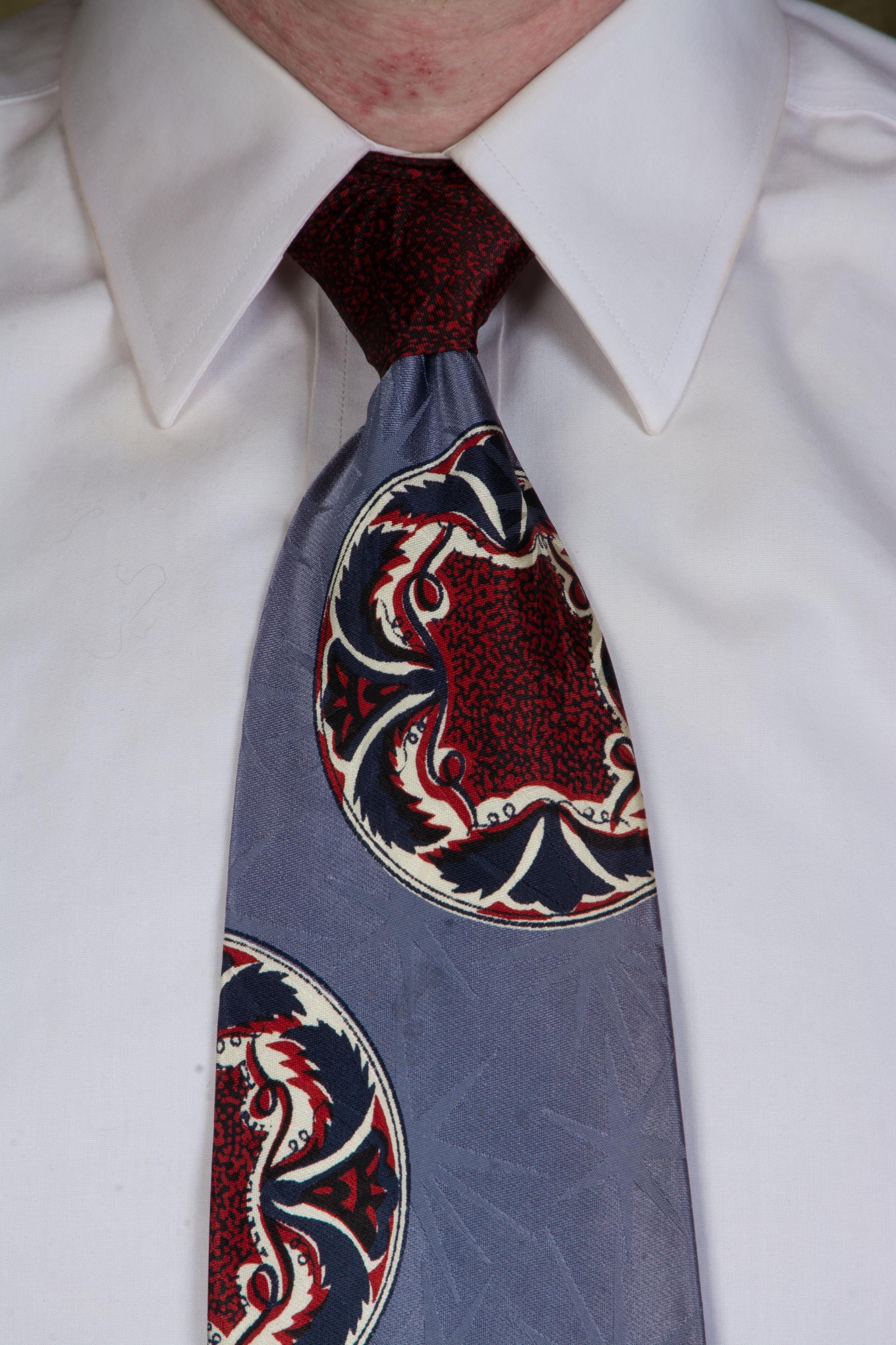 If you love a really glossy tie, here's a winner for you! Vintage late 1940s bold look is shiny satin brocade in a cornflower blue with medallions of brick red, white, navy and black. The background broccade of irregular starbursts really pops. What I love most, though, is the fact that the tie transitions to a burgundy and navy speckle, creating that accent knot. This is fully lined.