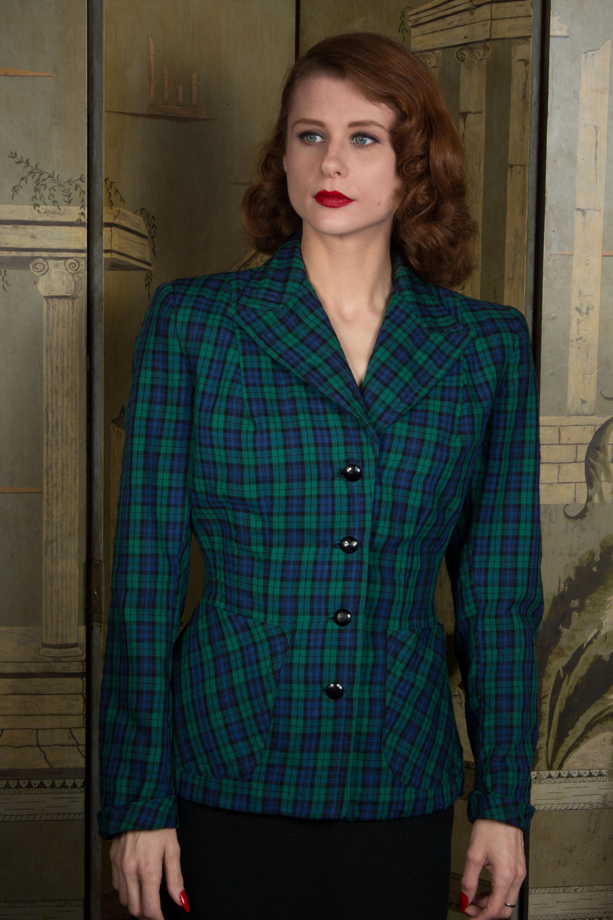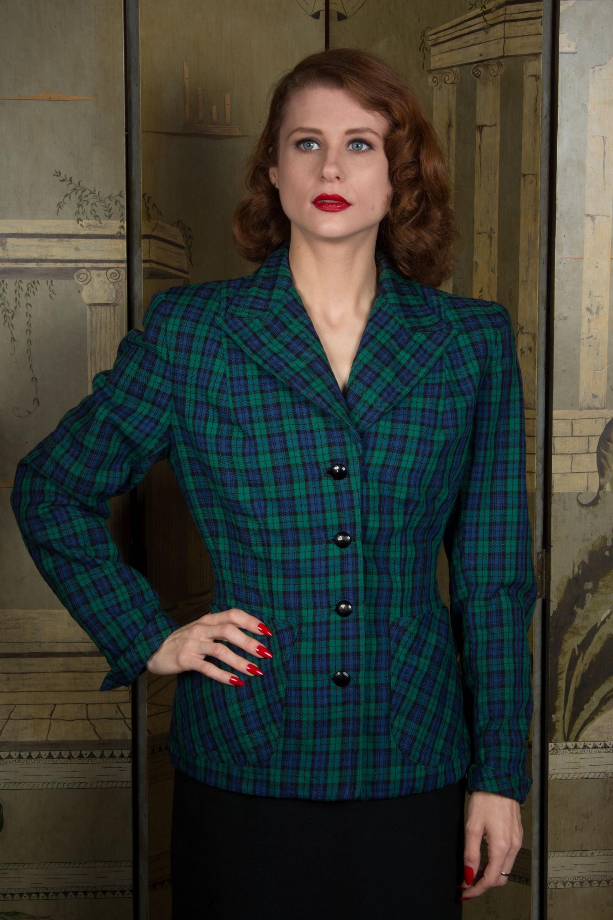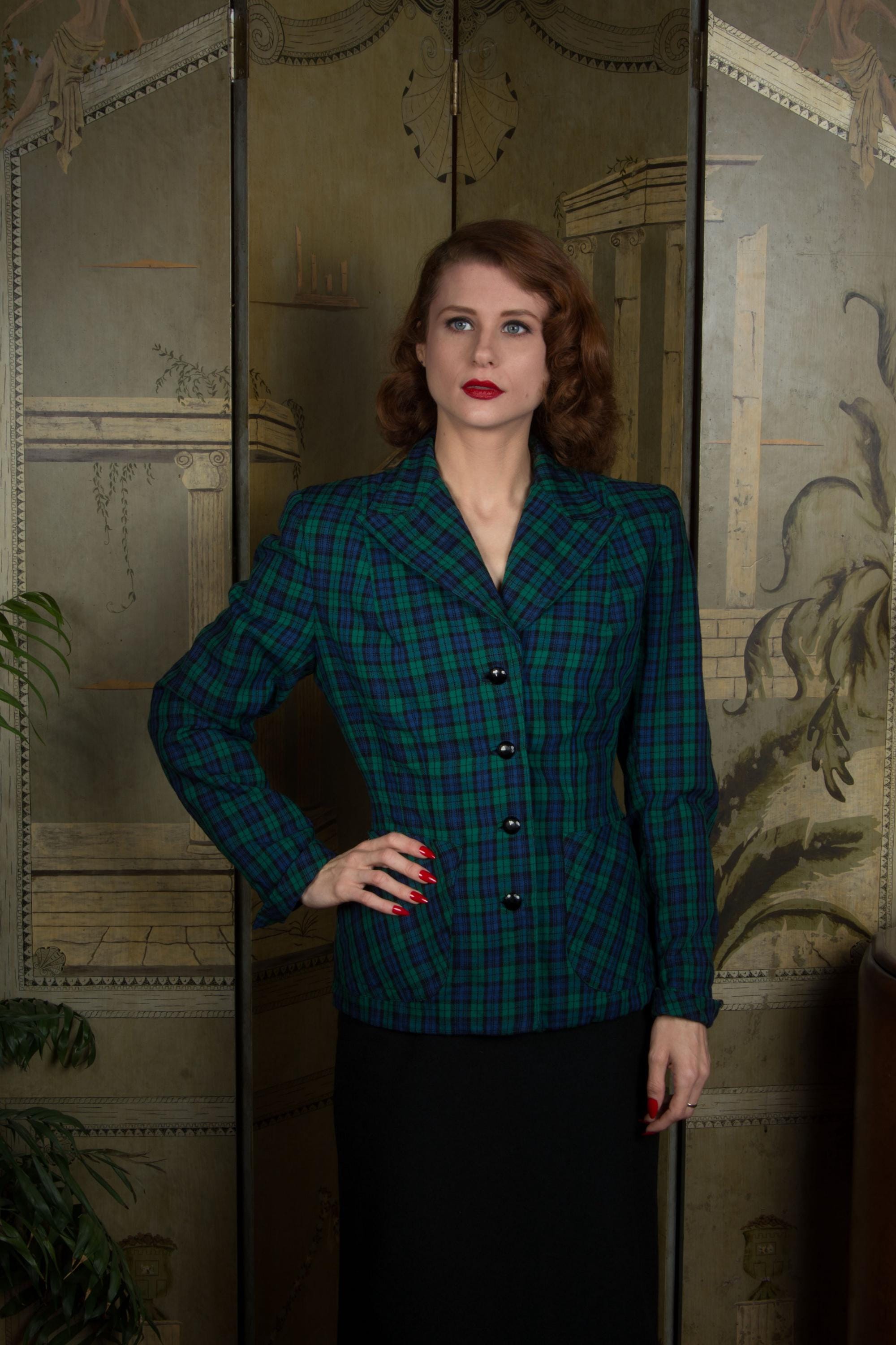 Vintage 1940s jacket is a real darling - this has the very crisp peaked lapels of an earlier 40s design (it might even be late 30s.) The wool is Black Watch tartan, a variation on the Campbell tartan. It's such a complete classic, oozing collegiate charm. The silhouette is flattering excellent with strong padded shoulders and a sleek waistline. The pockets turn the plaid to the bias by way of contrast. This jacket is fully lined with navy blue rayon crepe.