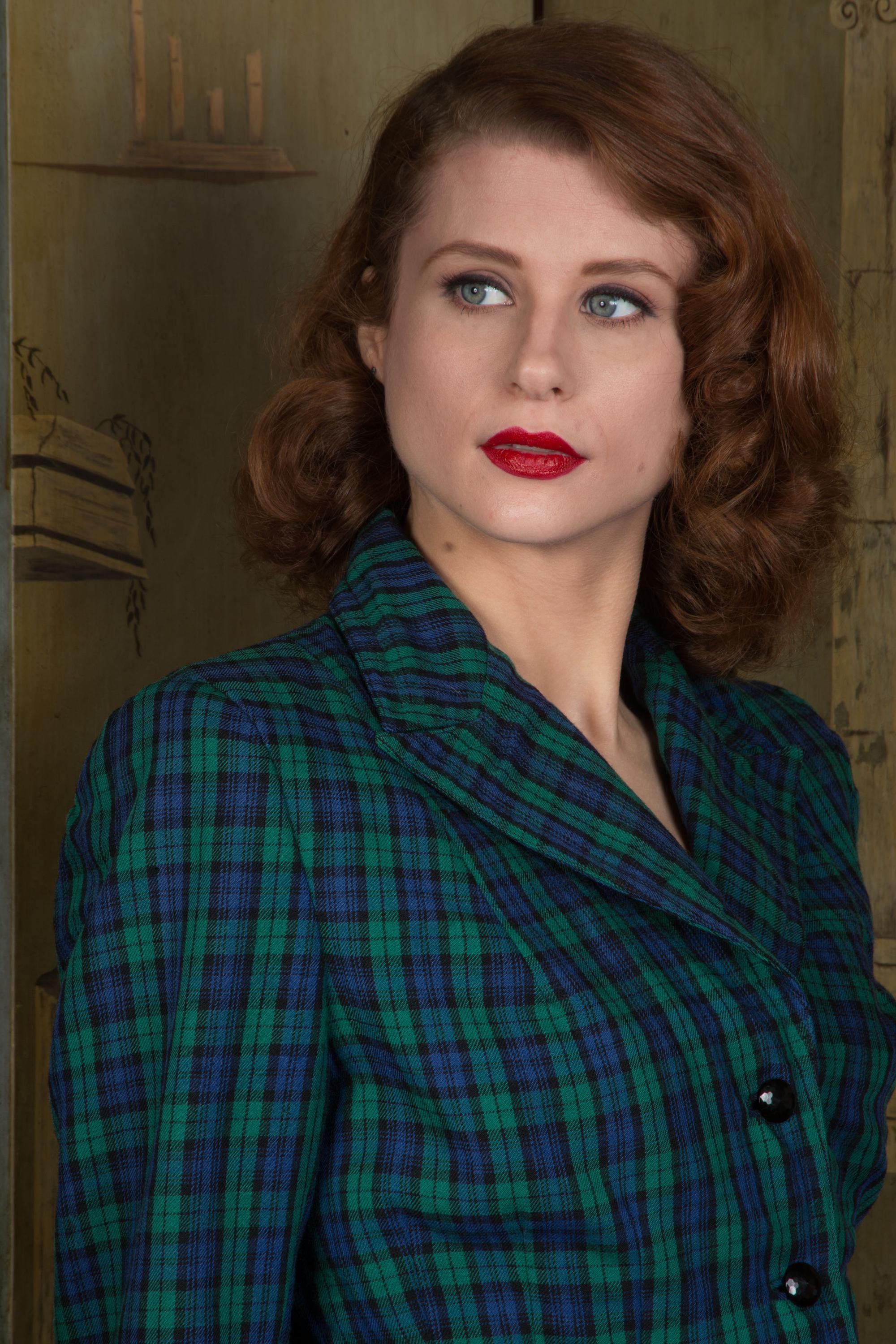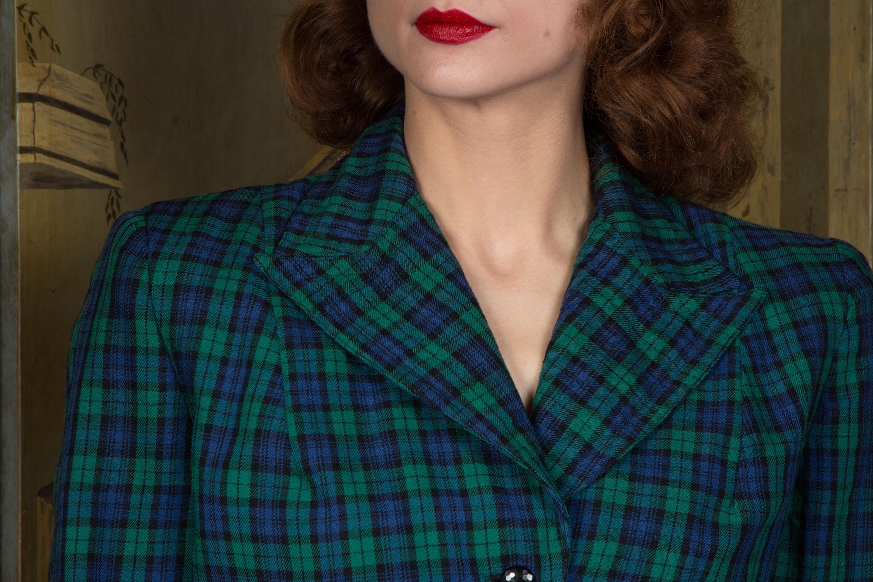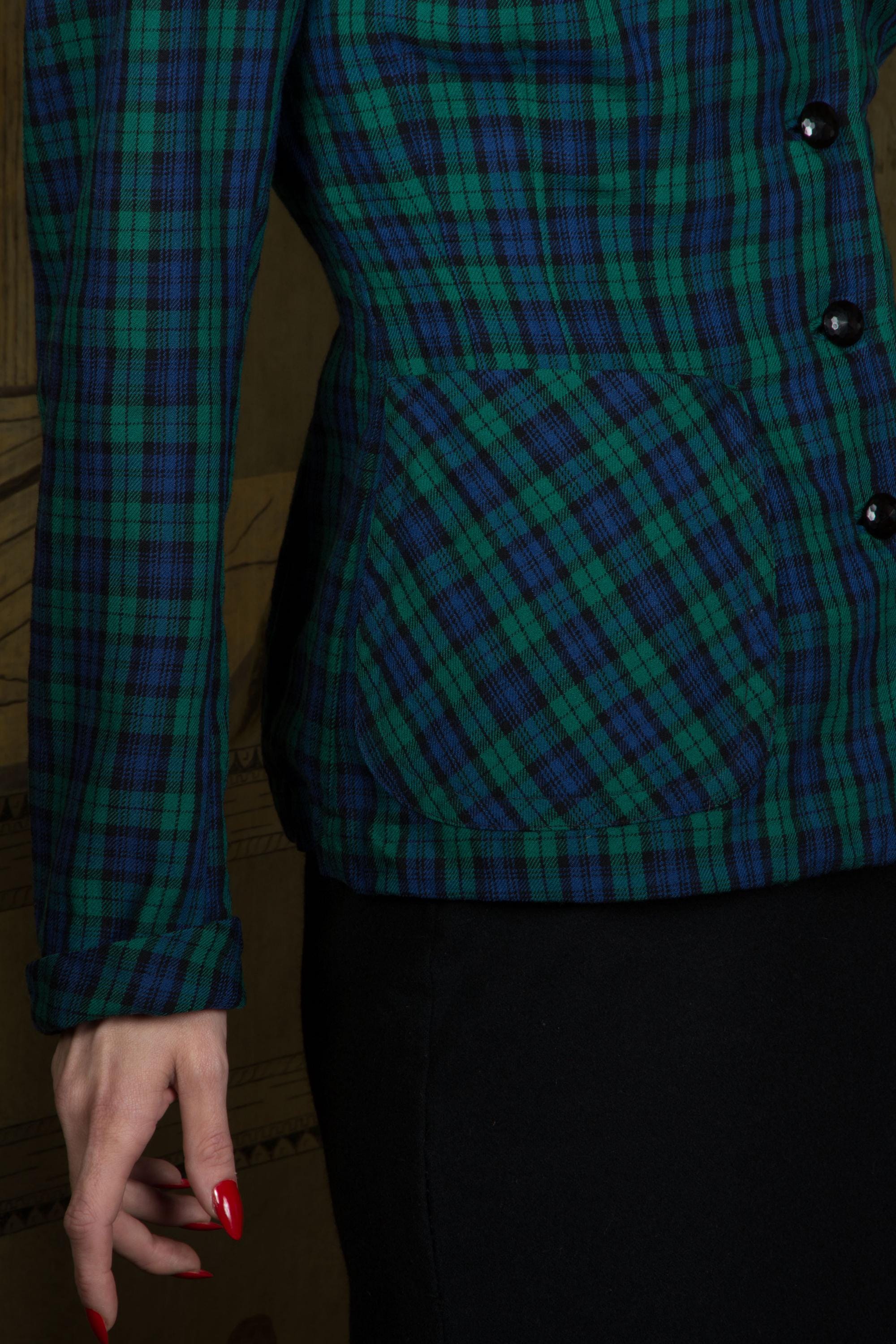 Vintage 1940s jacket is a real darling - this has the very crisp peaked lapels of an earlier 40s design (it might even be late 30s.) The wool is Black Watch tartan, a variation on the Campbell tartan. It's such a complete classic, oozing collegiate charm. The silhouette is flattering excellent with strong padded shoulders and a sleek waistline. The pockets turn the plaid to the bias by way of contrast. This jacket is fully lined with navy blue rayon crepe.