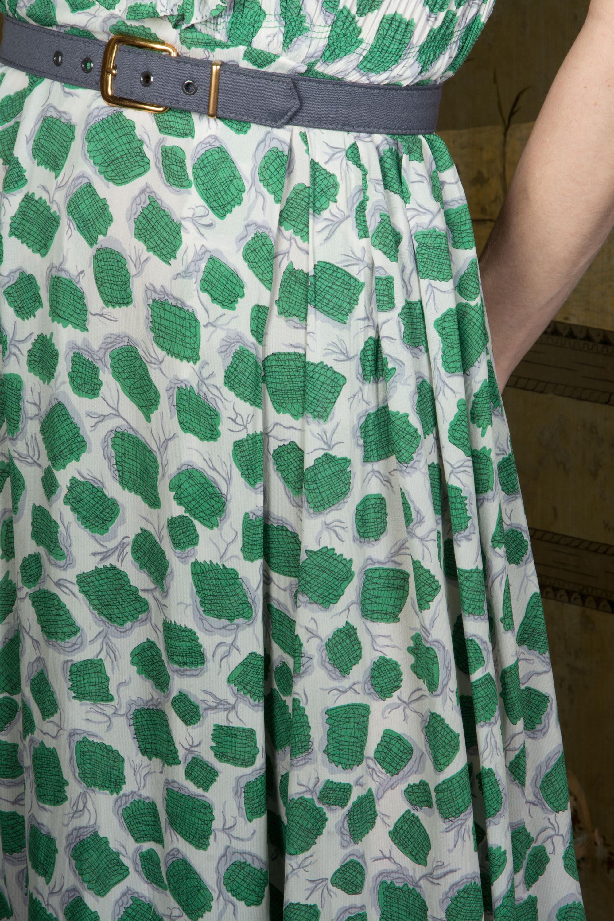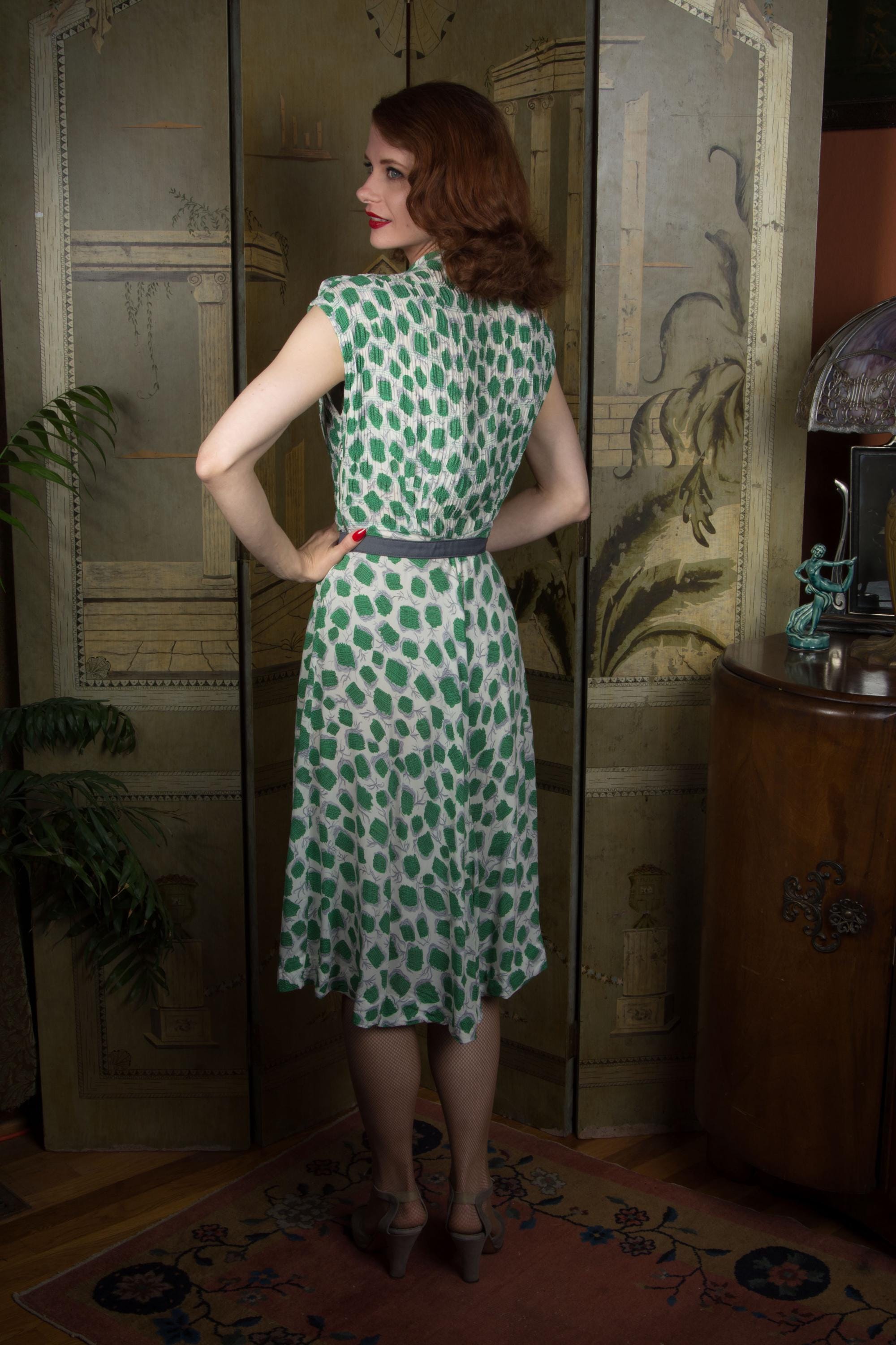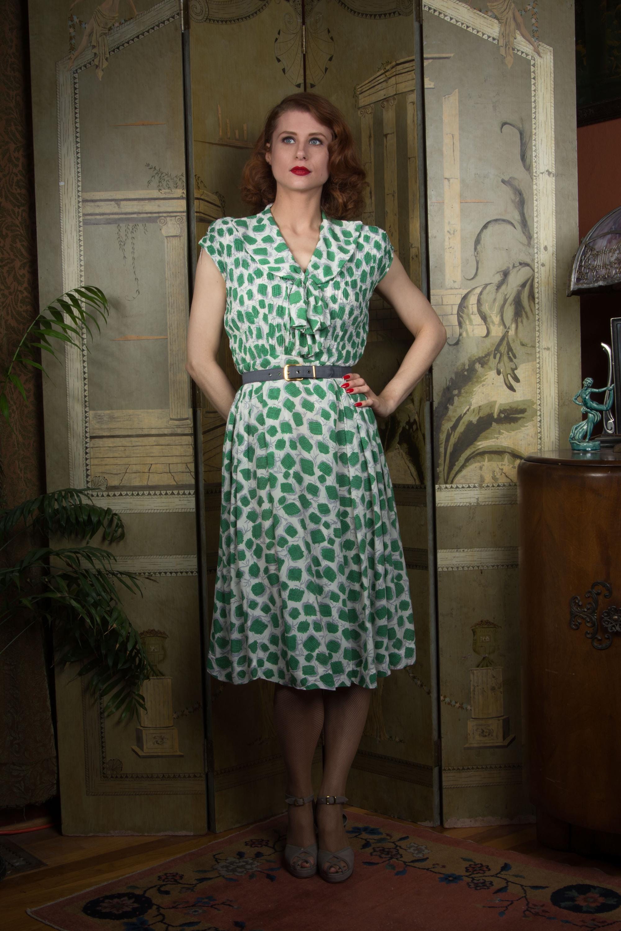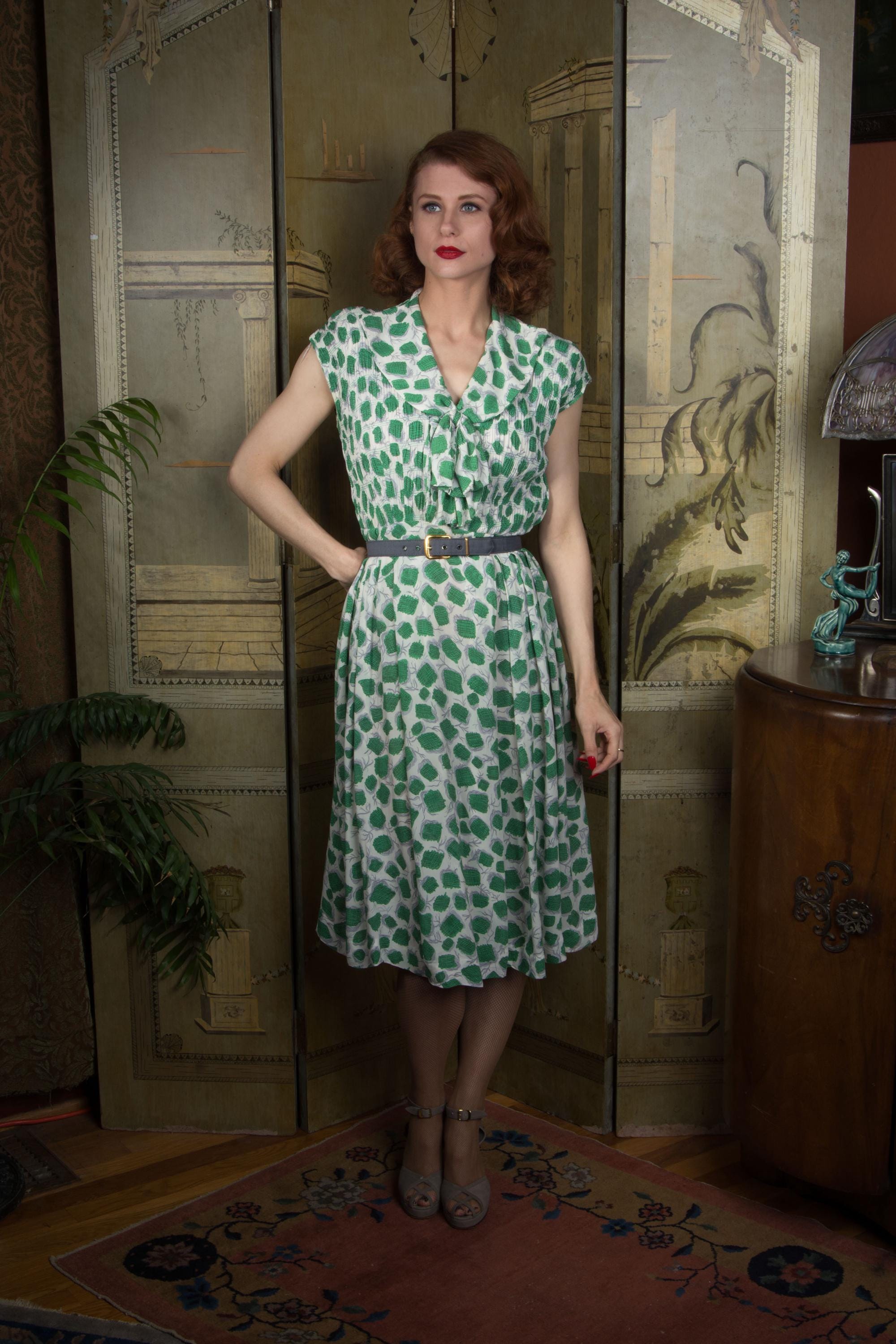A darling mid 1940s dress in breezy bemberg rayon. This cutie features an abstract print in kelly green and grey on a white ground. It has light shoulder pads. The details and textures are terrific - the bodice is shirred with emerald green rows of thread, shoulder to waist. The skirt is flat at the center front, pleated at the sides, and cut on the bias at the back. This closes up the back with a metal zipper. This closes on the side with a metal Serval zipper.