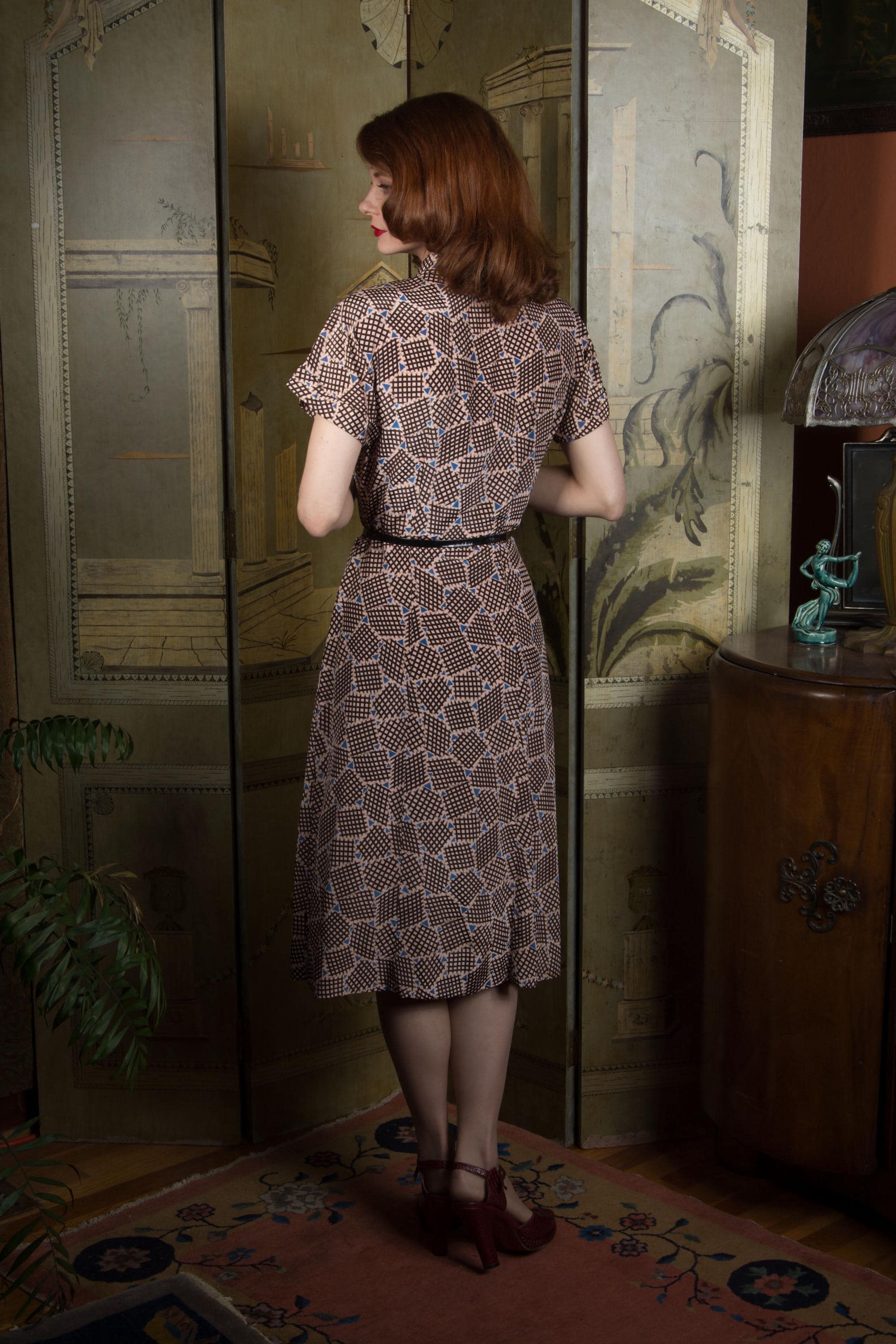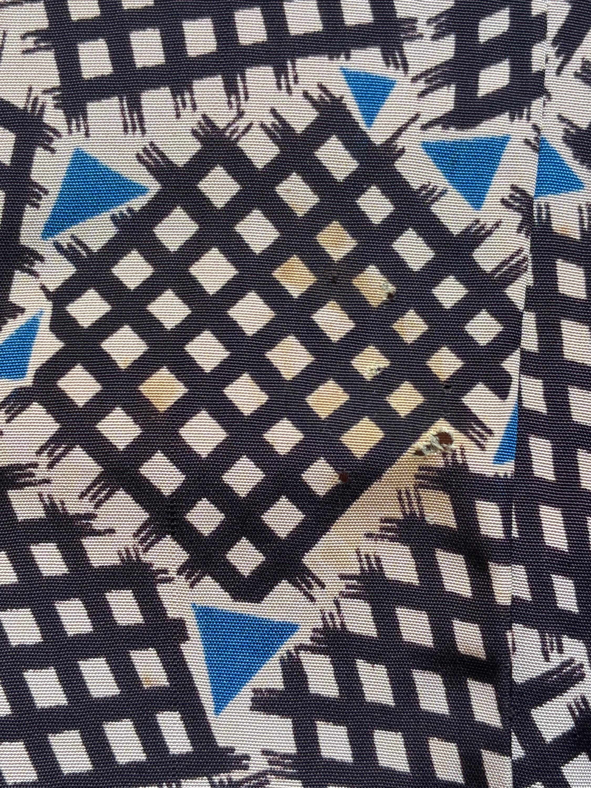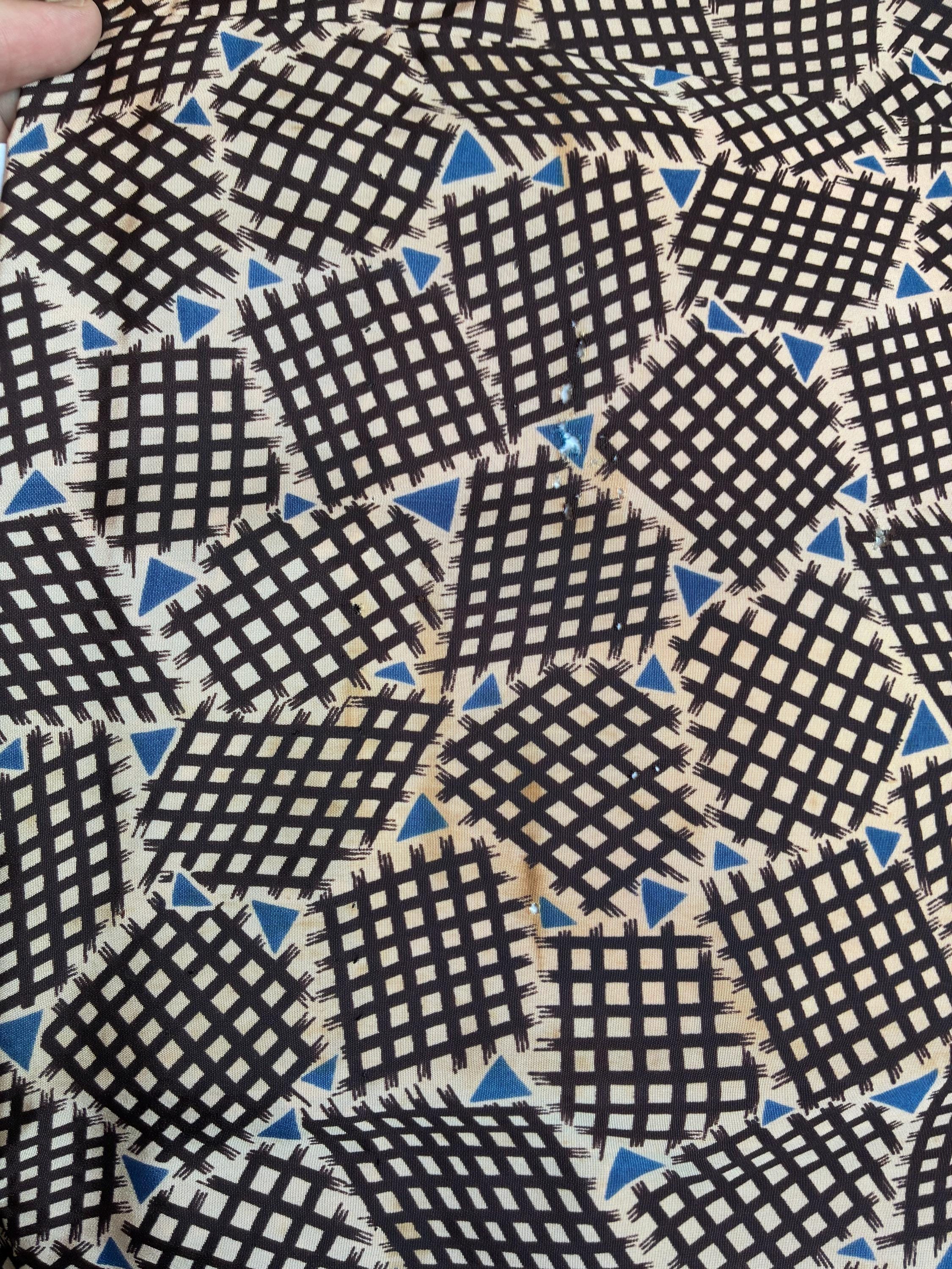 Here's a very smart early 1950s Mode o'Day button front frock. It's a sturdy wounded bird - one of those pieces with flaws that sound worse than they wear. It's a heavier acetate or acetate blend, printed with black checkerboards and little blue triangles. The collar is small, the sleeves are short, and the skirt is pleated. It closes down the front with black velvet buttons and has narrow belt loops so you can pair with your own skinny belt.