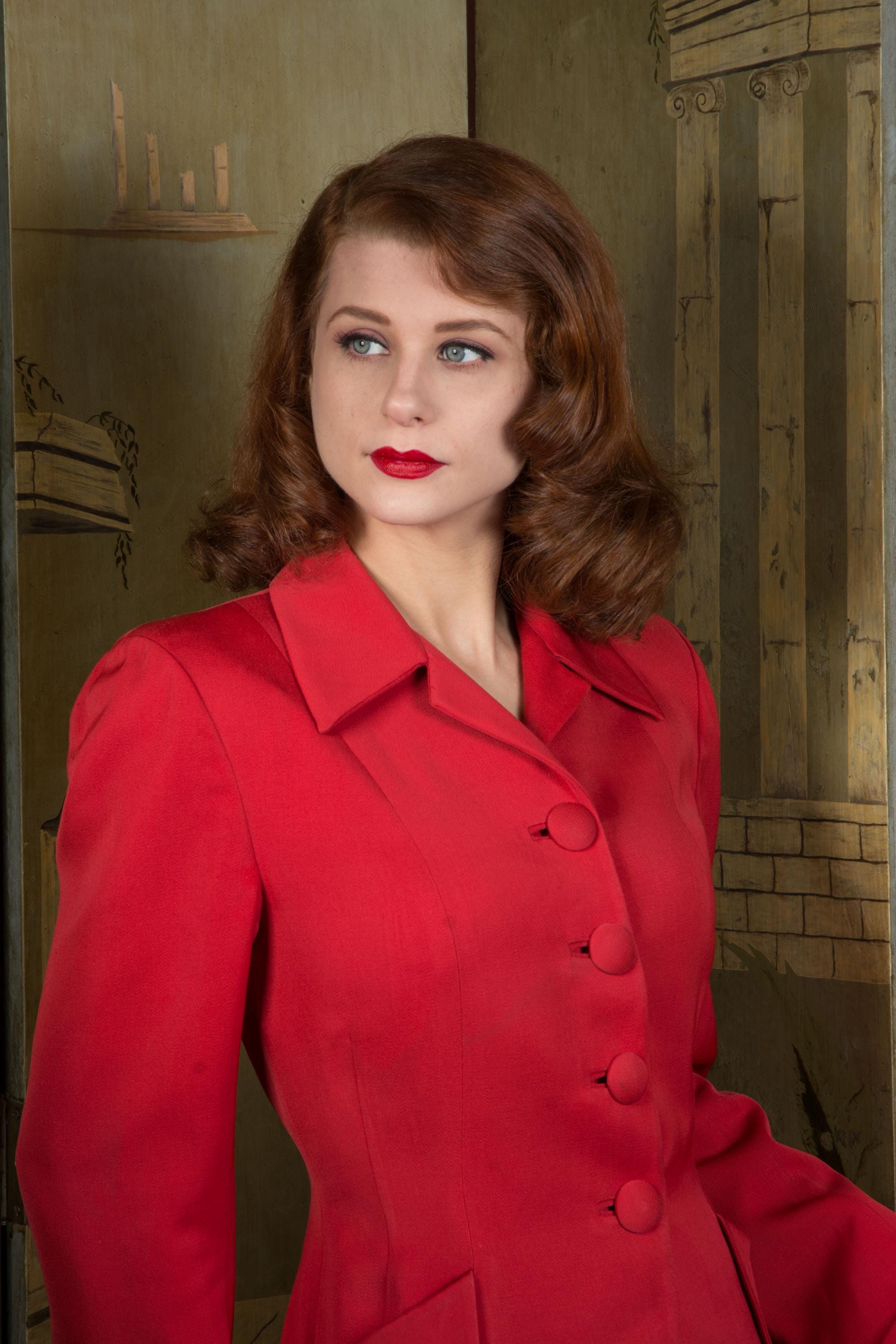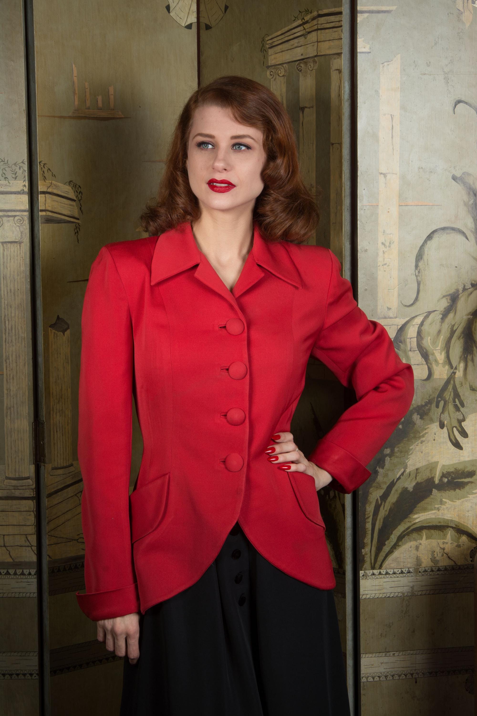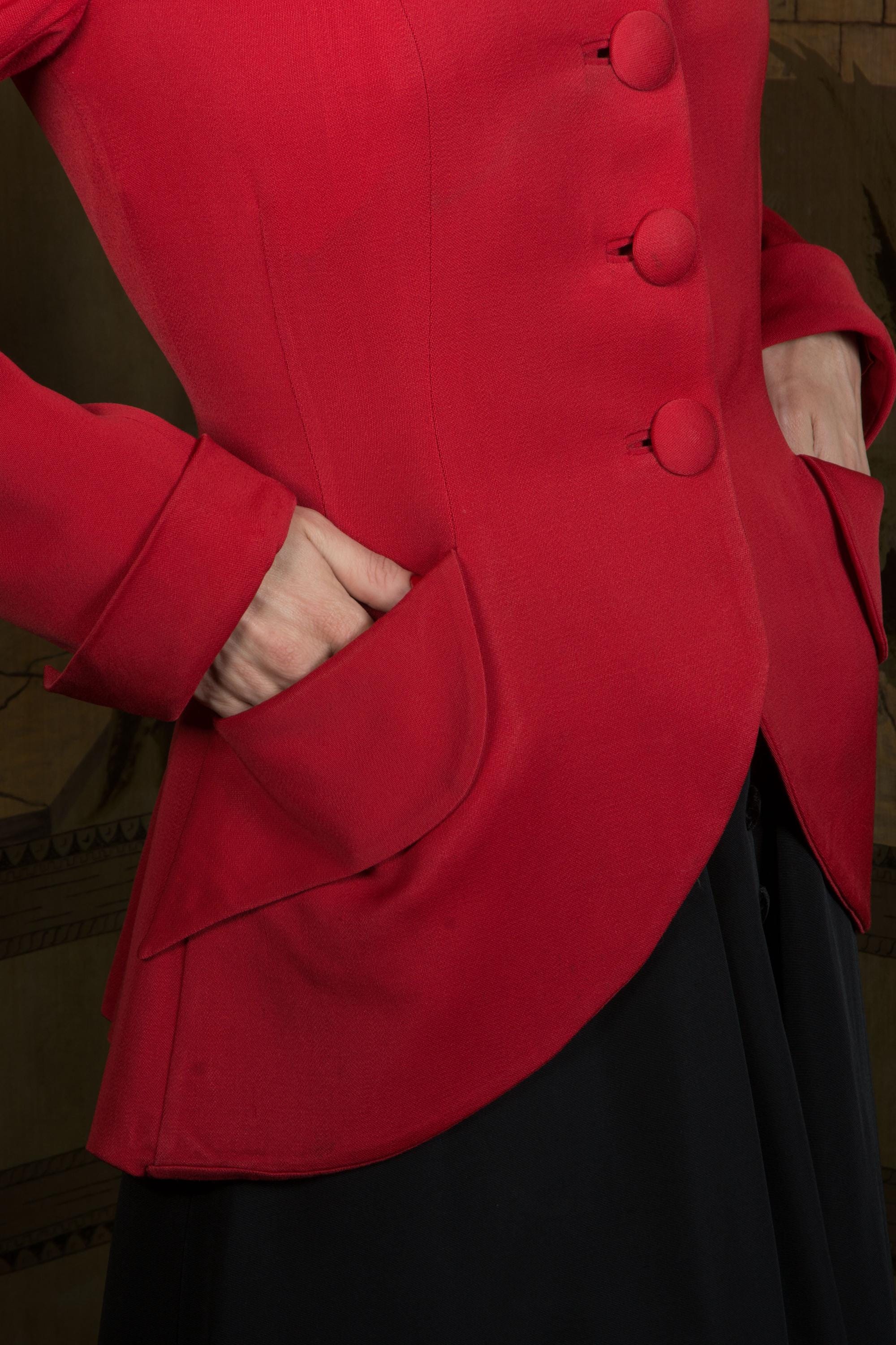 This vintage 1940s tailored jacket is the perfect topper to a bold ensemble. Made of a vibrant lipstick red wool gabardine, this piece is bound to catch some eyes. Crisp but not overly thick structured shoulder pads set the silhouette above sharp lapels. Smart piecing and long darts shape the jacket to the waist - and at the back the jacket lengthens, peplum style, and the darts open to pleats. The hip pockets are shallow, but have dramatic flaps that lend a bit of swagger. This closes up the front with large self-fabric buttons. It is fully lined in red satin. A very smart, sporty piece that will pair well over skirts, frocks or trousers.