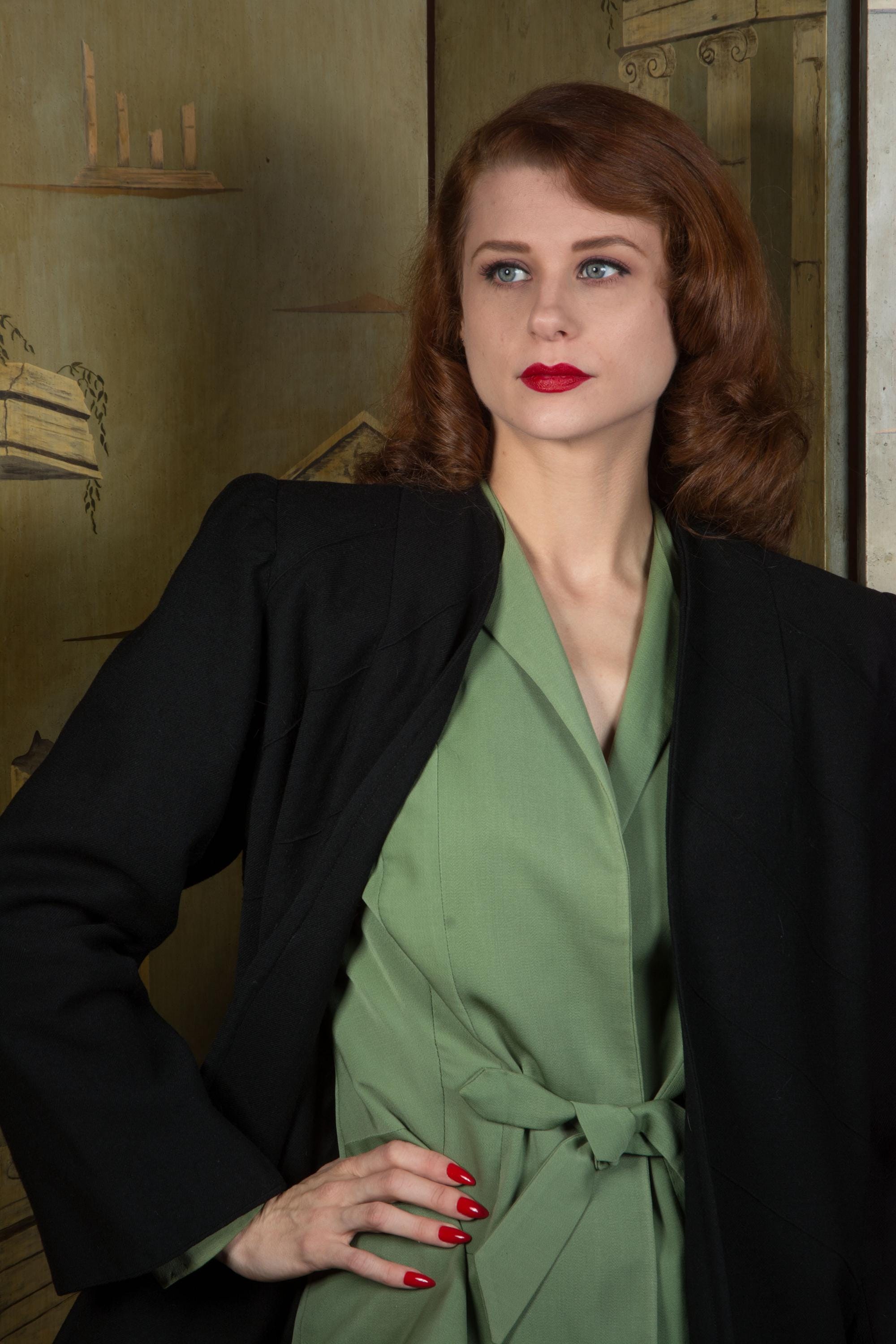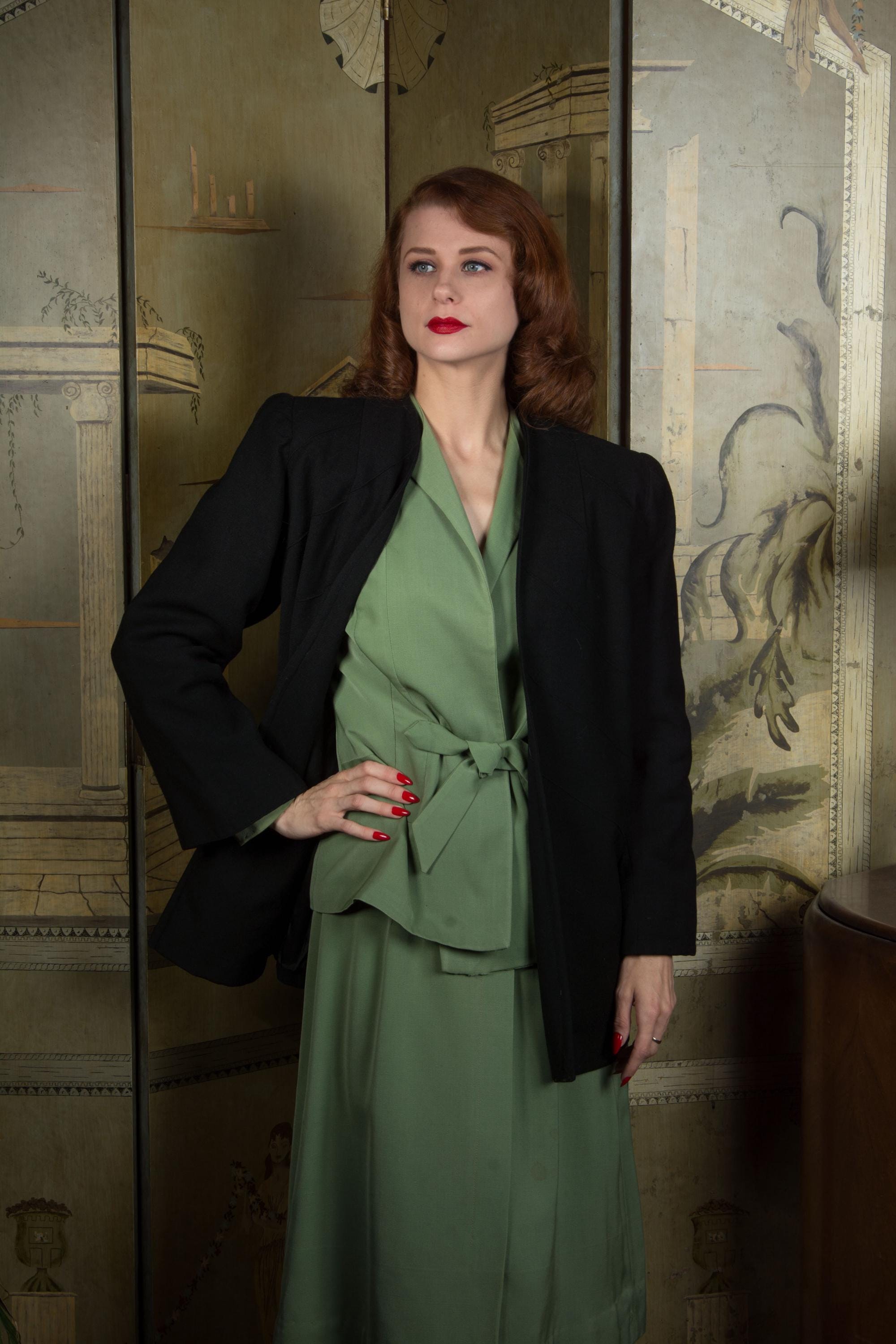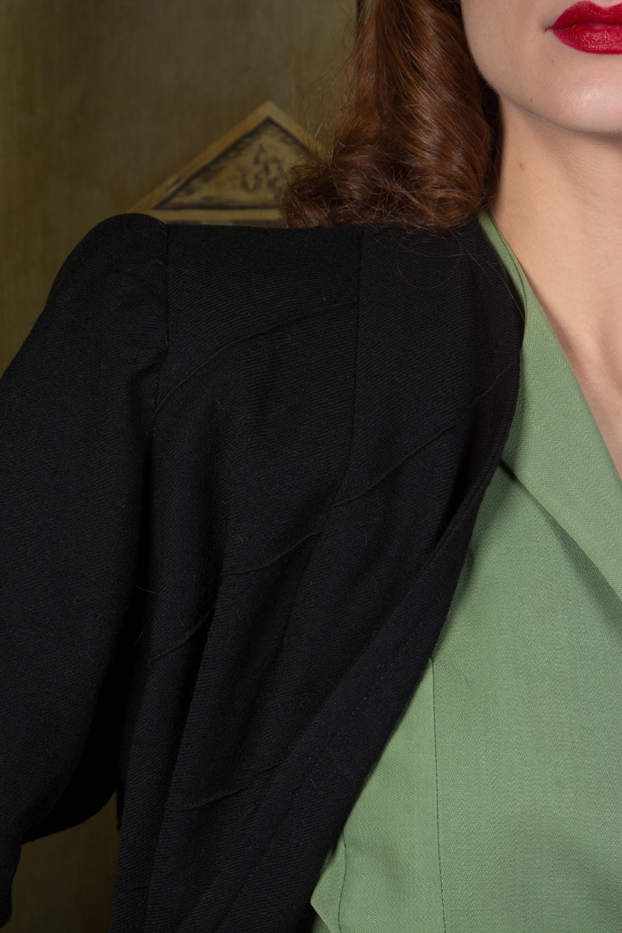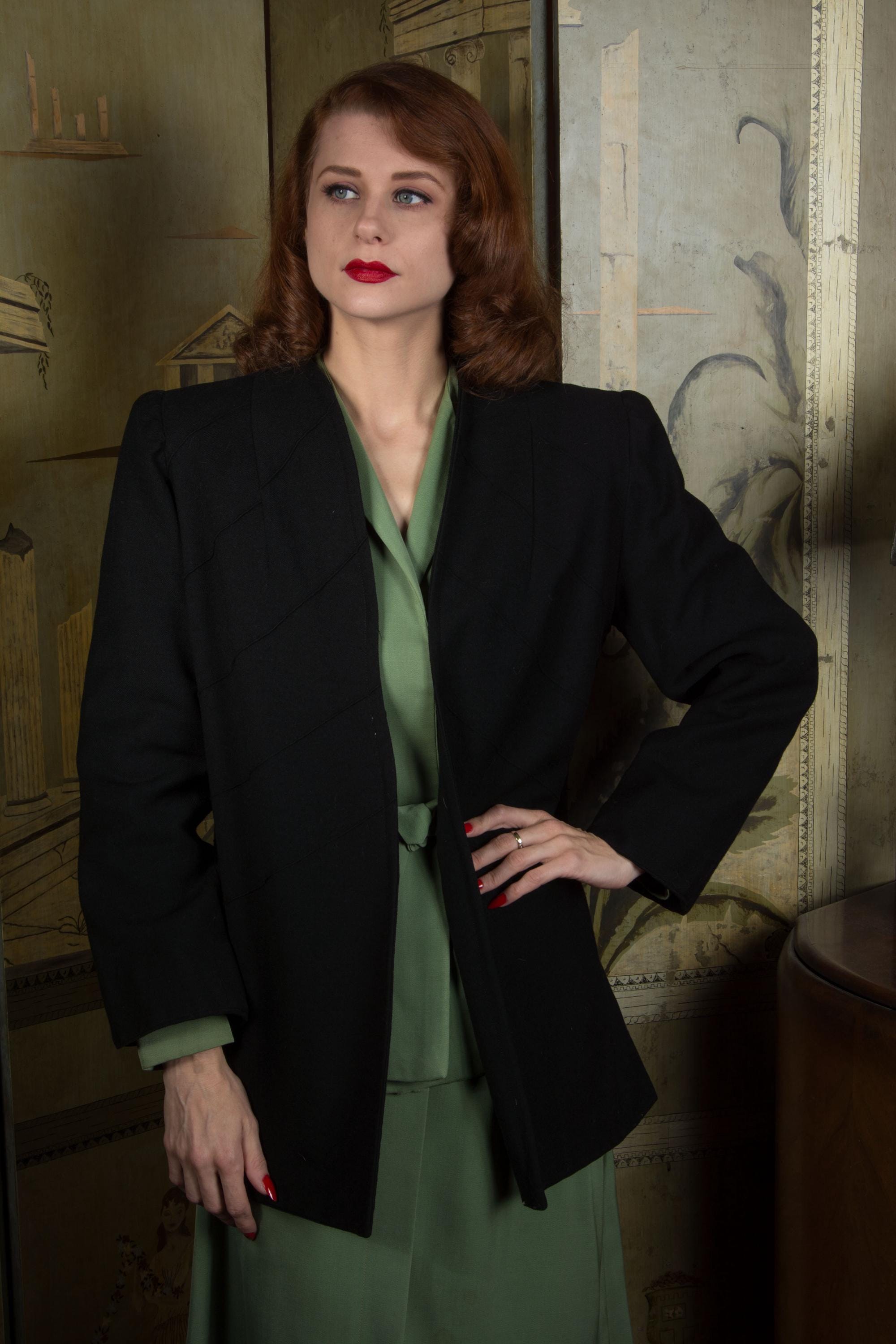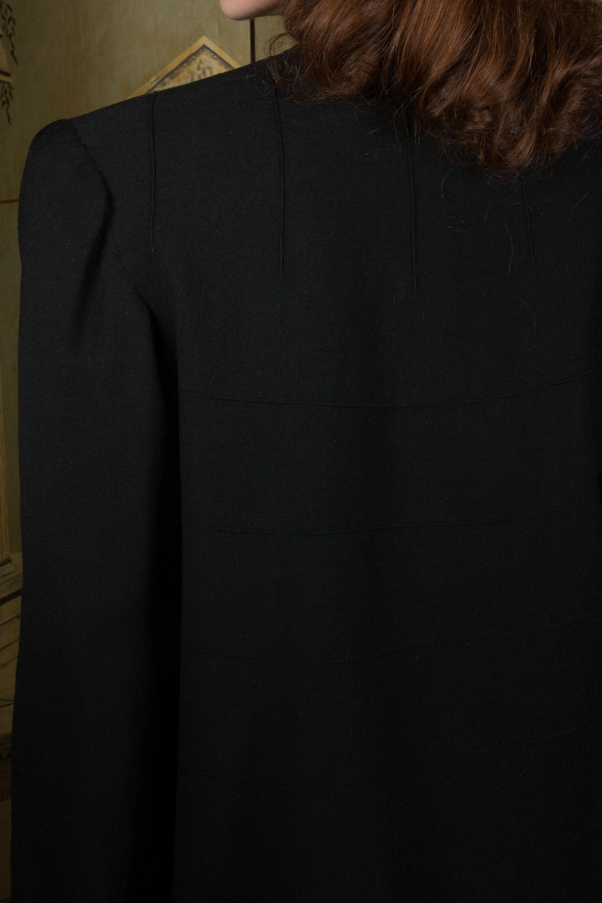 Here's a gorgeous 1930s separate - simple, versatile and beautifully detailed. Made of a black worsted wool, it is pintucked both front and back in long, fine lines. The shoulders are padded, creating a crisp silhouette. The sleeves are wide. A perfect additional to a sporty 1930s ensemble, as easy to pair with trousers as a dress. It's fully lined with a black celanese.