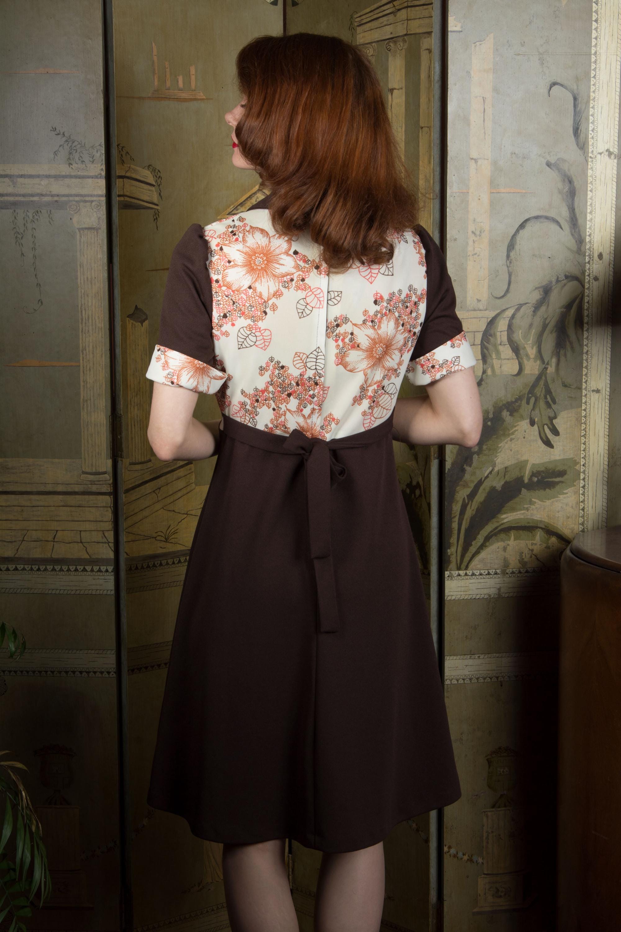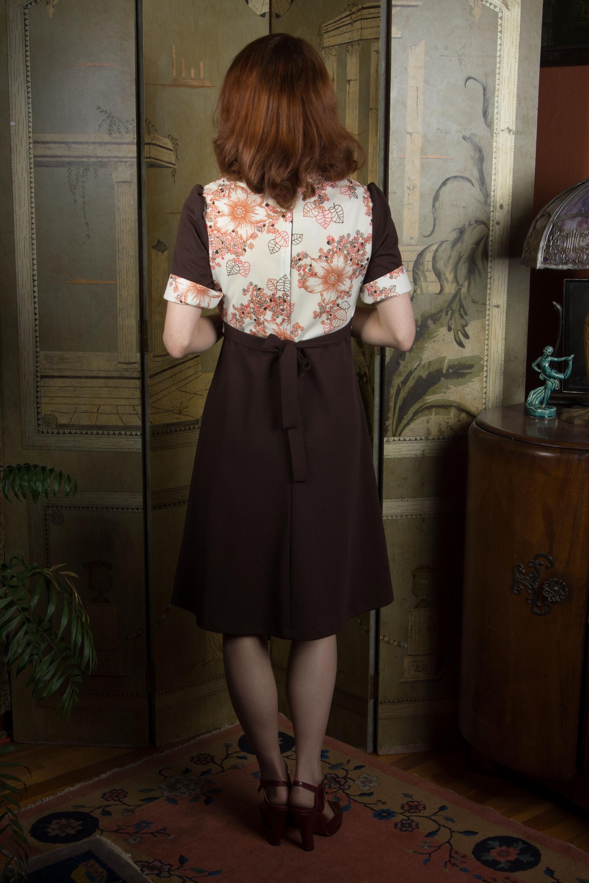 It's outside my usual eras, but something about this cute 1970s dress caught me, so I picked it up on a whim, and was delighted to find that it was made in the U.K! A typical polyester knit, it mixes solid chocolate brown with a bodice panels in a autumnal leaf and flower print. This has puffed short sleeves, a wide collar, divided bust and a-line skirt. Attached self-fabric ties make a bow at back, over the long rear nylon zipper.