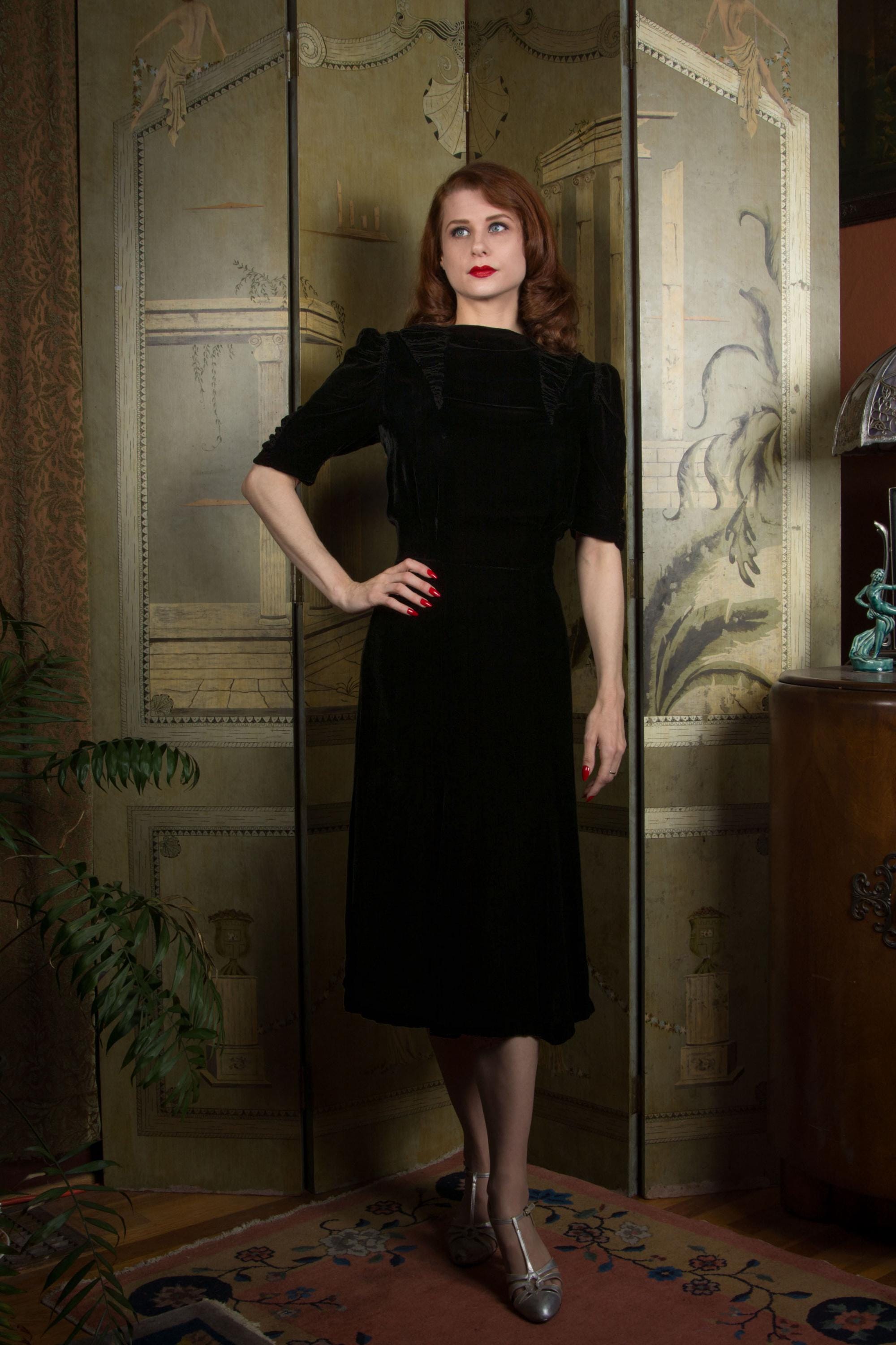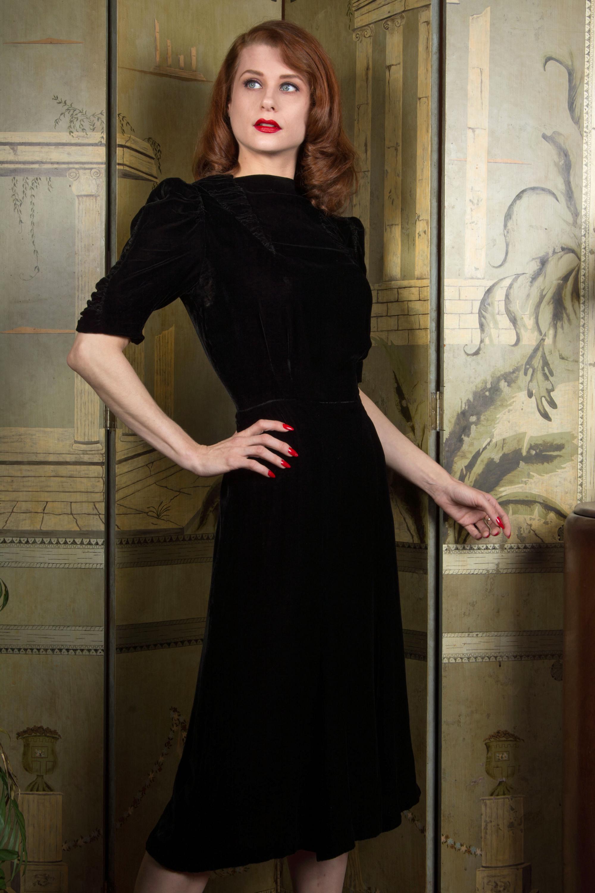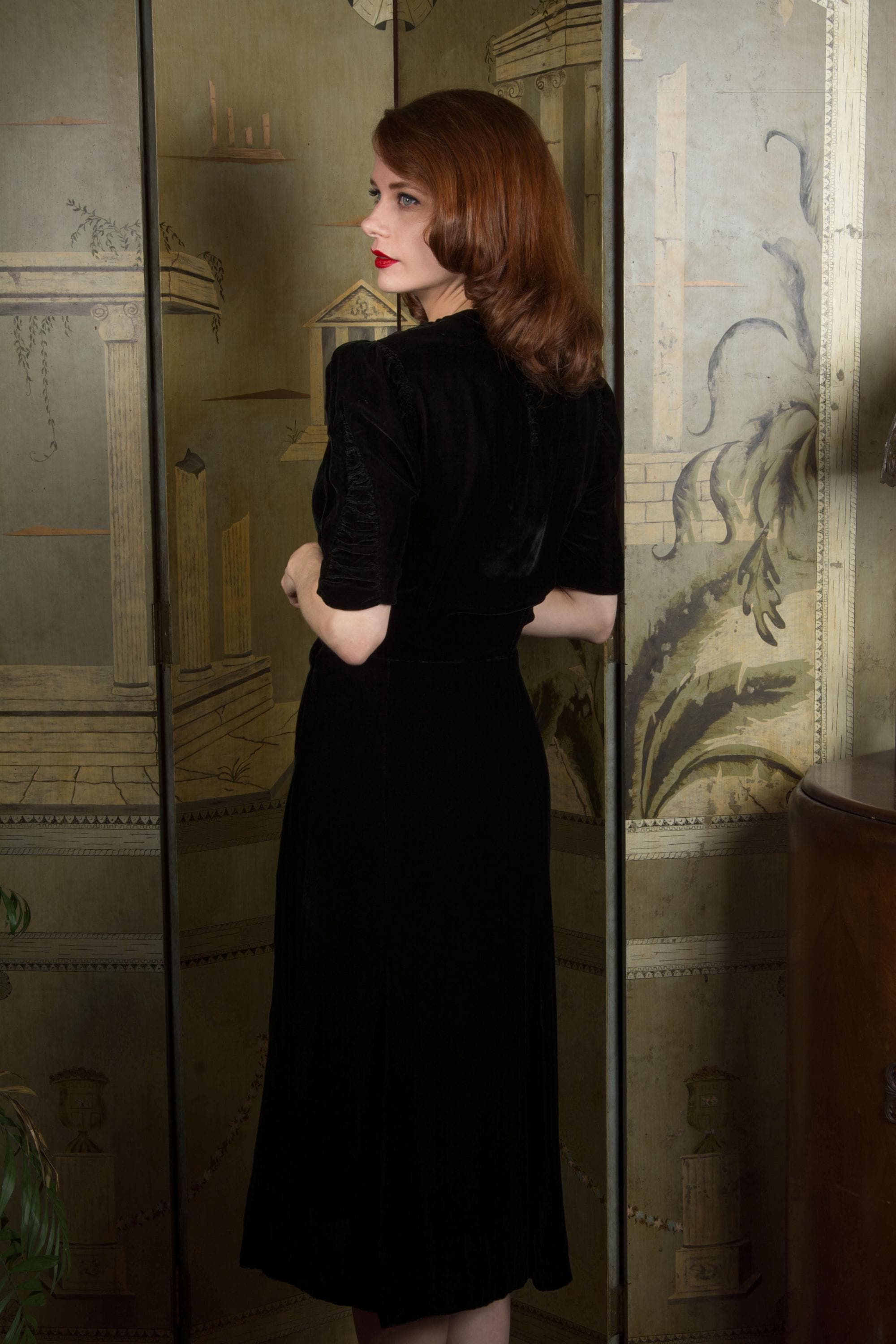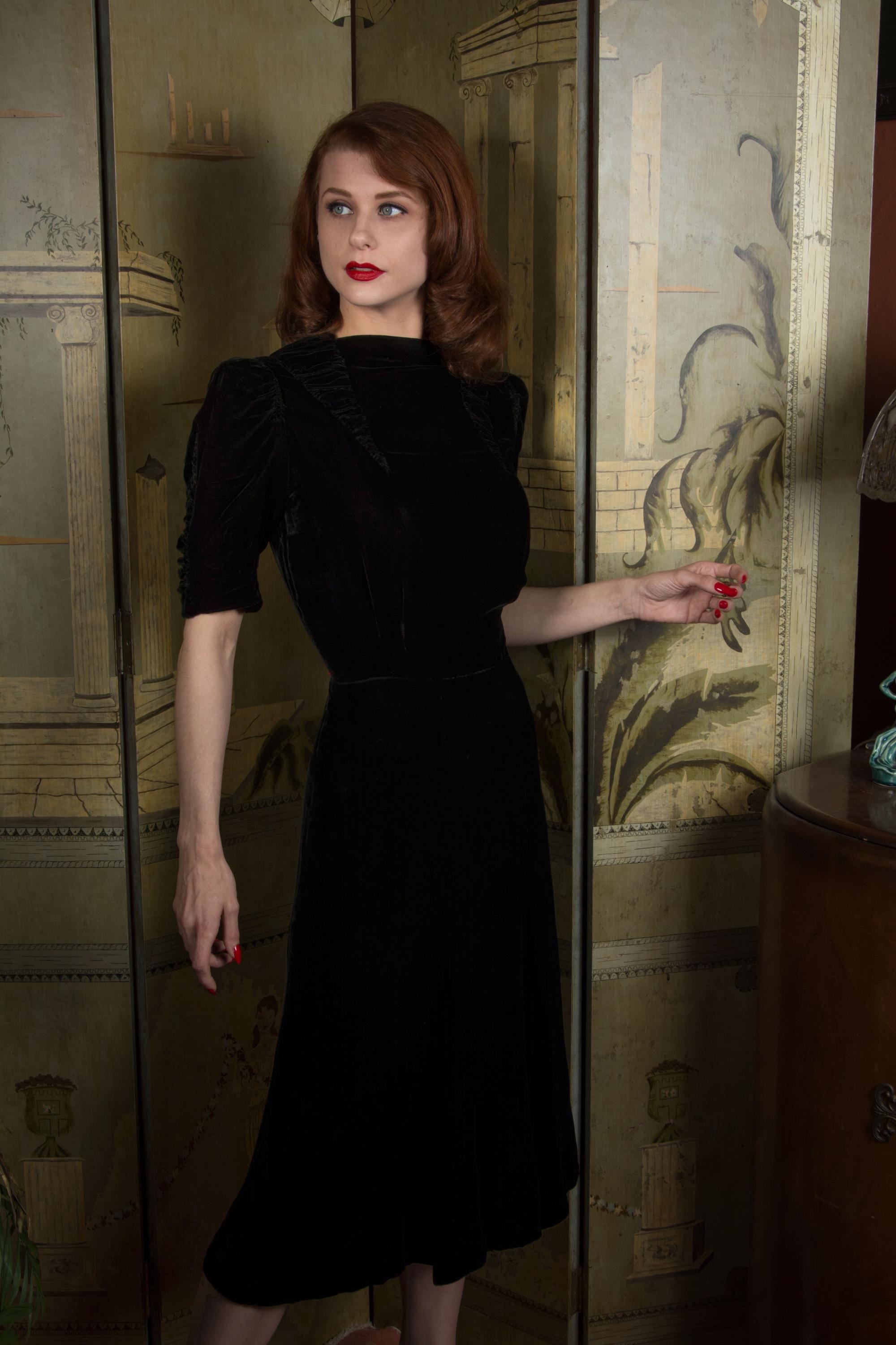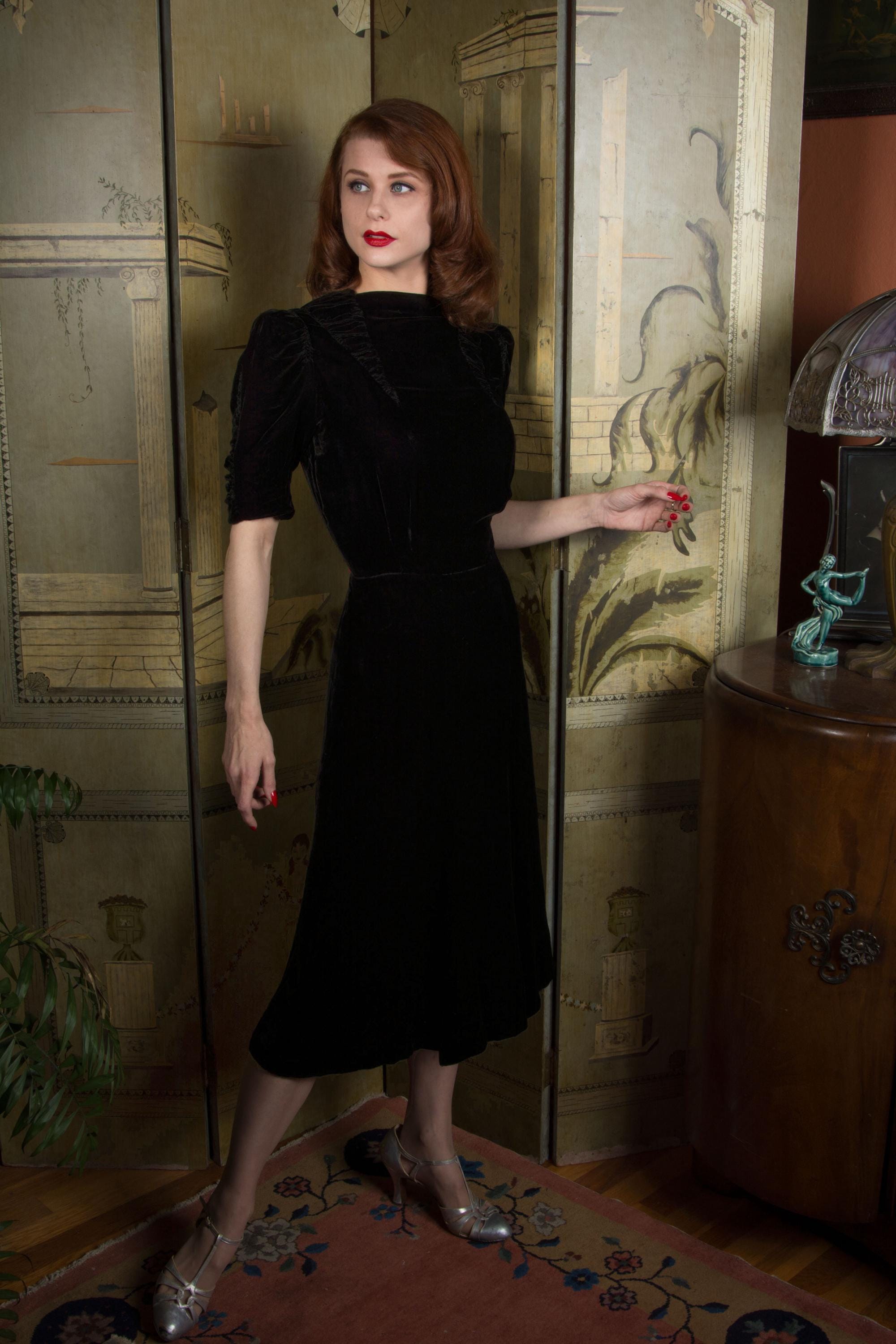 Vintage late 1930s dress is exquisite in a dense, soft rayon velvet. There's fine shirring from each shoulder, and in two cone shapes at the center front, working together to create a fabulously draped bodice. The sleeves are half length and puffed with a gather at the top, with a sleeve header for that perfect peaked shape. The sides of the sleeves have upturned cones that echo the downturned details at the yoke. The skirt is made of 6 gores that have a little extra flare to the hem for the perfect late 30s shape. This darling dress closes on the side with a sturdy metal Talon zipper and with ten velvet buttons at the back of the neck.