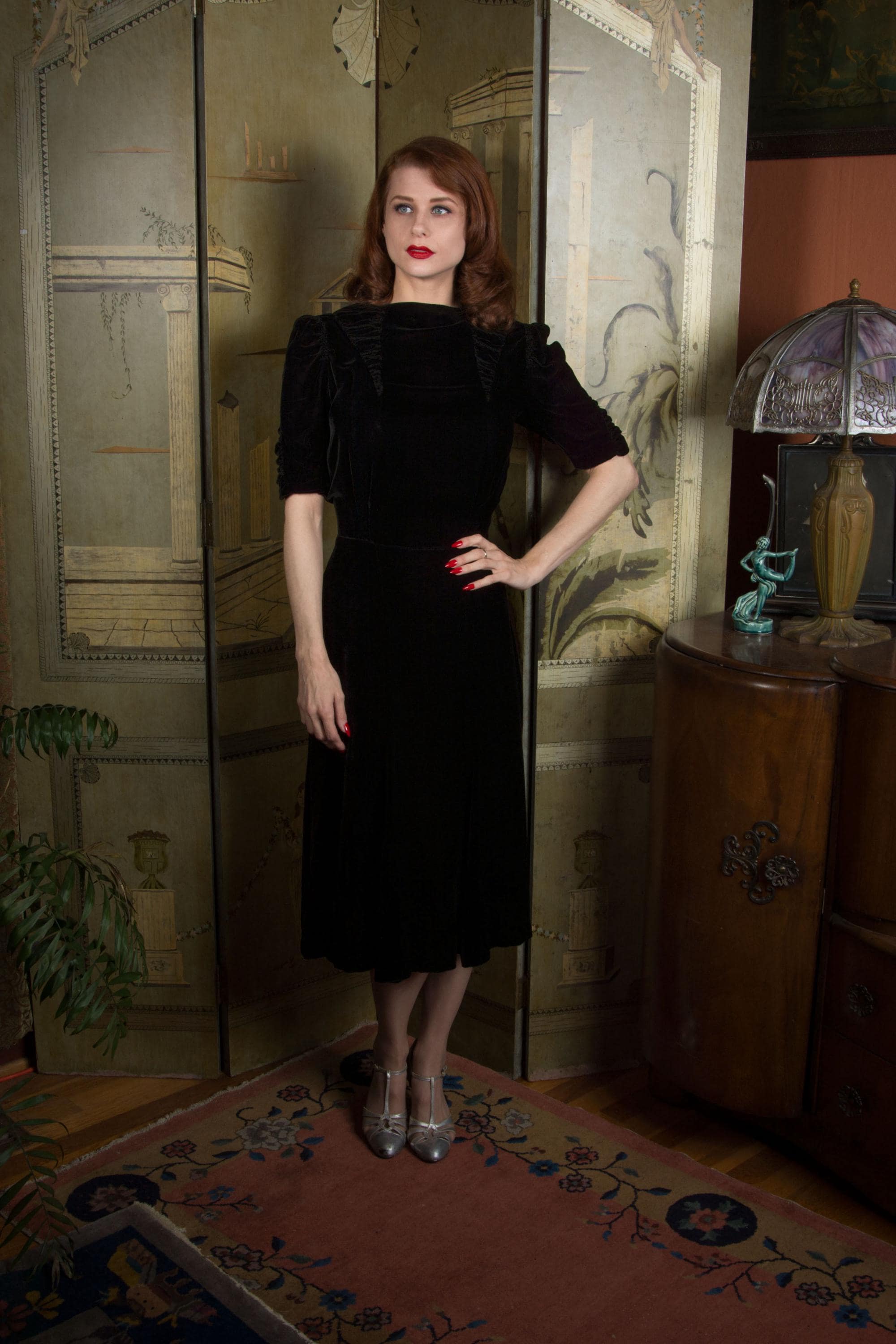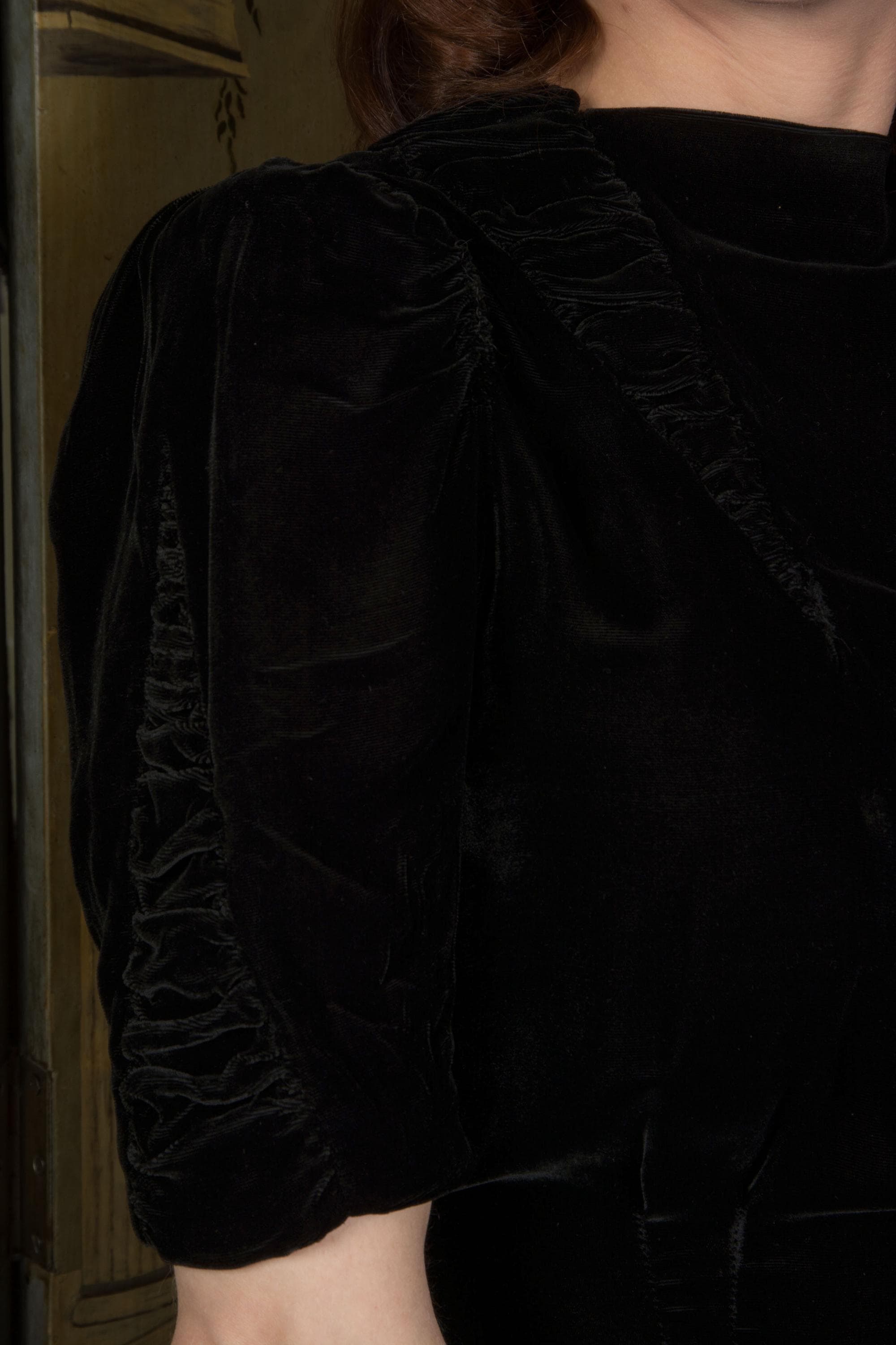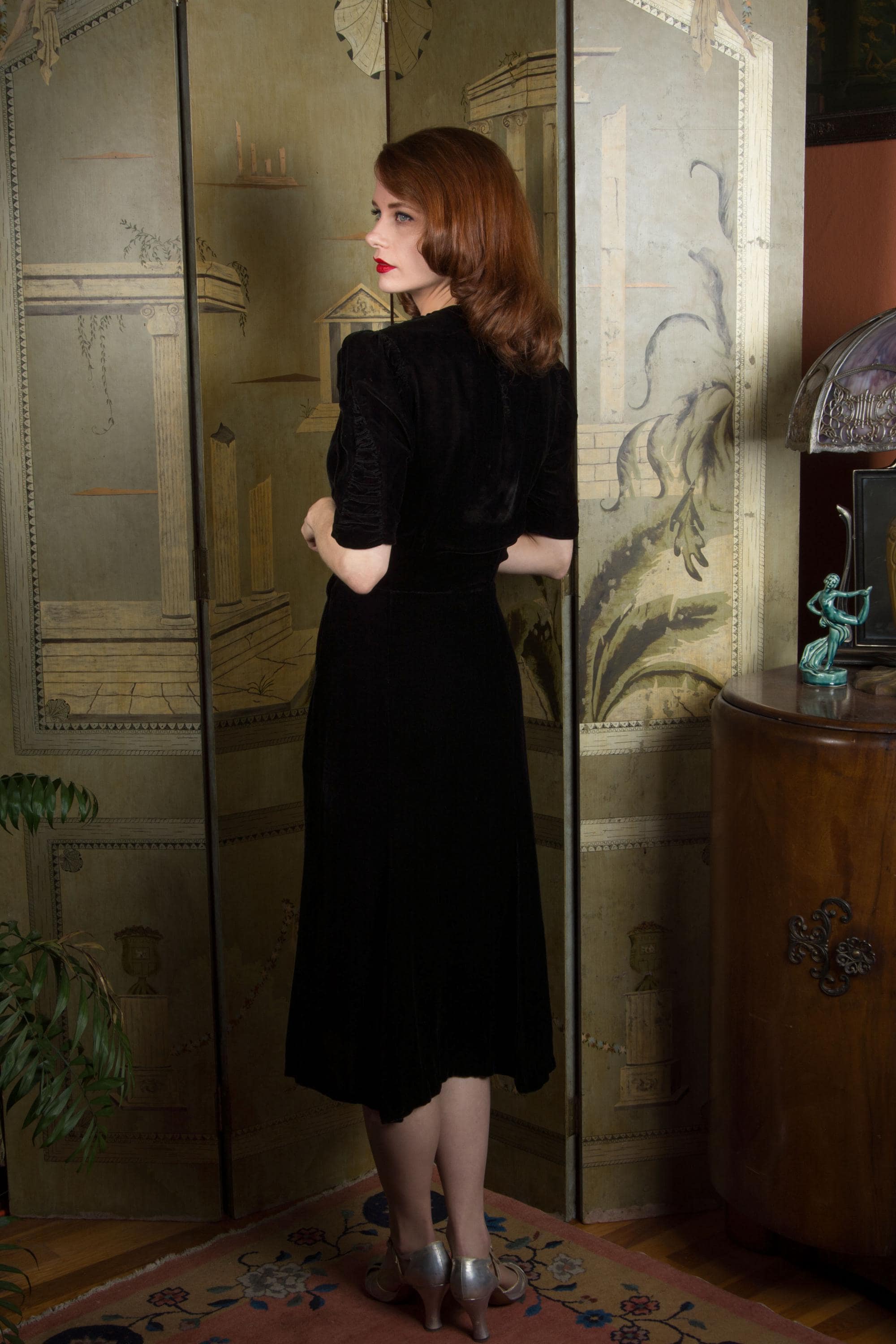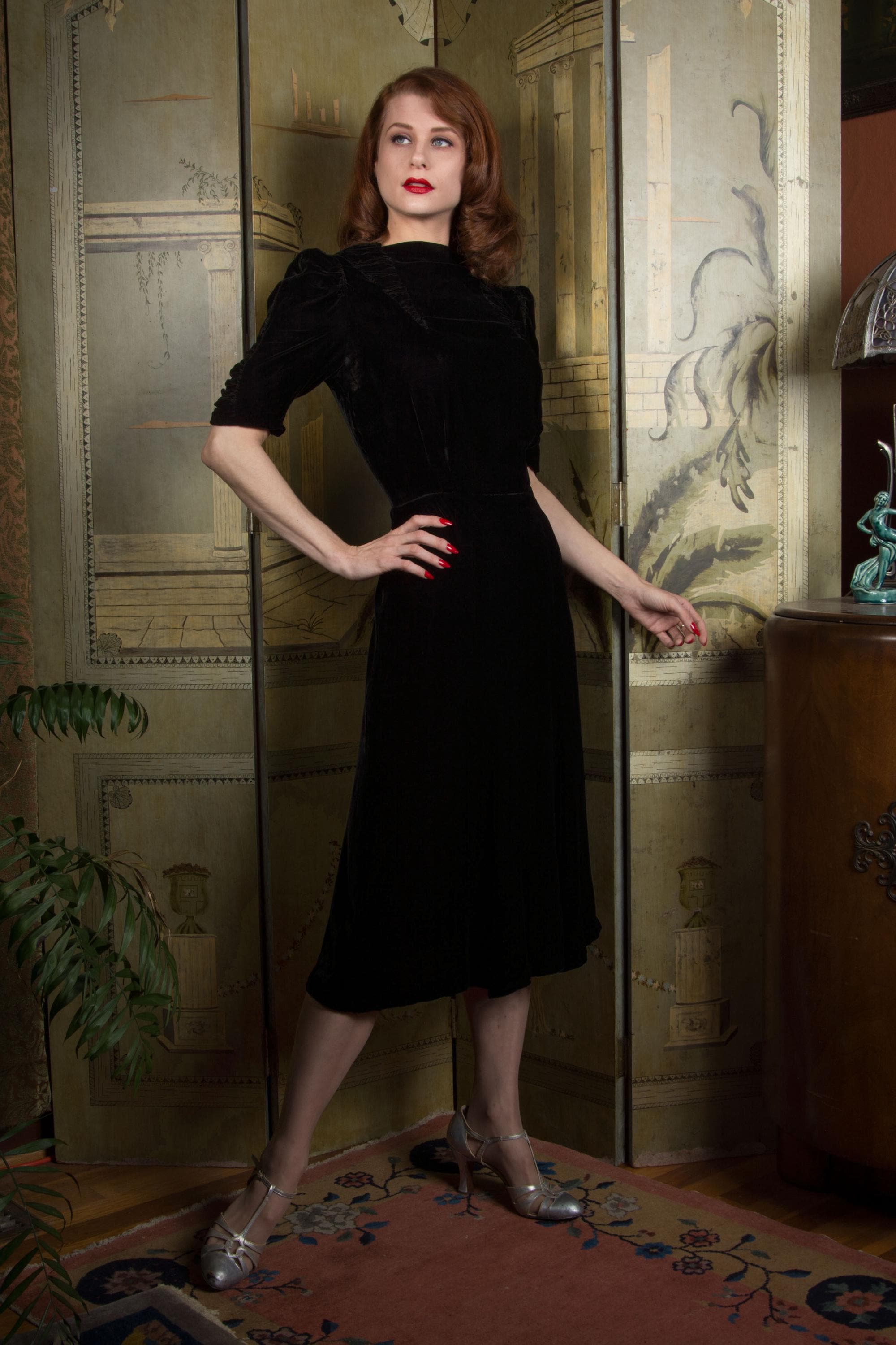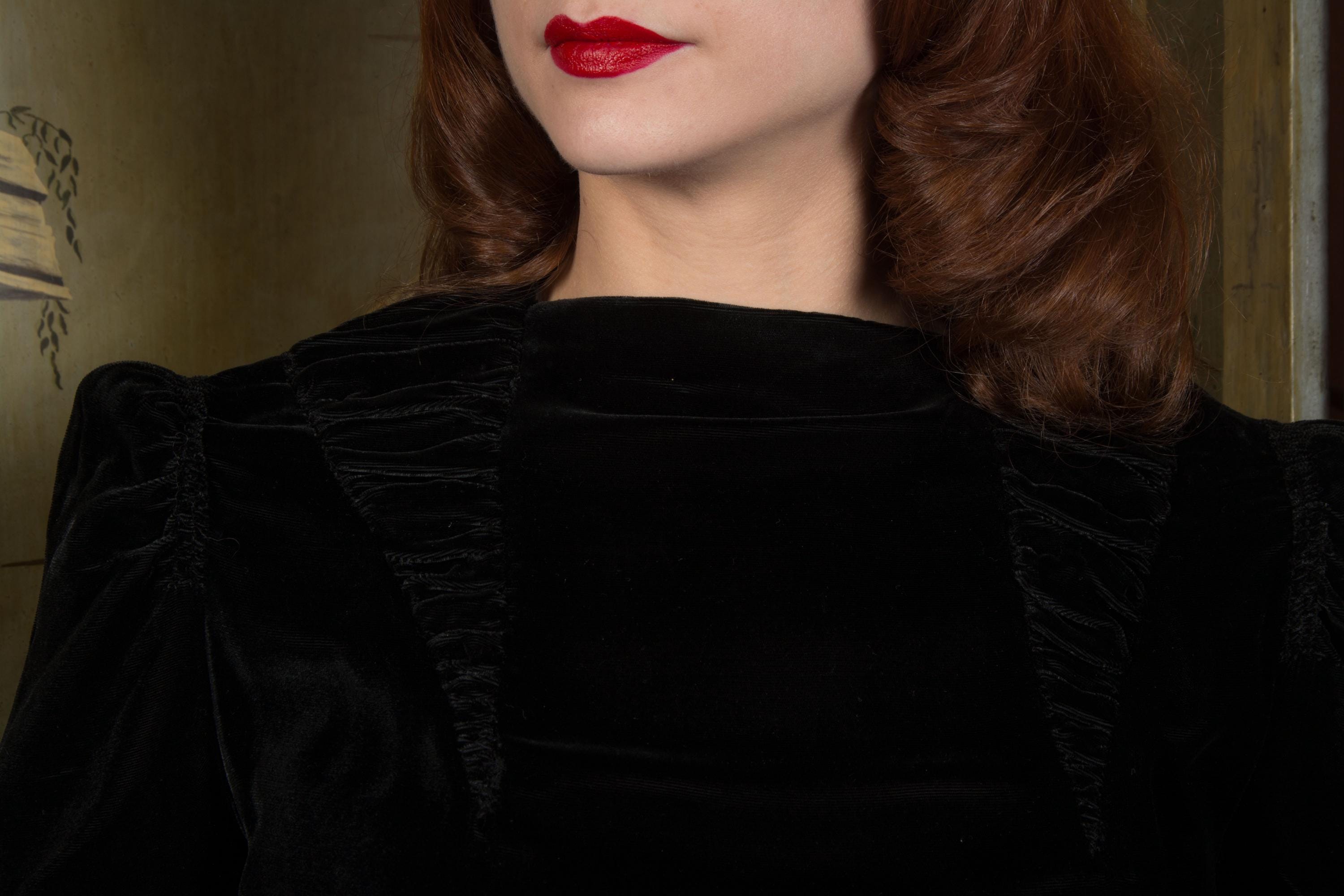 Vintage late 1930s dress is exquisite in a dense, soft rayon velvet. There's fine shirring from each shoulder, and in two cone shapes at the center front, working together to create a fabulously draped bodice. The sleeves are half length and puffed with a gather at the top, with a sleeve header for that perfect peaked shape. The sides of the sleeves have upturned cones that echo the downturned details at the yoke. The skirt is made of 6 gores that have a little extra flare to the hem for the perfect late 30s shape. This darling dress closes on the side with a sturdy metal Talon zipper and with ten velvet buttons at the back of the neck.