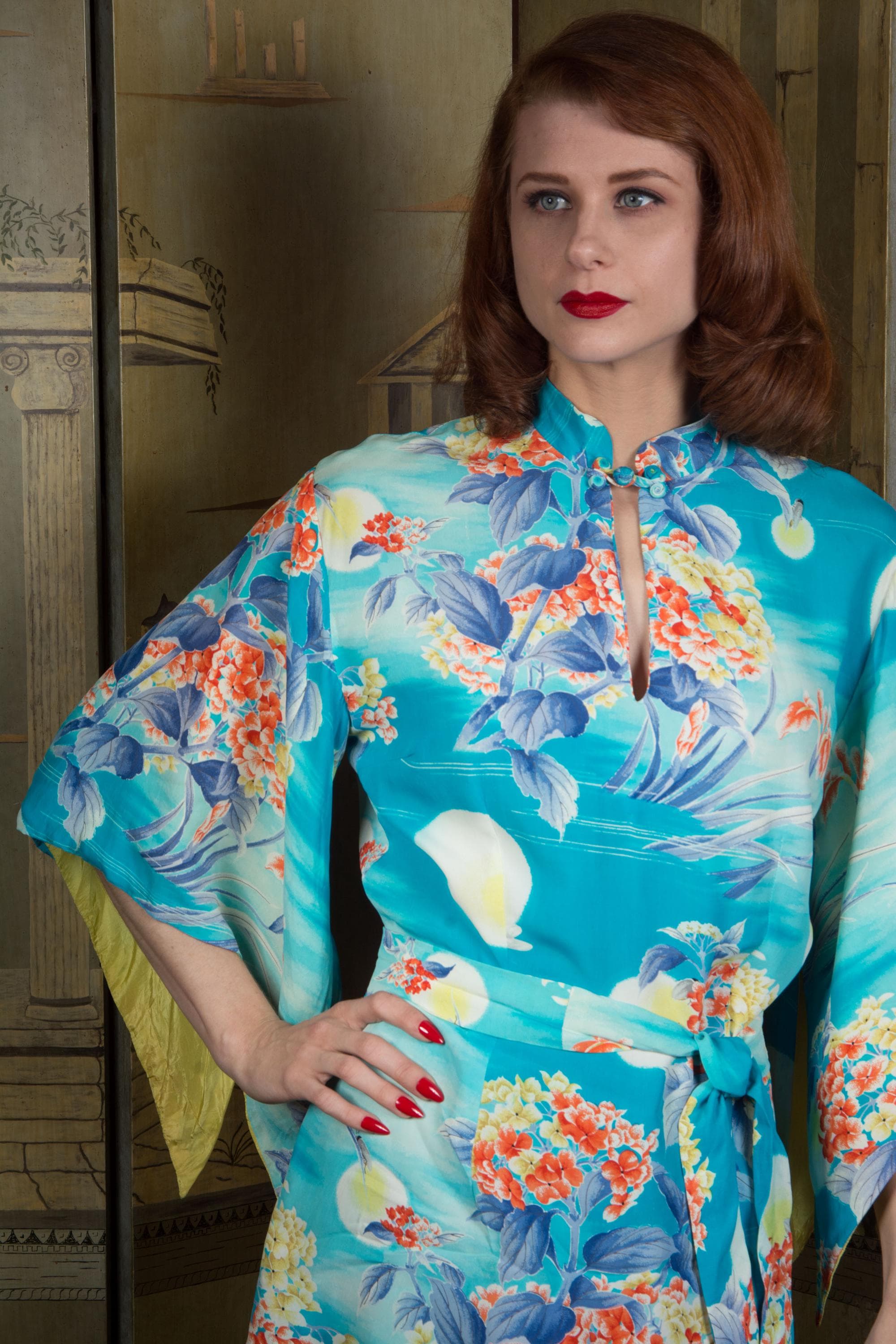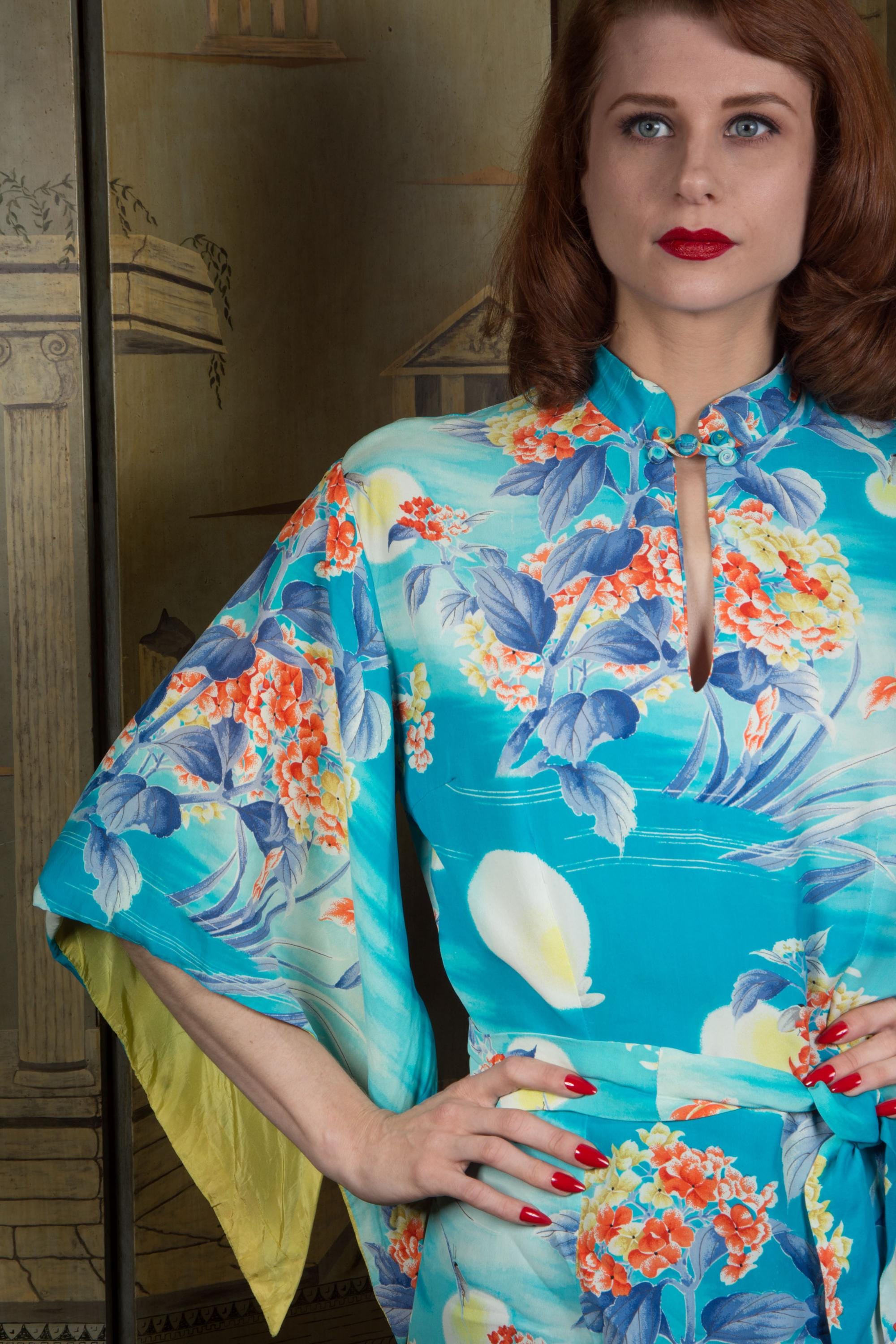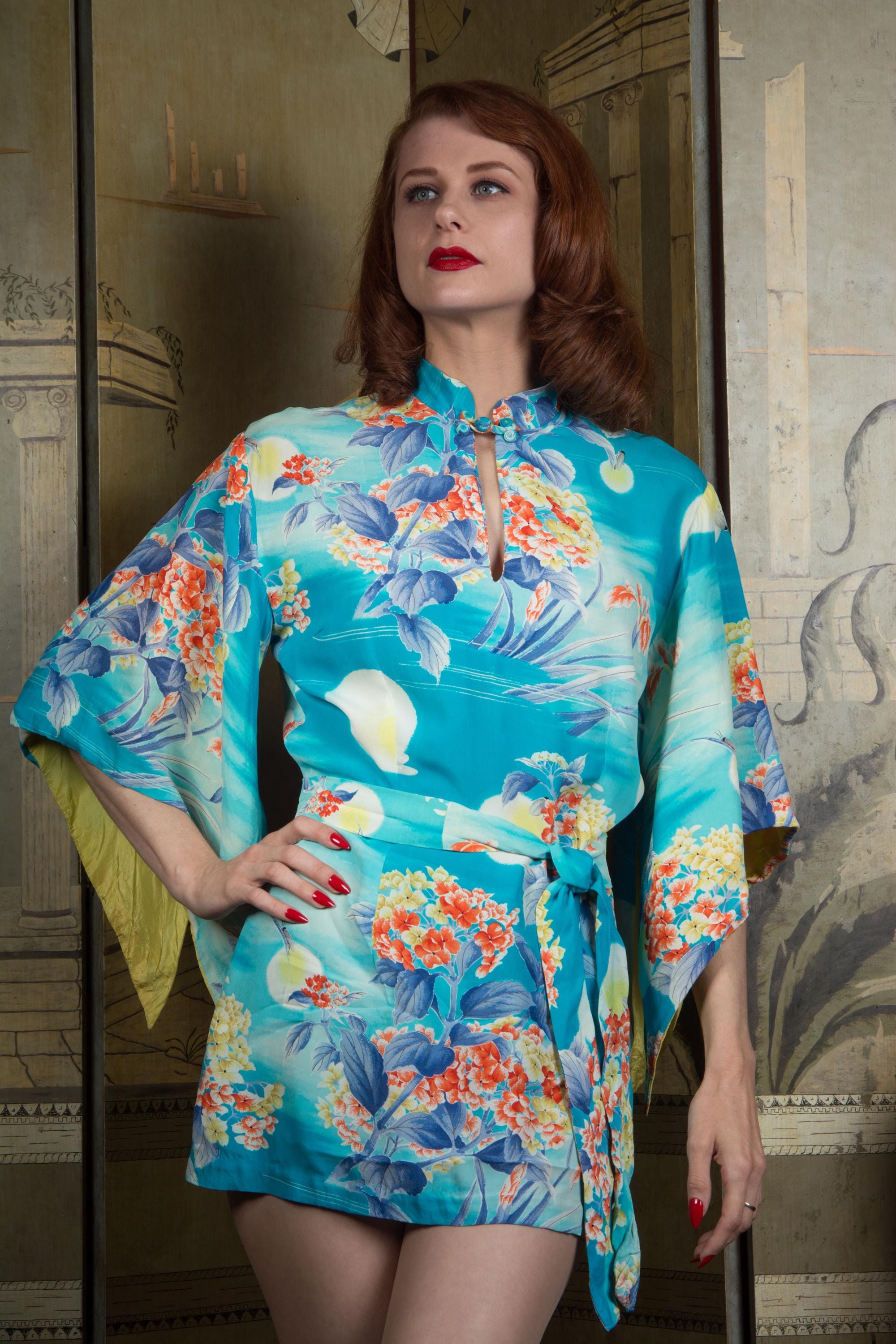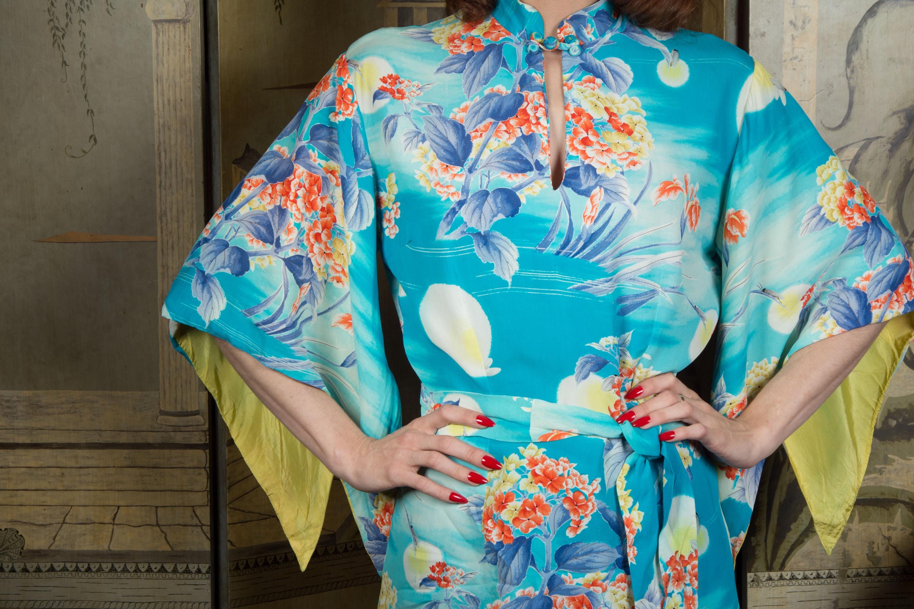 This piece is equal parts absolute banger and tragedy. It's a late 1940s or early 1950s Pake Muu, cropped short, likely in the 1960s or 70s. It isn't what it was, but it is HOT. Made by Hawaiian Surf, it's a stunning rayon crepe in vibrant, saturated turquoise ocean blues, brilliant yellow and orange tempered with olive on crisp white. The signature sleeves are lined with chartreuse acetate. It comes with a self-fabric tie, most likely made from the missing length of skirt. Wear it as a top or mini dress, it slays either way. This closes up the sturdy metal zipper, and has a self-fabric frog closure at the neck.