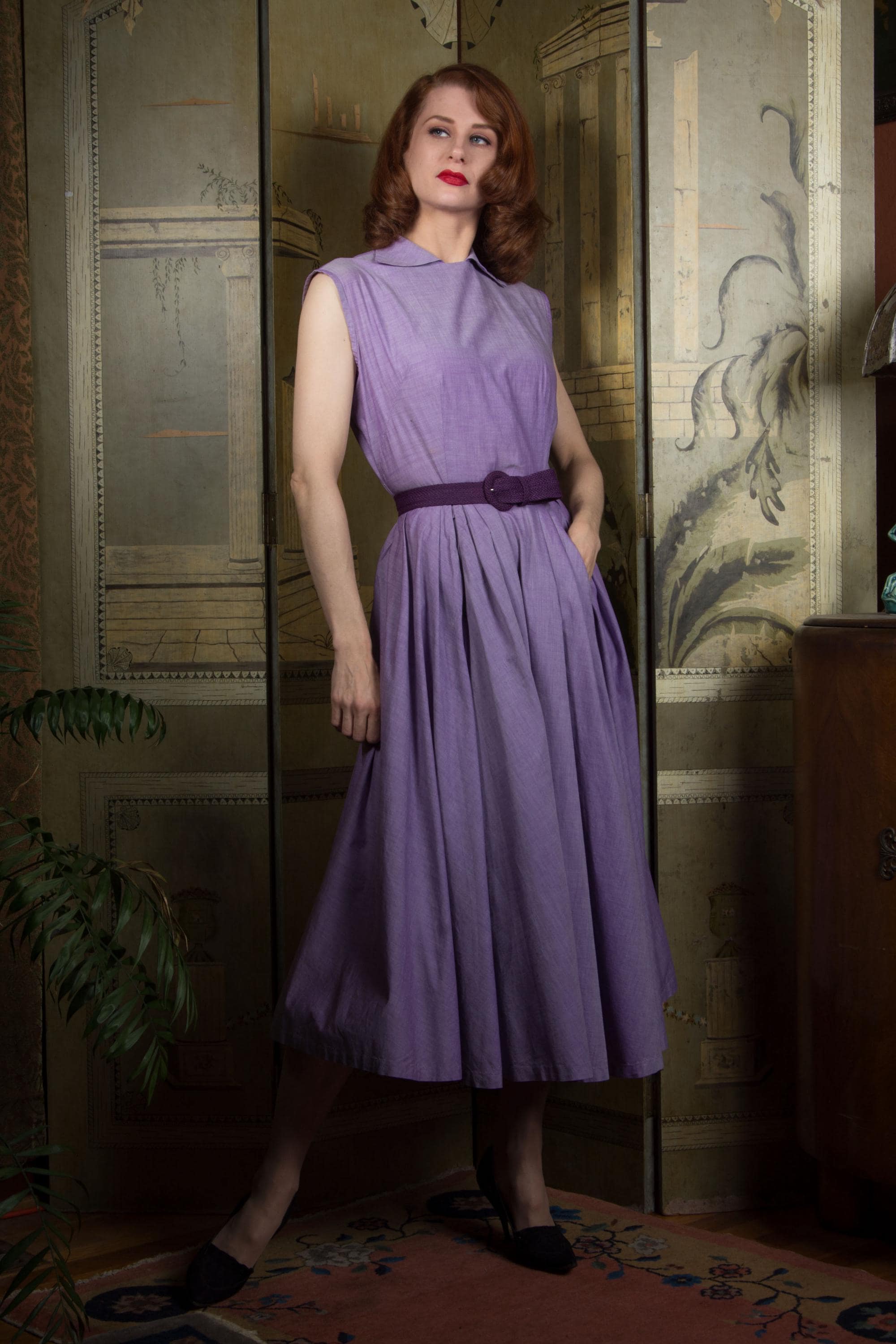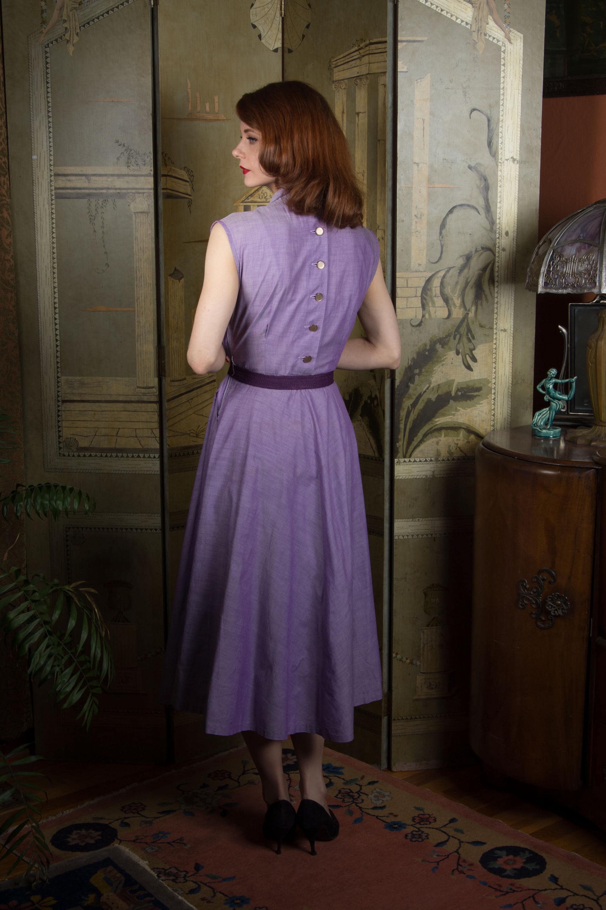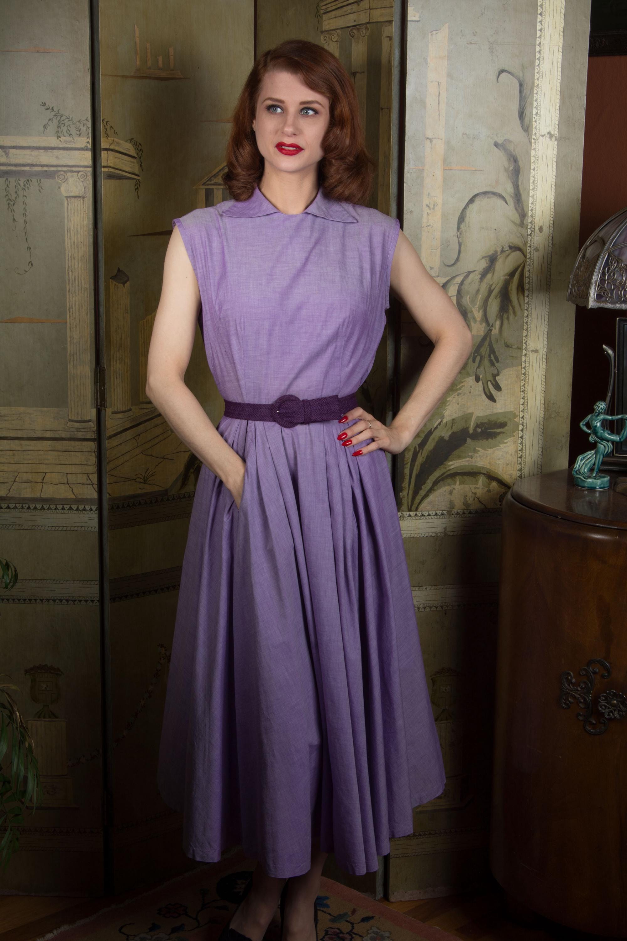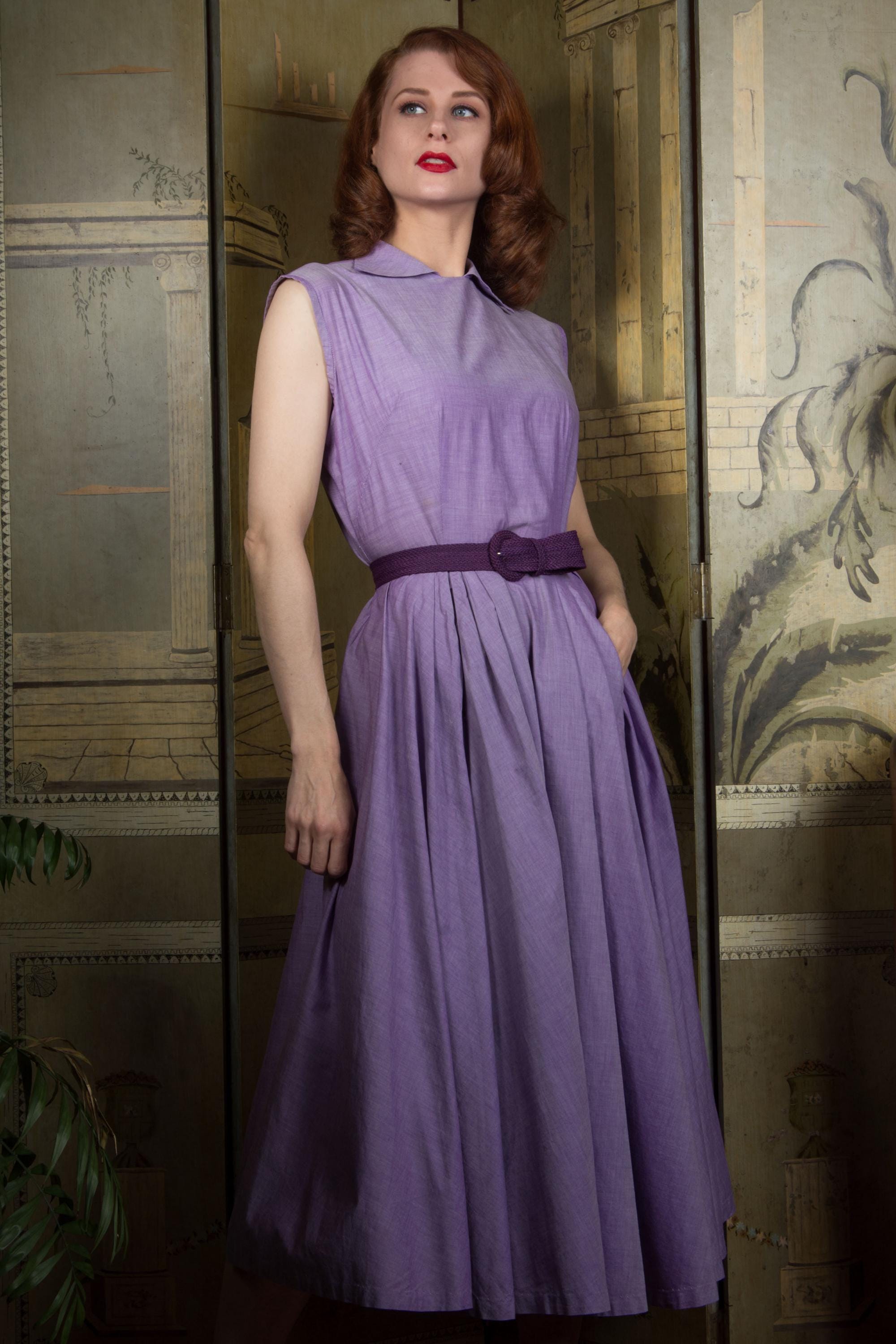 The crisp cotton of this 1950s day dress is an absolutely stunning textile - a lilac woven with white, and it has a subtle changeable effect. The dress is sleeveless, with a high neckline with wide, winged collar. It's made for 1950s foundation wear, with dramatically hourglass proportions. The skirt full cut, pleated through the front with deep front pockets. At the back, it closes with lustrous moonglow buttons. The dress closes on the side with a sturdy metal zipper.