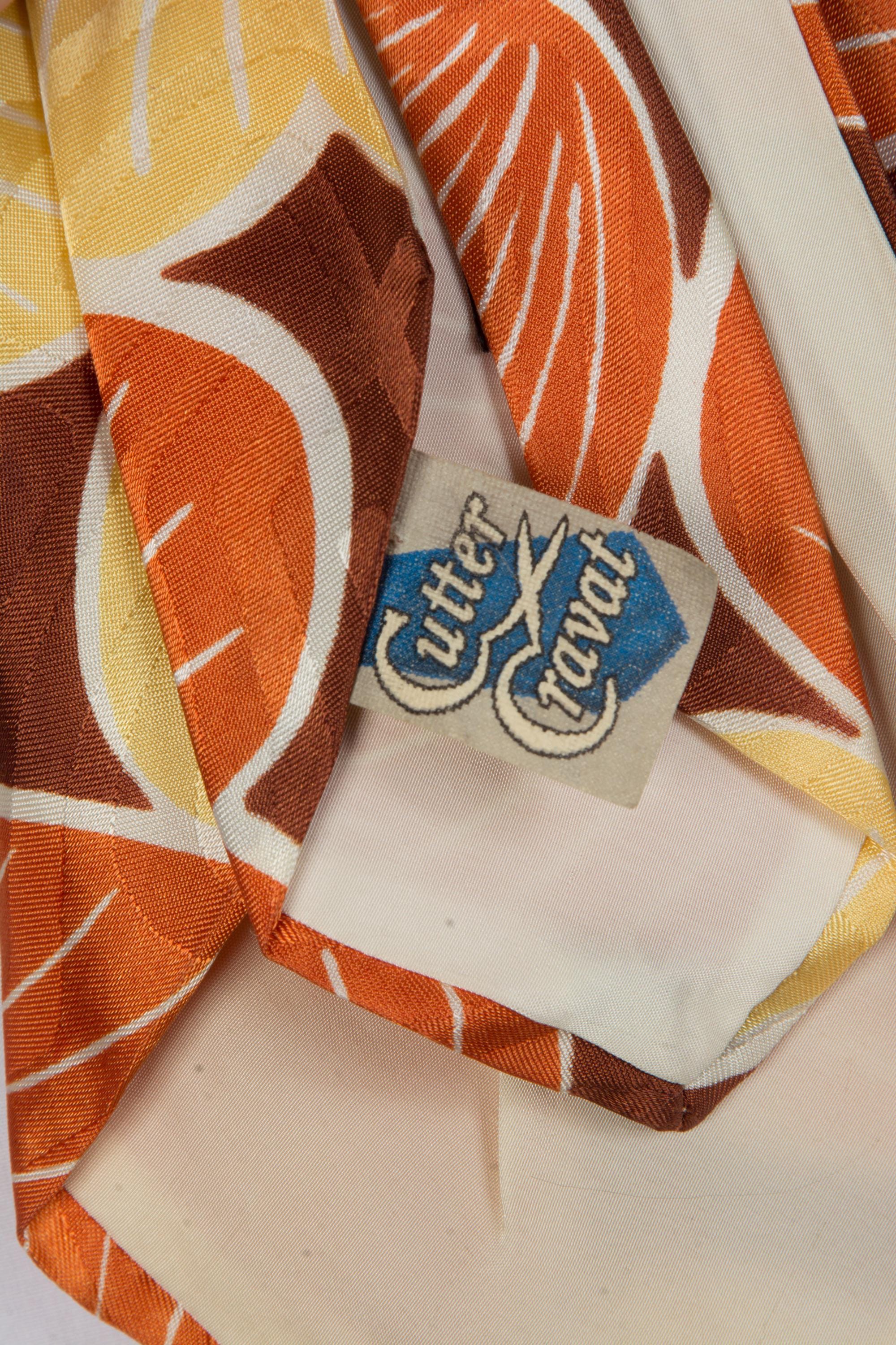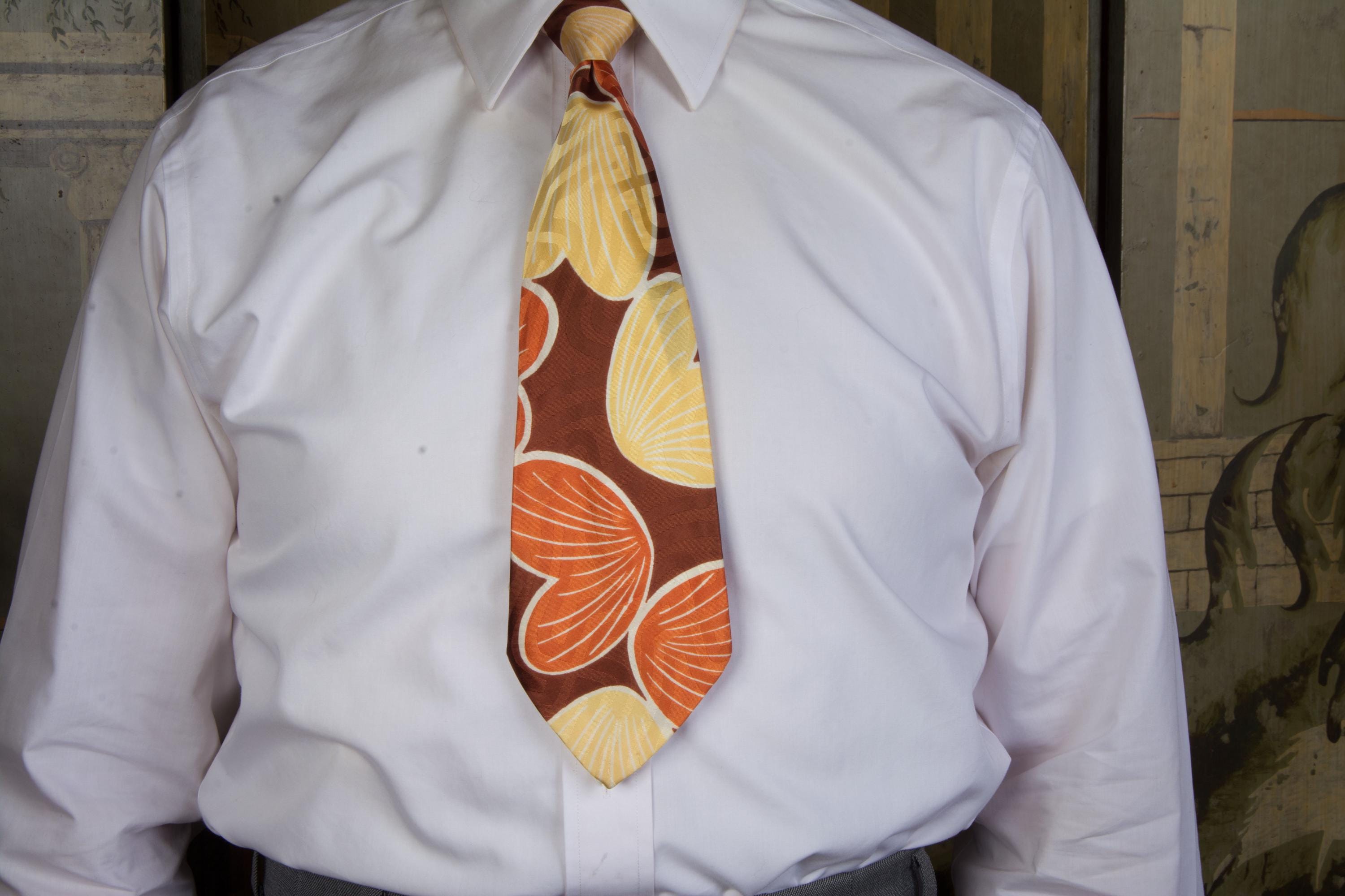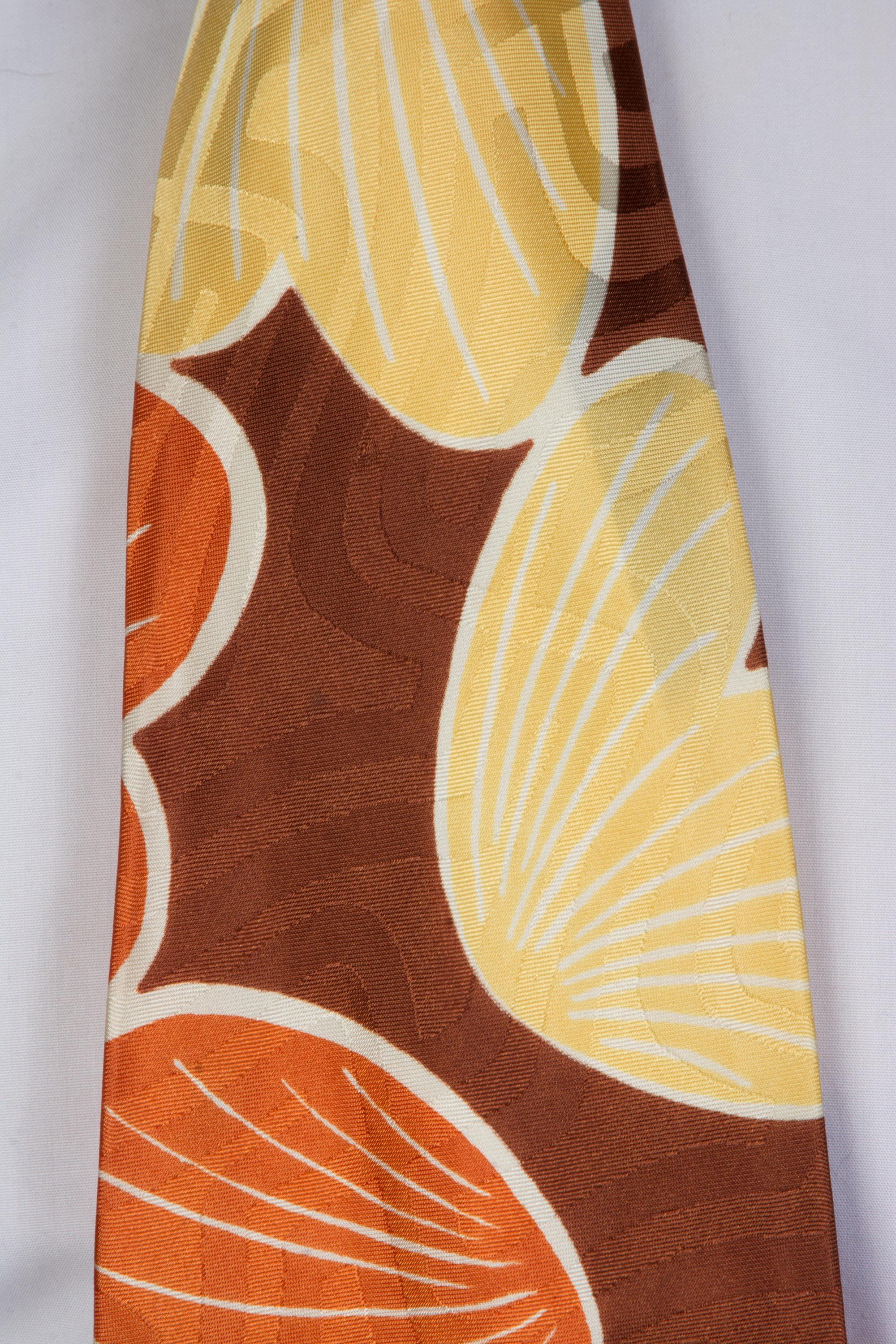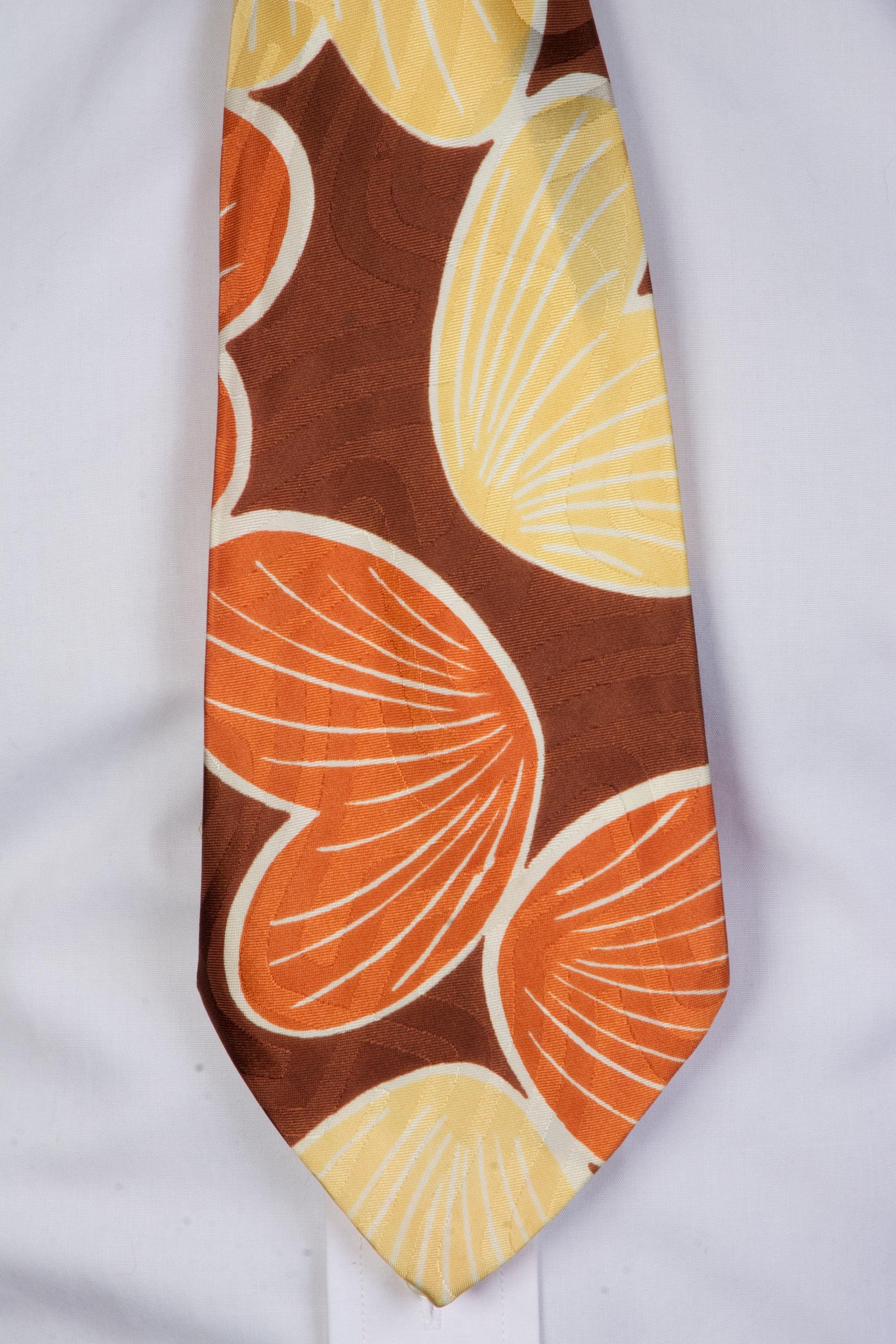 A stunning late 1940s tie for autumn, made of a shiny satin brocade. This lustrous piece features a print of petal or shell shapes in rust orange and butter yellow with white linework on a brown ground. The brocade has a labyrinth style maze pattern. Fully lined.