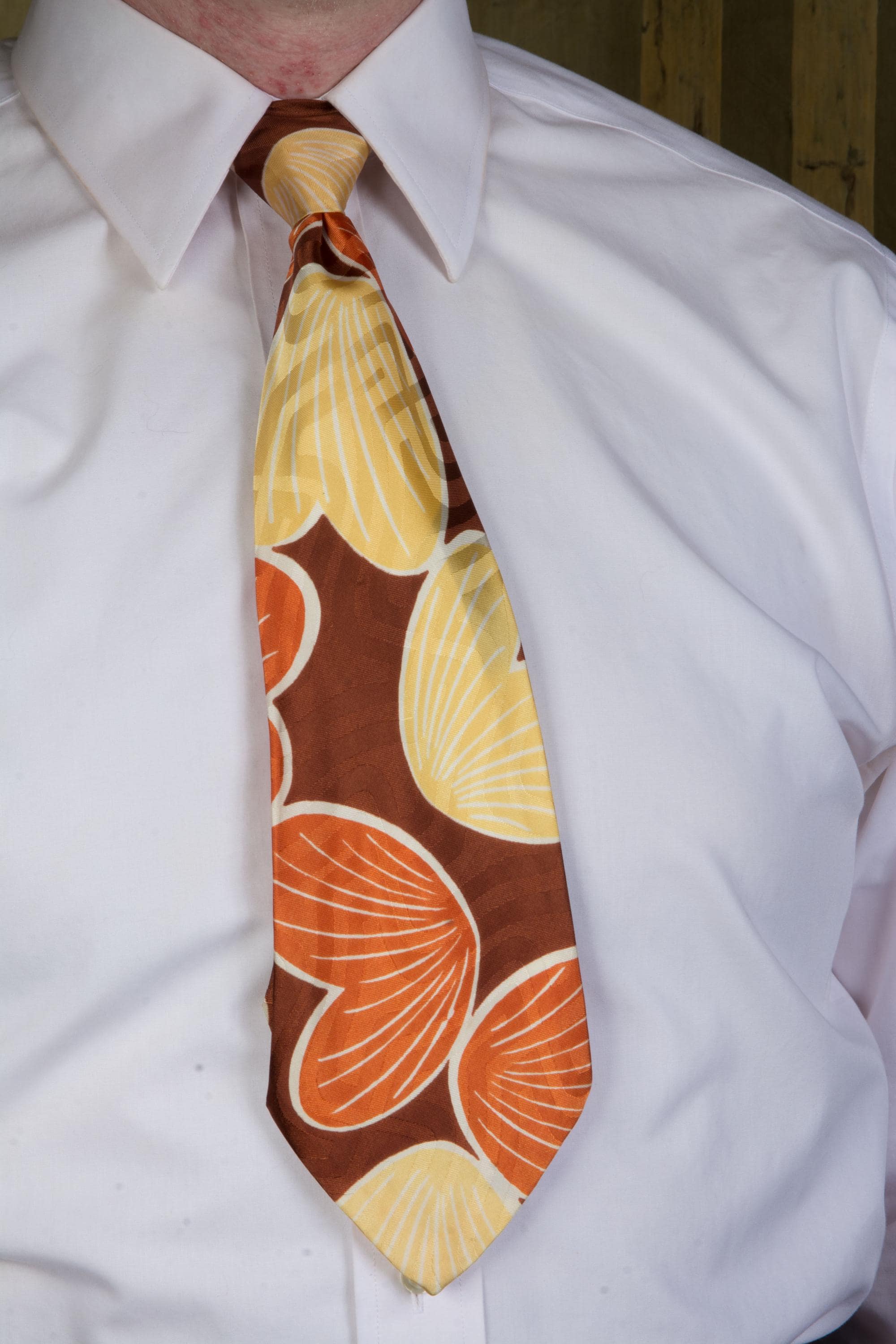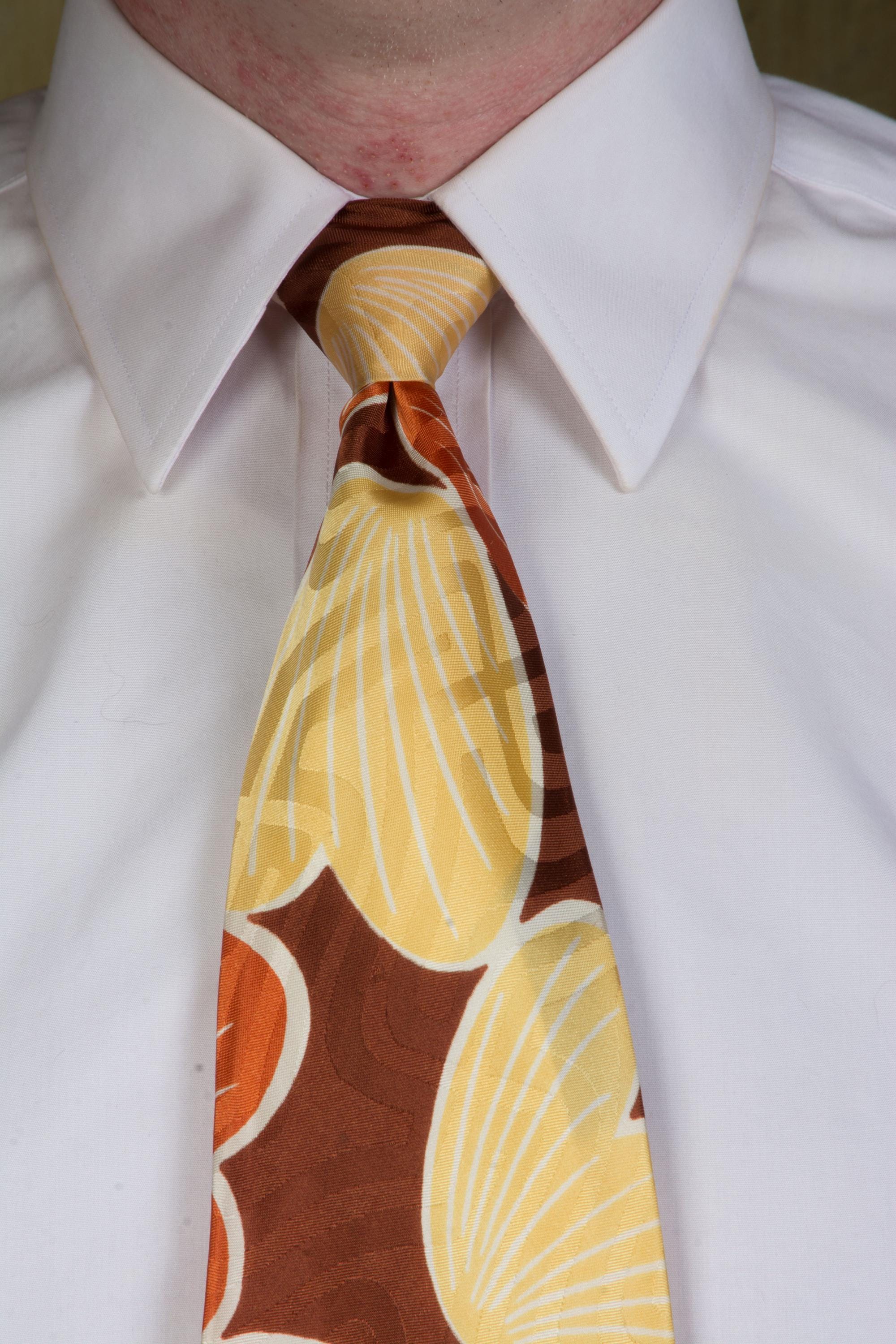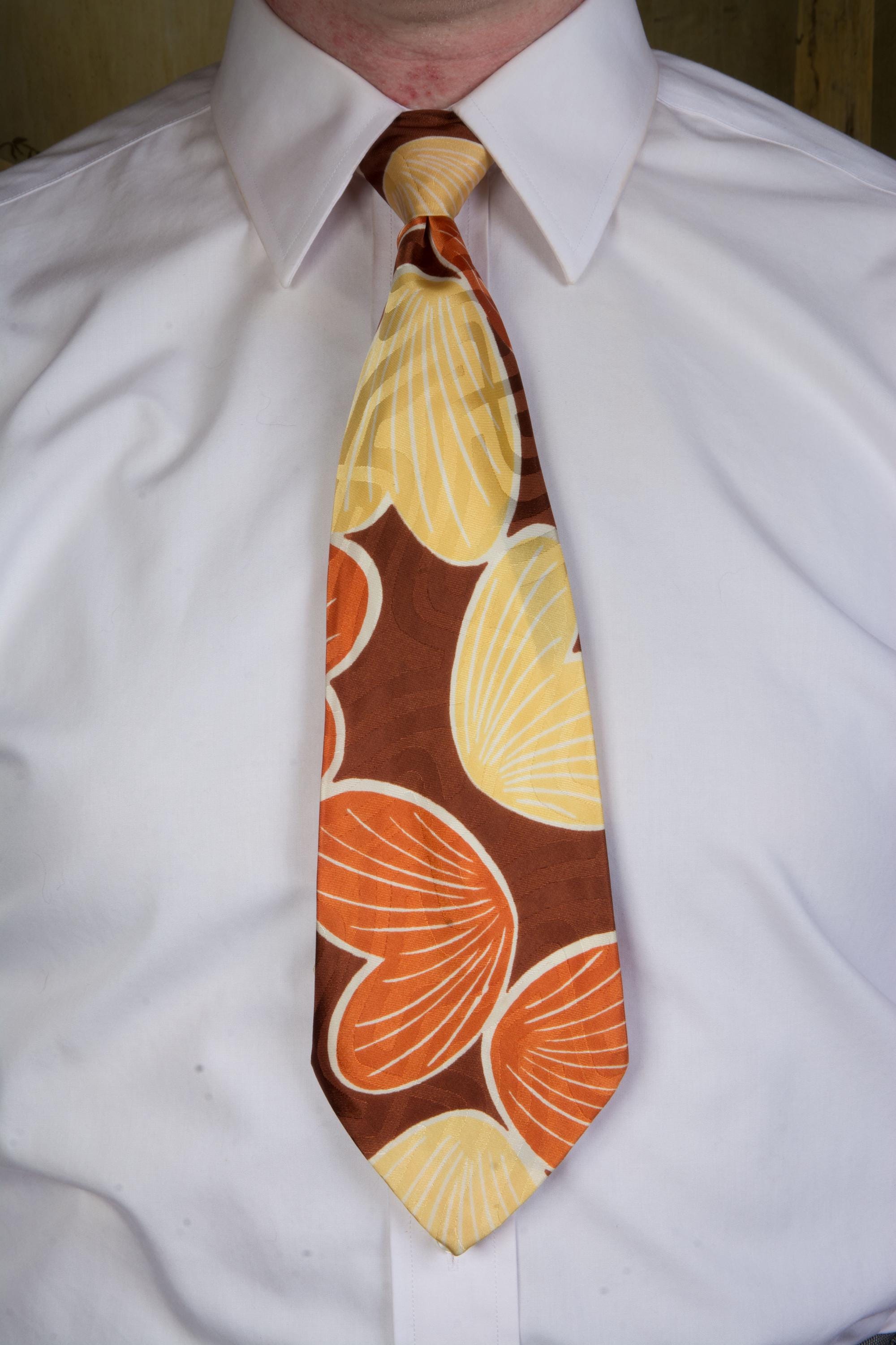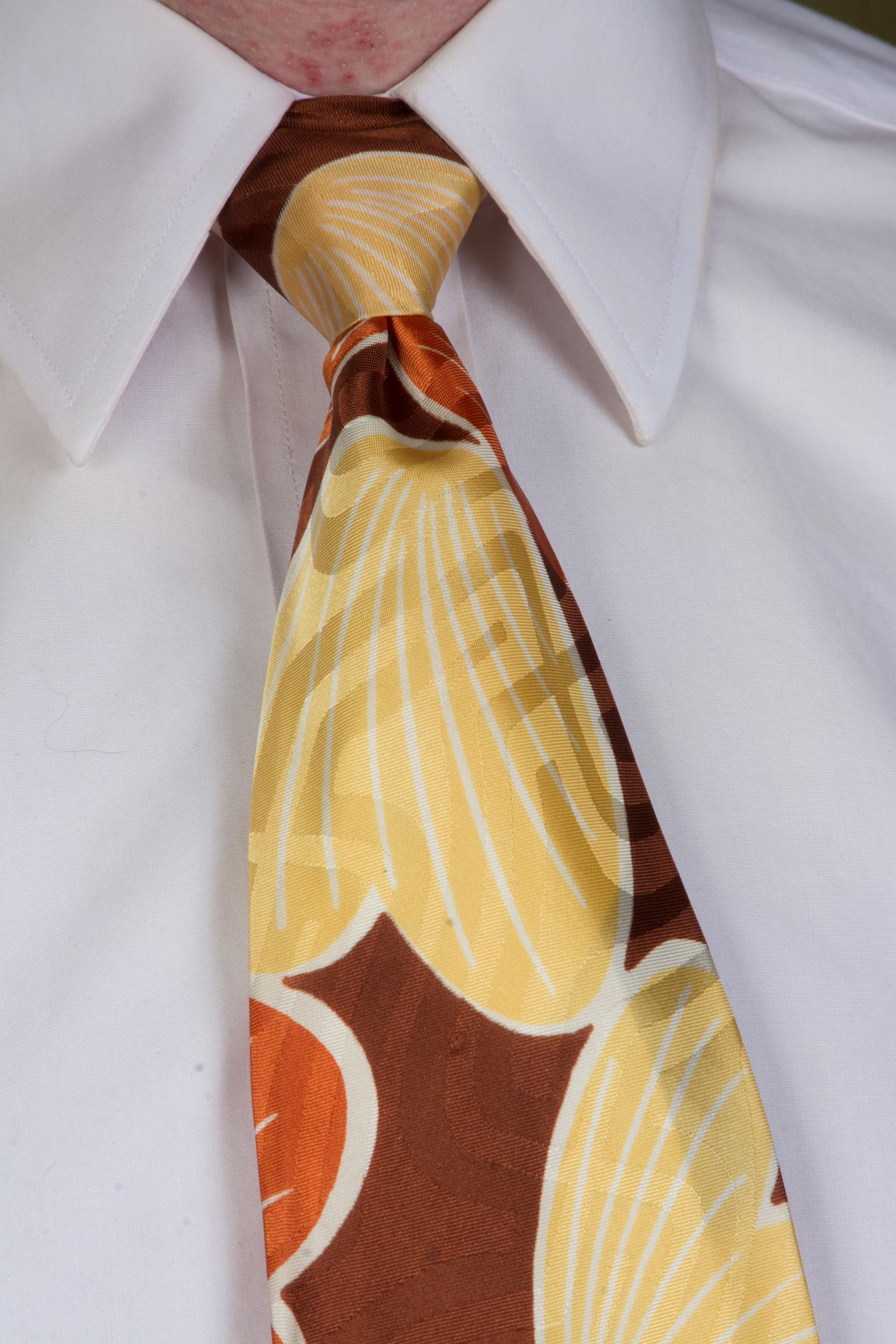 A stunning late 1940s tie for autumn, made of a shiny satin brocade. This lustrous piece features a print of petal or shell shapes in rust orange and butter yellow with white linework on a brown ground. The brocade has a labyrinth style maze pattern. Fully lined.