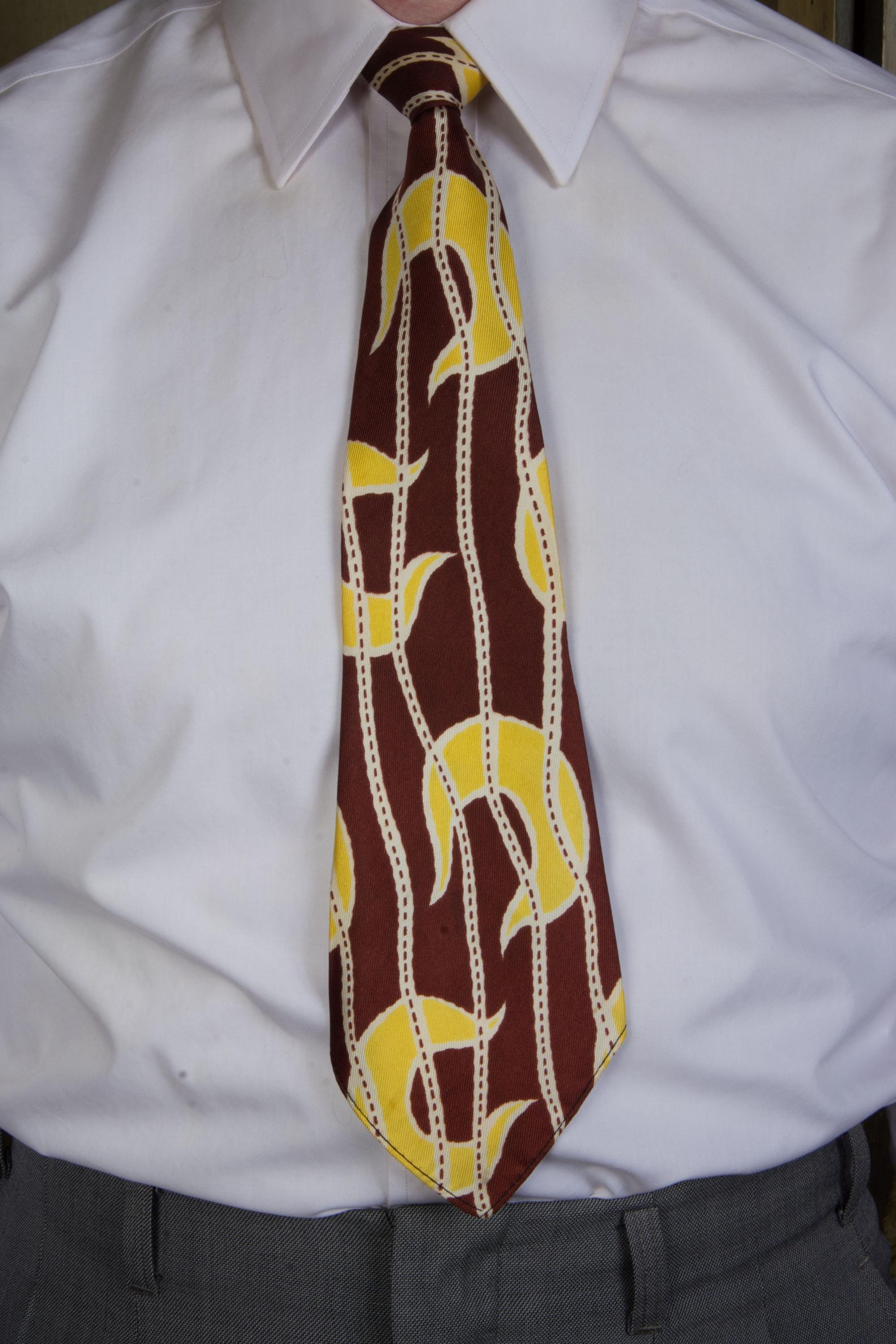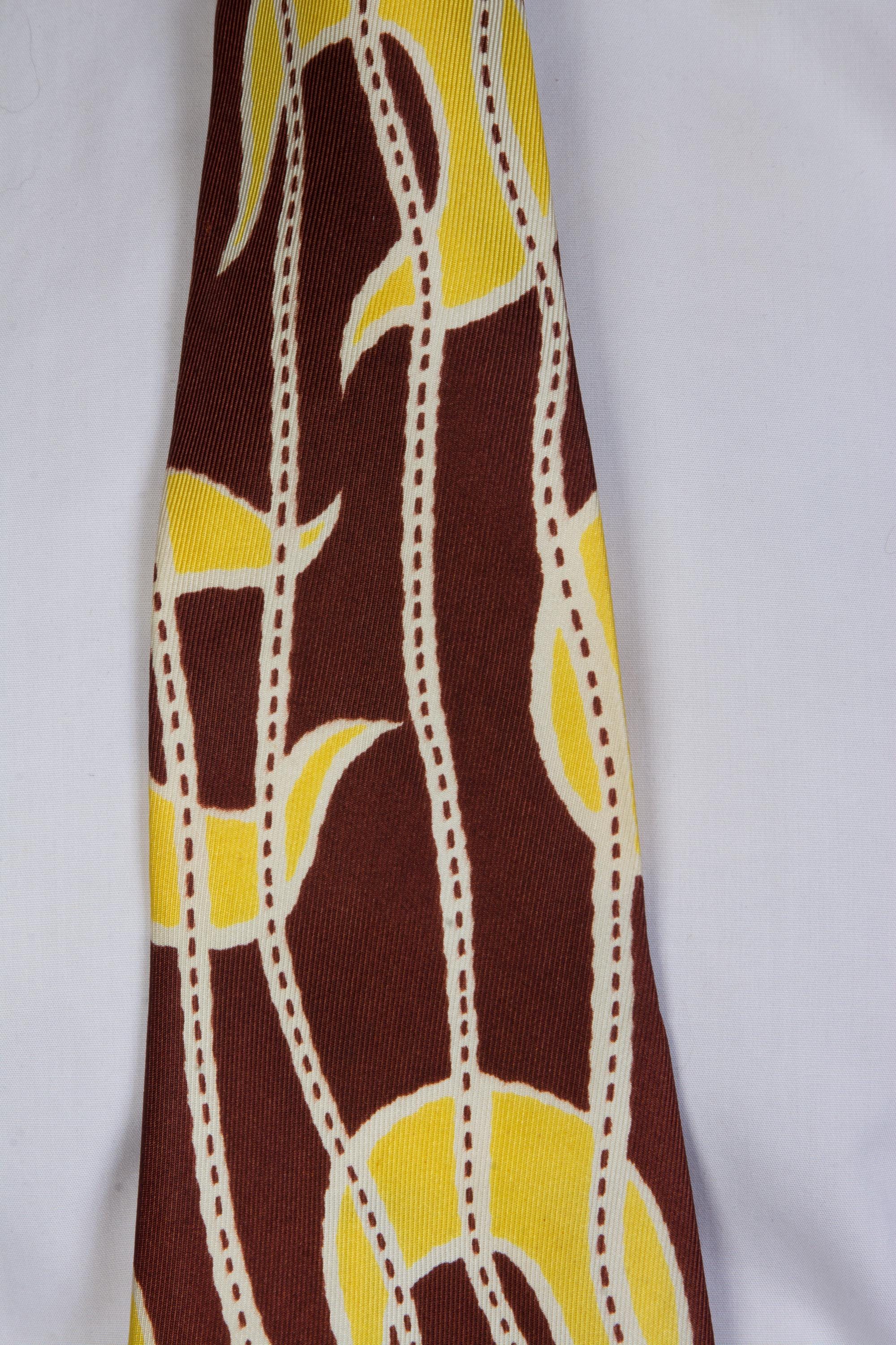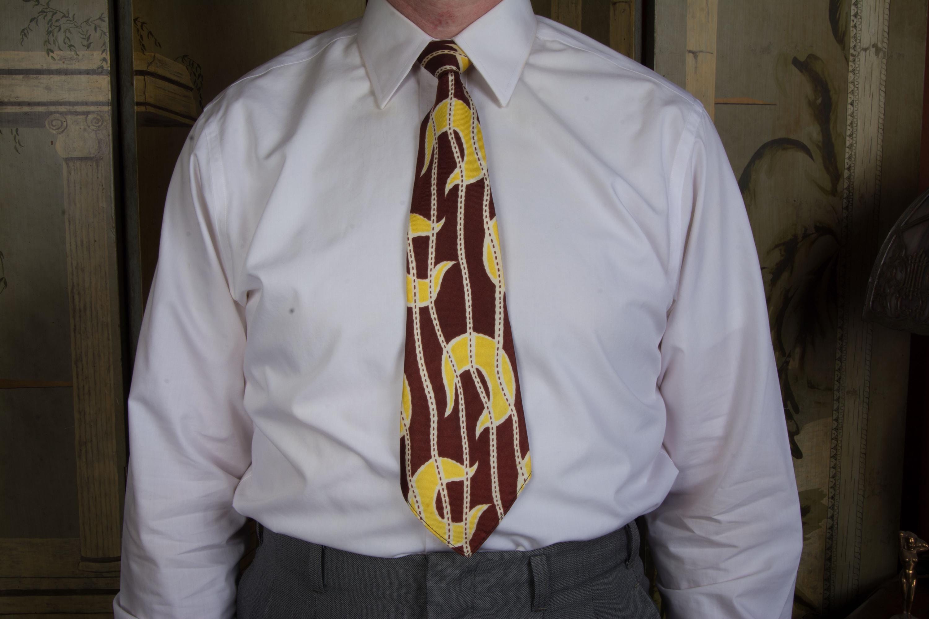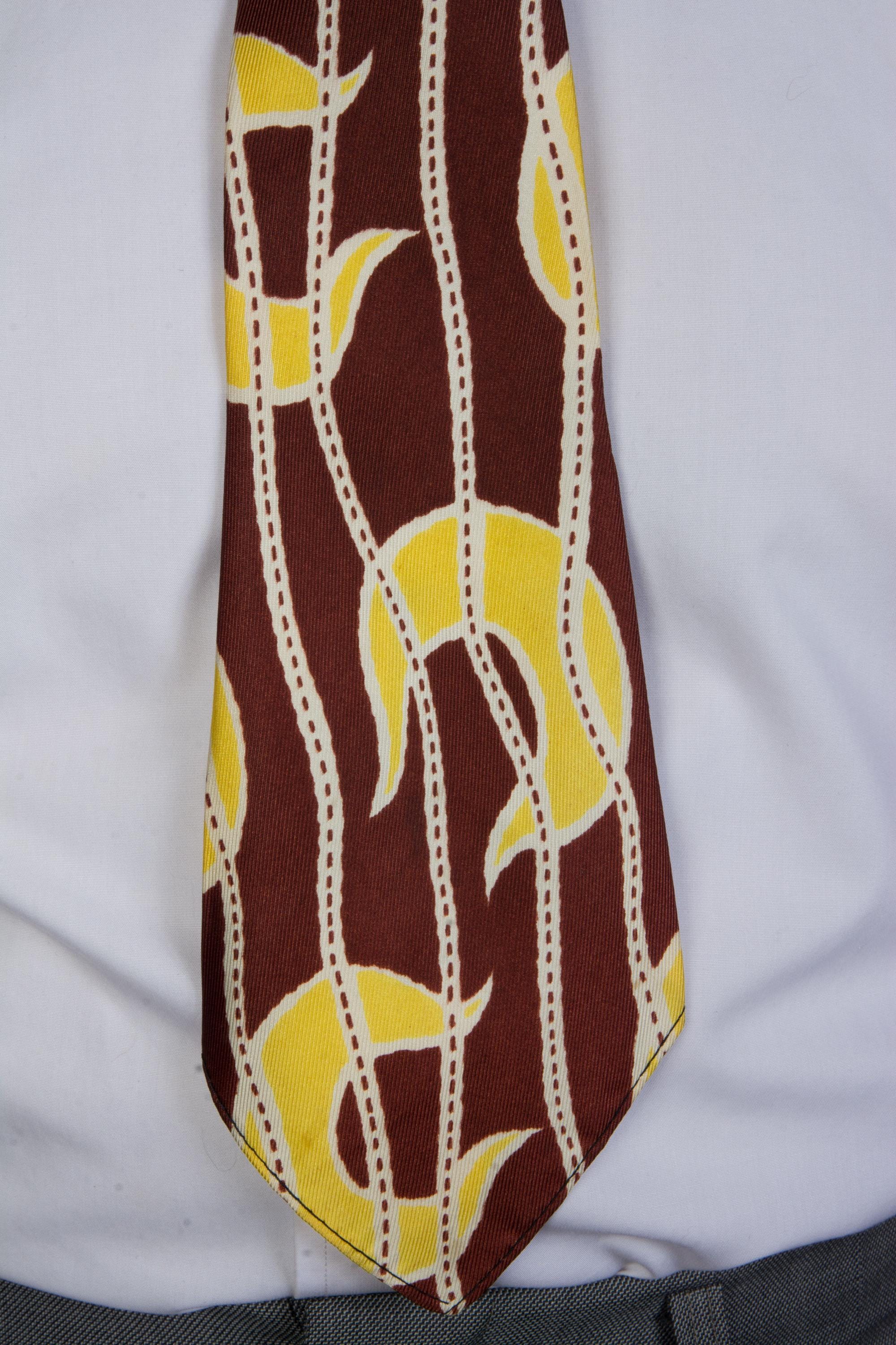 A bright, bold 1940s tie that really is unique. Made of a lightweight rayon twill with visible grain, the color pops! Curved shapes in banana yellow rest behind trompe l'oeil "stitches" in long, wavy rows. The ground is a deep brown. Unlined with a lightweight interfacing.