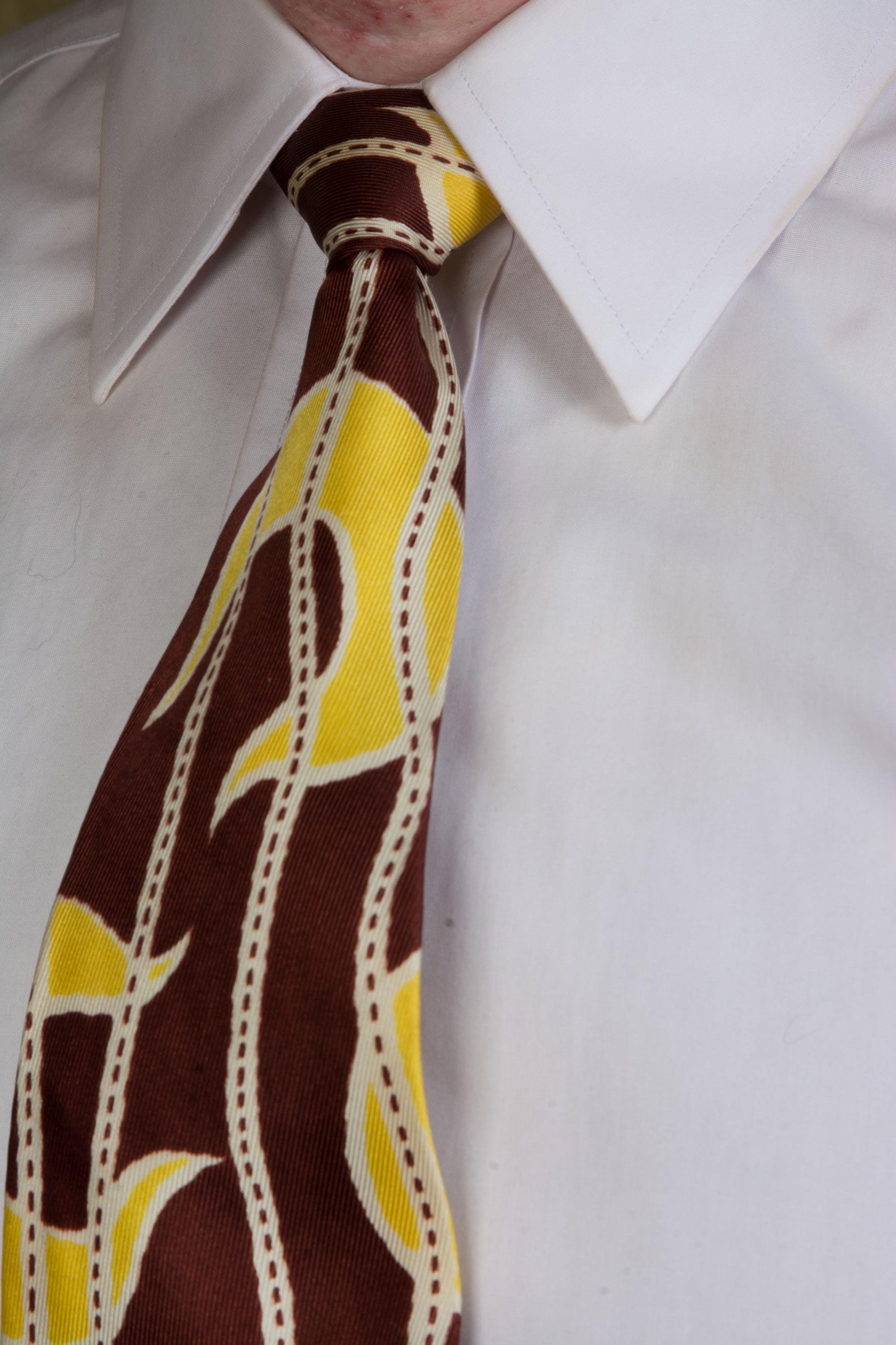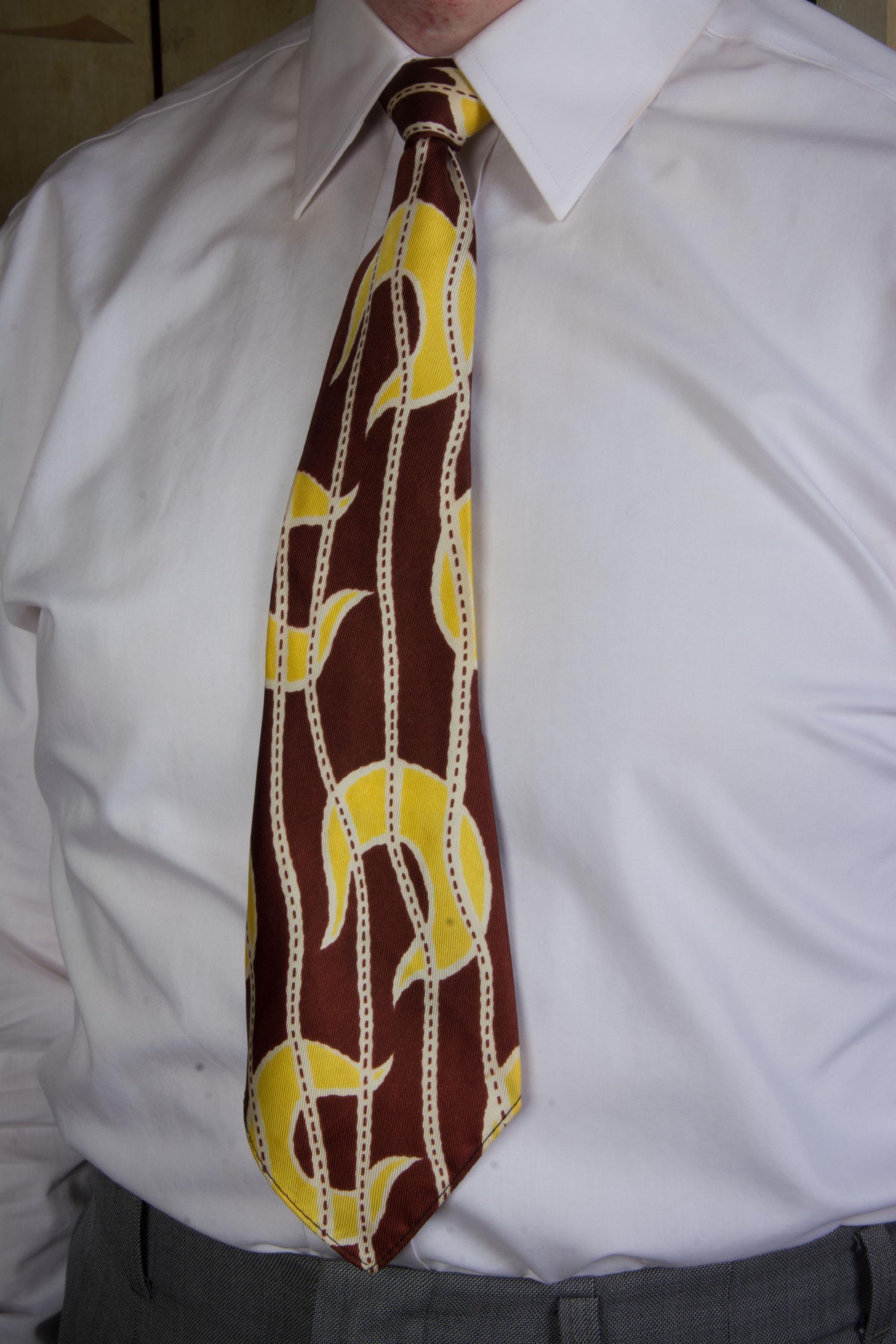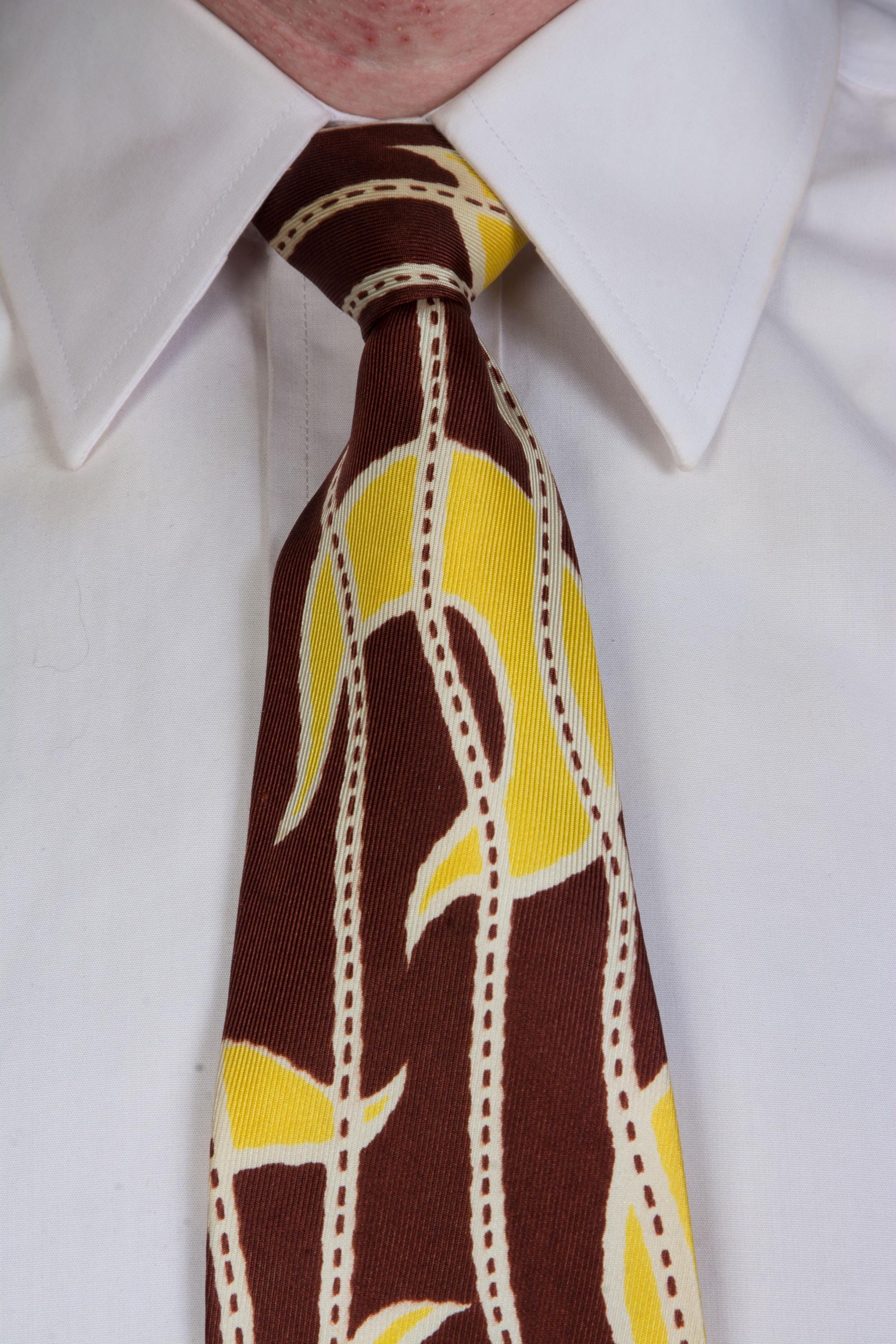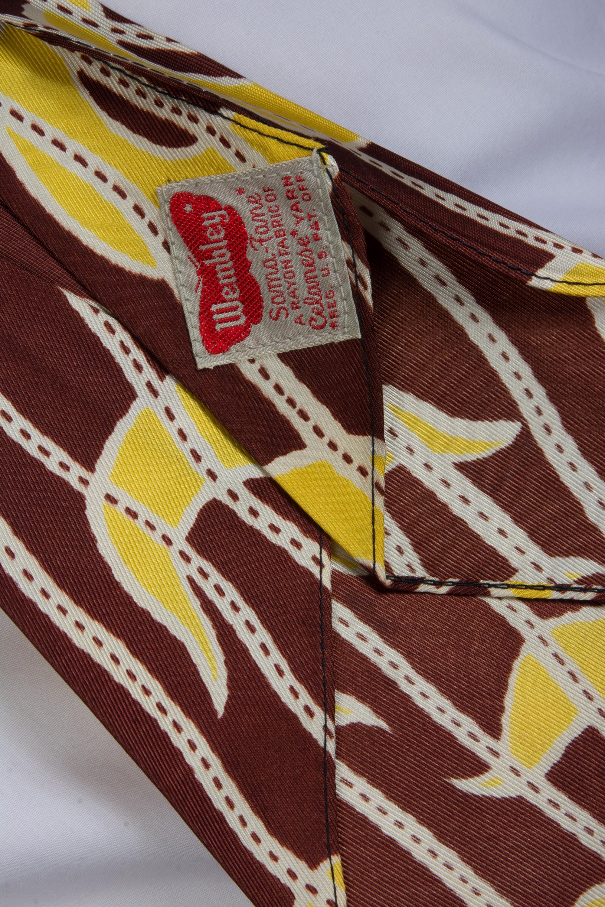 A bright, bold 1940s tie that really is unique. Made of a lightweight rayon twill with visible grain, the color pops! Curved shapes in banana yellow rest behind trompe l'oeil "stitches" in long, wavy rows. The ground is a deep brown. Unlined with a lightweight interfacing.