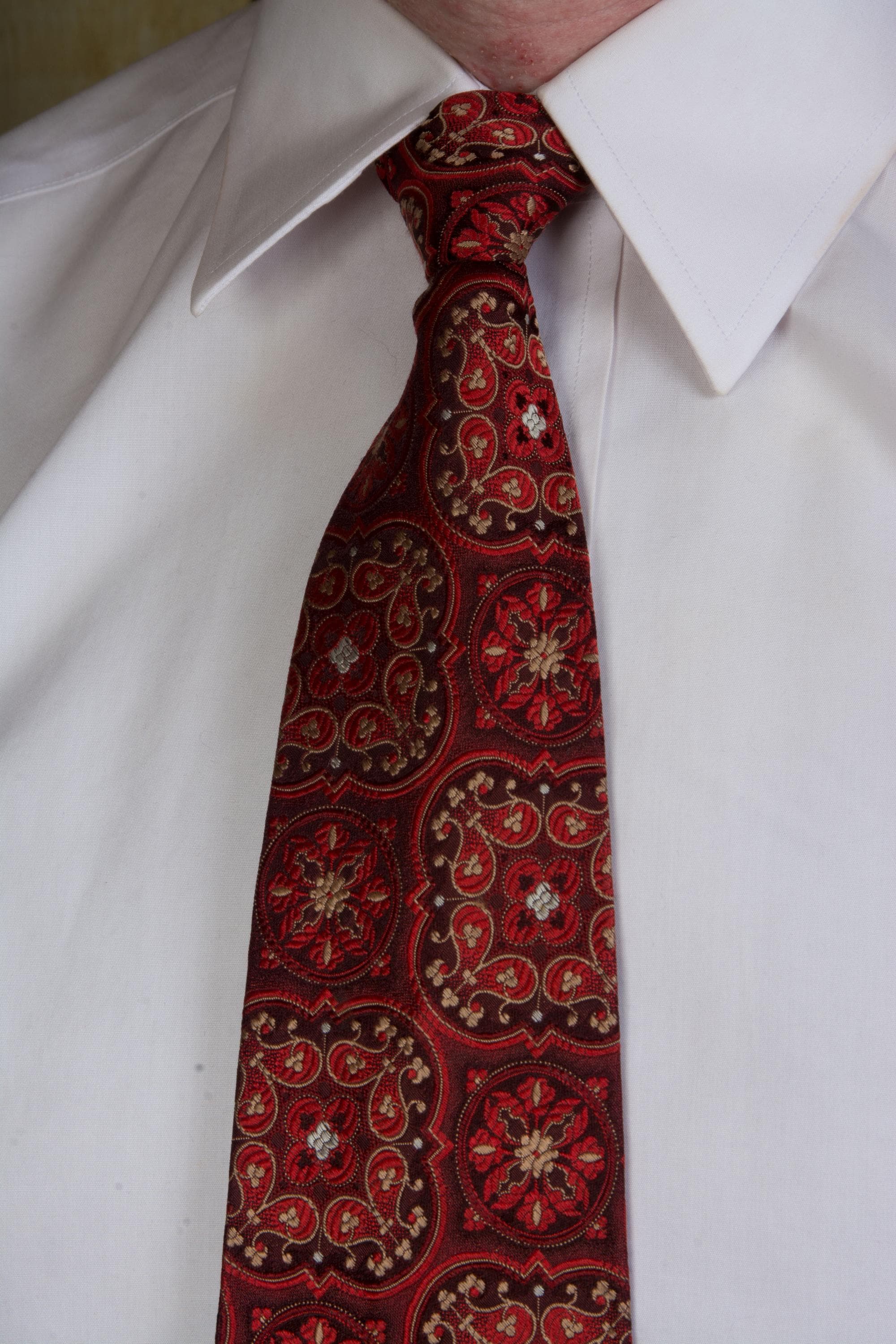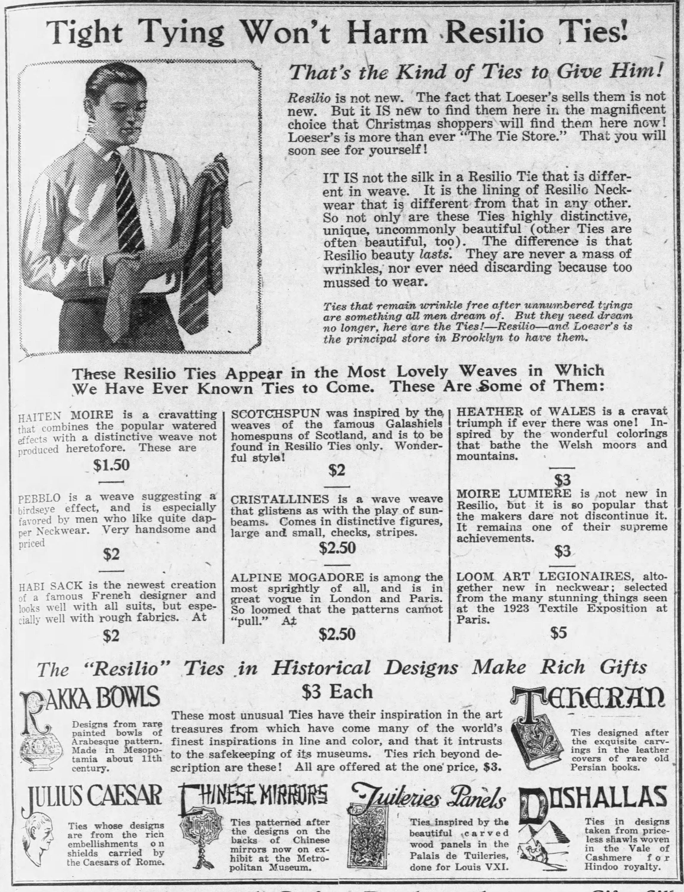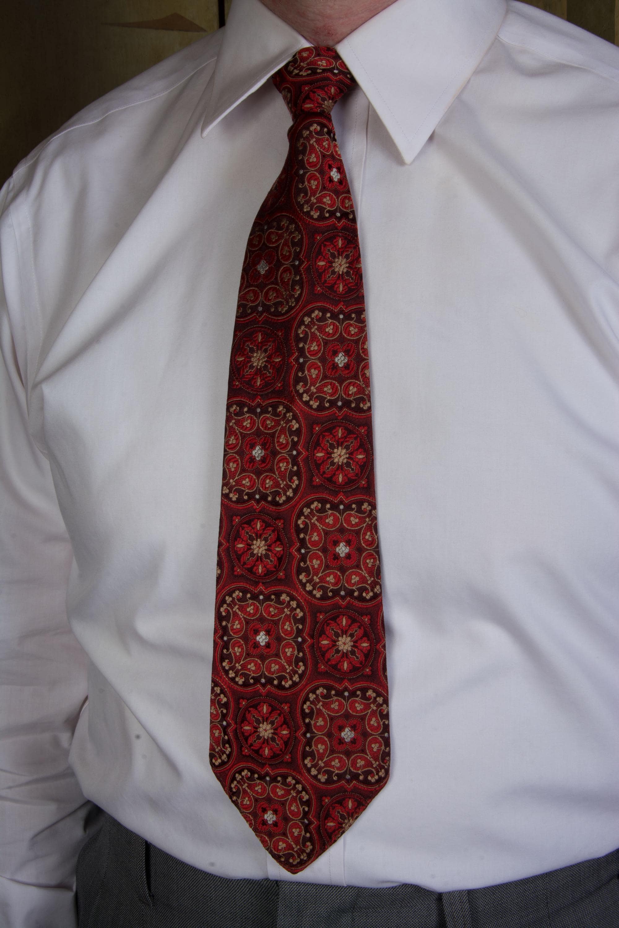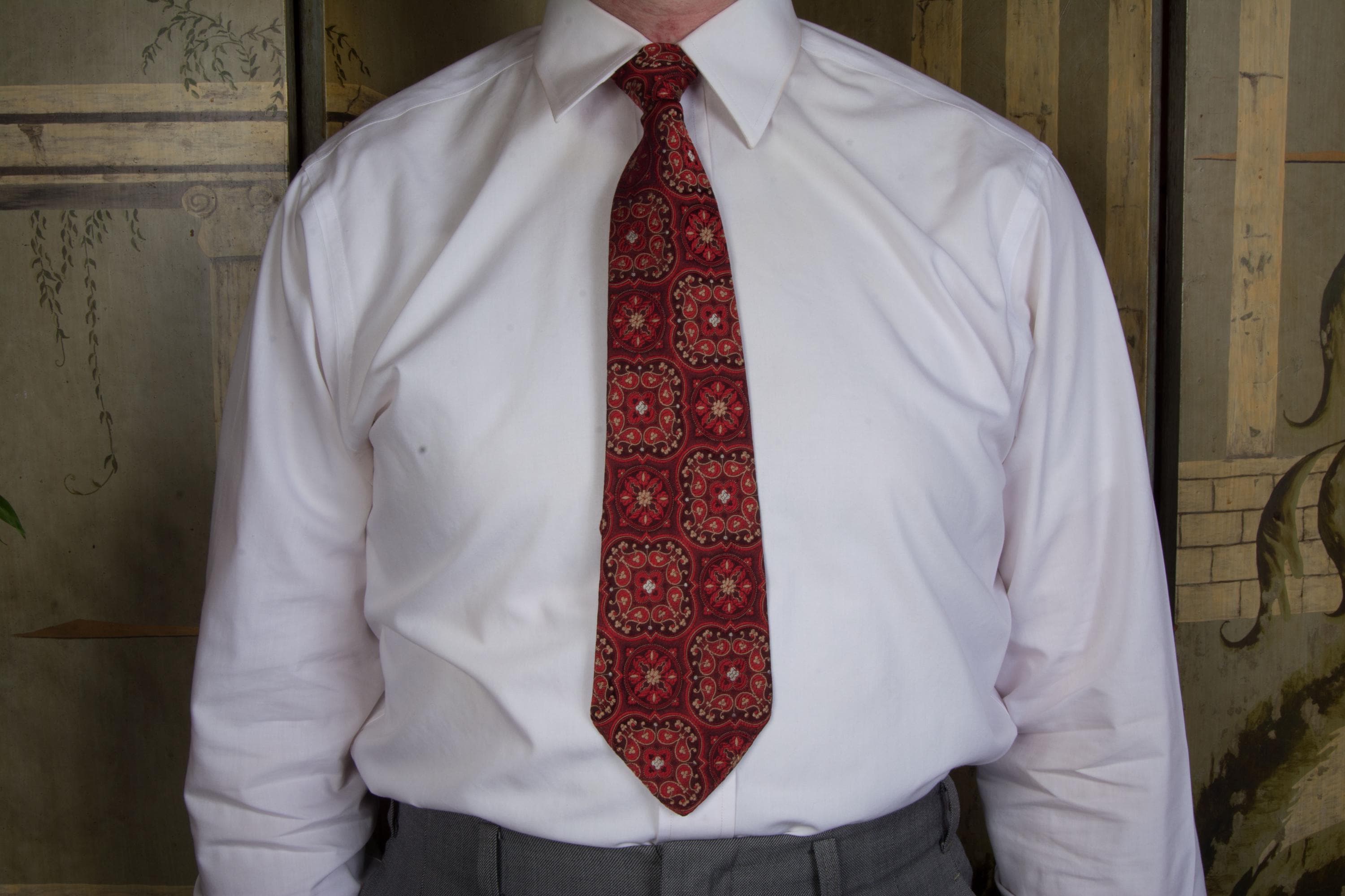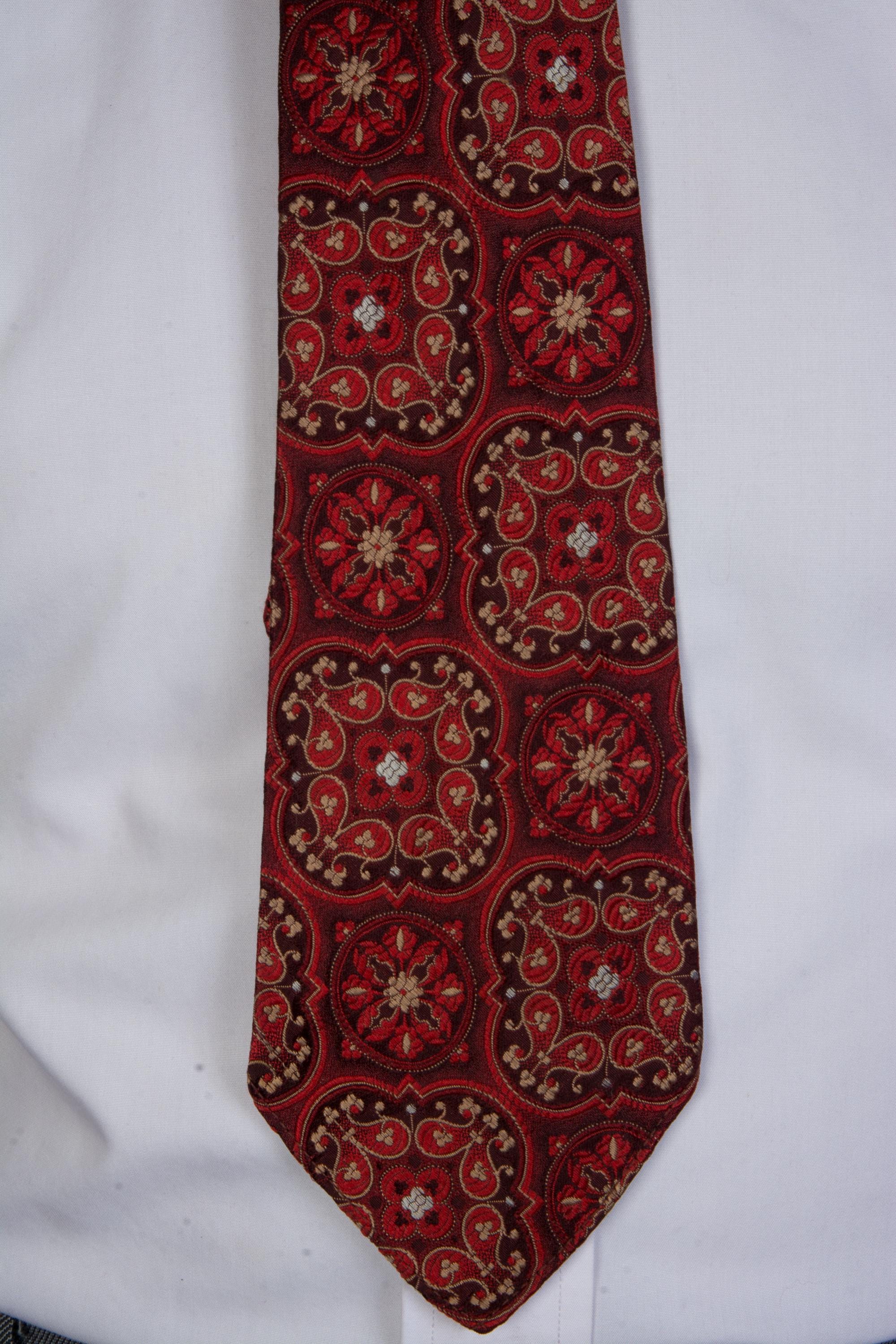 A really fantastic, documented early 1920s tie - of silk brocade! Advertised in December 1923, this was made the first year of the Langsdorf Patent, and it's genuinely special. This is from Resilio's Historical Collection, man, I'd love to see what the rest looked like but wasn't able to locate ANY that have sold in the past! This dense brocade is blended with red-orange, brick red, black, a pale tan and a touch of white, and the subtly of the work - the sort of ombré effects used? Amazing. This claims to be inspired by Rakka (actually spelled raqqa) bowls from 11th Century Mesopotamia. Even more striking in person, this genuinely an early rarity for the collector.