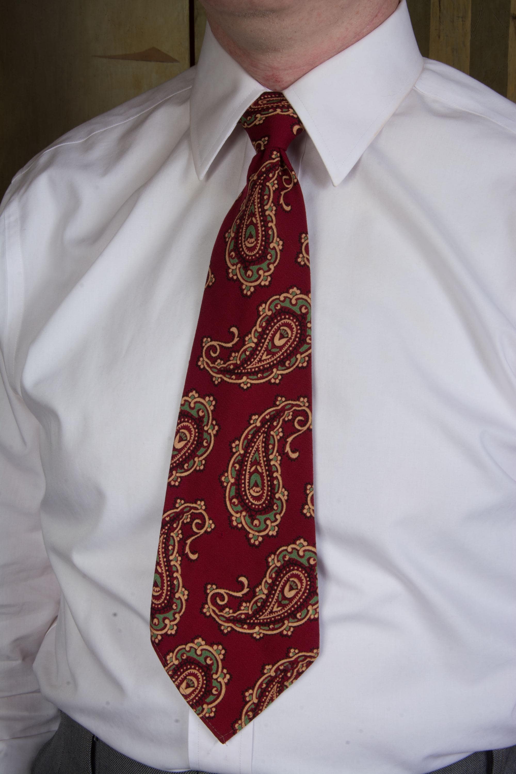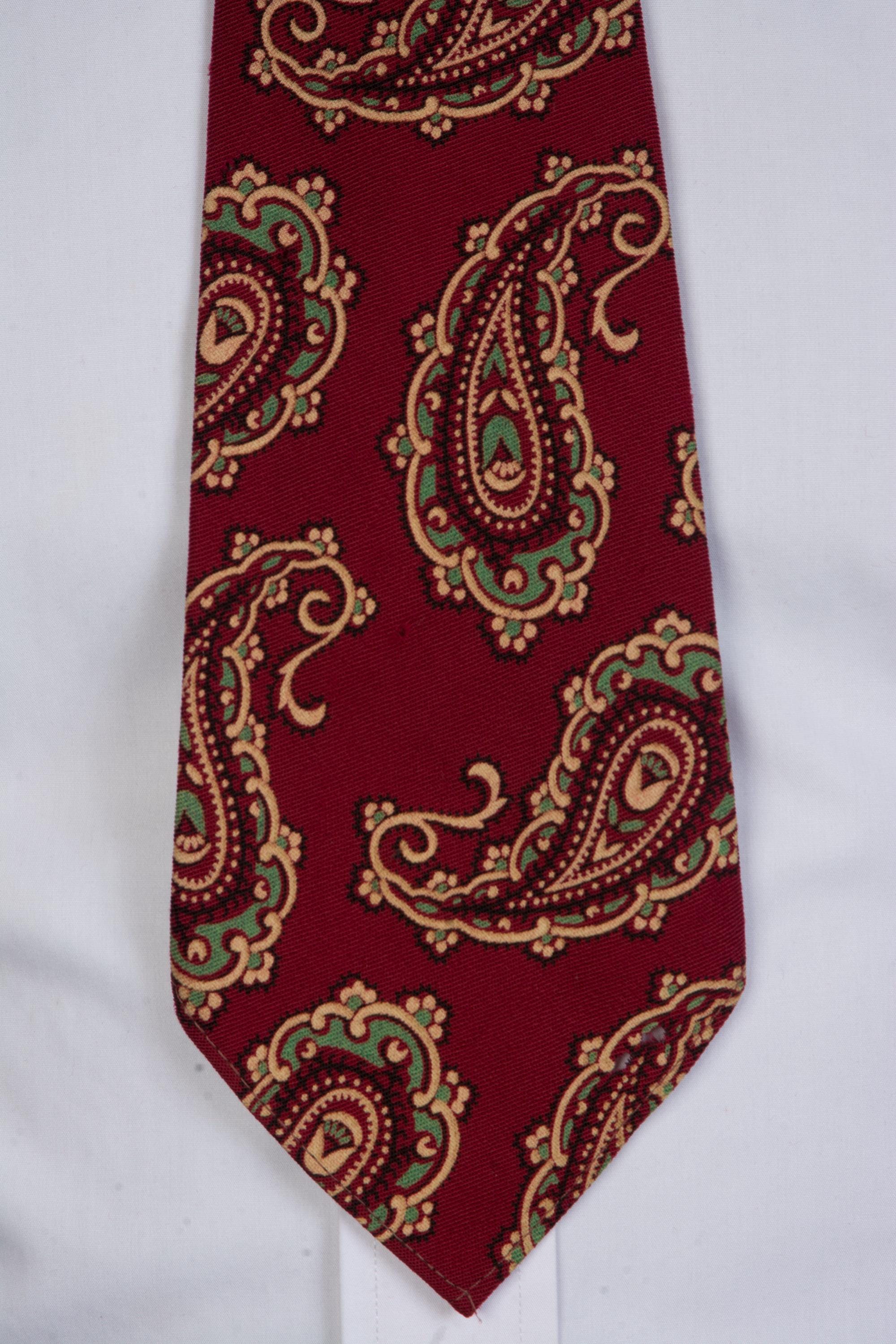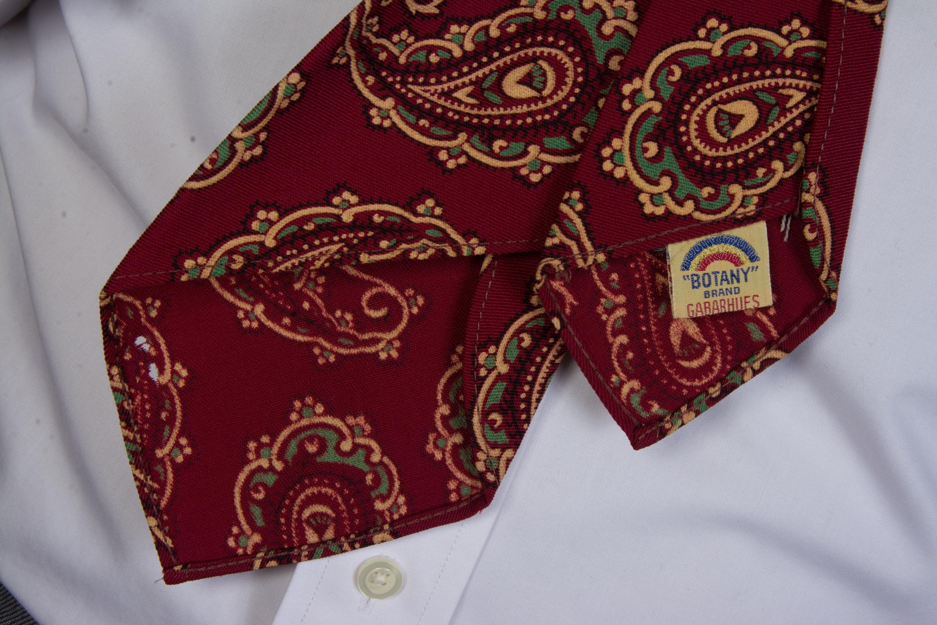 This later 1940s "Gabarhues" tie by Botany Brand is made in the unlined style more common to 30s ties. A really timeless design, it is made of a lightweight wool gabardine in deep, bricky red with a paisley of green, black, red and sort of a warm ecru.