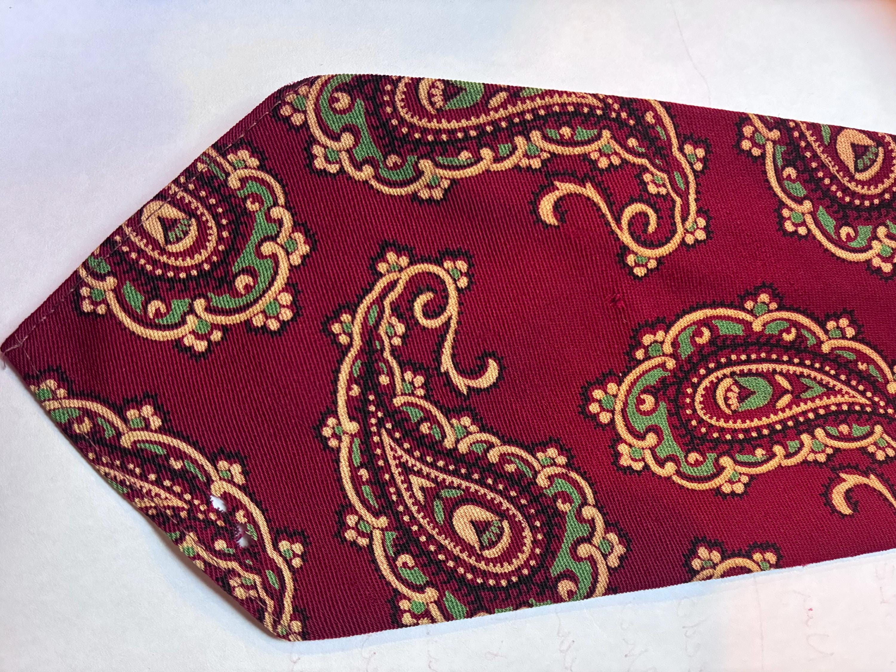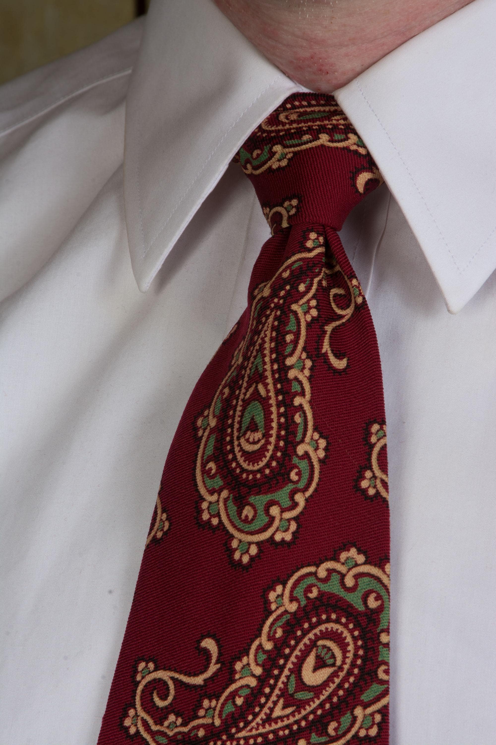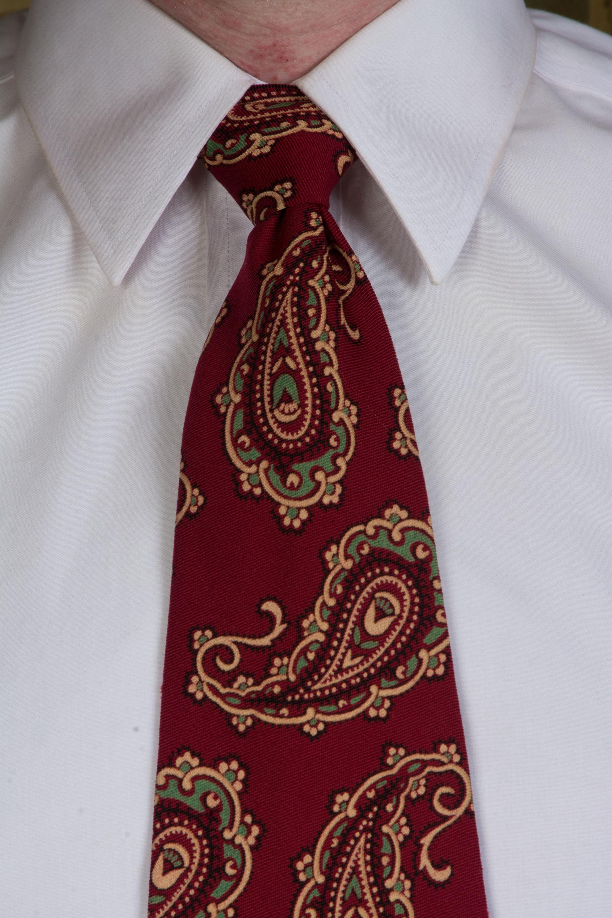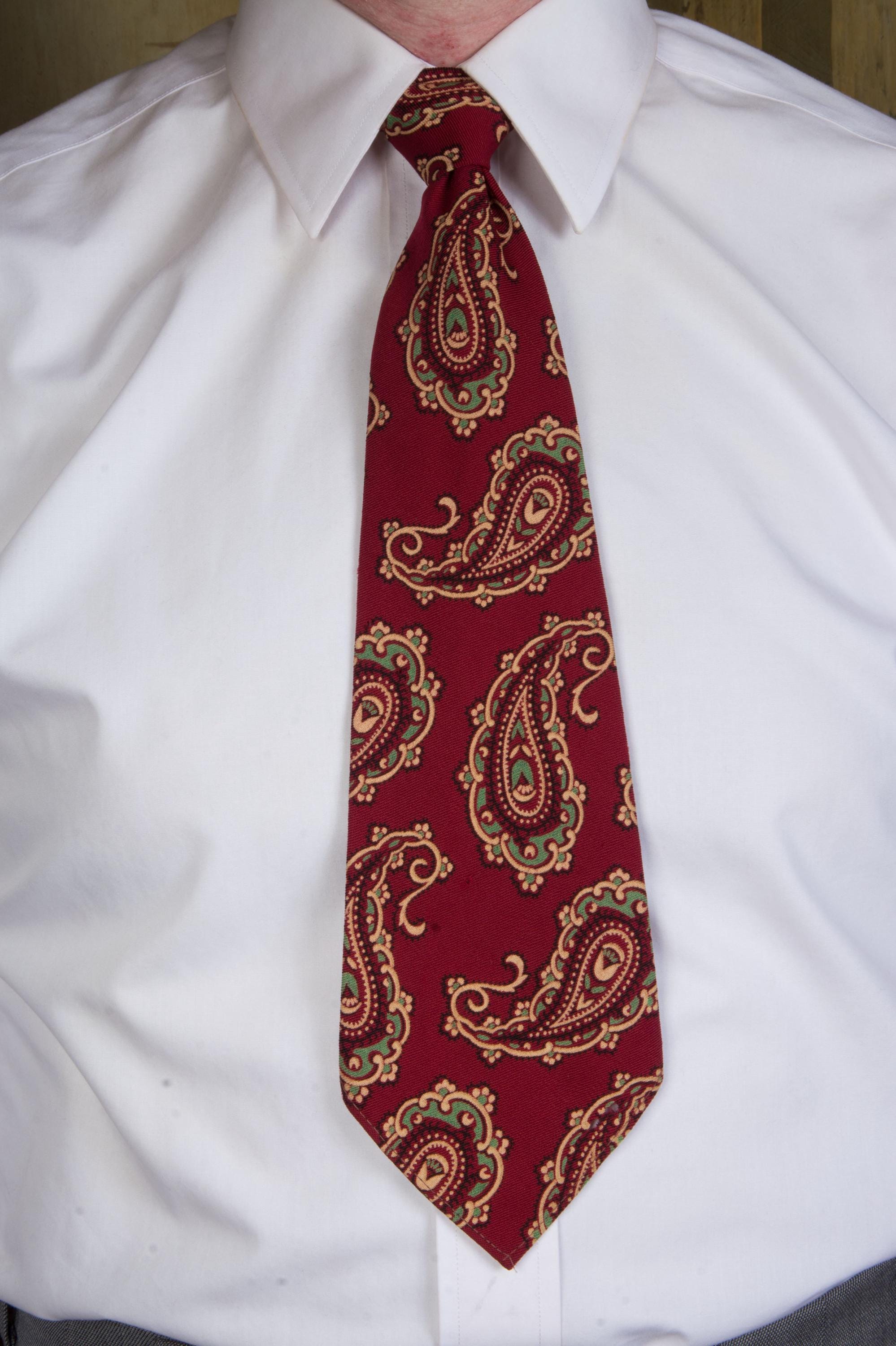 This later 1940s "Gabarhues" tie by Botany Brand is made in the unlined style more common to 30s ties. A really timeless design, it is made of a lightweight wool gabardine in deep, bricky red with a paisley of green, black, red and sort of a warm ecru.