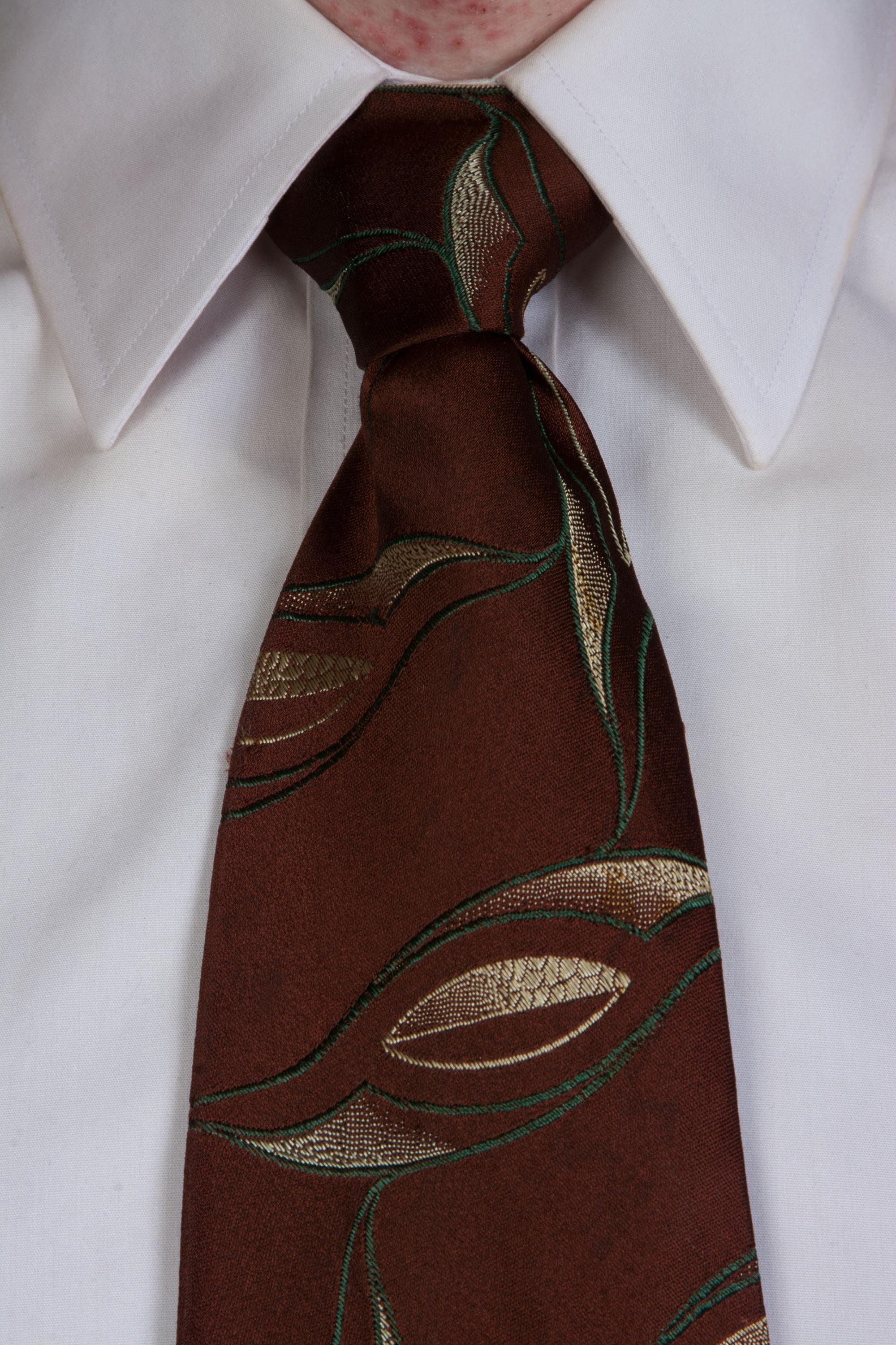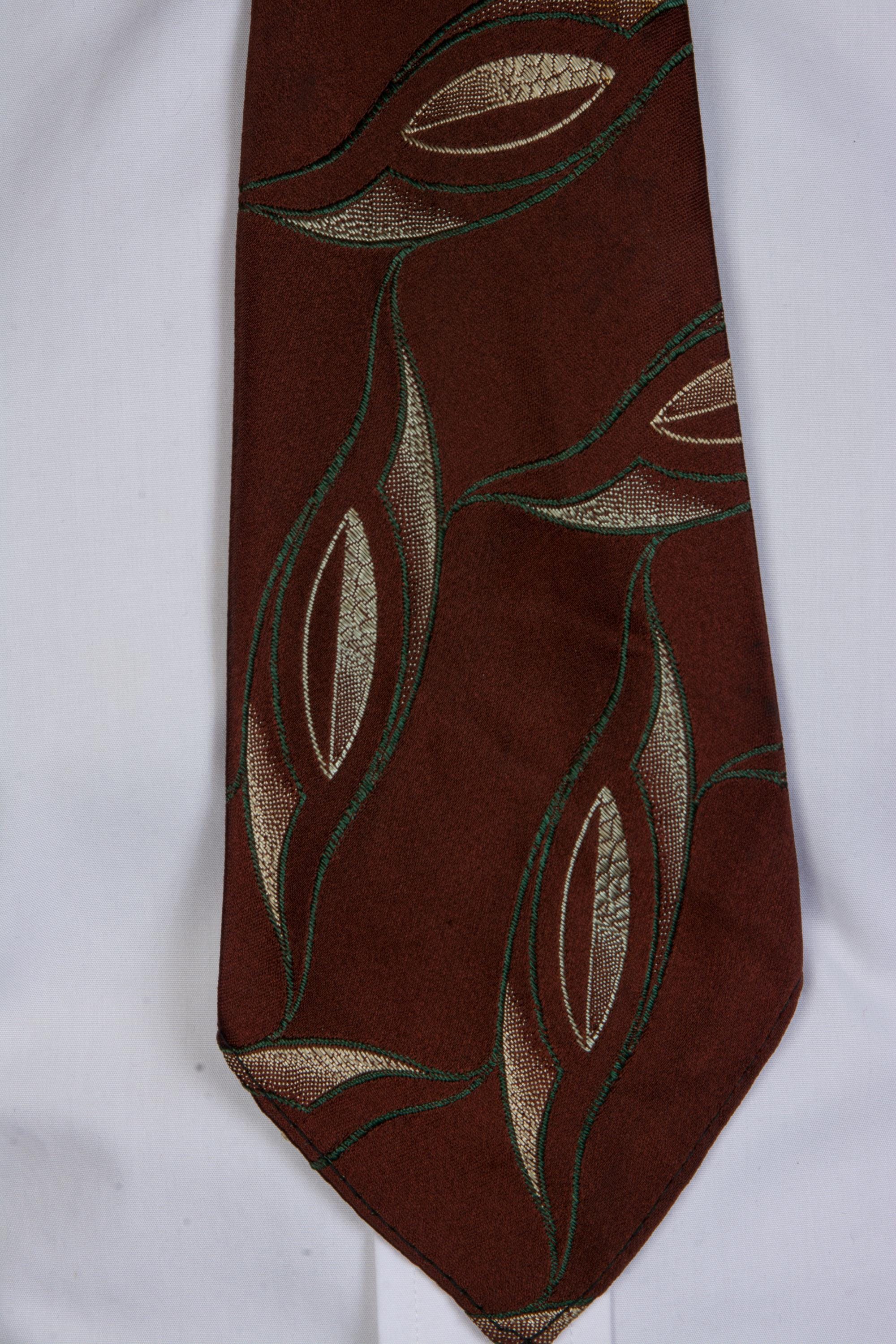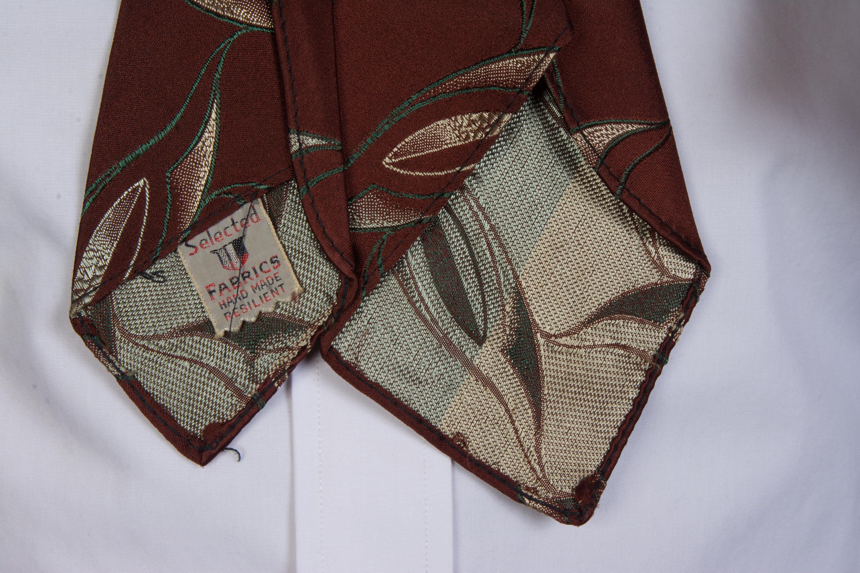 An excellent 1920s brocade tie, bold and rich. This features a very dark brown ground with a sweeping brocade in the shape of lily leaves, done in deep green and lustrous ivory. It has an asymmetric fold and is unlined, save for the interfacing at the neck. It makes a very crisp knot.